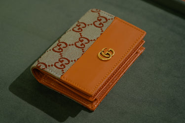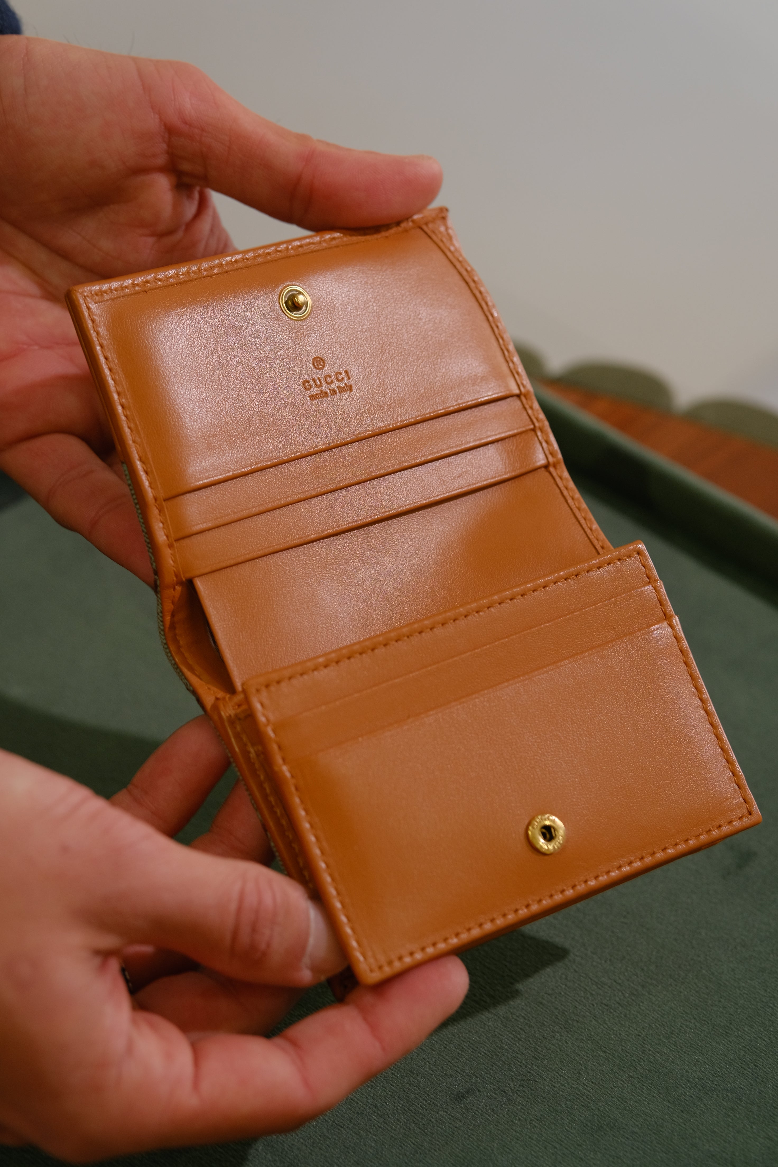 Carteira Gucci GG Marmont, em tecido monograma GG e detalhes em couro, ferragem em dourado, bolso fechado por zíper e porta cartões.