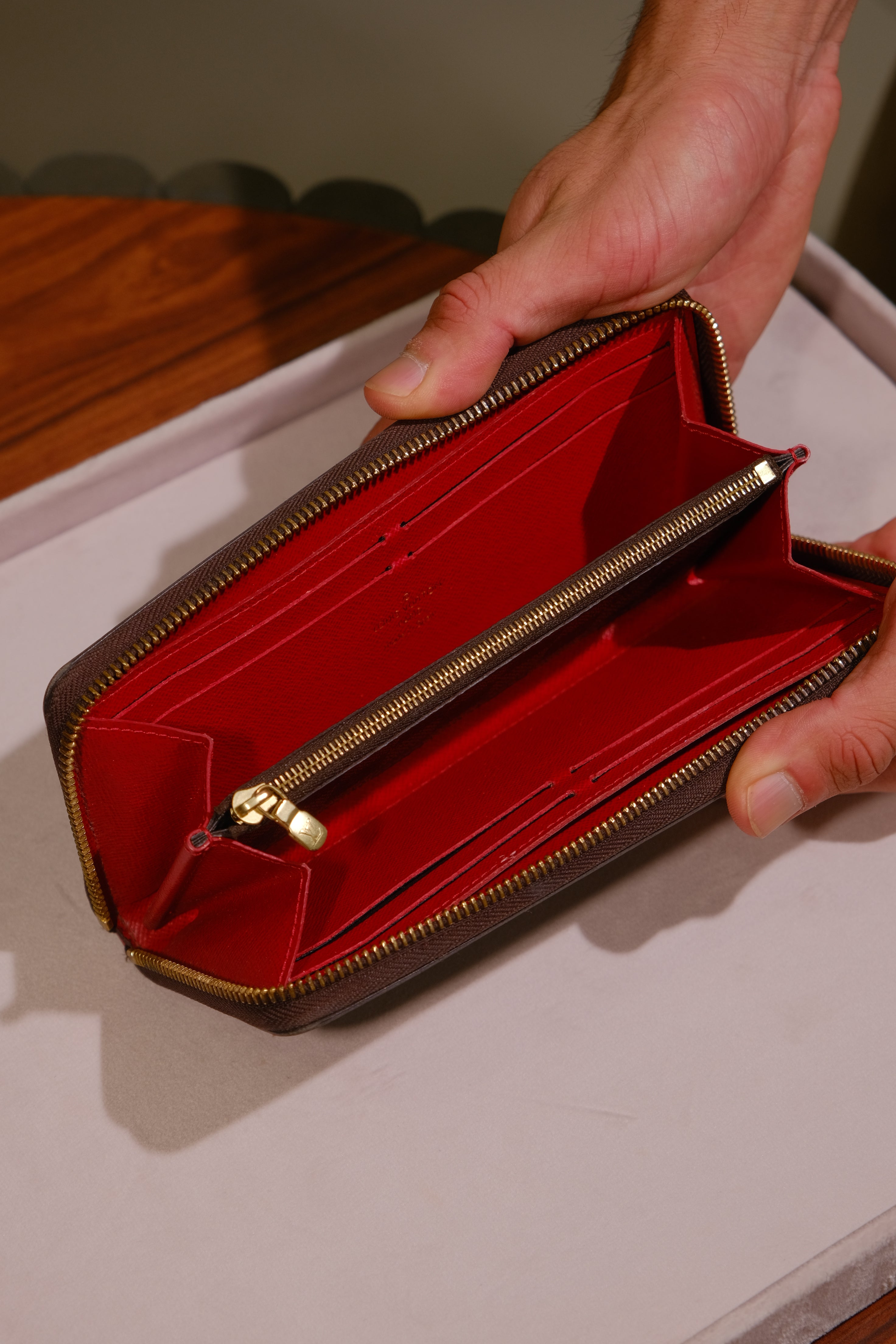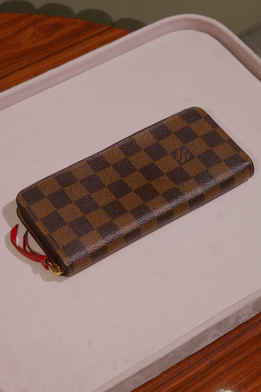 Carteira Louis Vuitton Clemence, em Canvas Damier Ébène, compartimento com divisória, bolso fechado por zíper e porta cartões, ferragem em dourado e zíper na parte superior.