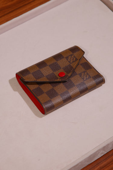Carteira Louis Vuitton, em canvas marrom com detalhes em couro vermelho, compartimento com dois bolso e porta cartões. Aba frontal com fecho em botão de pressão.