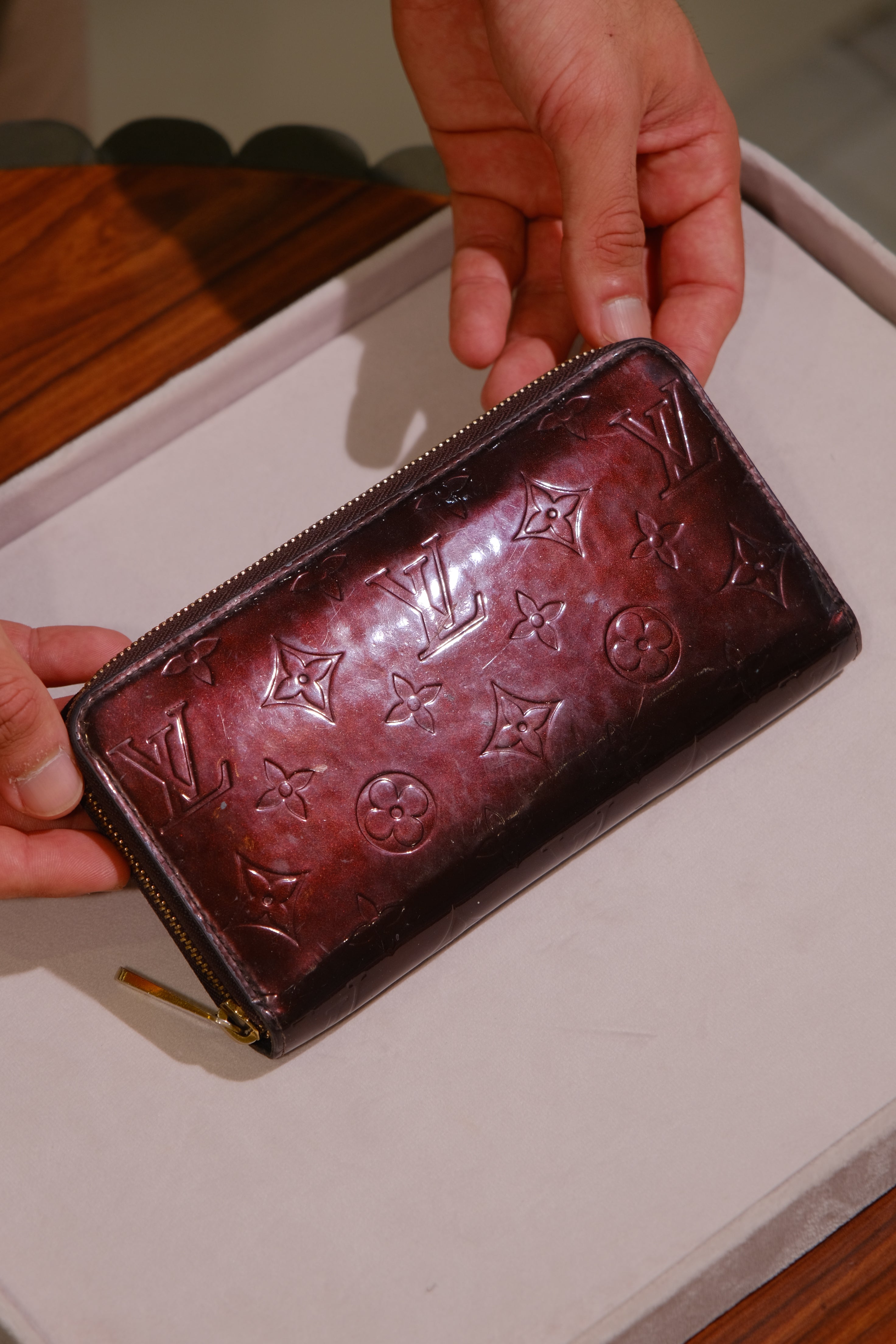 Carteira Louis Vuitton Zippy, em verniz na cor bordô com monograma, compartimento com divisória e bolso interno fechado por zíper e porta cartões, ferragem em dourado e zíper na parte superior.
