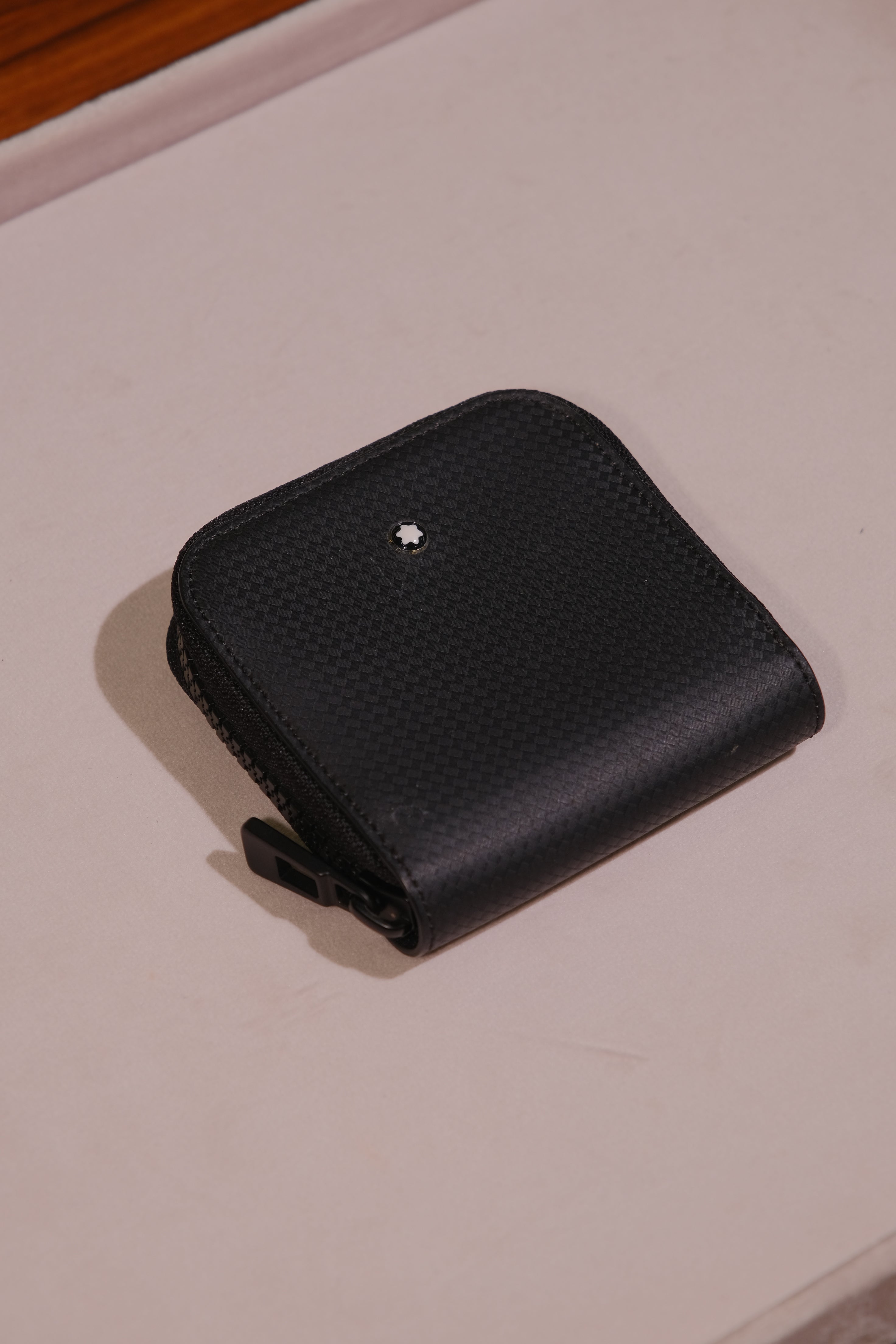 Porta Cartão Montblanc, em couro na cor preta, compartimento único, ferragem em preto e fecho em zíper.