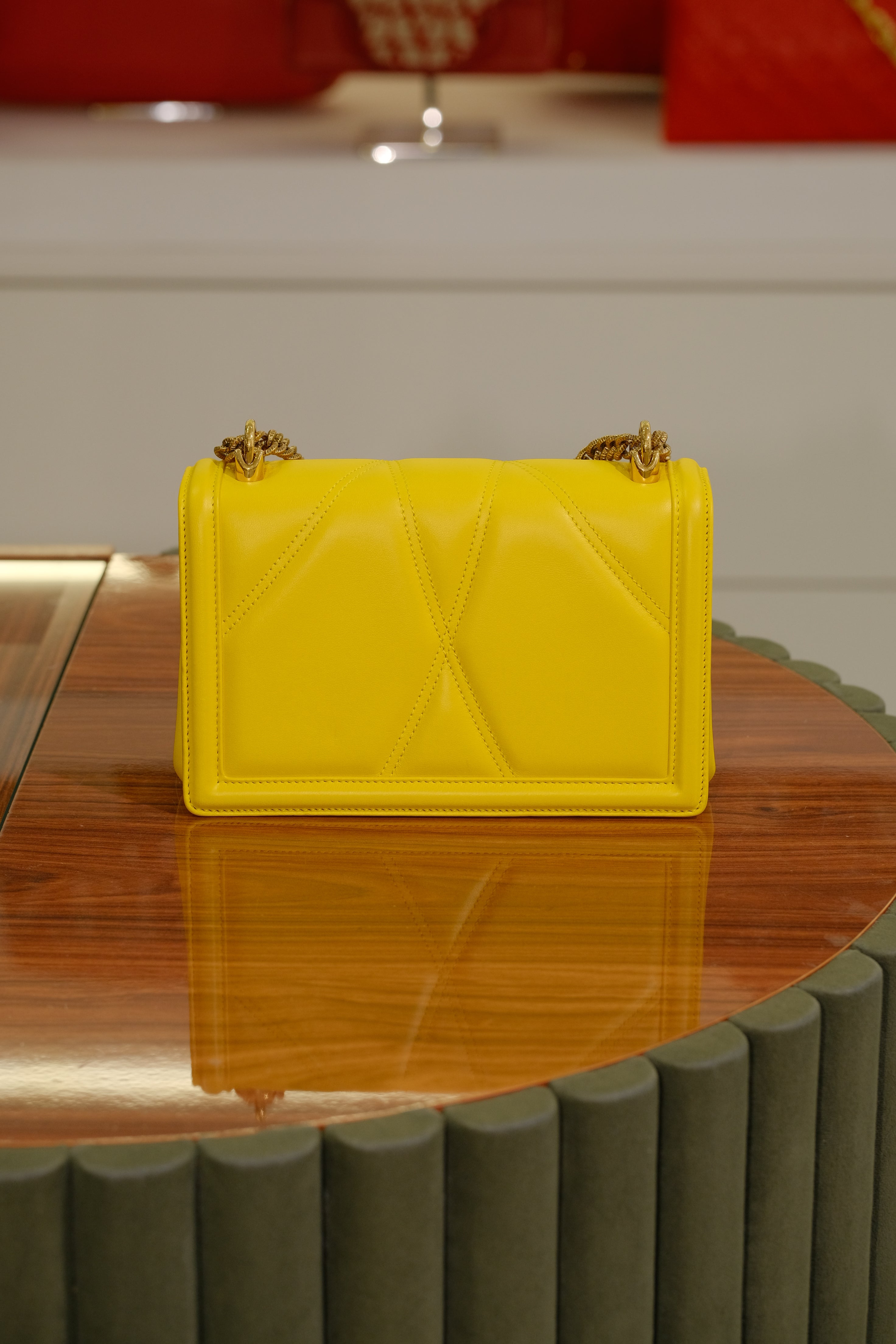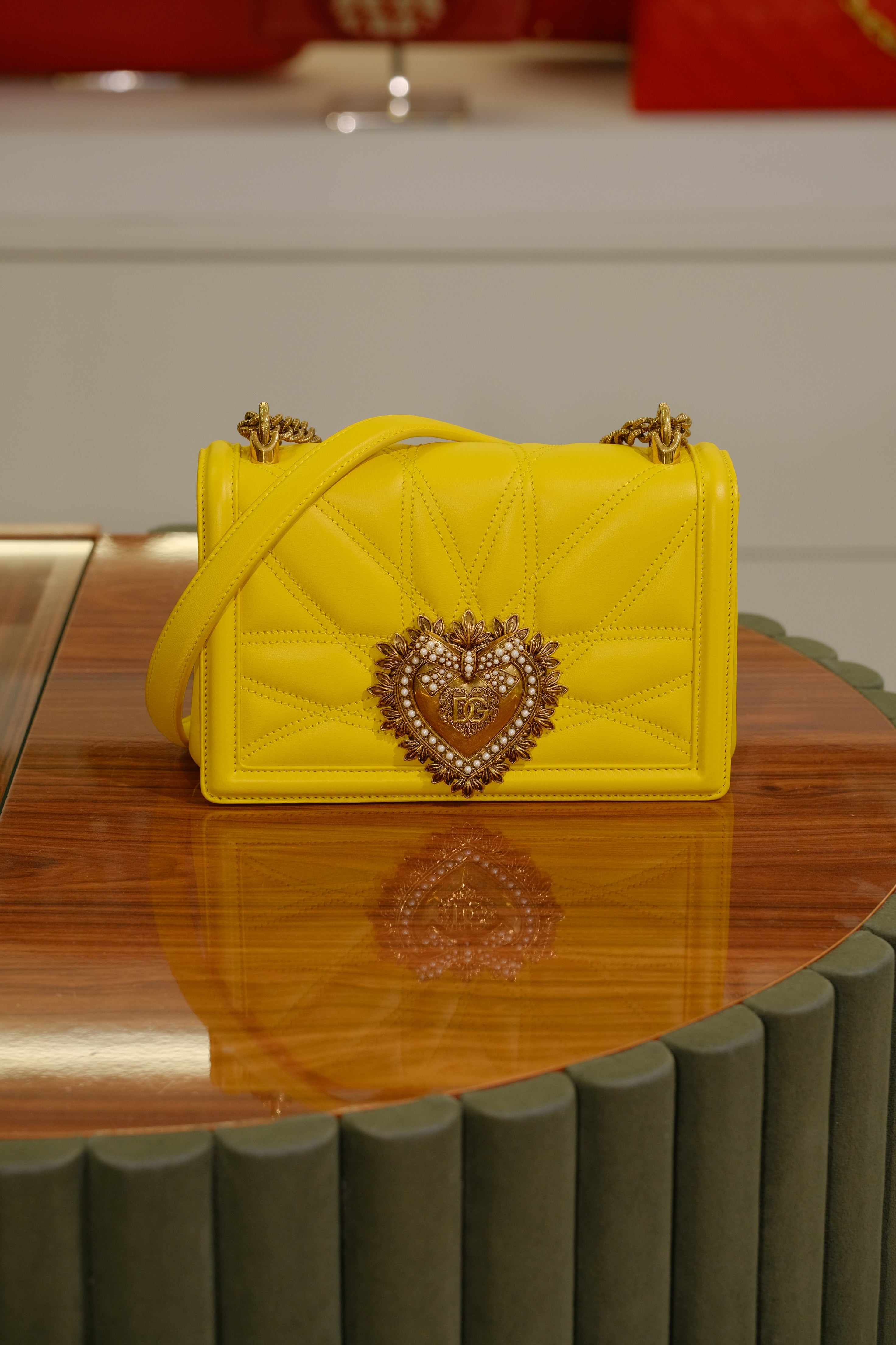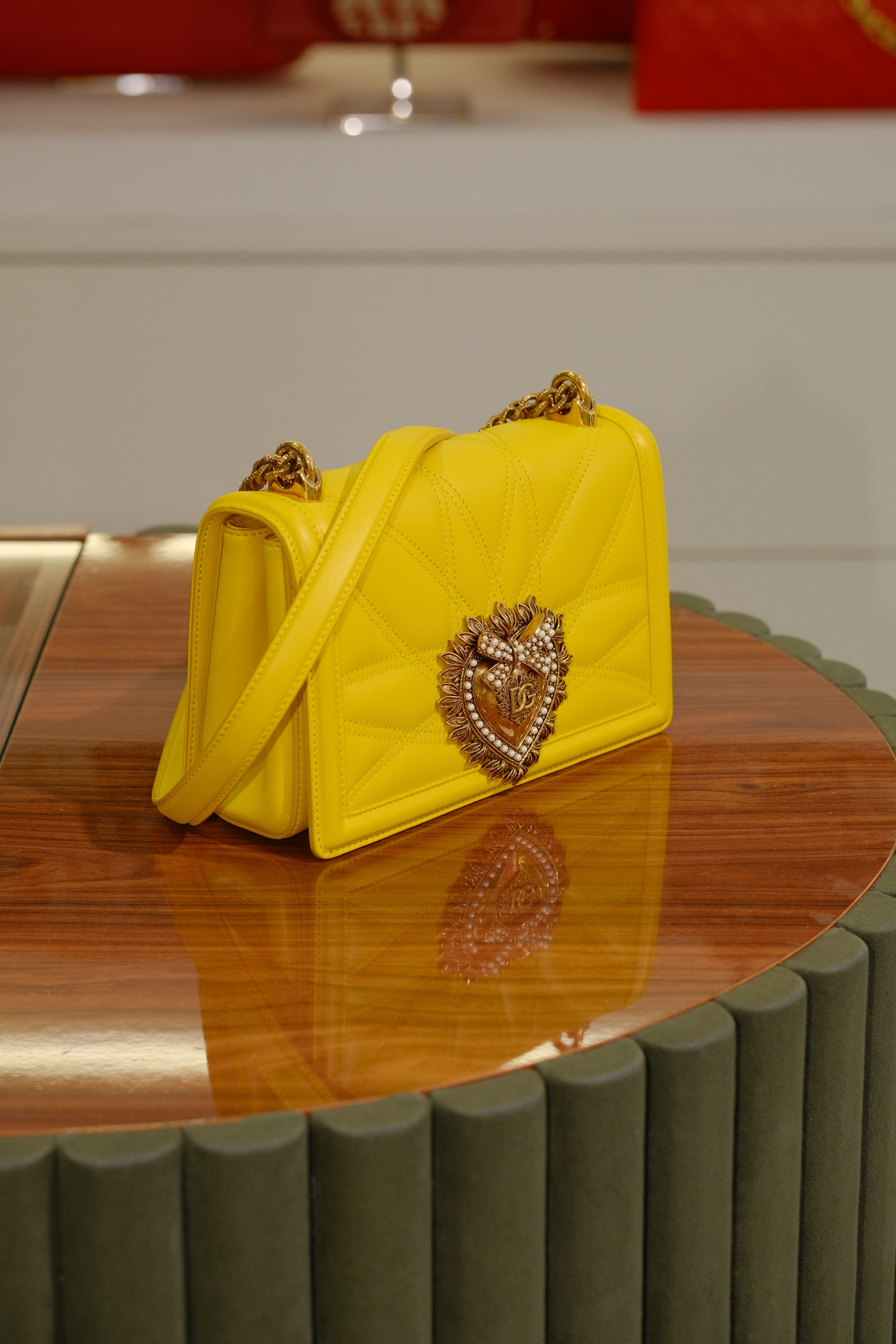 Bolsa Dolce&Gabbana Devotion, em couro na cor amarelo, compartimento único com bolso fechado por zíper, ferragem em dourado, alça longa de corrente e couro e aba frontal com fecho de encaixe.