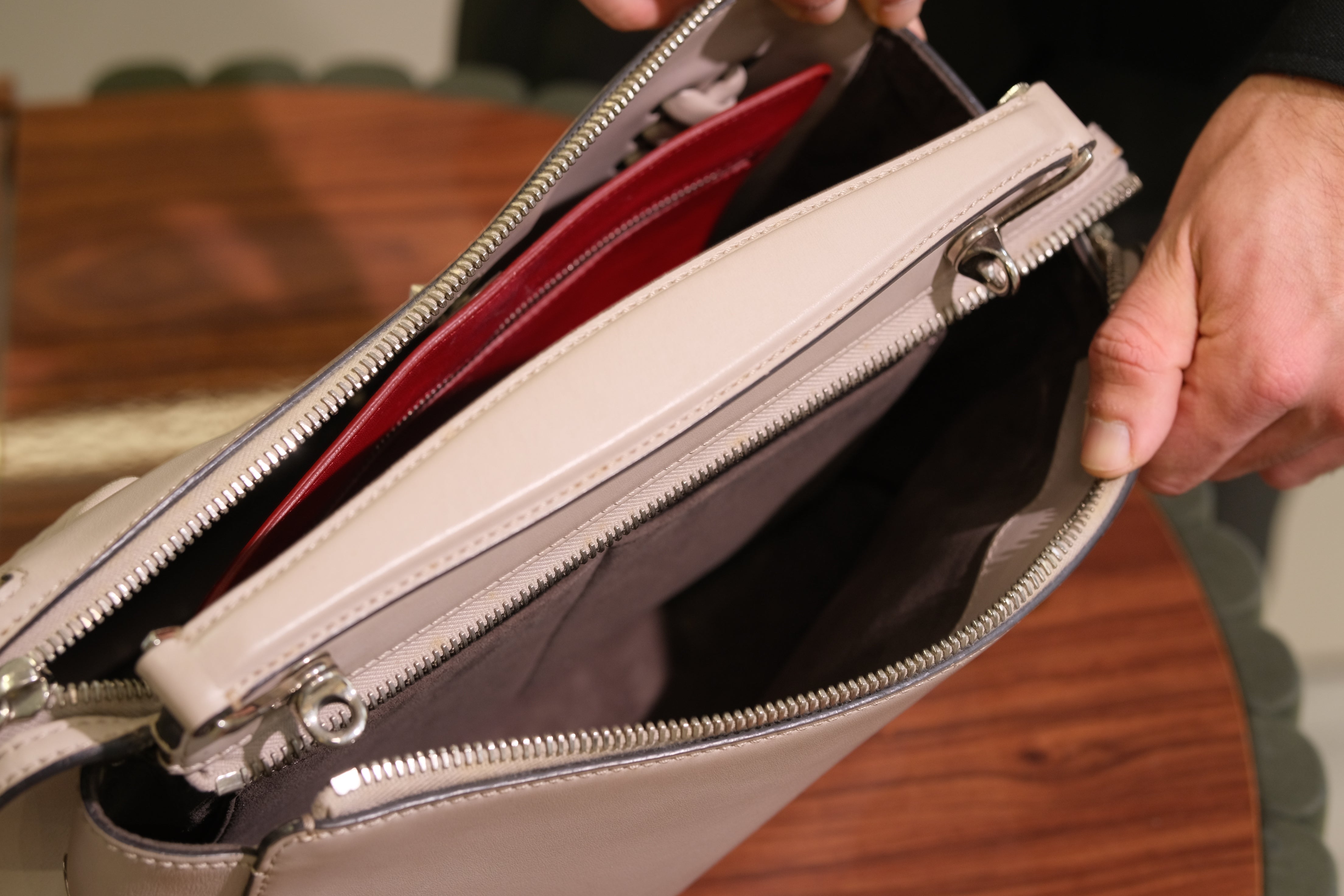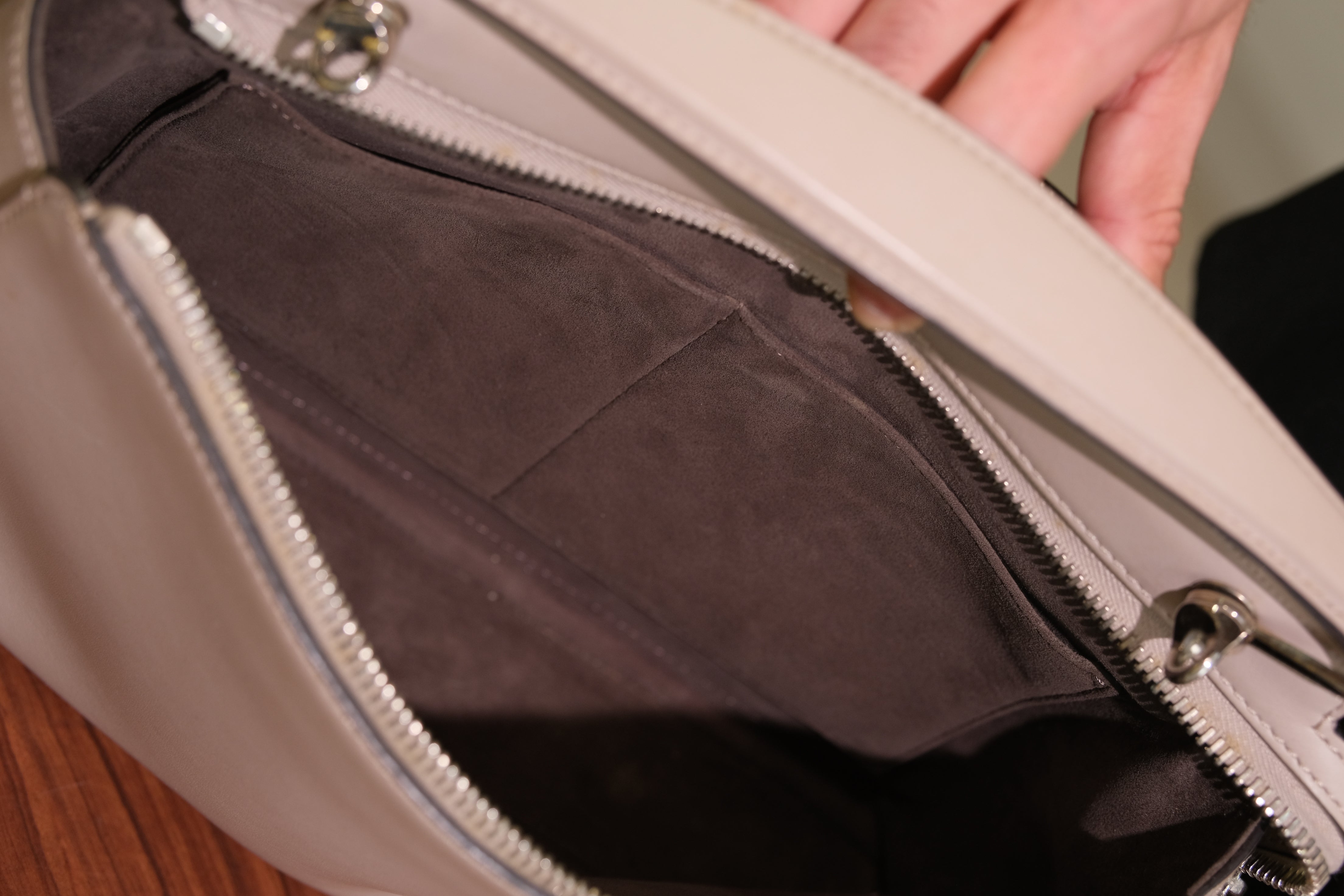 Bolsa Fendi DotCom, em couro na cor bege, compartimento duplo com bolso fechado por zíper, necessaire removível, ferragem em prata, alça de mão e alça longa ajustável e fecho superior por zíper.