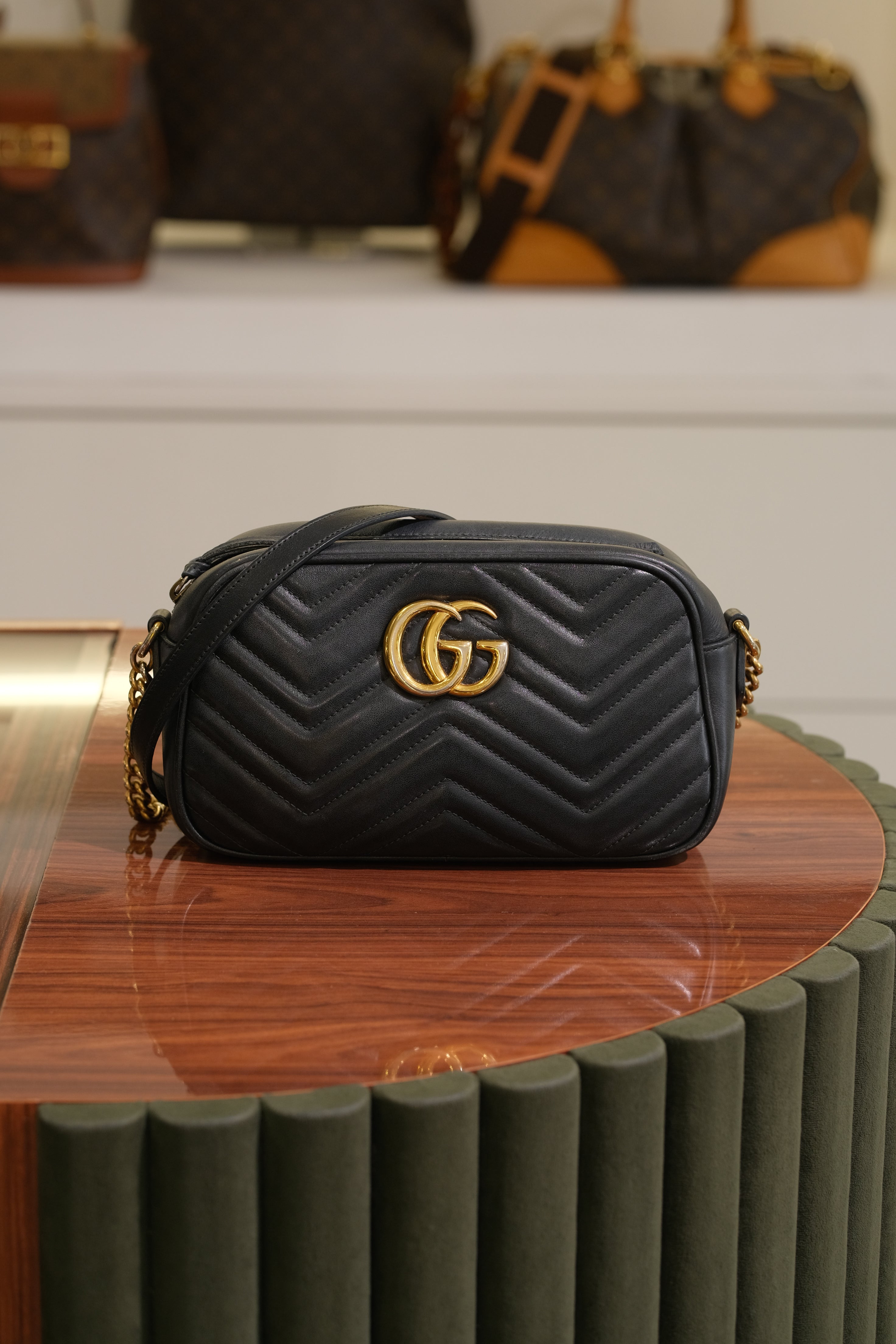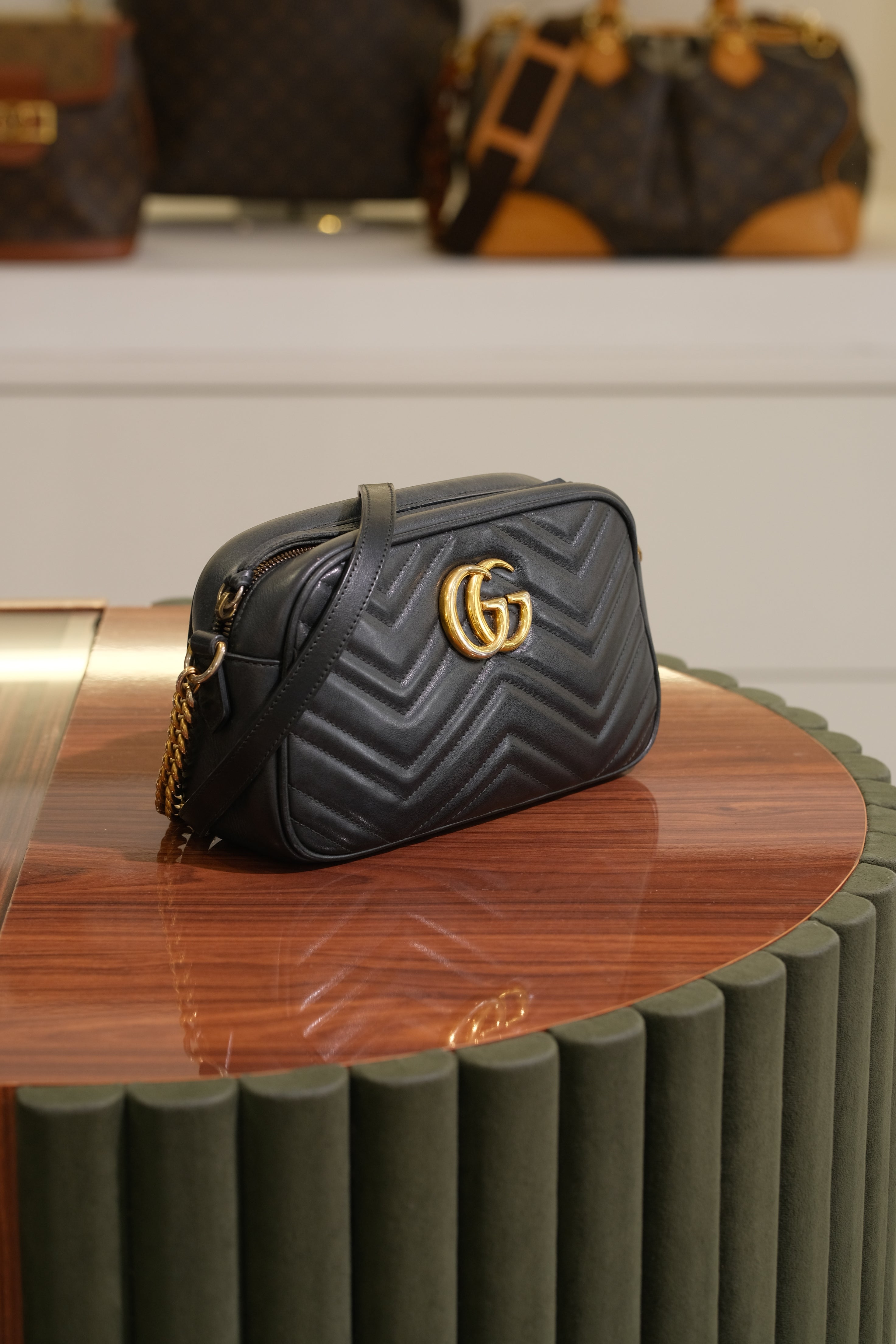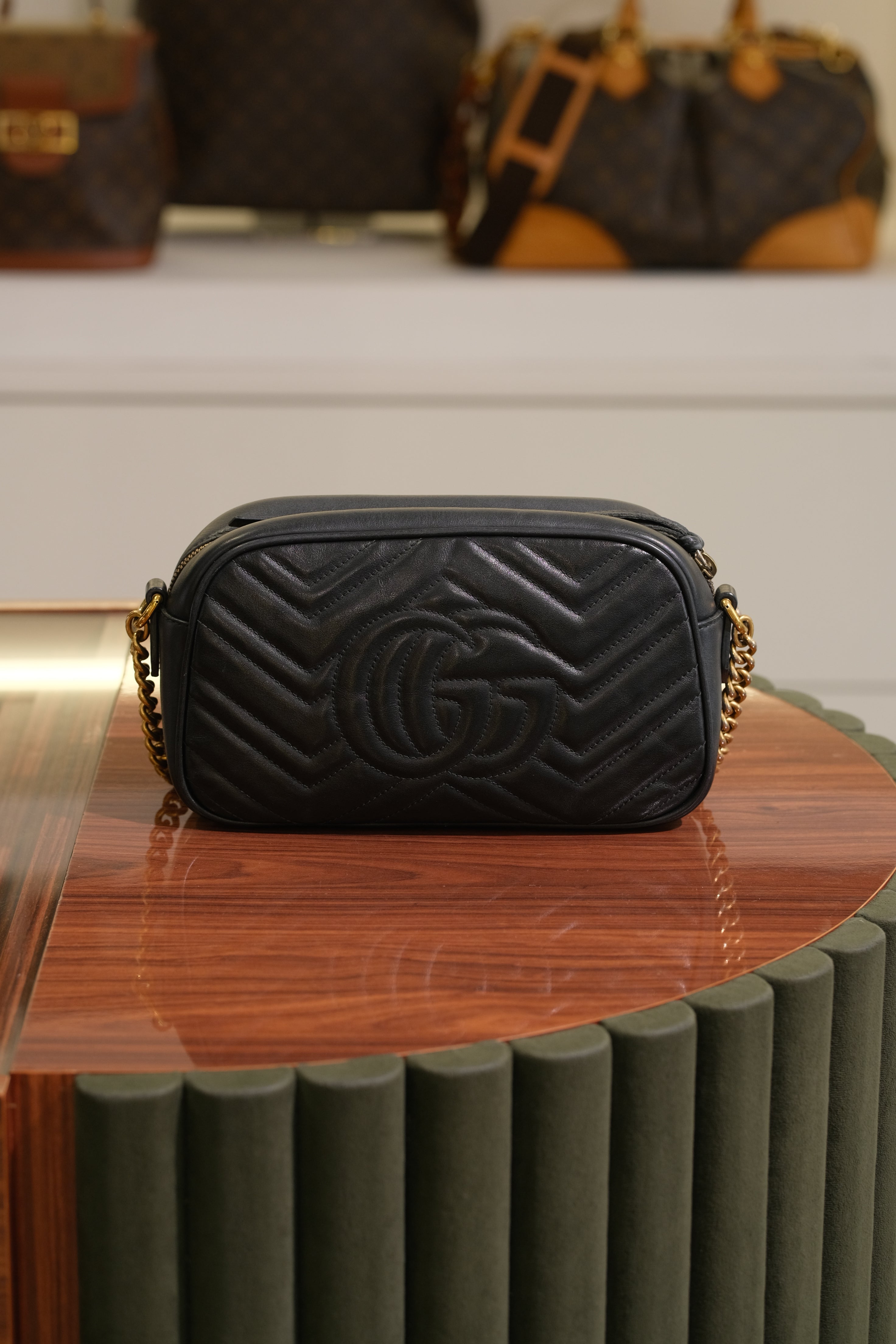 Bolsa Gucci GG Marmont, em couro Calfskin matelassê chevron na cor preto, bolso interno, alça longa de corrente e couro, fecho de zíper na parte superior e ferragem em dourado.