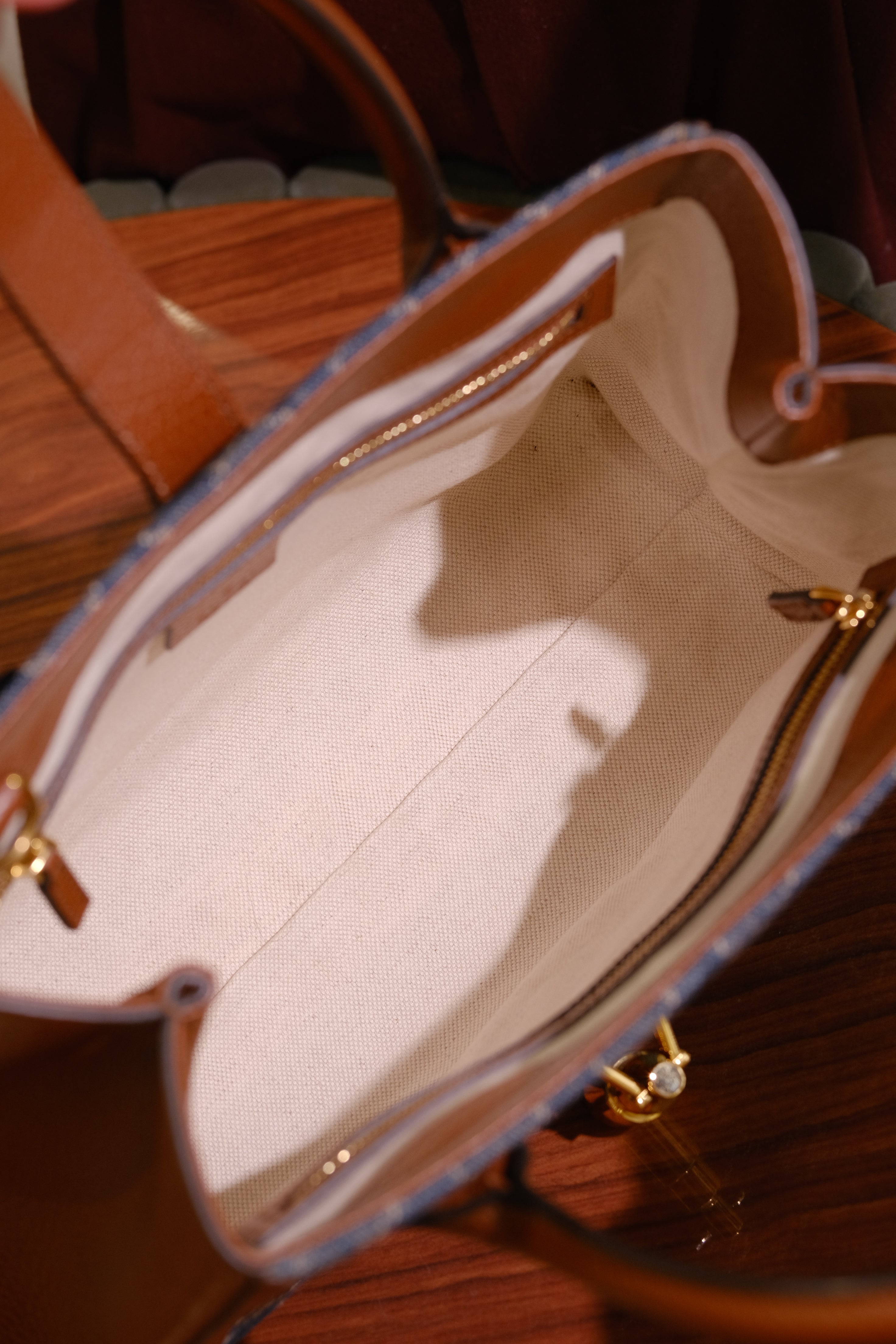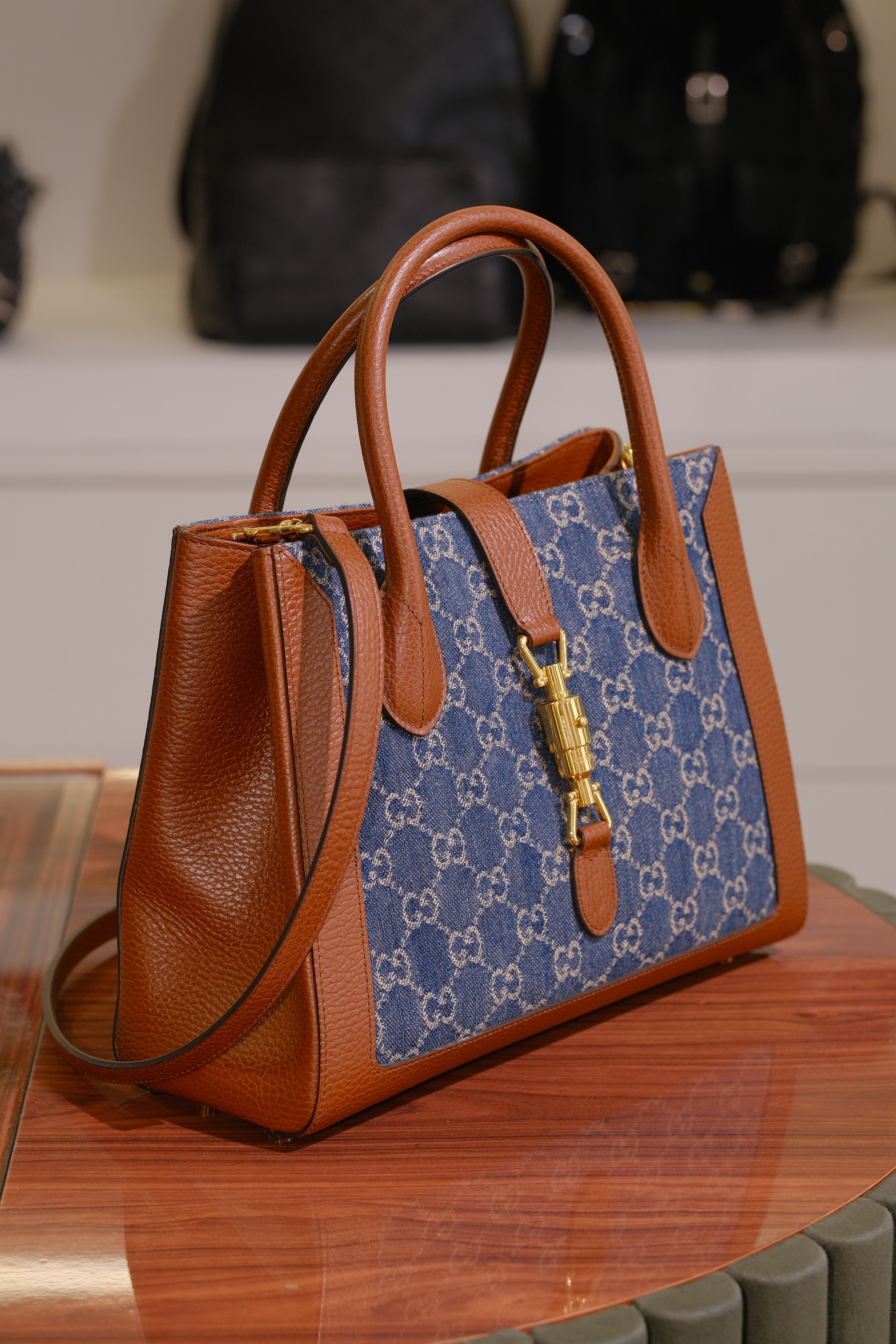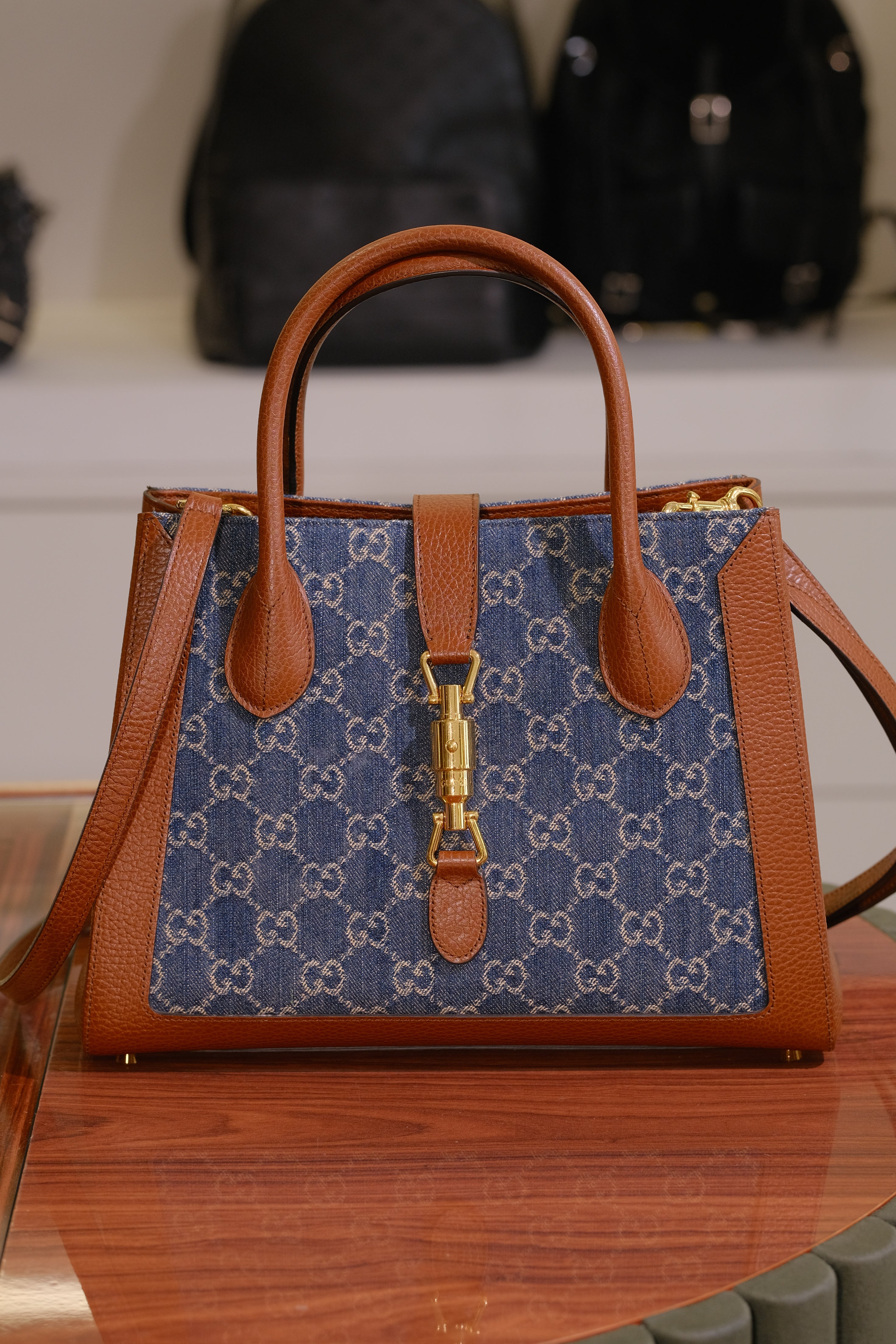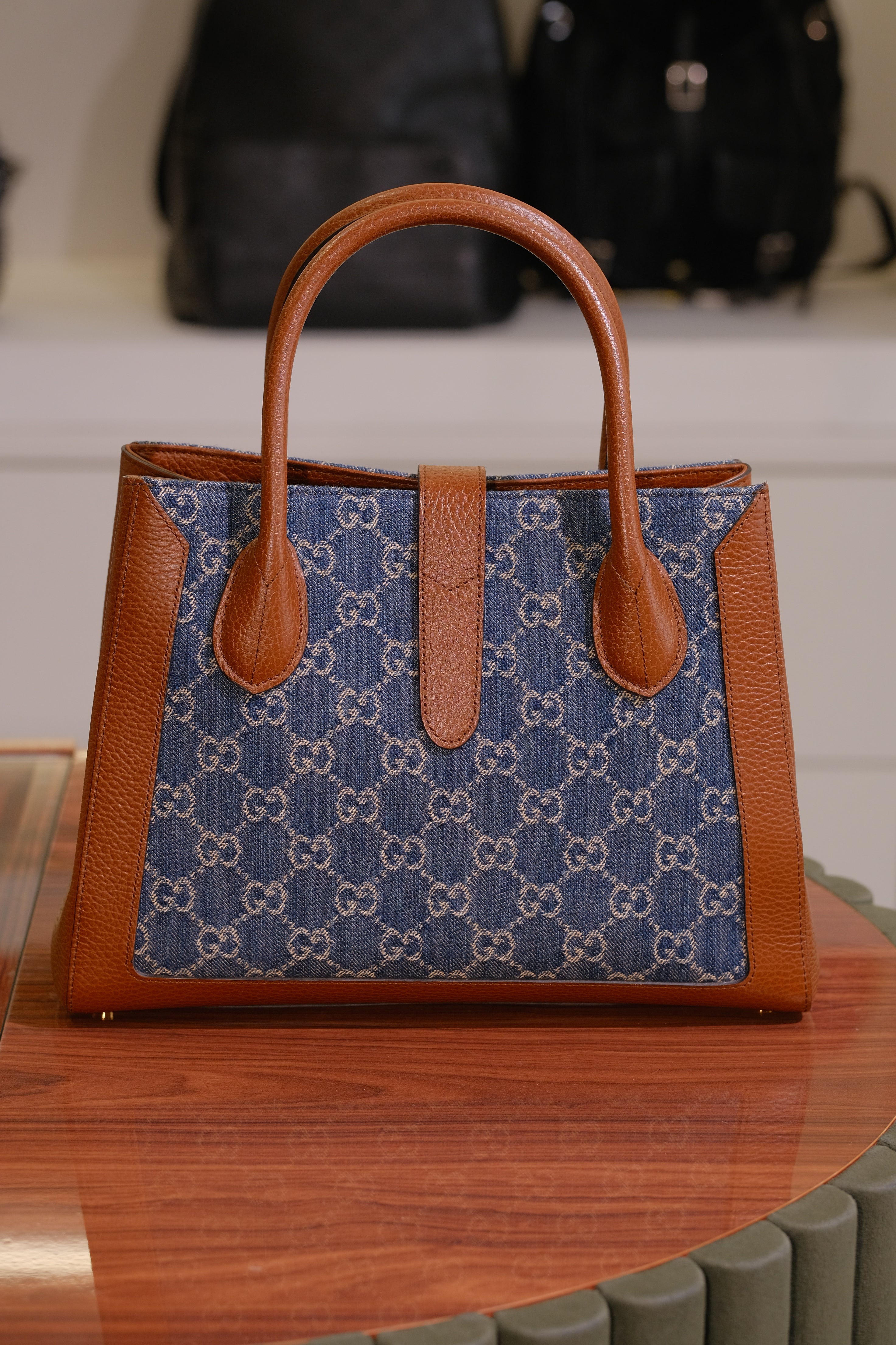 Bolsa Gucci Jackie Tote Bag, em jacquard denim GG e detalhes em couro na cor marrom, compartimento único com dois bolsos internos fechados por zíper, ferragem em dourado, alça dupla de mão e alça longa ajustável e fecho de pistão.