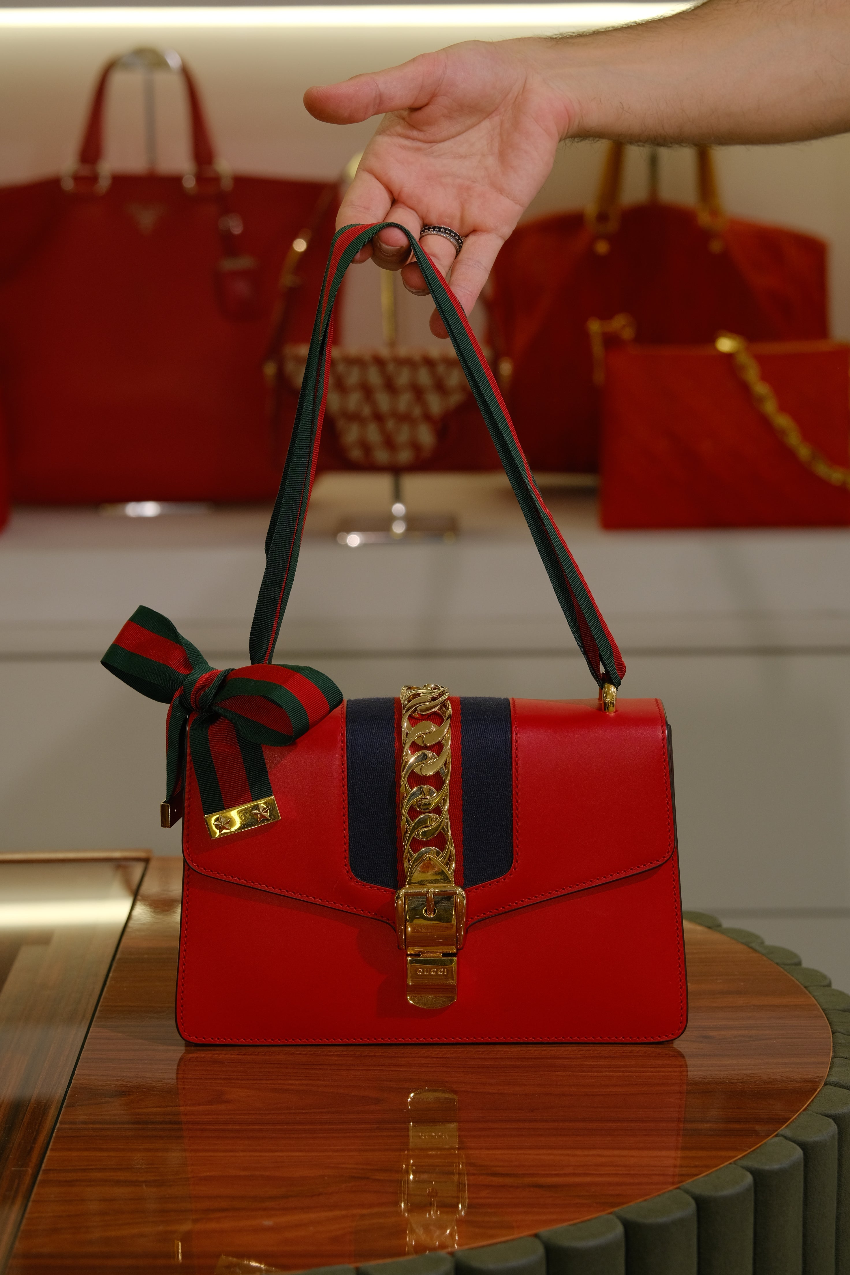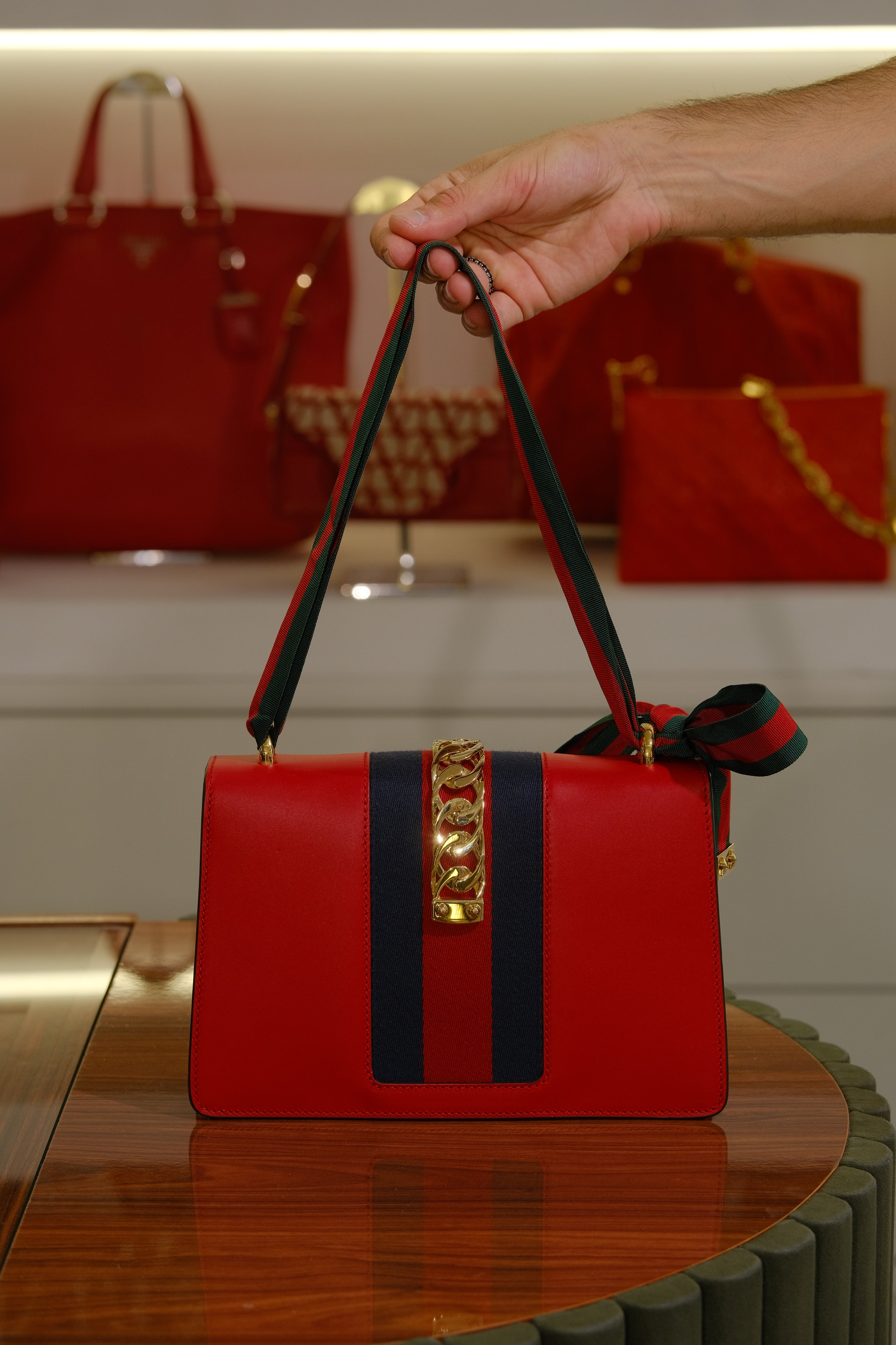 Bolsa Gucci Sylvie, em couro na cor vermelho, compartimento único com bolso fechado por zíper, duas alças (uma em couro e outra em tecido), ferragem em dourado e aba frontal com fecho giratório.