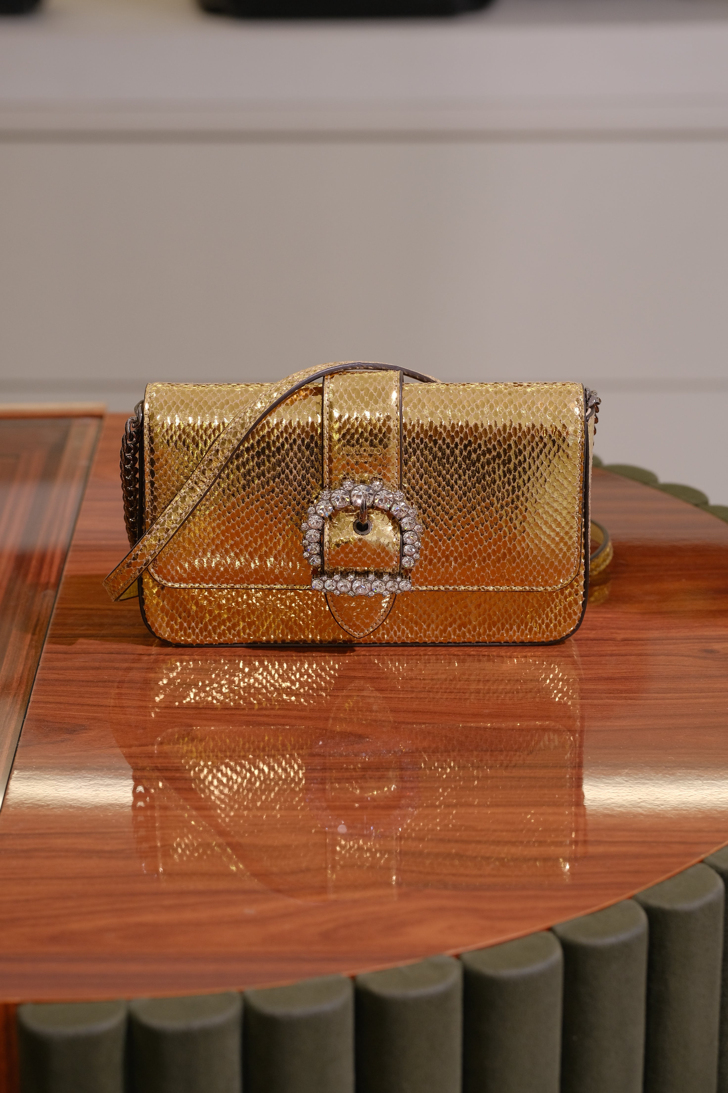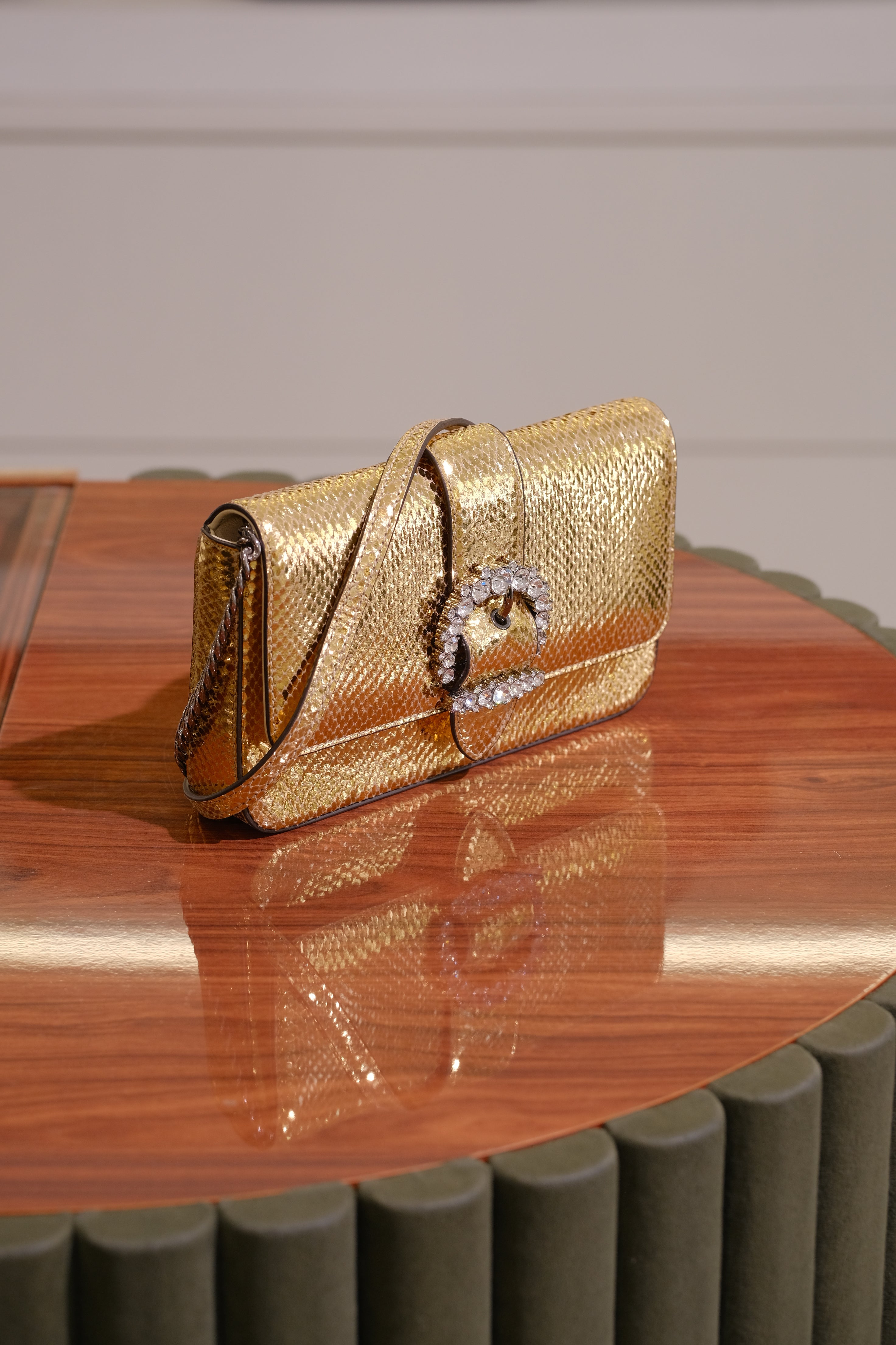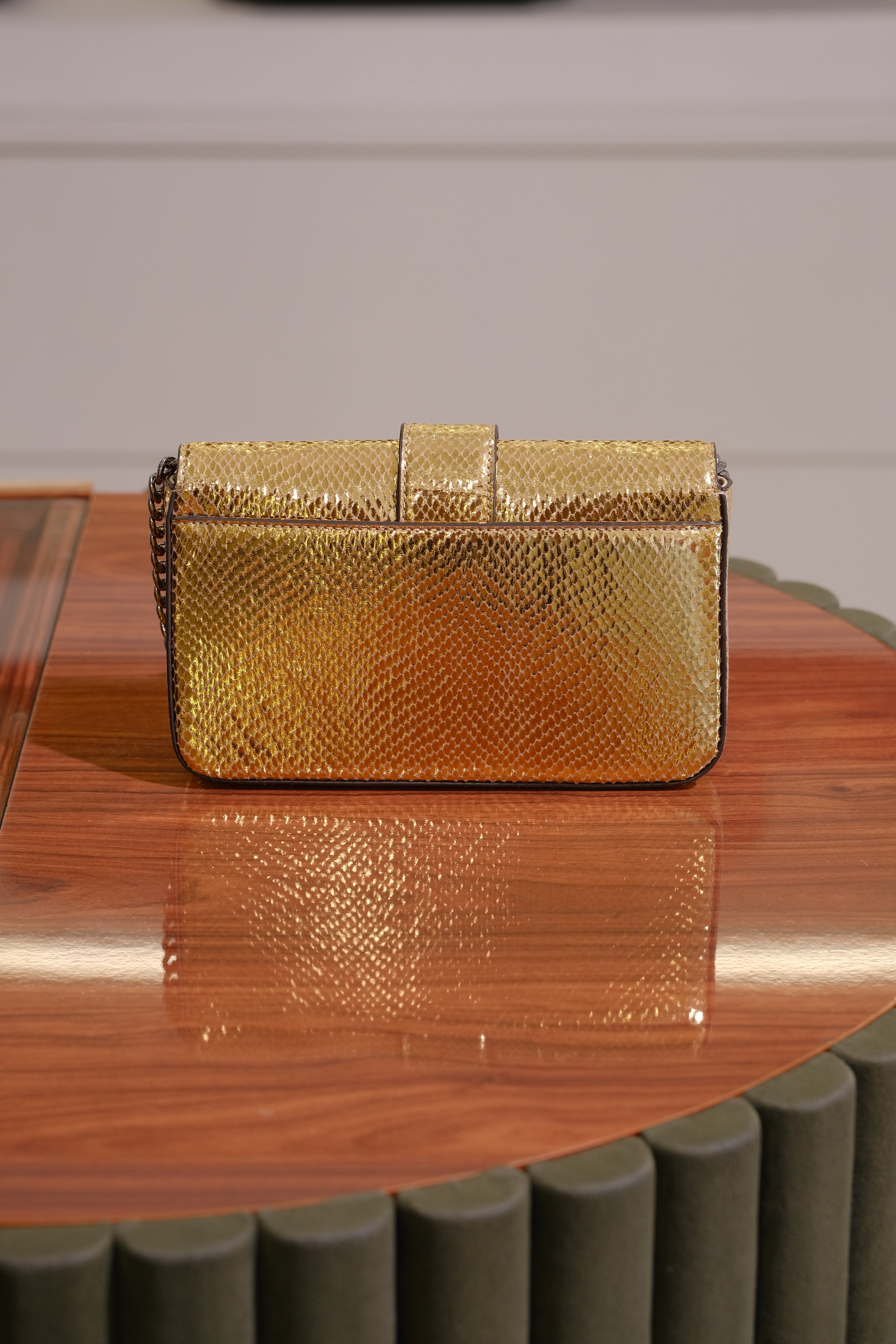 Bolsa Jimmy Choo Cheri, em couro na cor dourada, compartimento único com porta cartões e bolso fechado por zíper, alça longa em couro e corrente, ferragem em prata e aba frontal com fecho em botão de pressão.