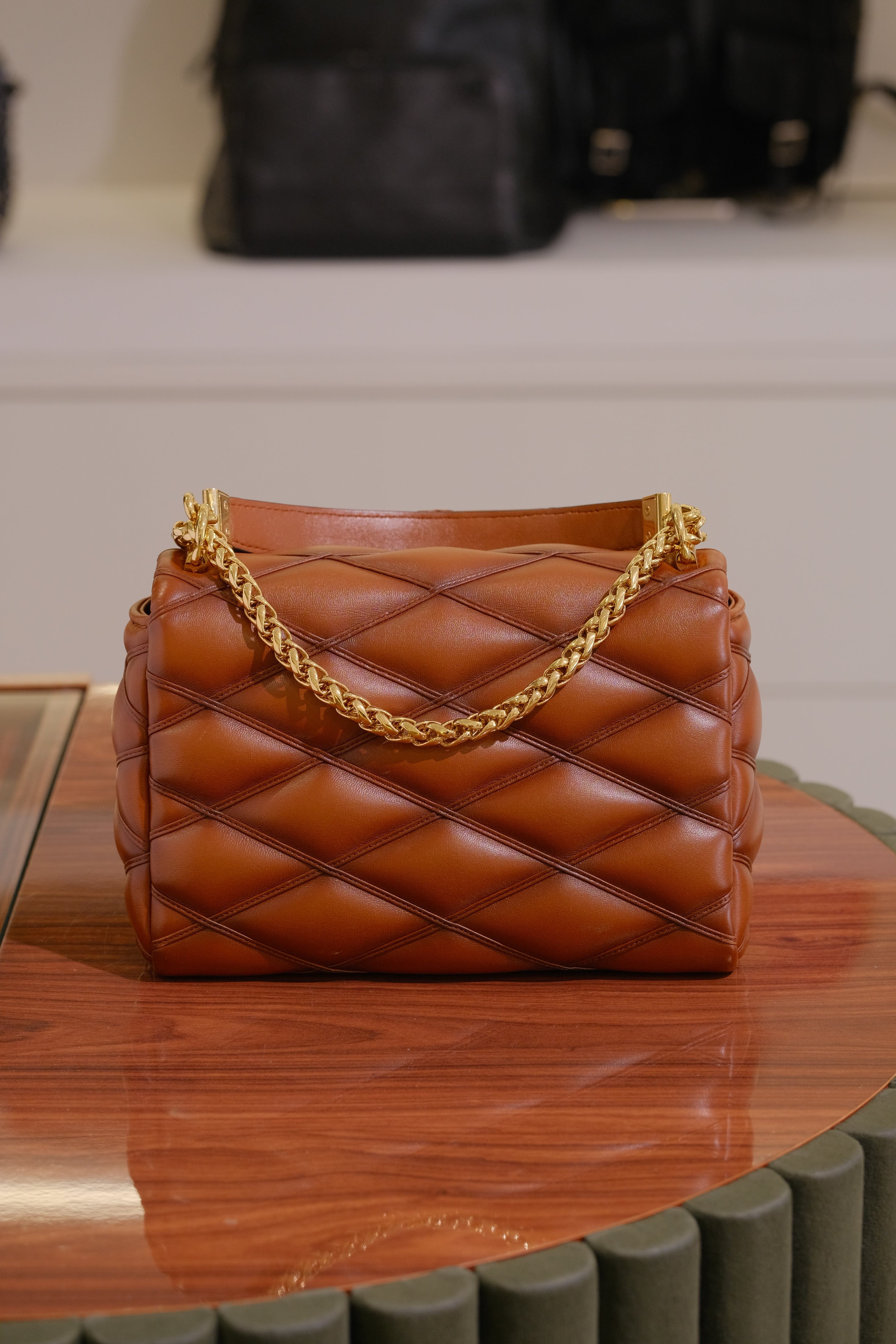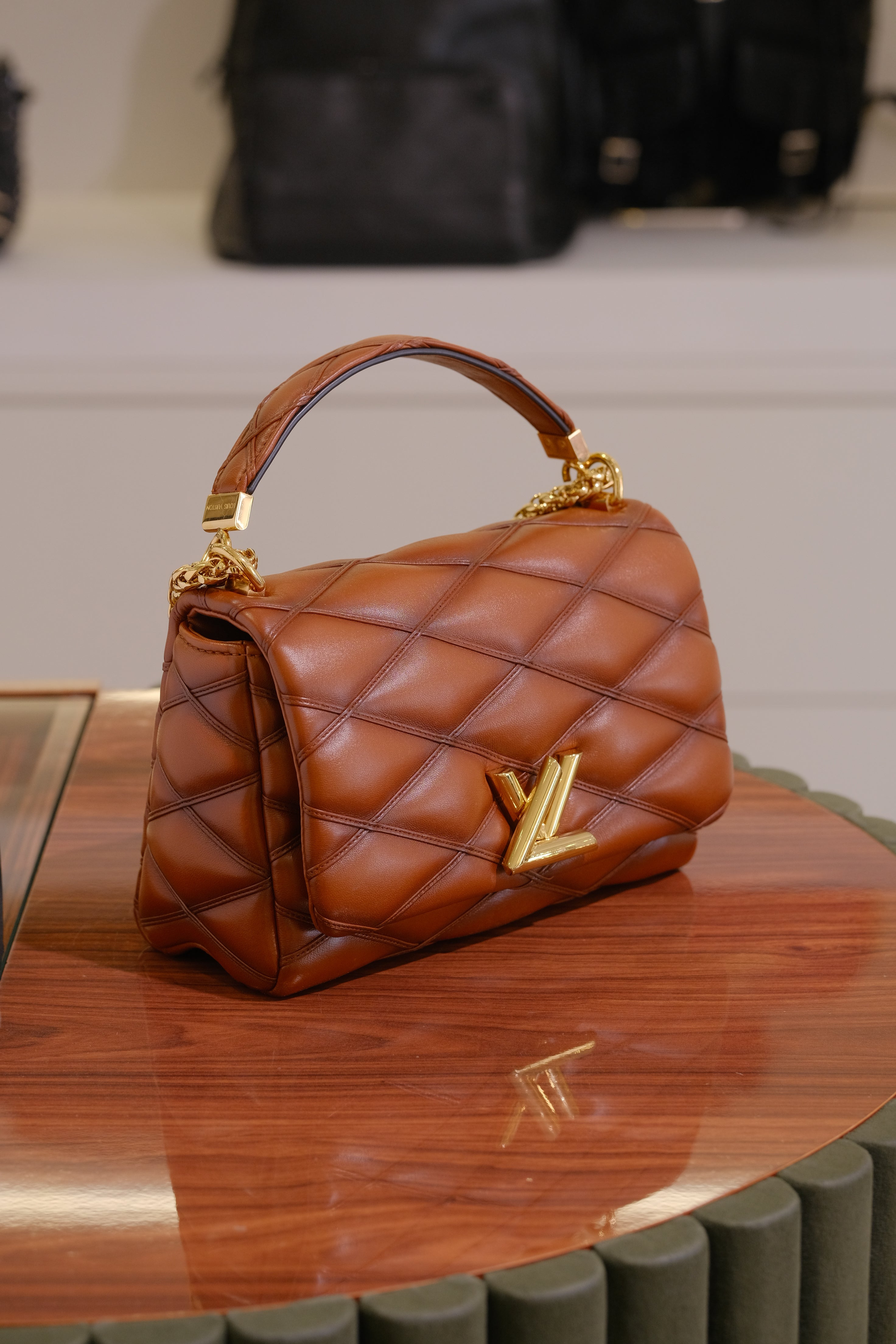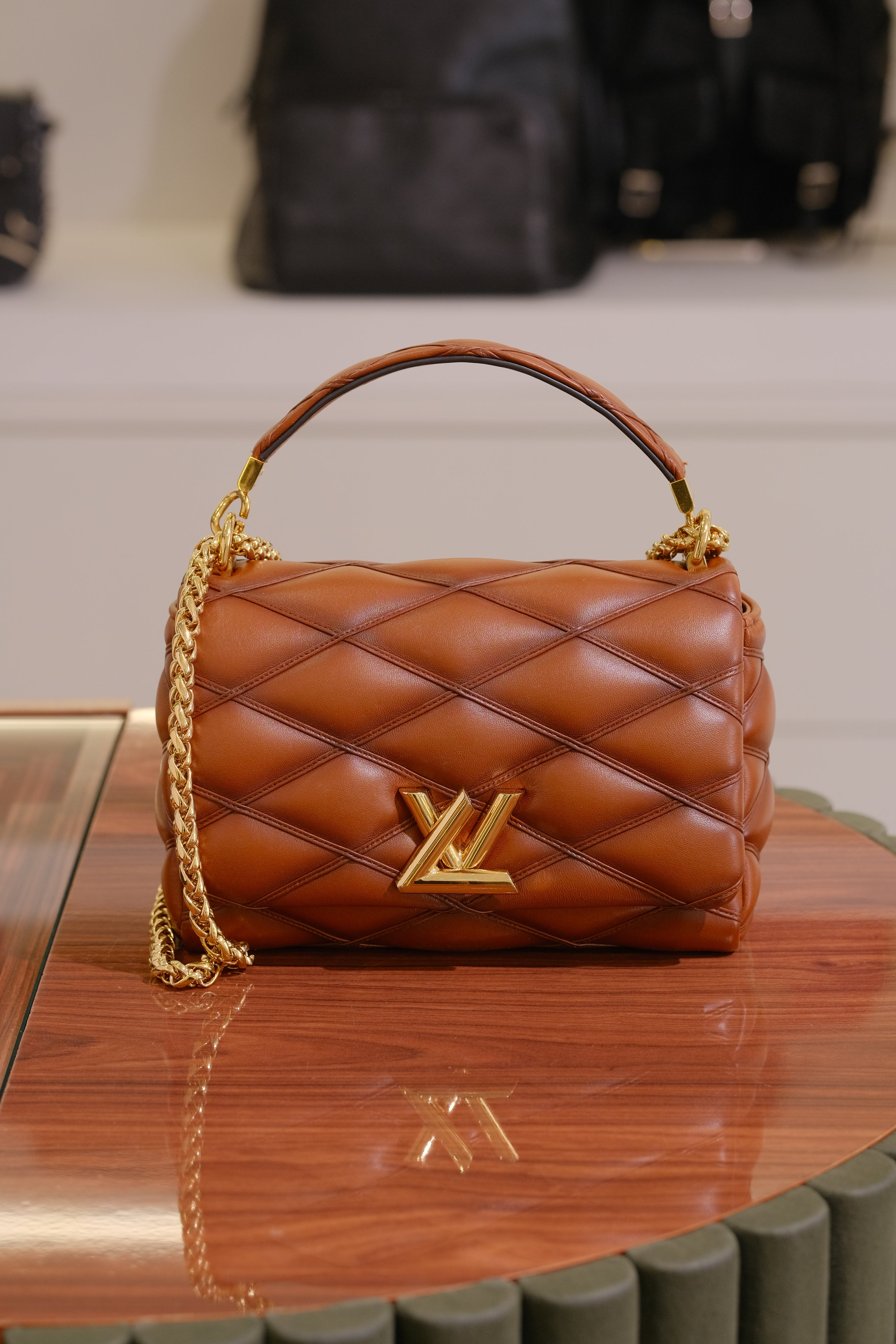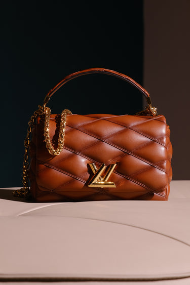 Bolsa Louis Vuitton GO-14, em couro de carneiro acolchoado no matelassê na cor marrom, compartimento único com bolso fechado por zíper, ferragem em durado, alça de mão e alça longa em corrente e aba frontal com fecho de pressão.