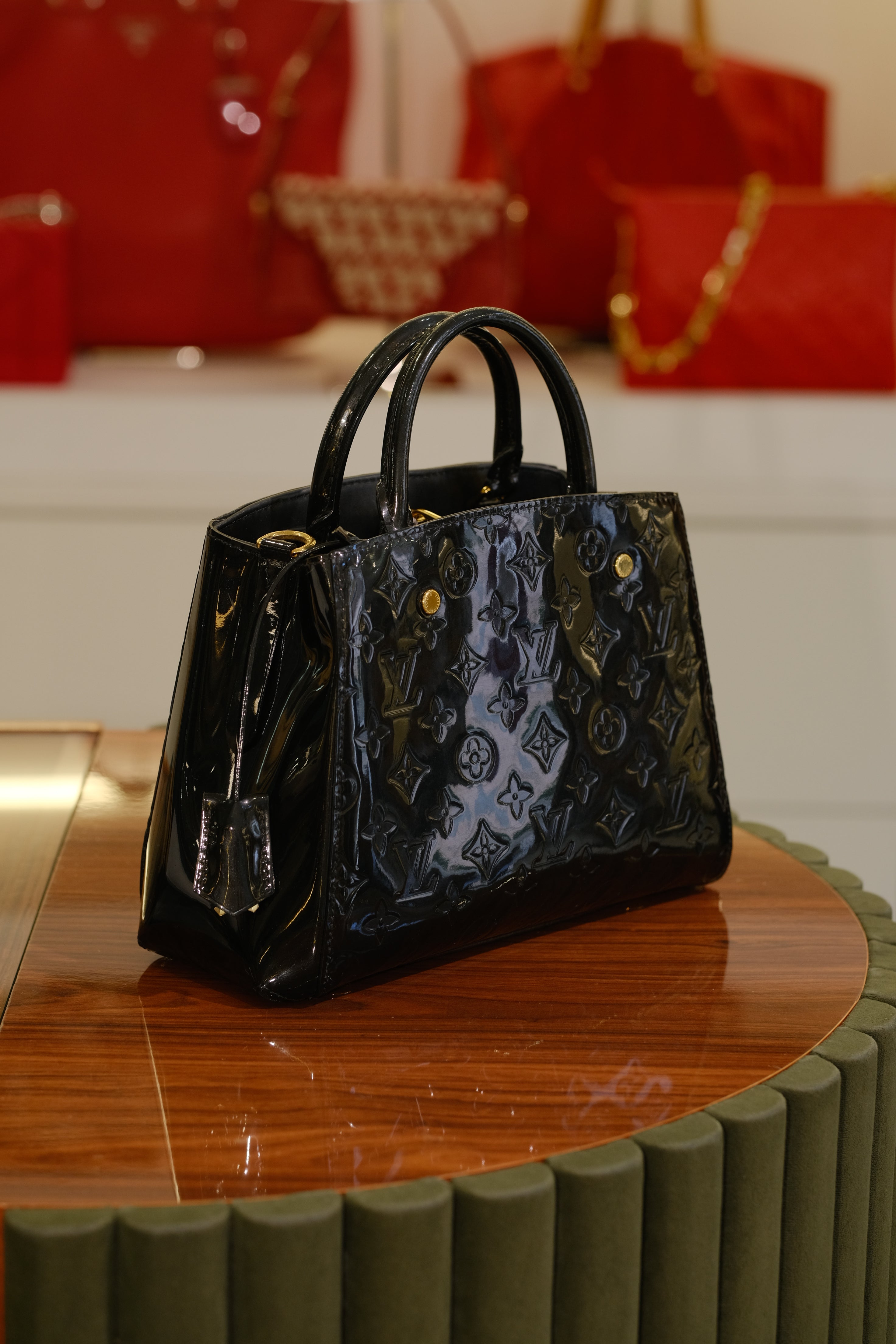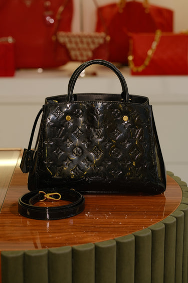Bolsa Louis Vuitton Montaigne, em couro envernizado com monograma na cor preto, compartimento com divisória, bolso fechado por zíper, alça dupla de mão e alça longa ajustável e fecho por encaixe.