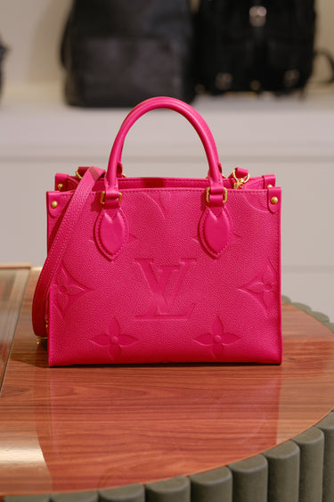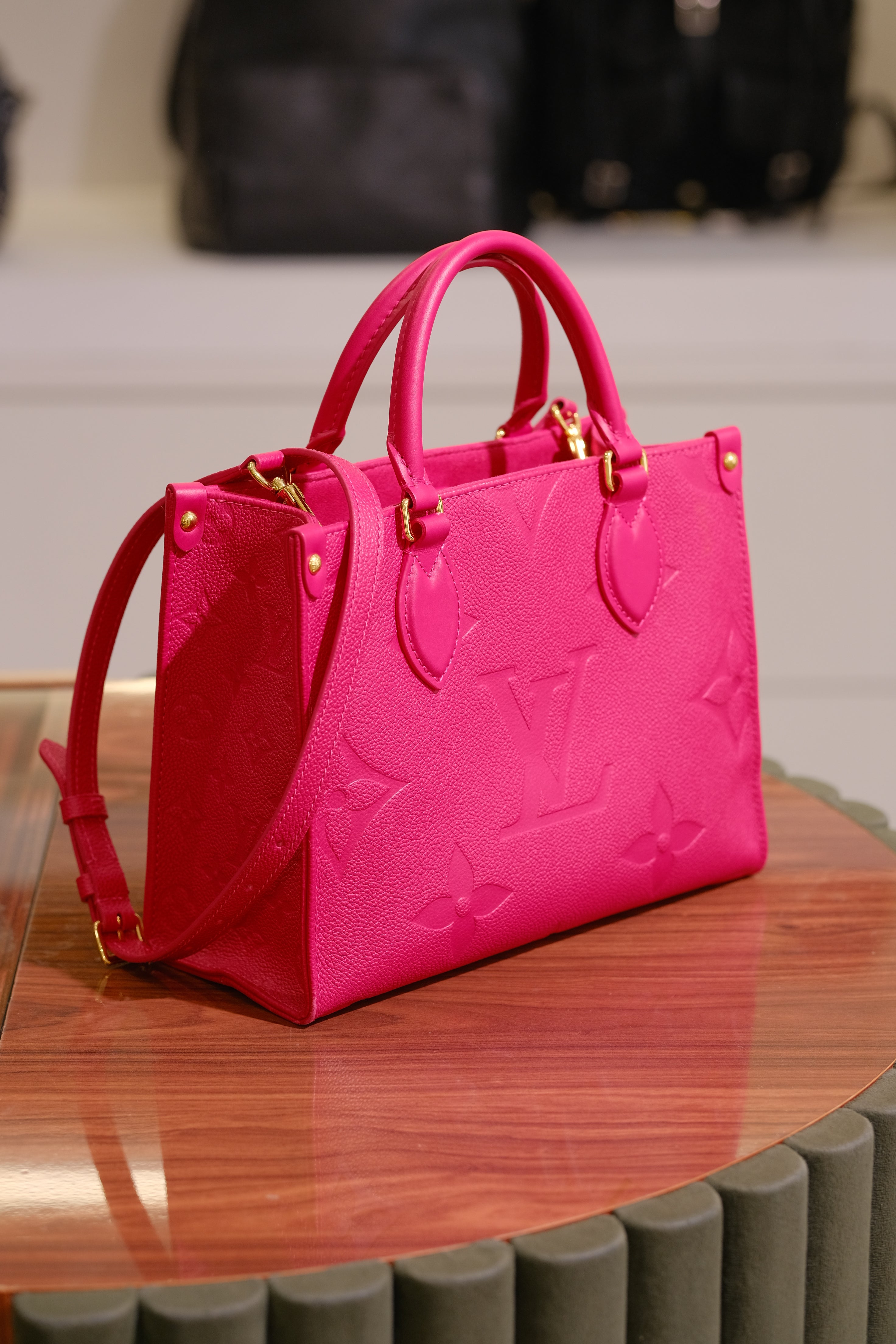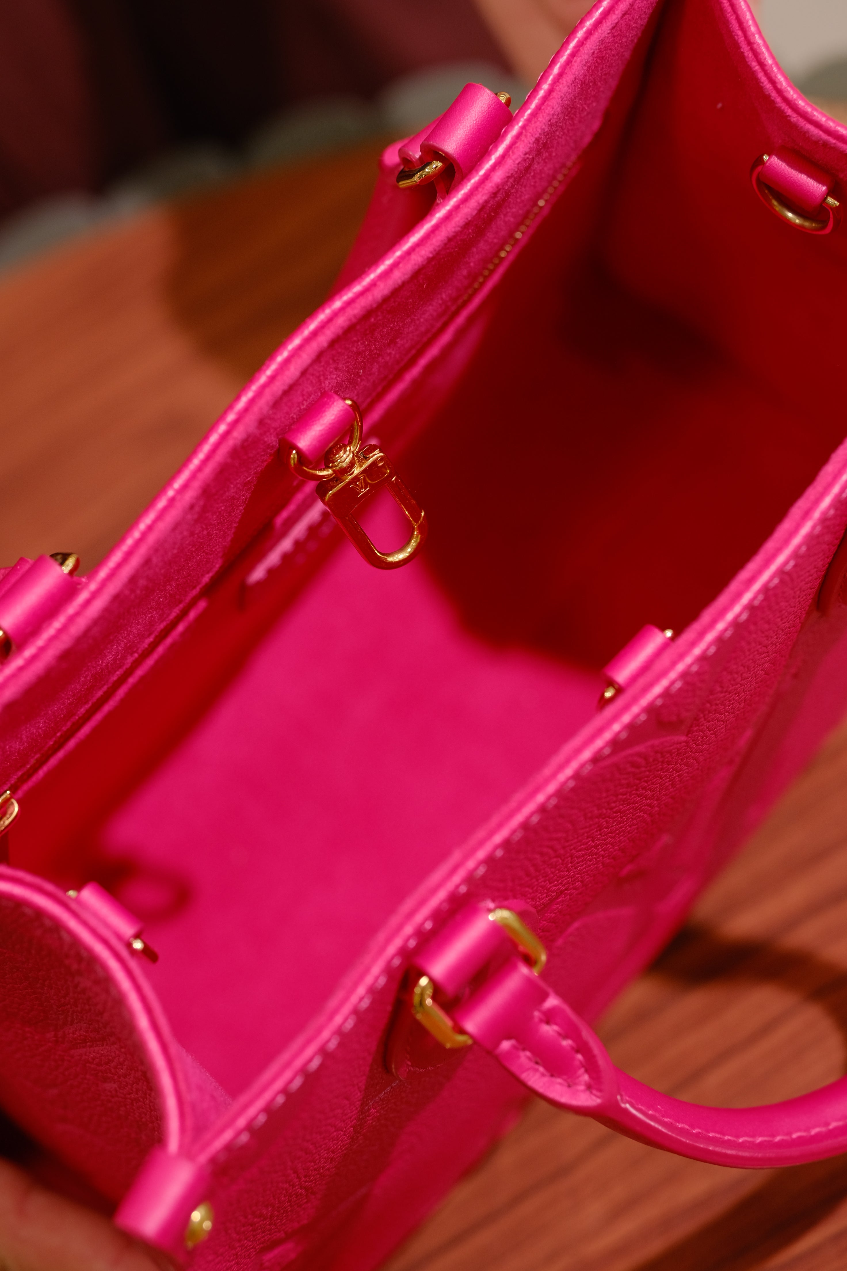 Bolsa Louis Vuitton On The Go, em couro na cor rosa, compartimento único com bolso aberto e bolso fechado por zíper, ferragem em dourado, alça dupla de mão e alça longa ajustável e fecho de encaixe.