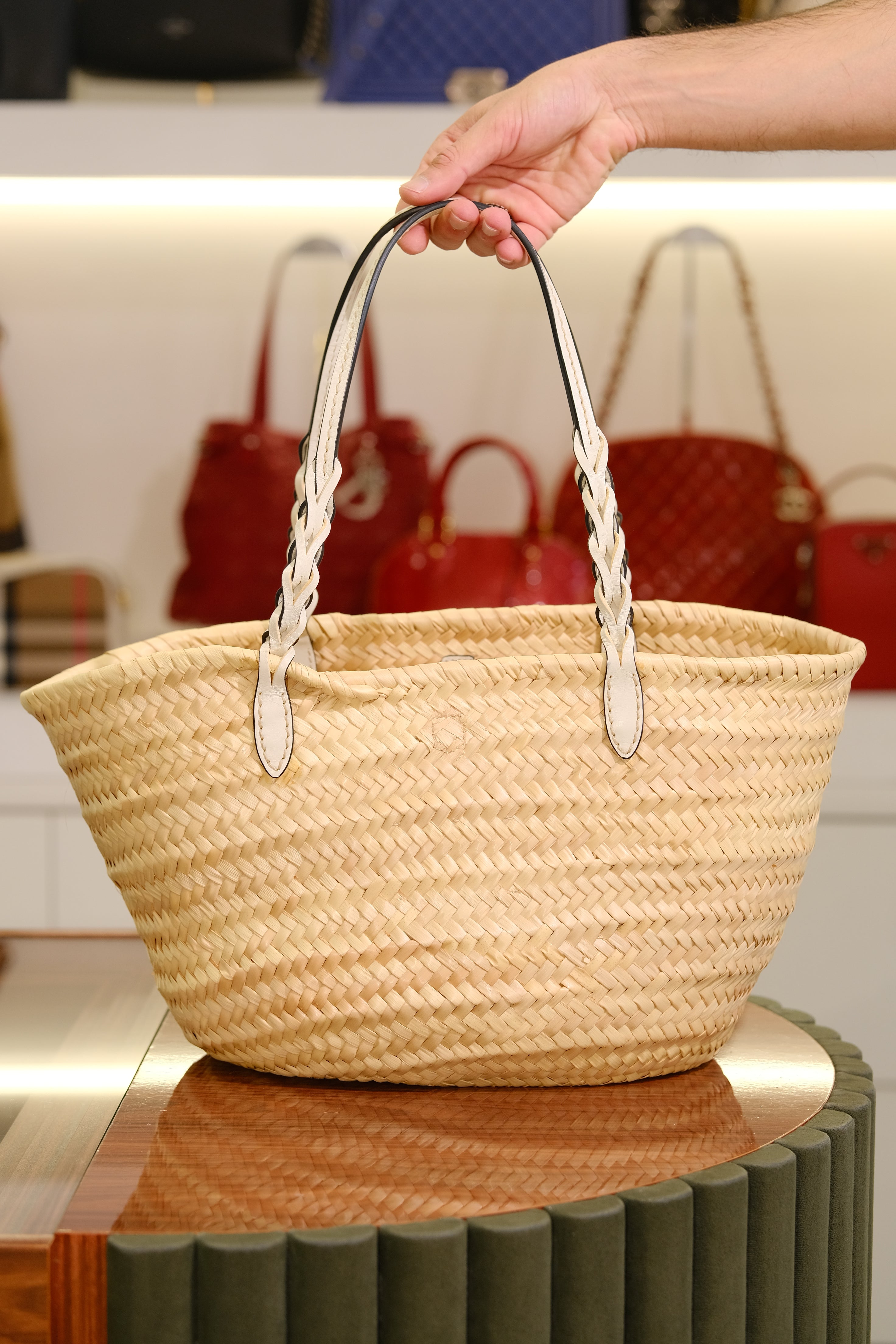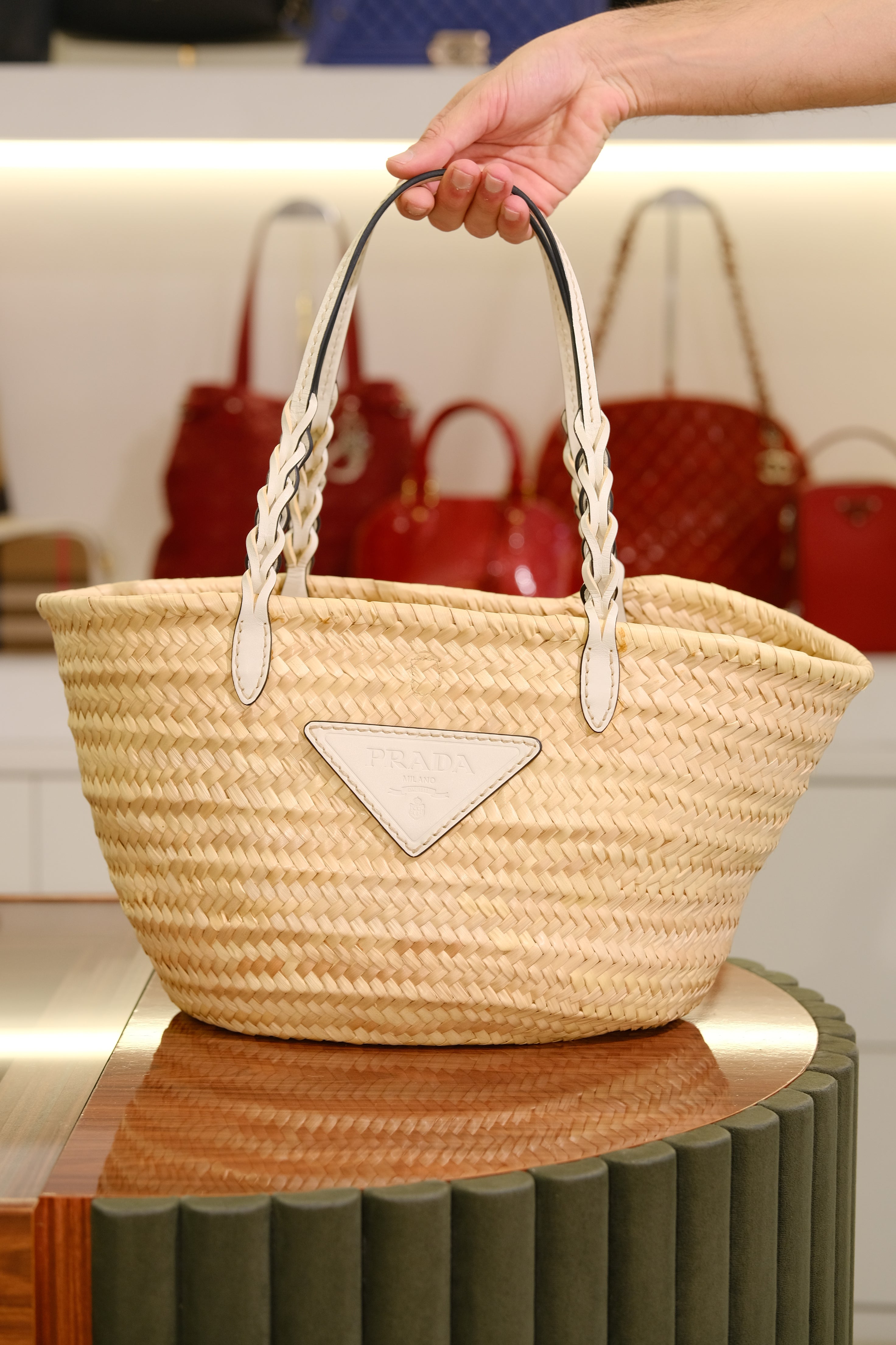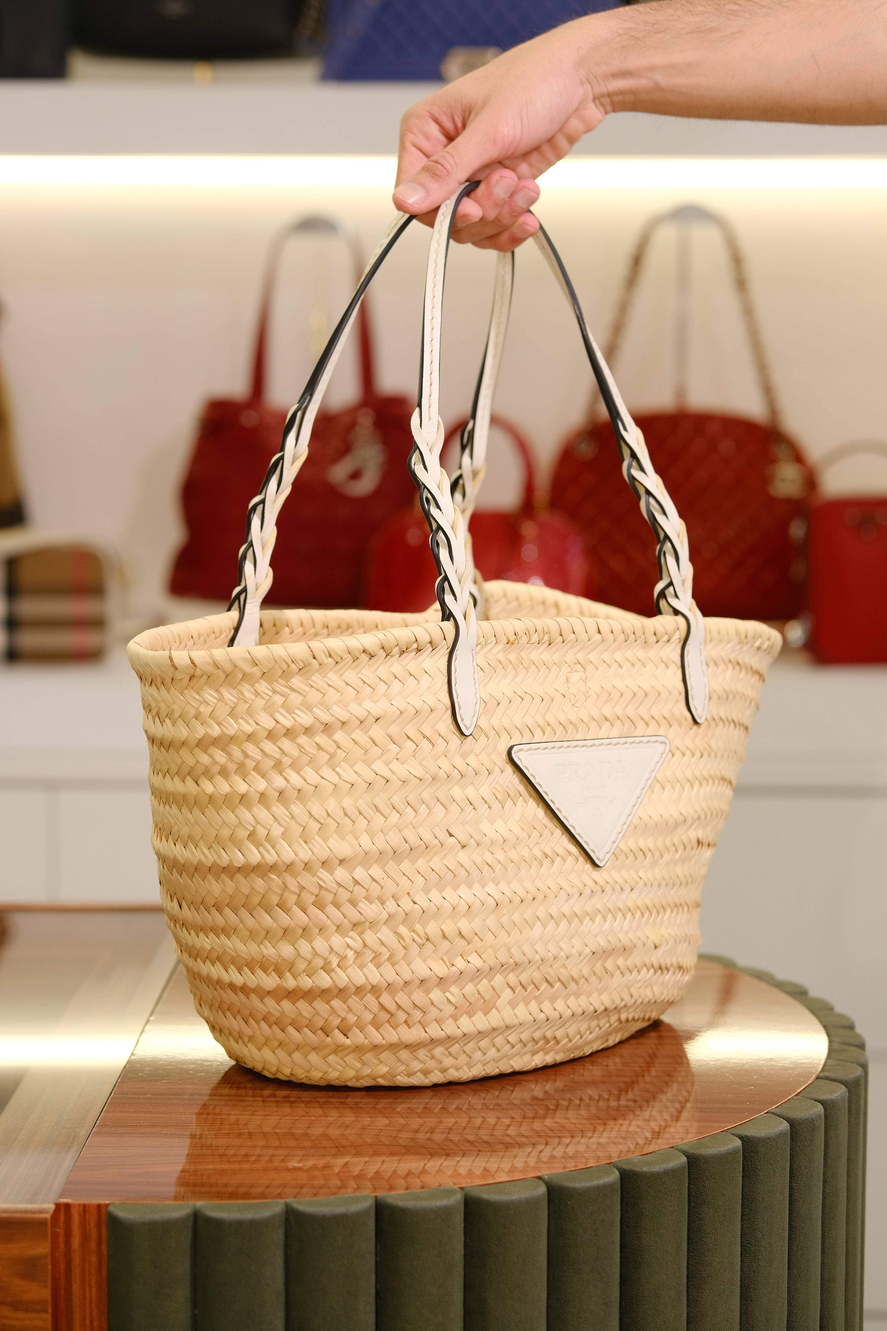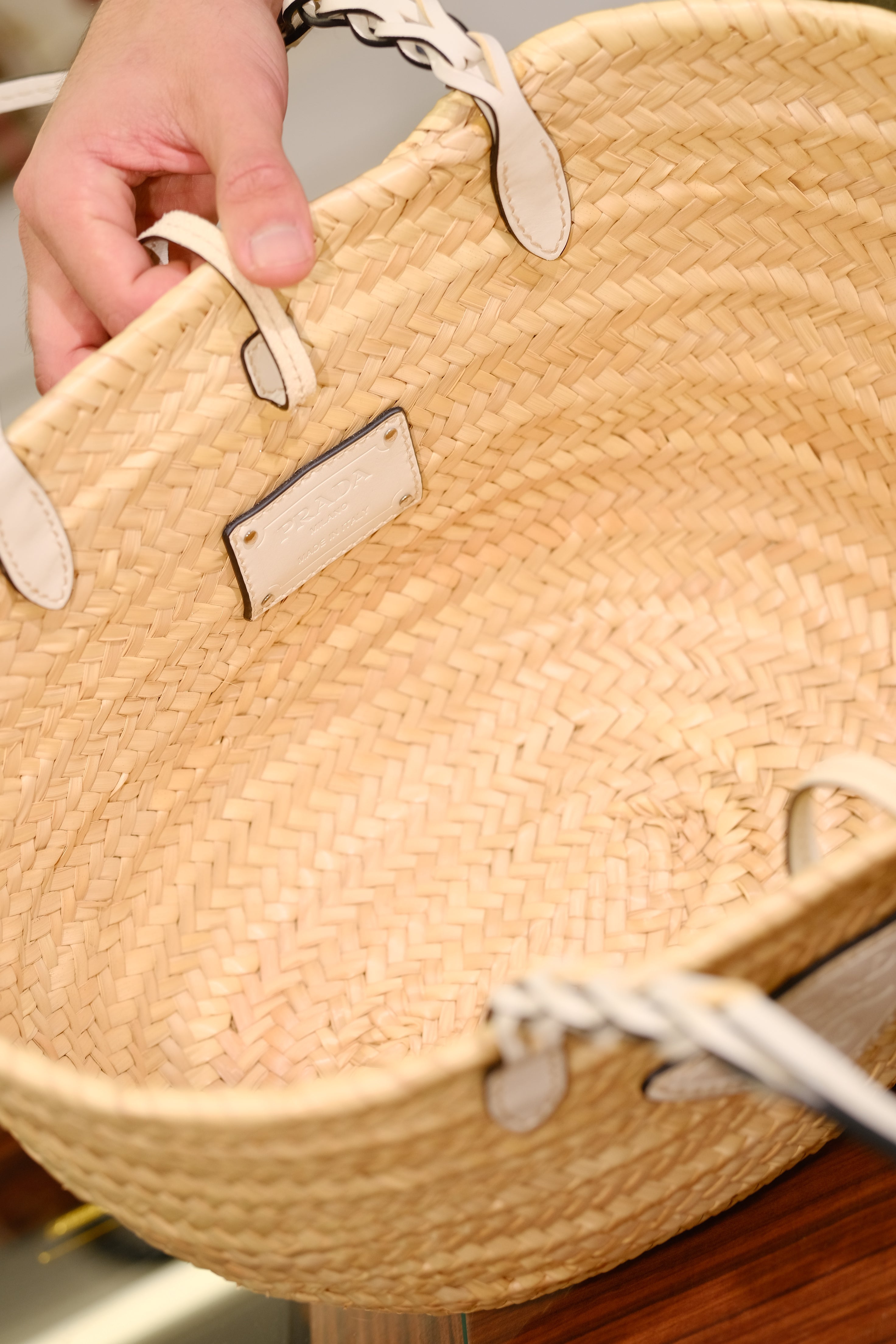 Bolsa Prada Basket, em ráfia na cor bege e detalhes em couro na cor branco, alça dupla de mão e compartimento único.