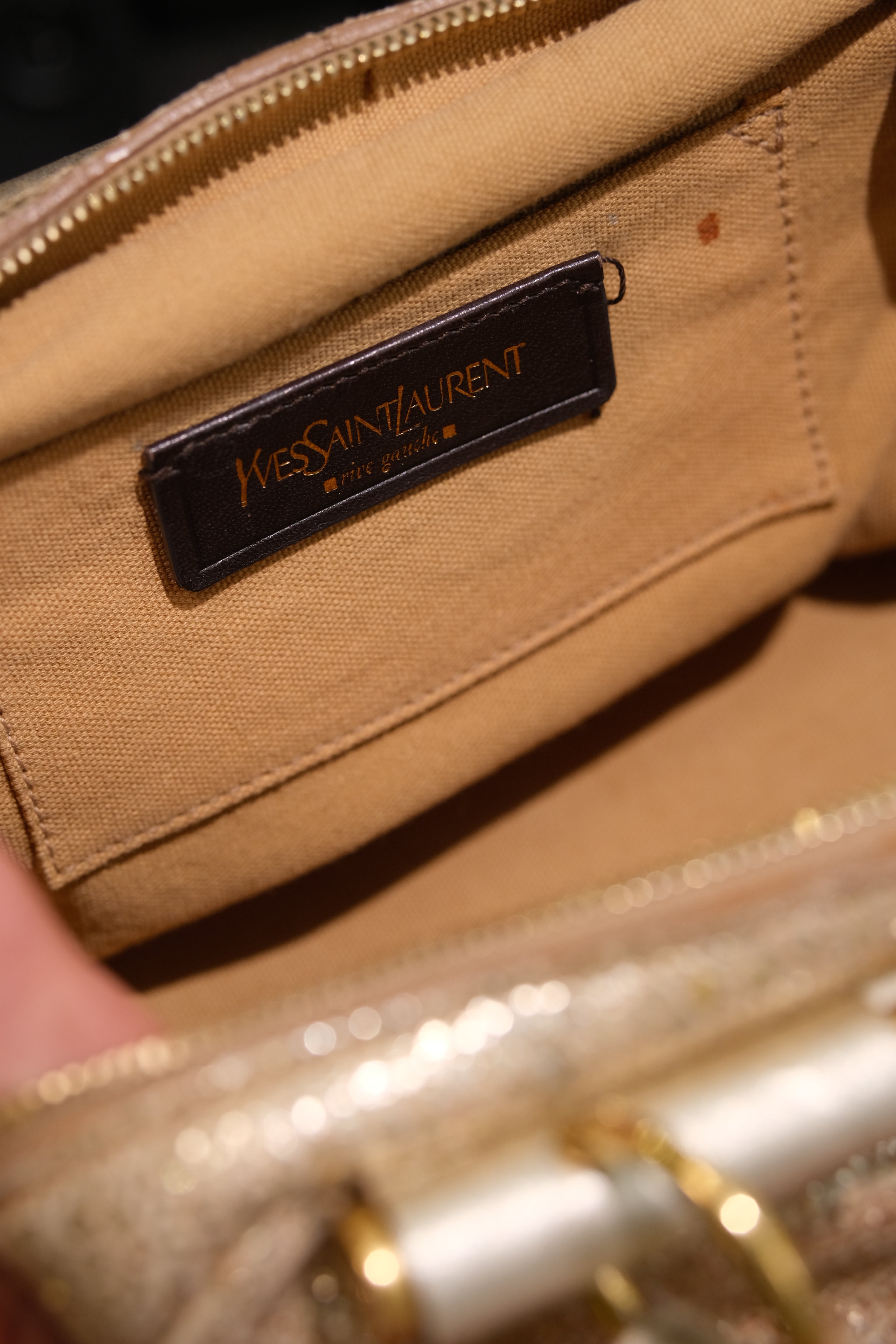 Bolsa Yve Saint Laurent Vintage, em couro na cor dourado, alça dupla de mão, bolso interno, zíper na parte superior e ferragem em dourado.