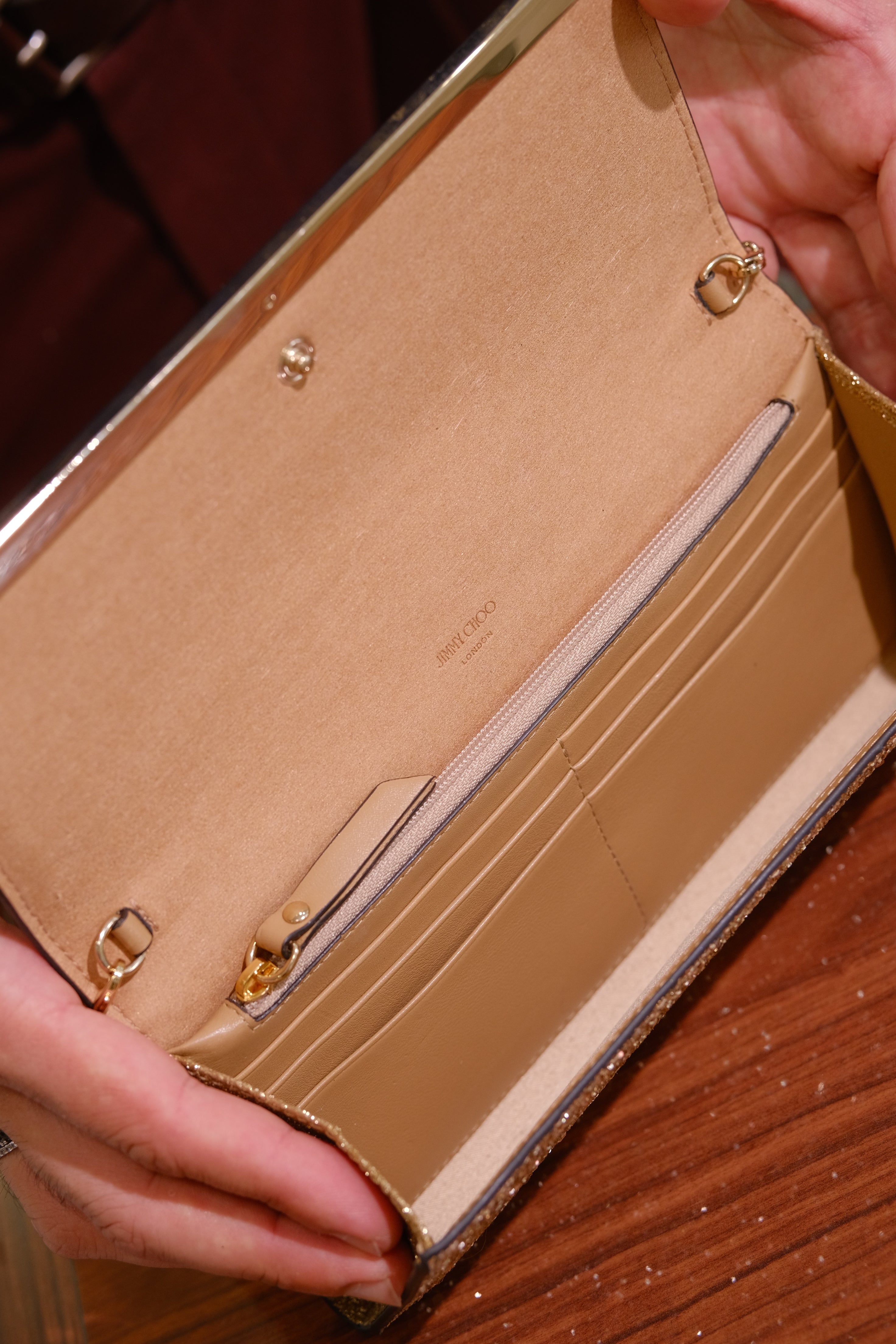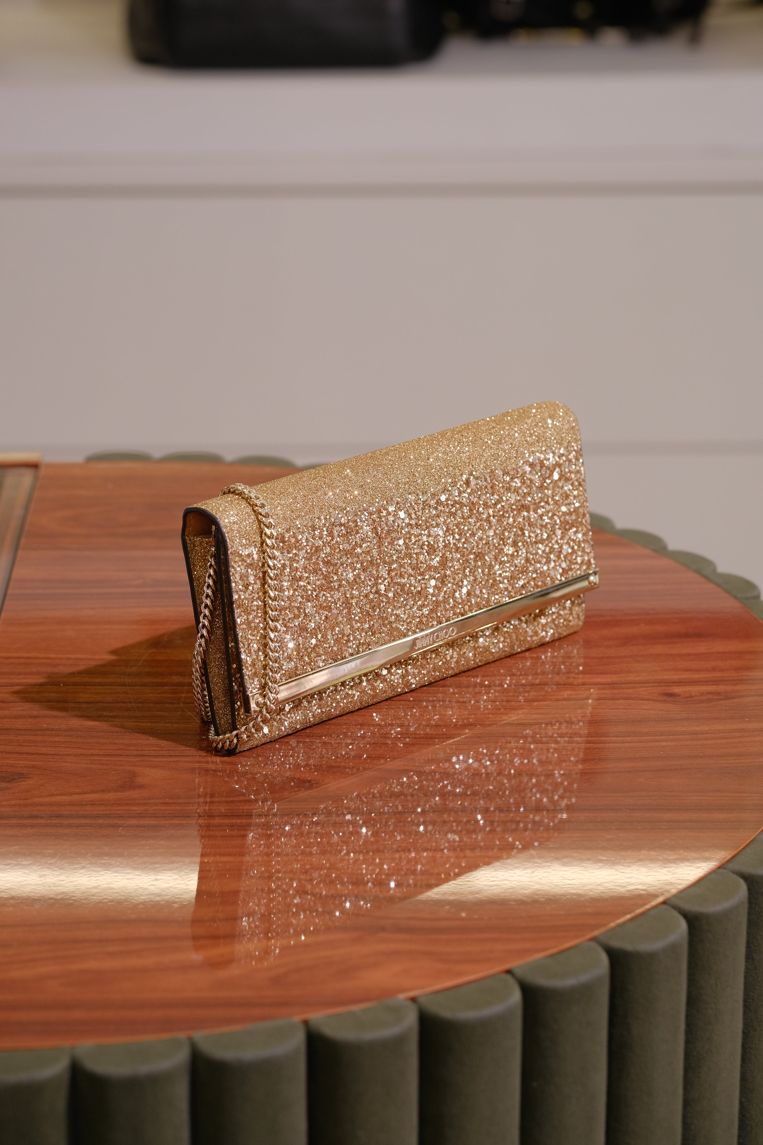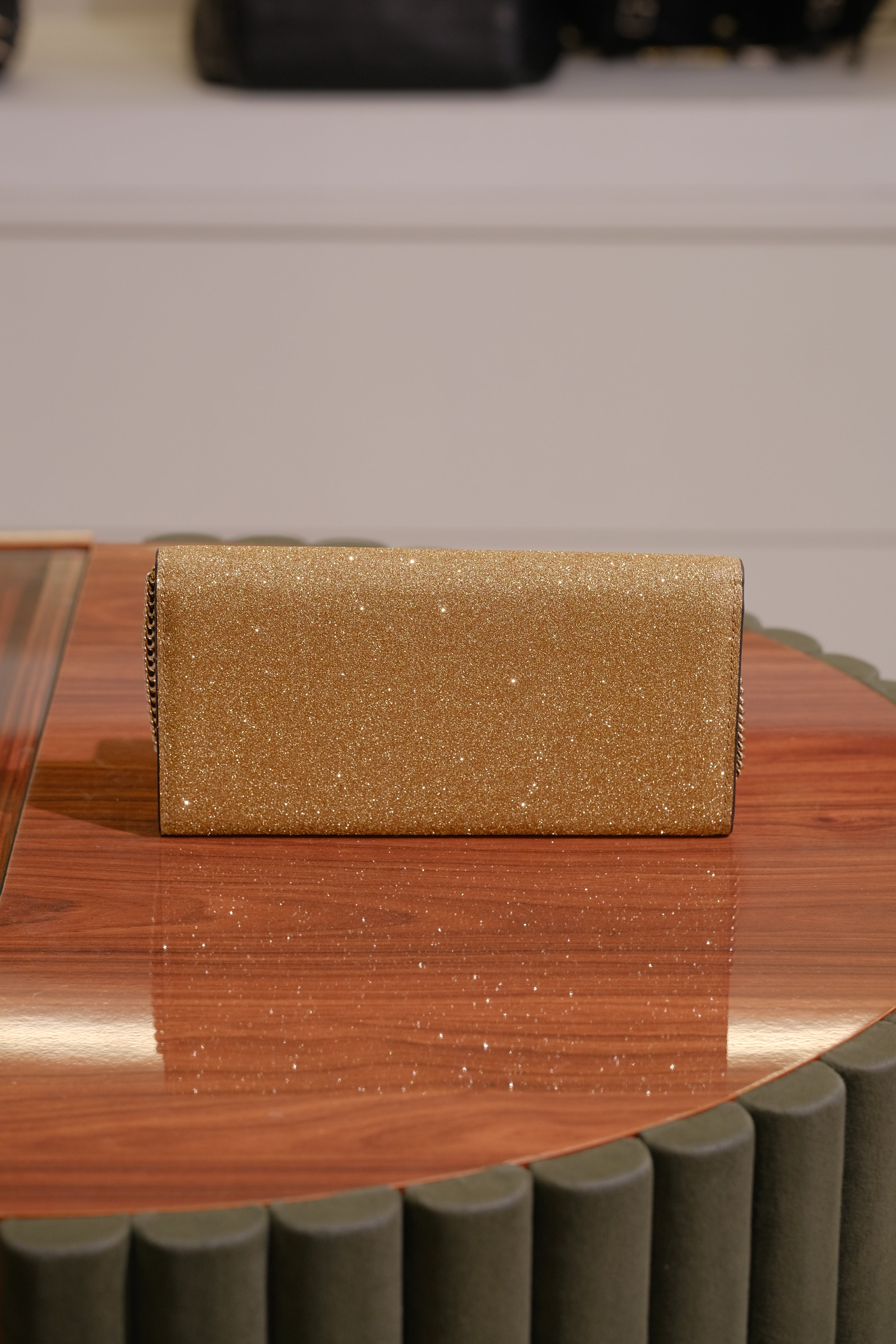 Clutch Jimmy Choo Milla, em couro com textura de brilho na cor dourado, compartimento único com porta cartões e bolso fechado por zíper, alça longa em corrente, ferragem em dourado e aba frontal com fecho em botão de pressão.