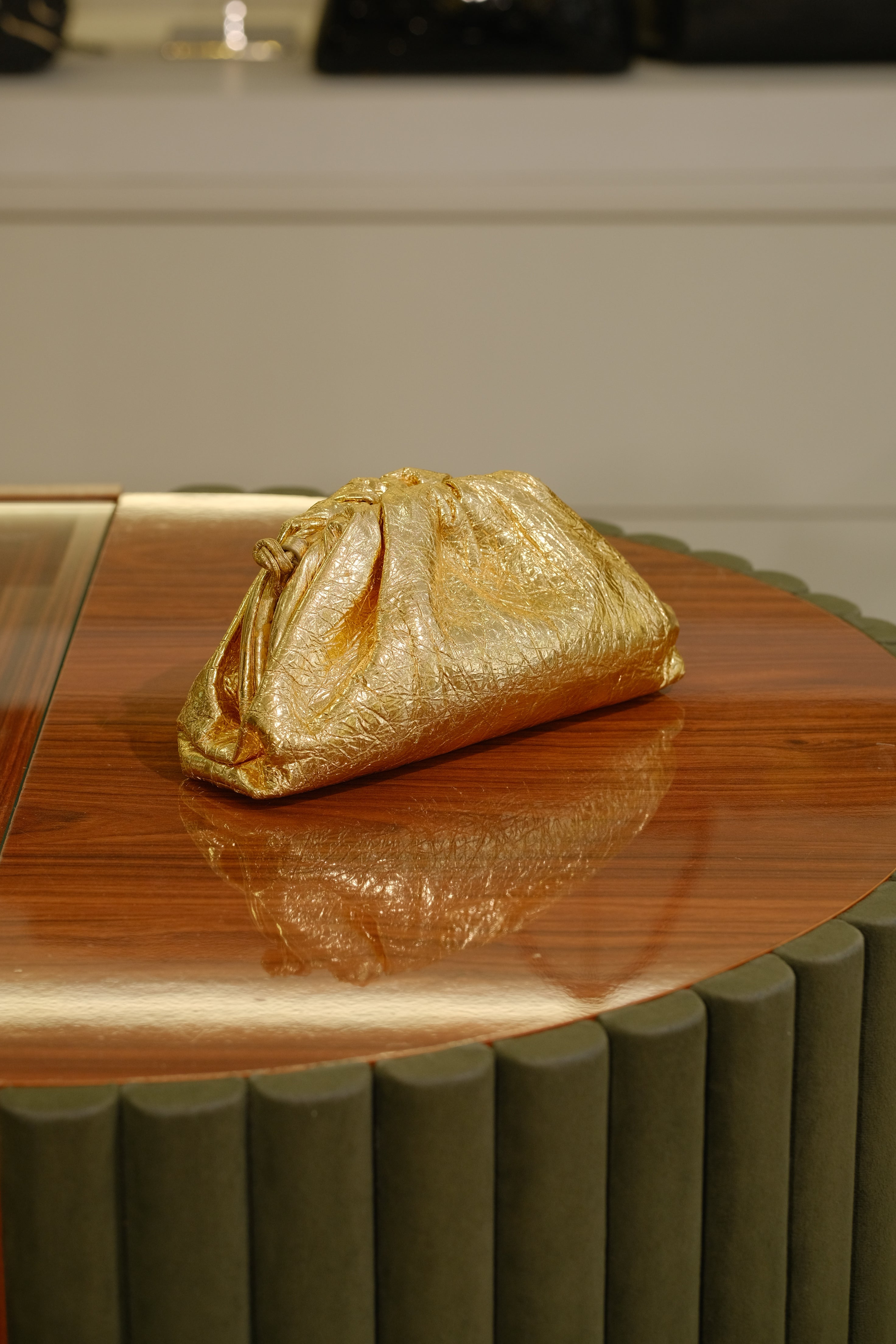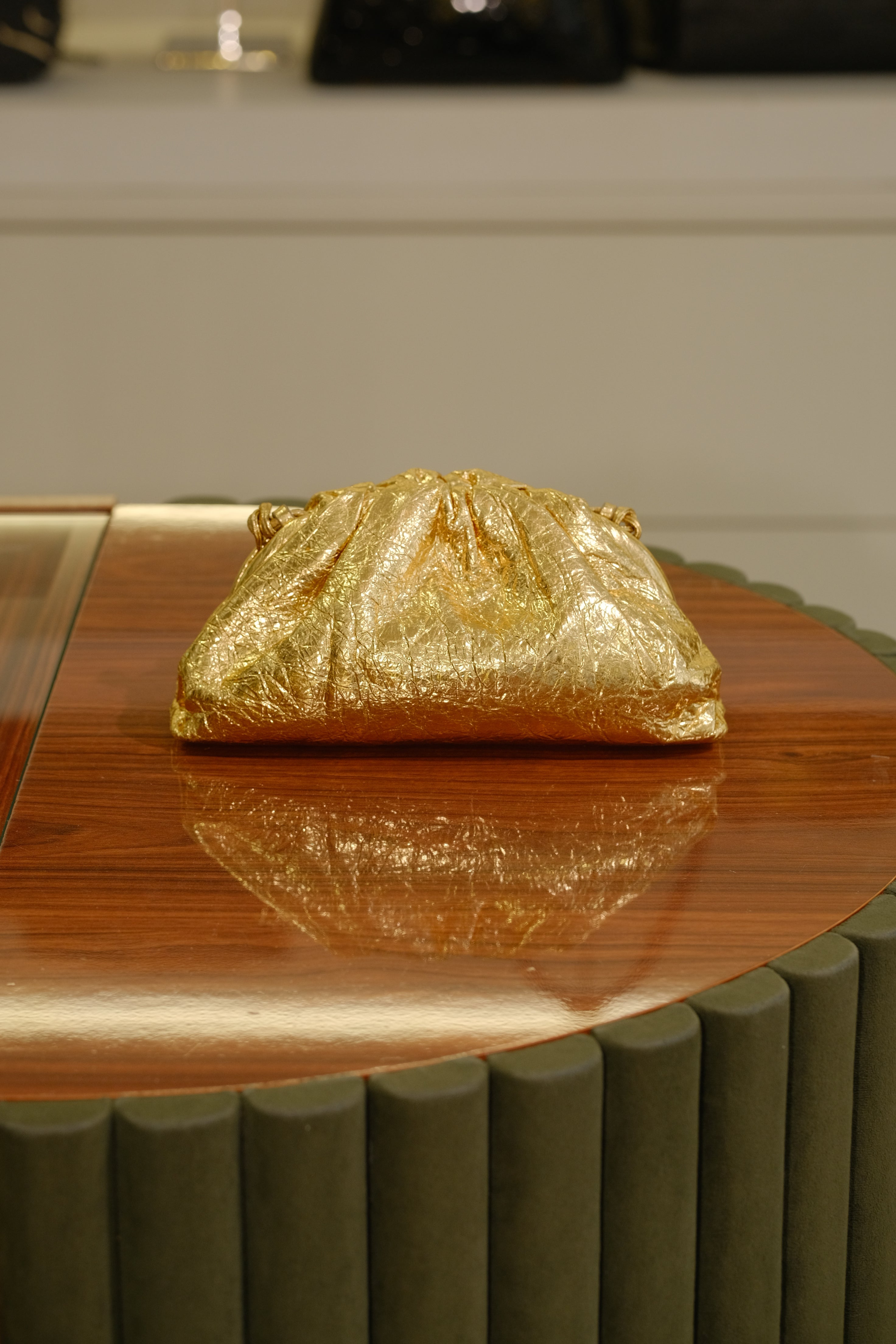 Mini Pouch Bottega Veneta, em couro metalizado, compartimento único, alça longa, ferragem em dourado e fecho por imã.