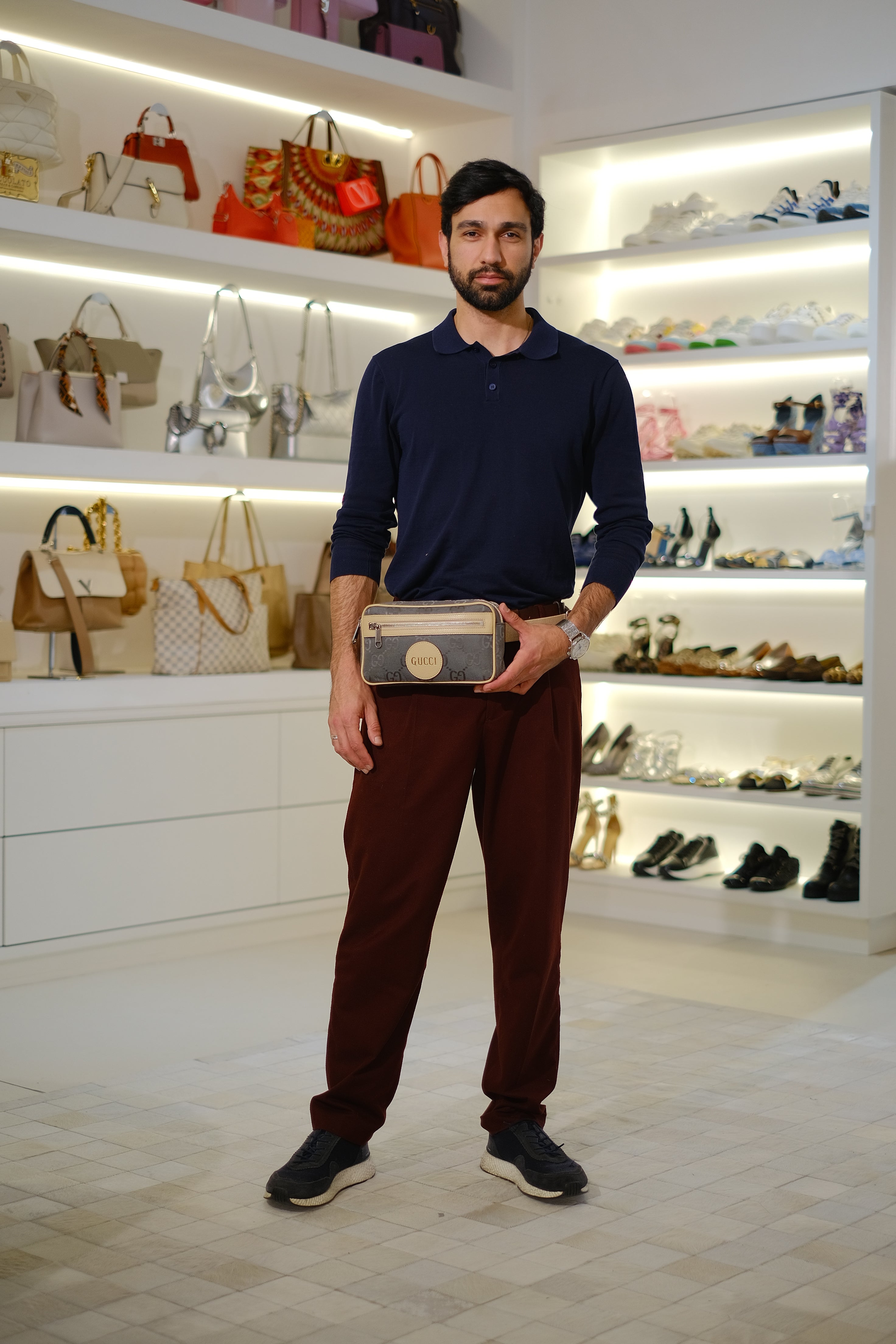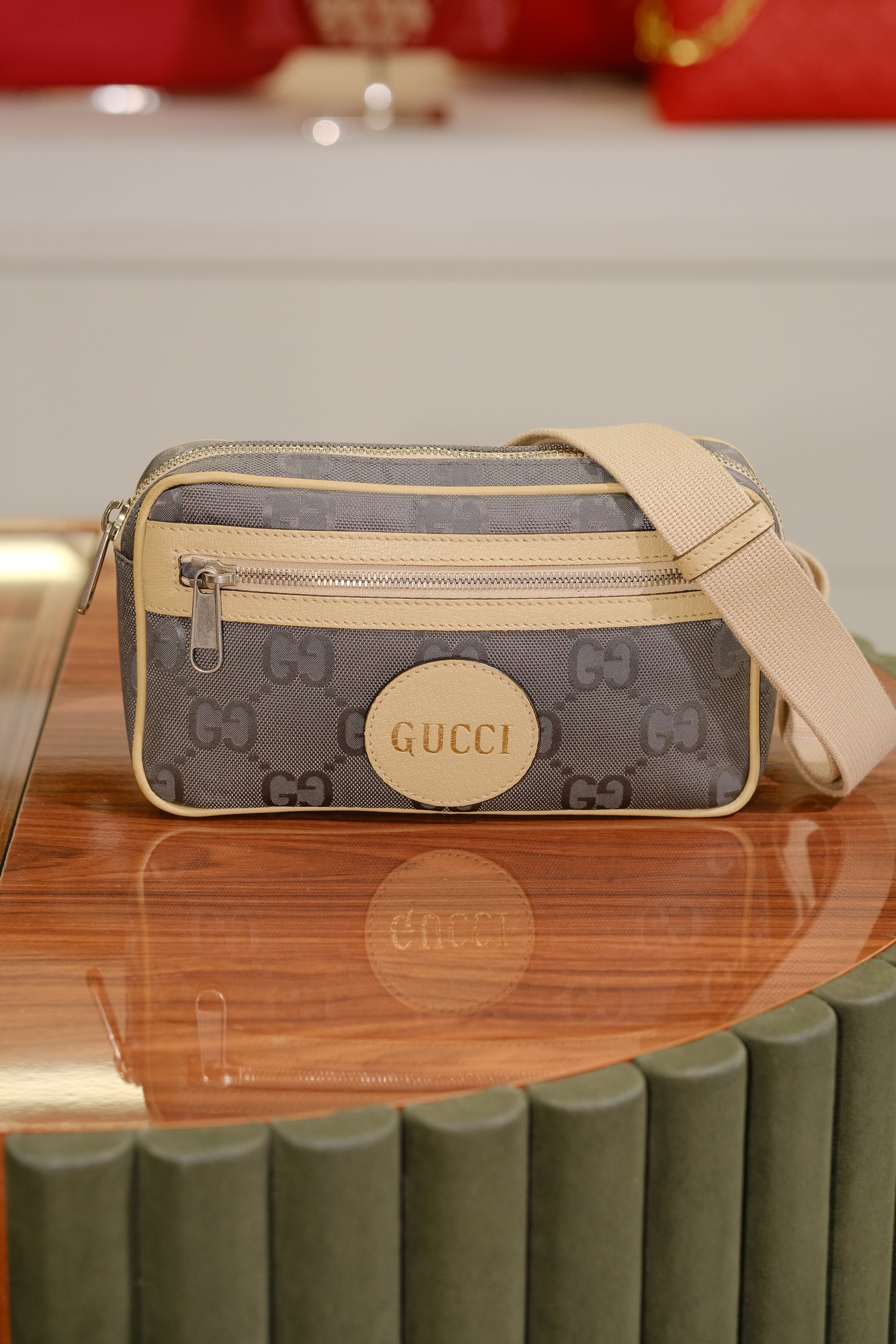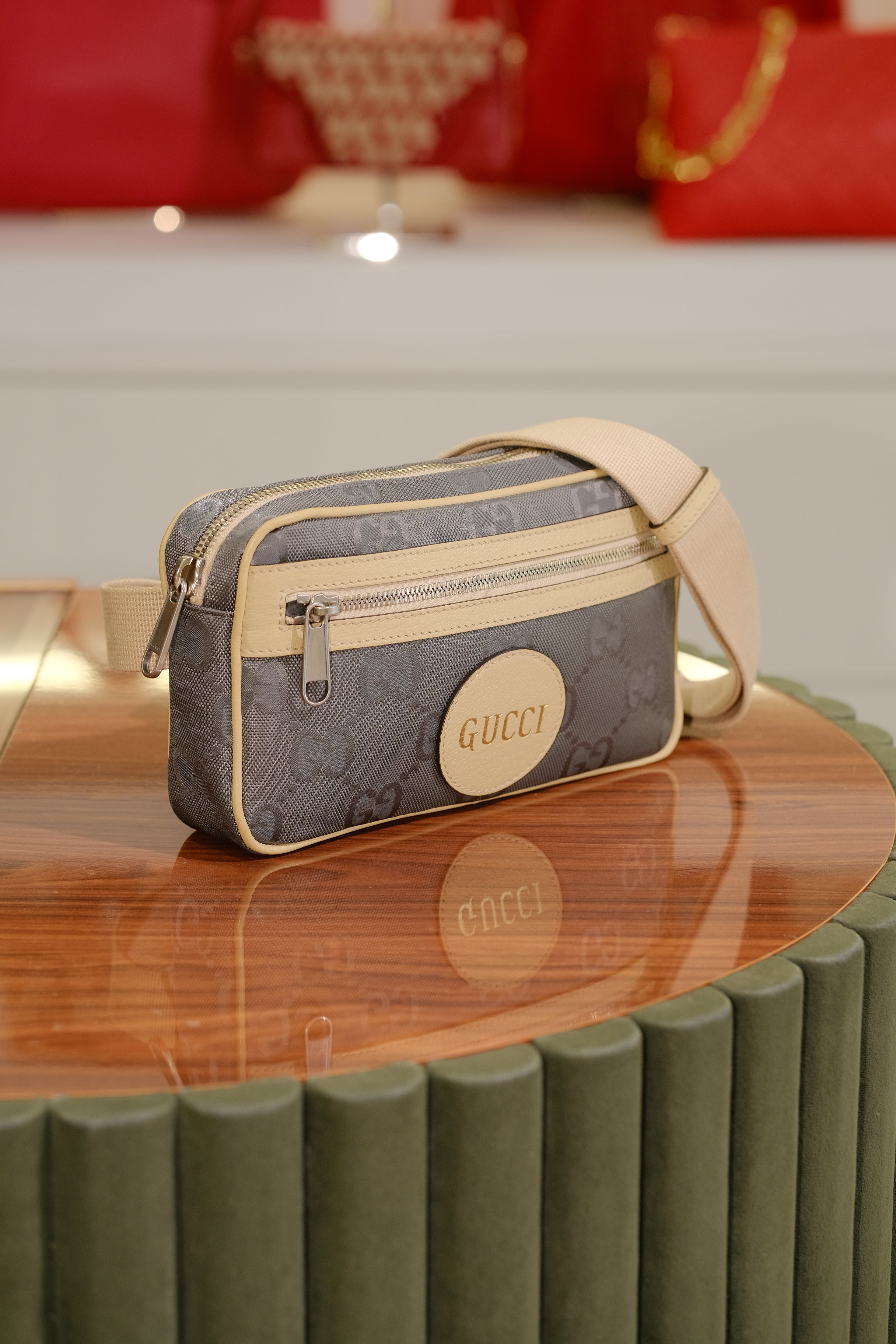 Pochete Gucci Off The Grid , em tecido na cor cinza com detalhes em couro bege, compartimento único com bolso fechado por zíper, bolso fechado por zíper na parte da frente, alça ajustável na cor bege, ferragem em prata e zíper na parte superior.