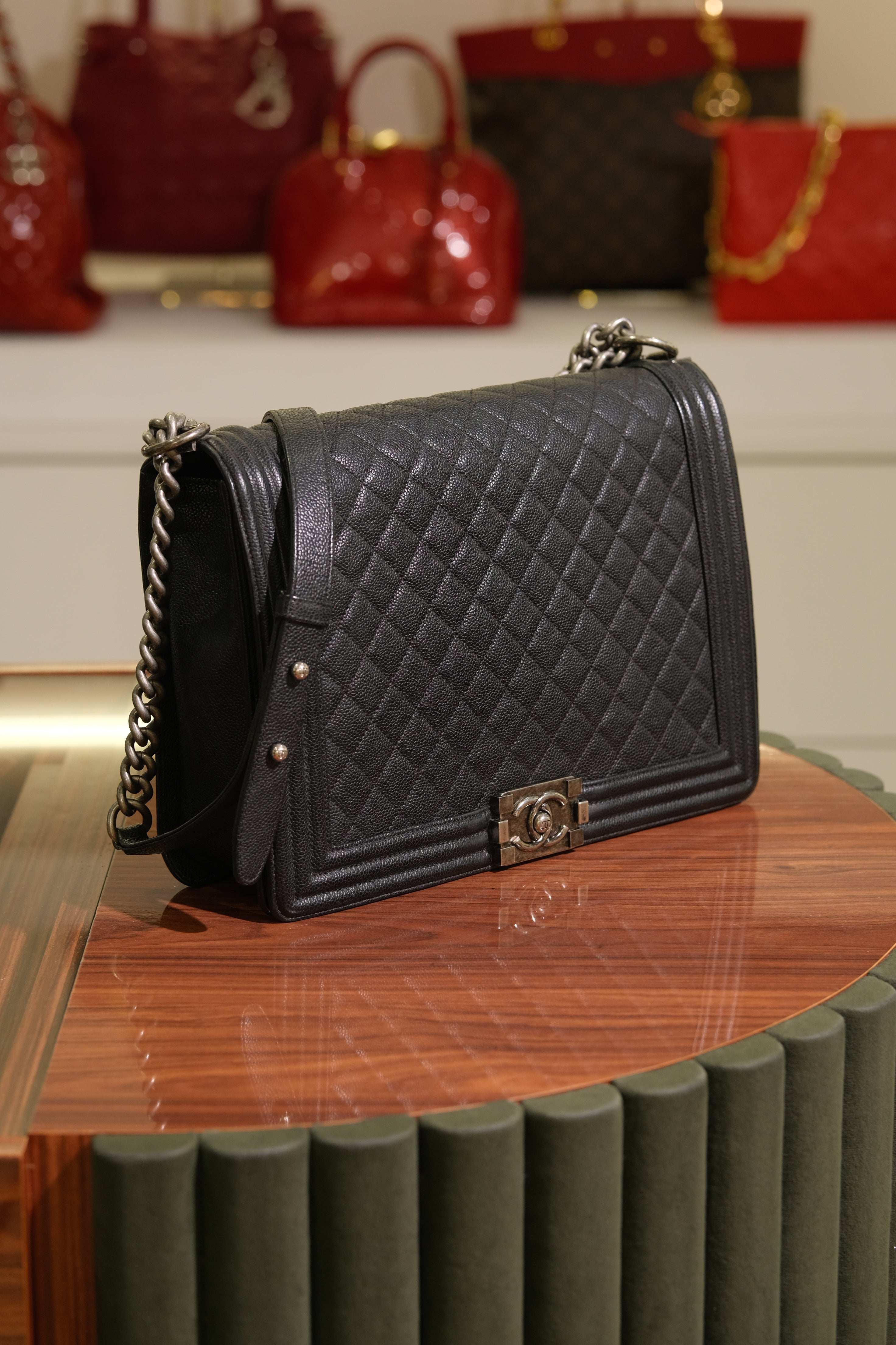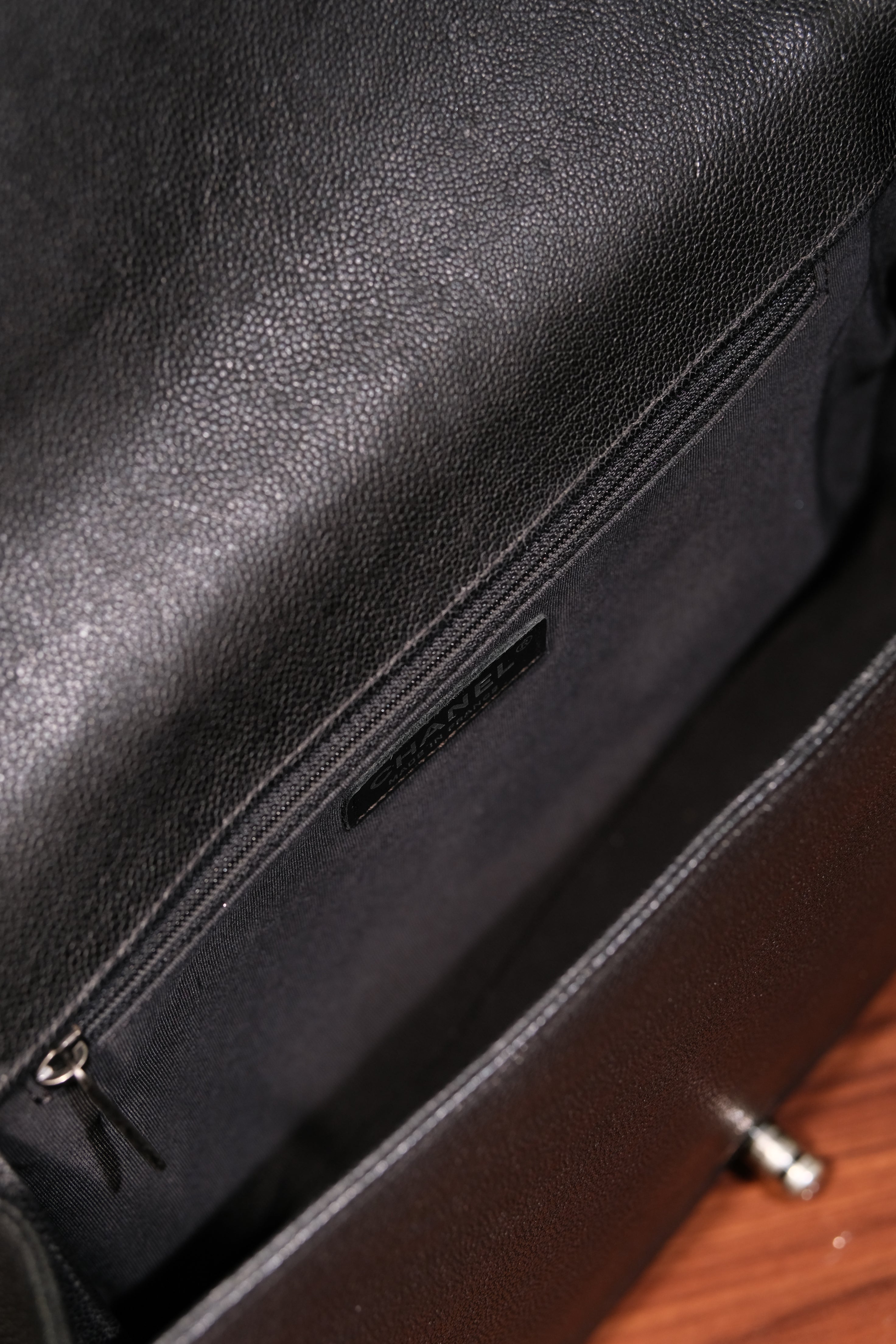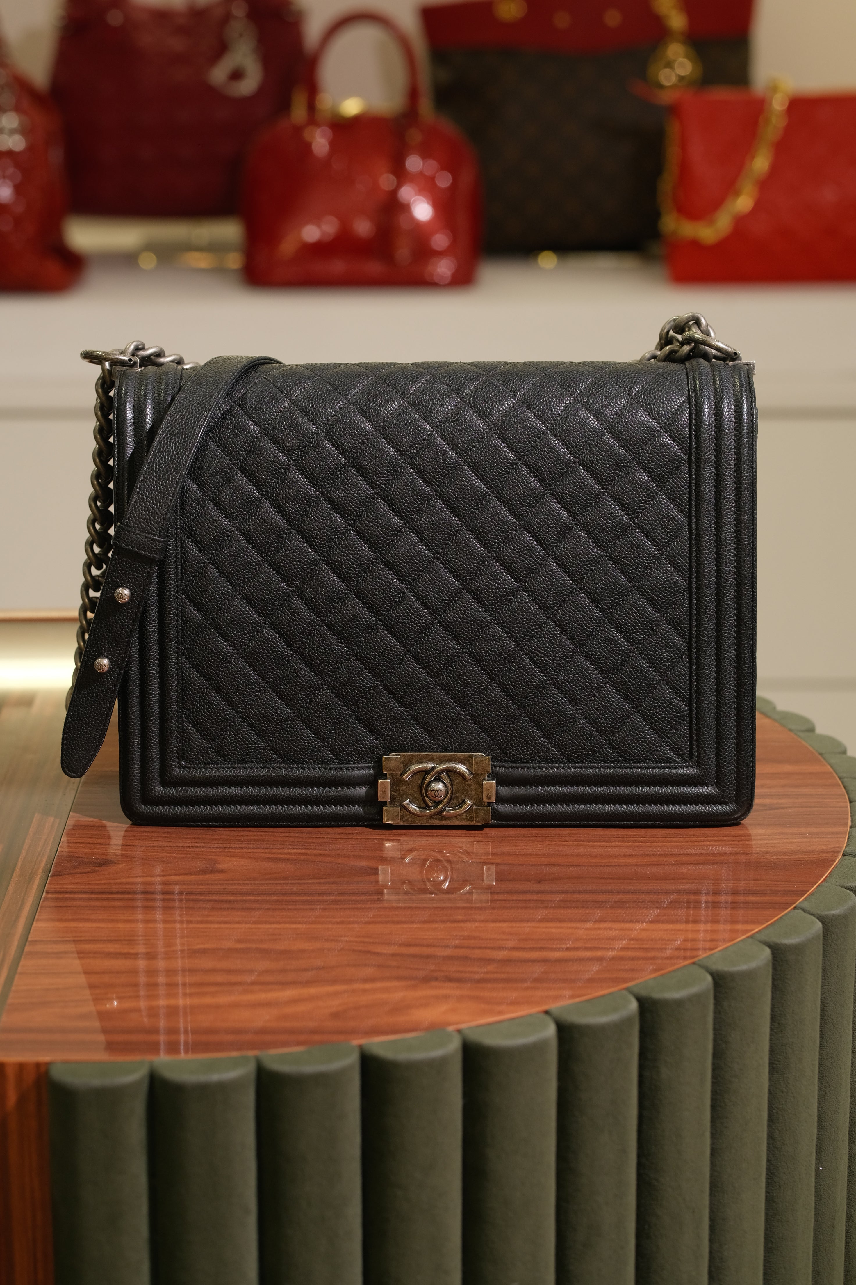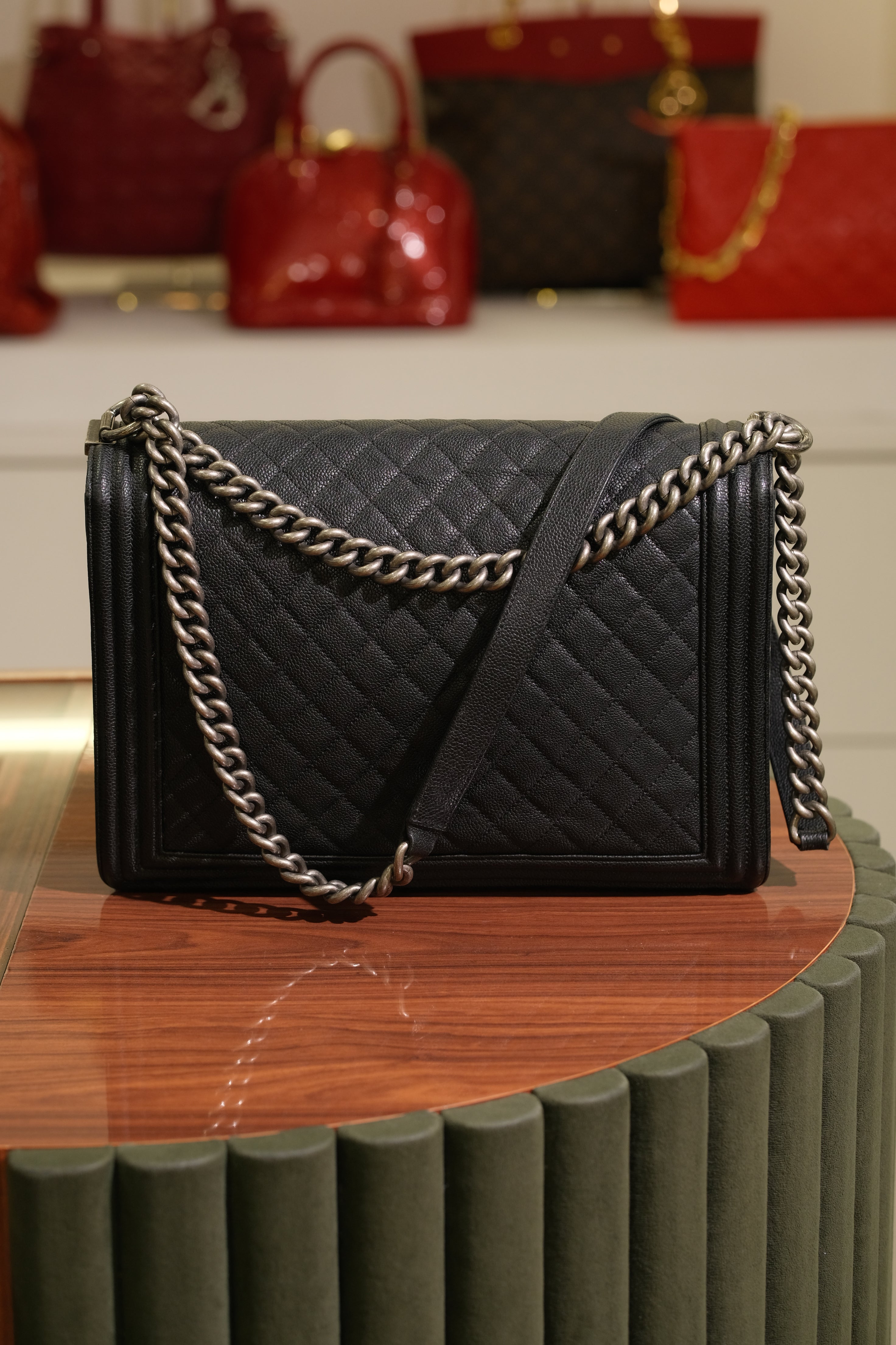 Bolsa Chanel Boy, em couro na cor preta, compartimento único com bolso, alça longa de couro e corrente, ferragem em prata e aba frontal com fecho de encaixe.