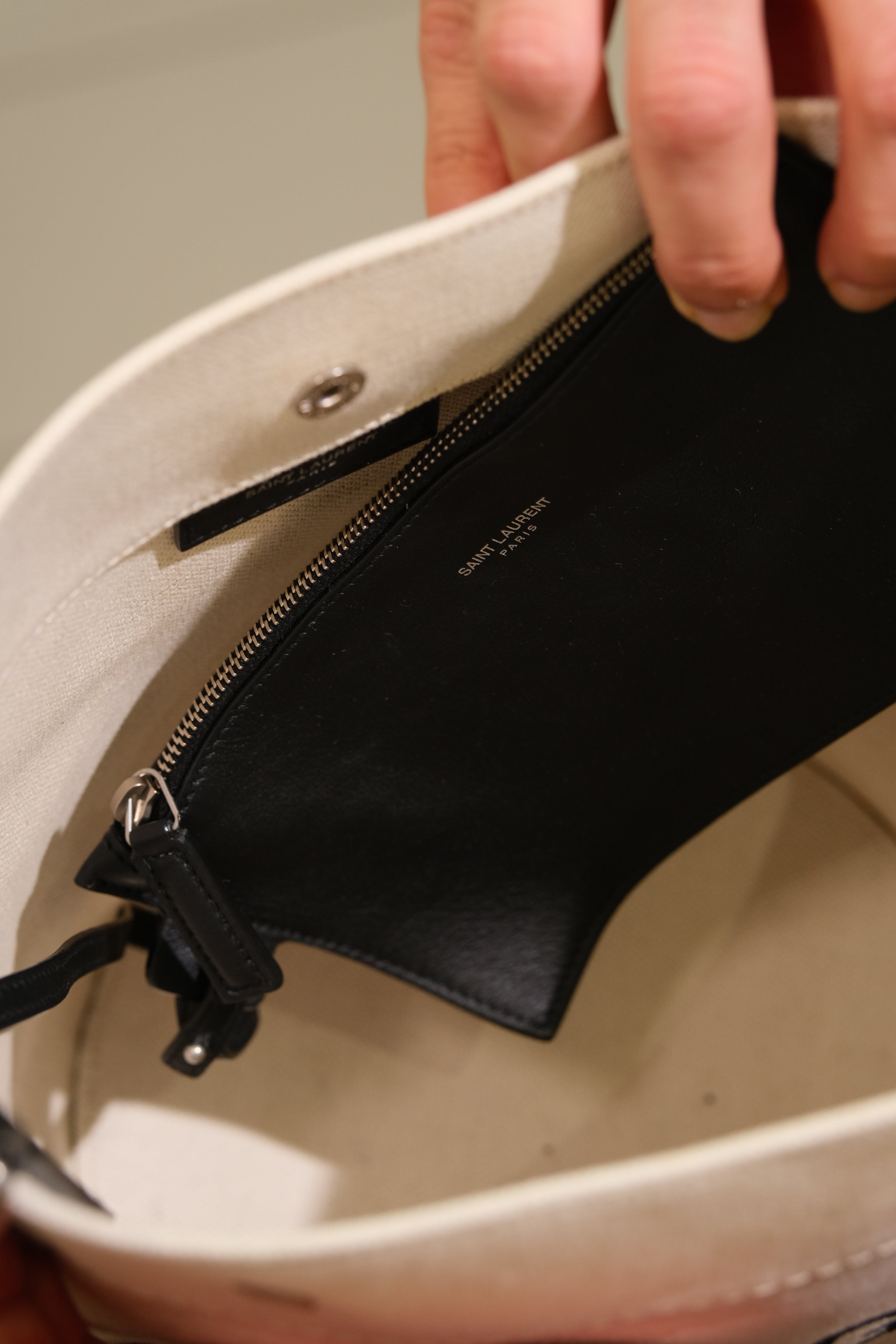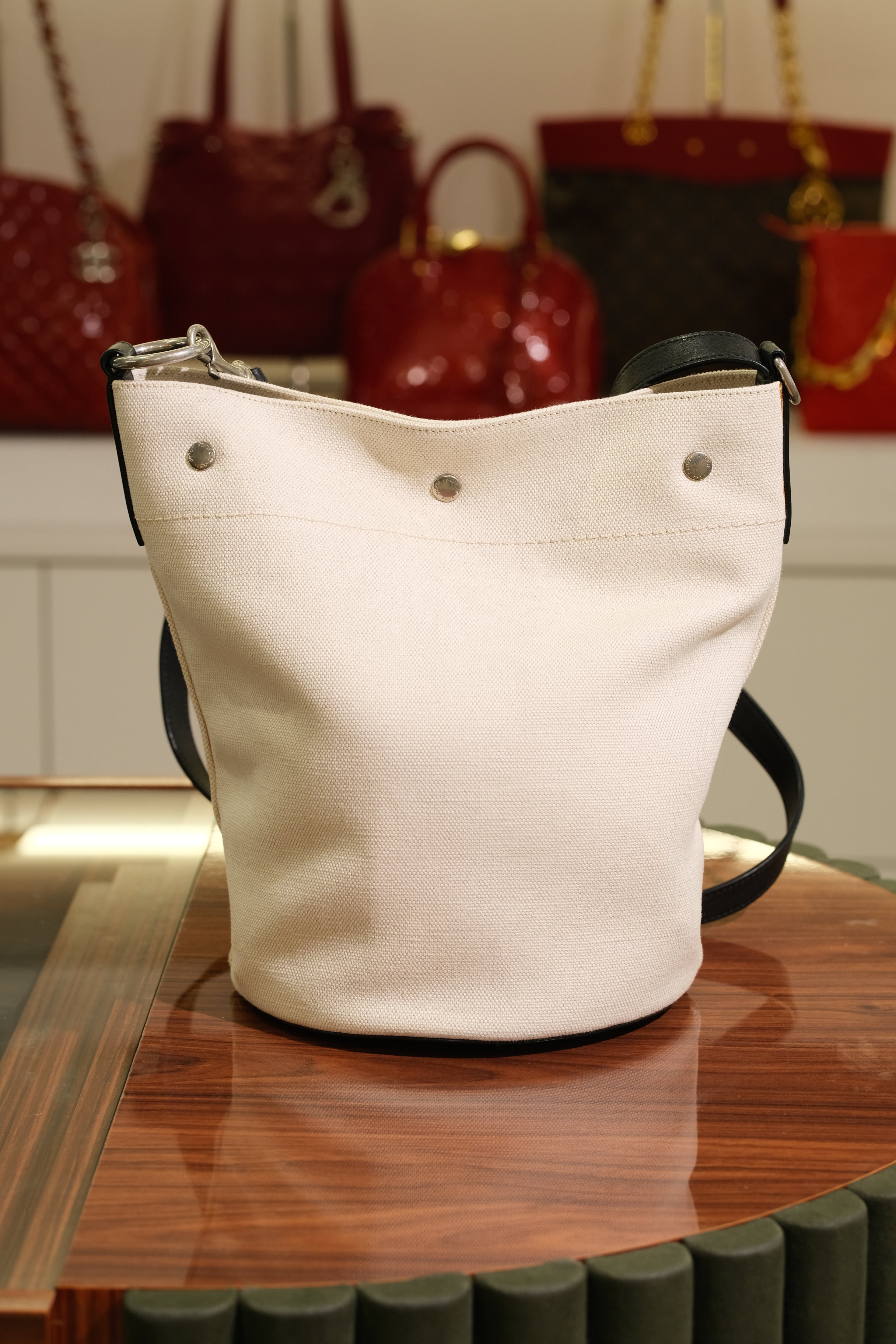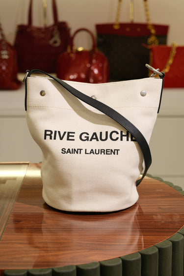 Bolsa Bucket Yves Saint Laurent Rive Gauche, em canvas, compartimento único, alça longa em couro preto e parte superior aberta com fechamento por tacha.