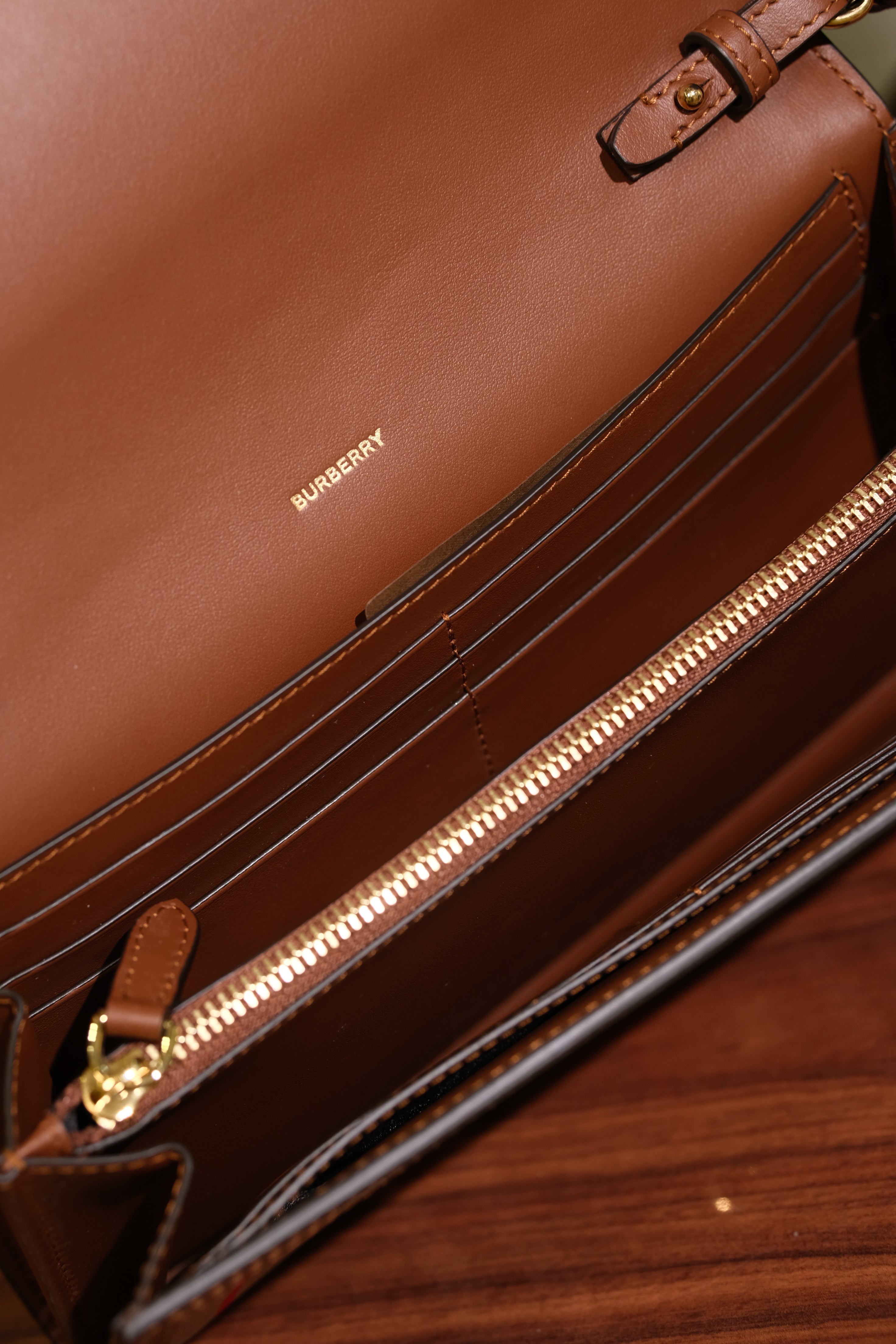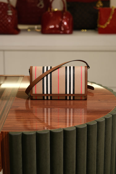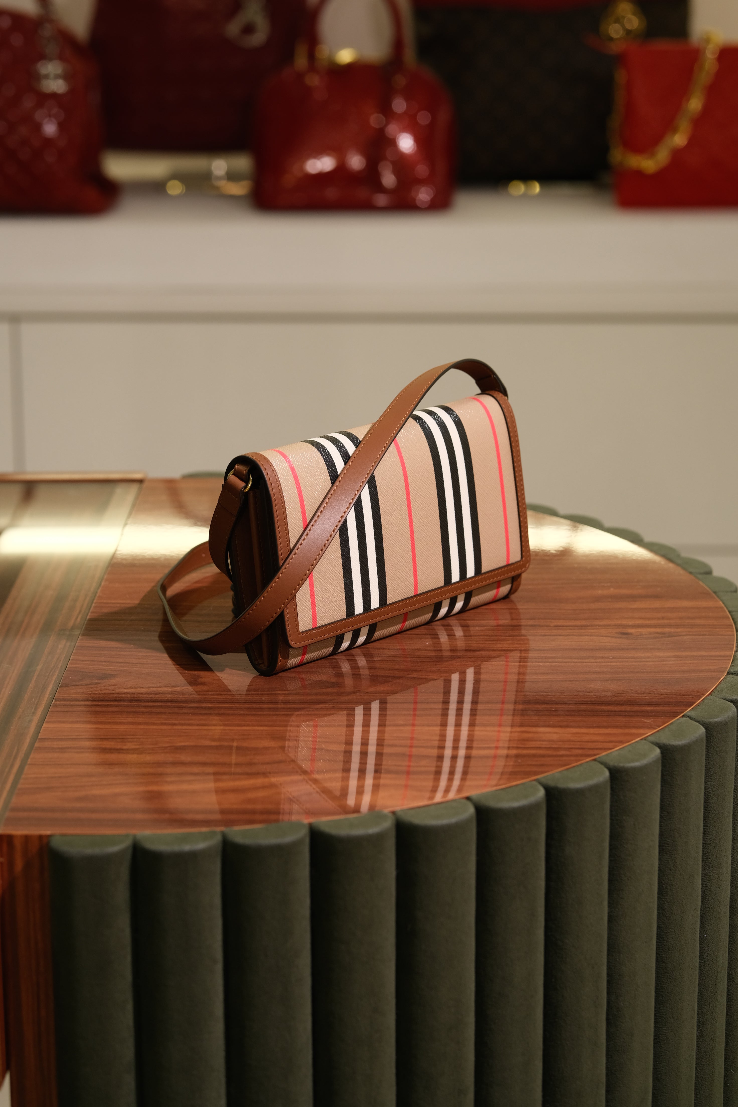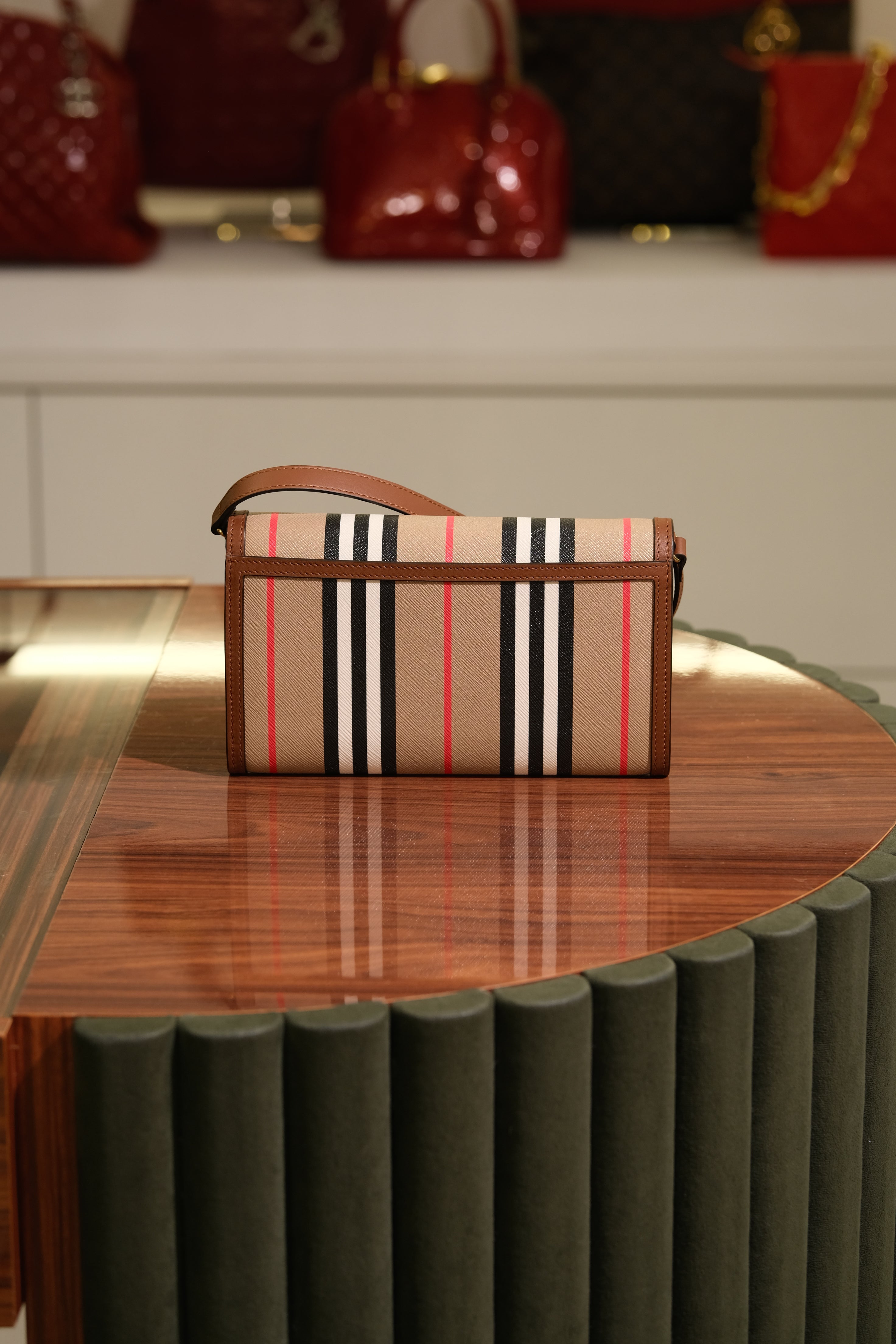 Bolsa Burberry Hannah, confeccionado em canvas listrado com detalhes em couro marrom, compartimento duplo, bolso fechado por zíper e porta cartões, alça longa ajustável em couro e aba frontal fechada com botáo de pressão.