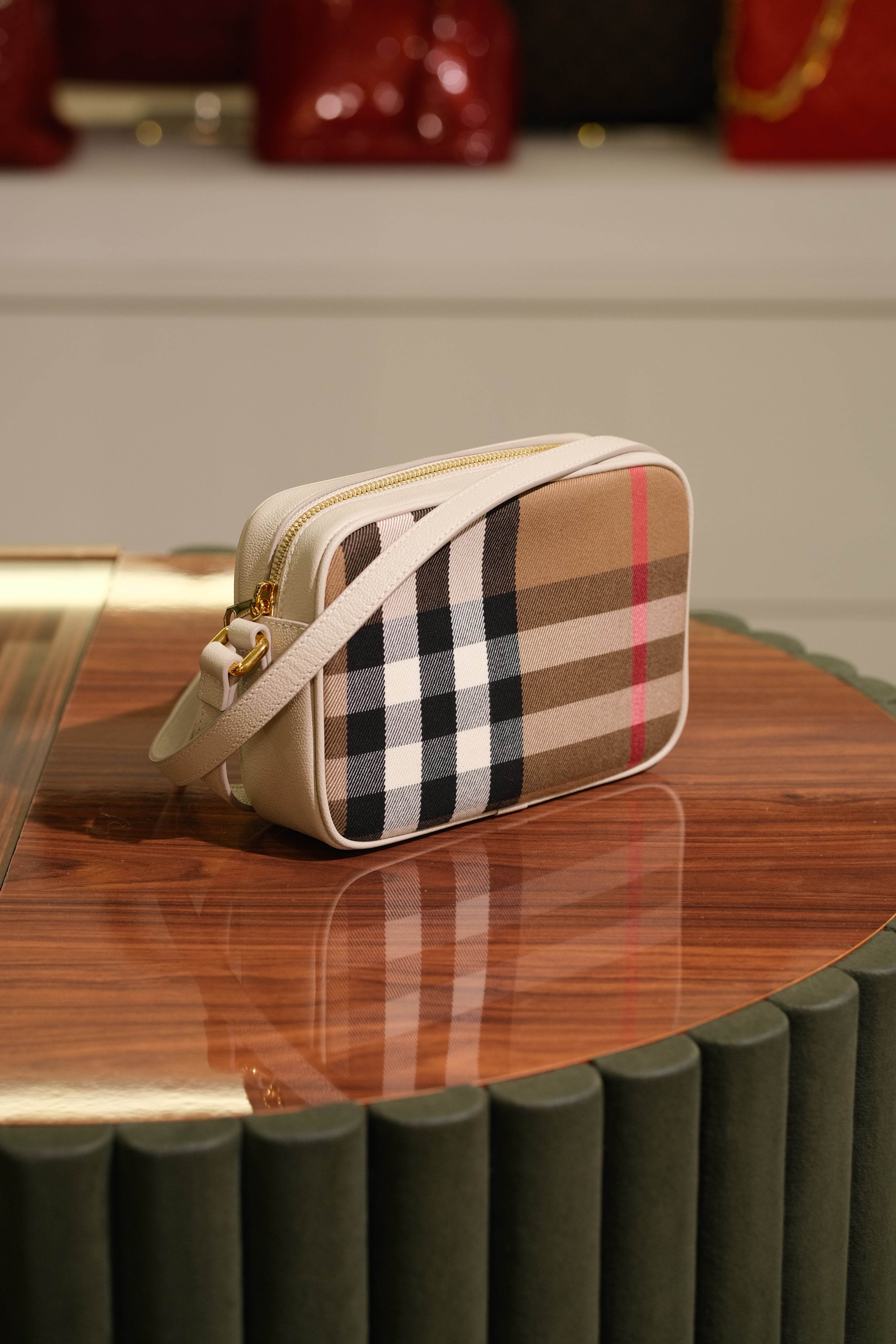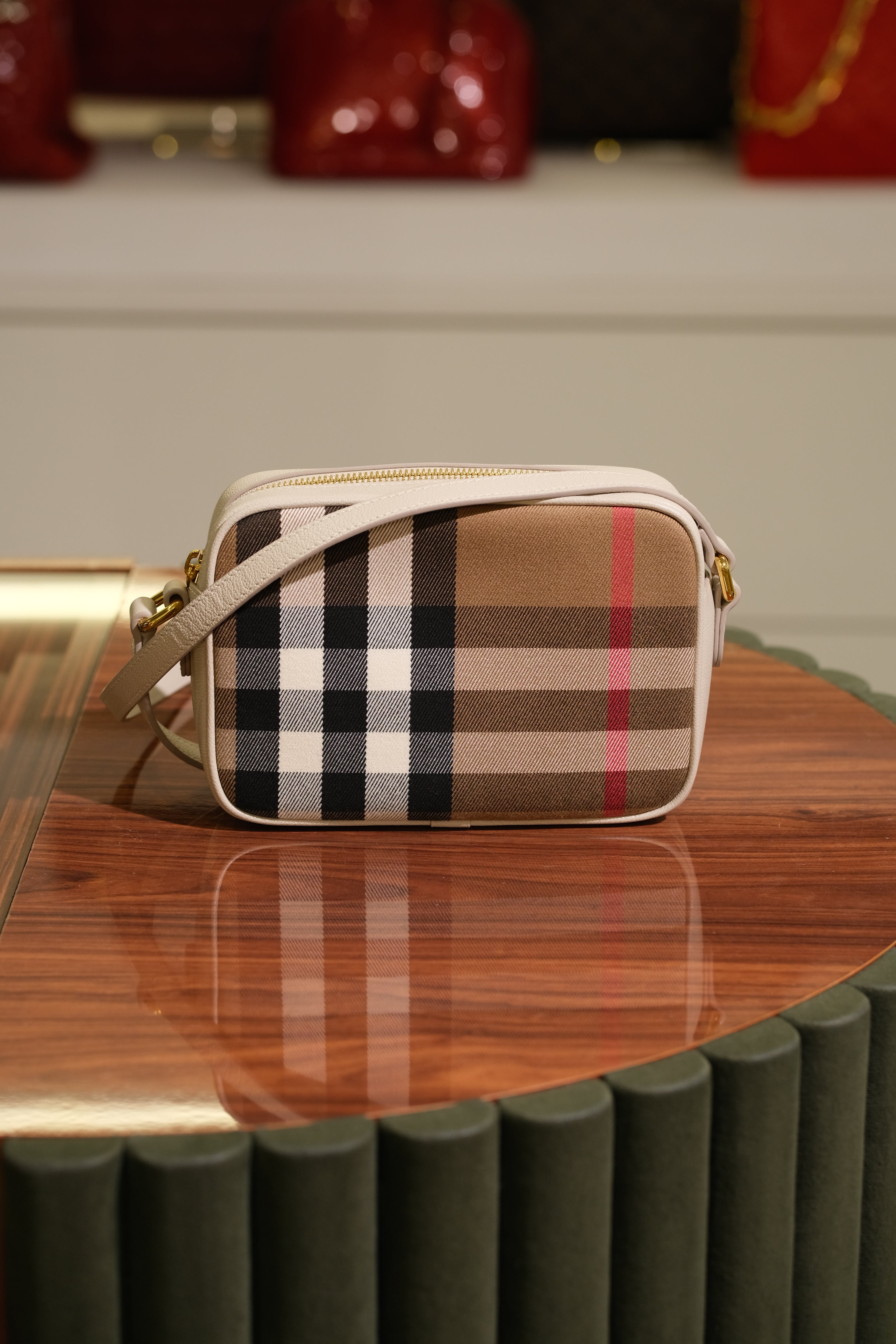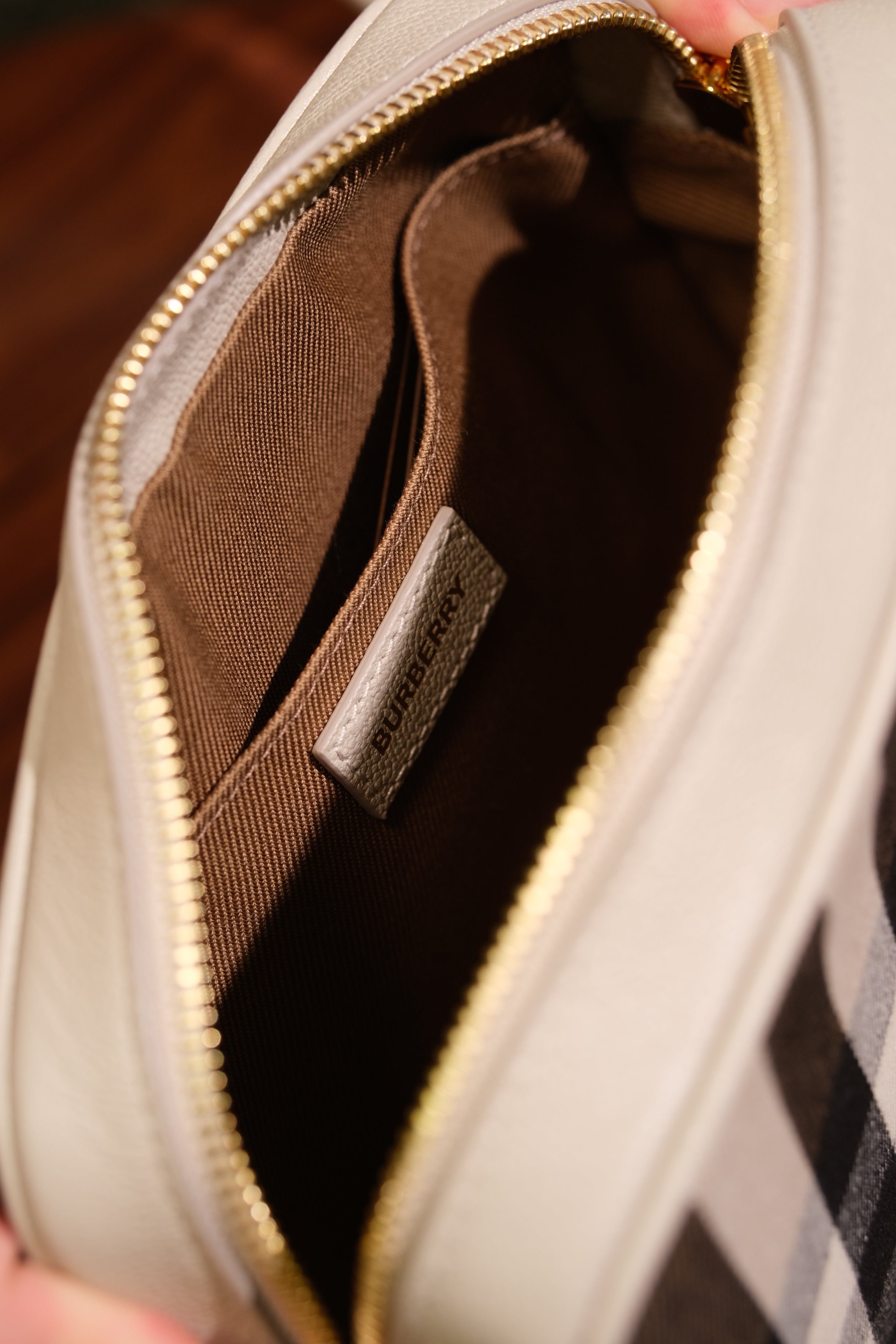 Bolsa Crossbody Burberry, em couro na cor off white e detalhes em tecido com estampa xadrez, compartimento único com bolso, ferragem em dourado, alça longa em couro e zíper na parte superior.