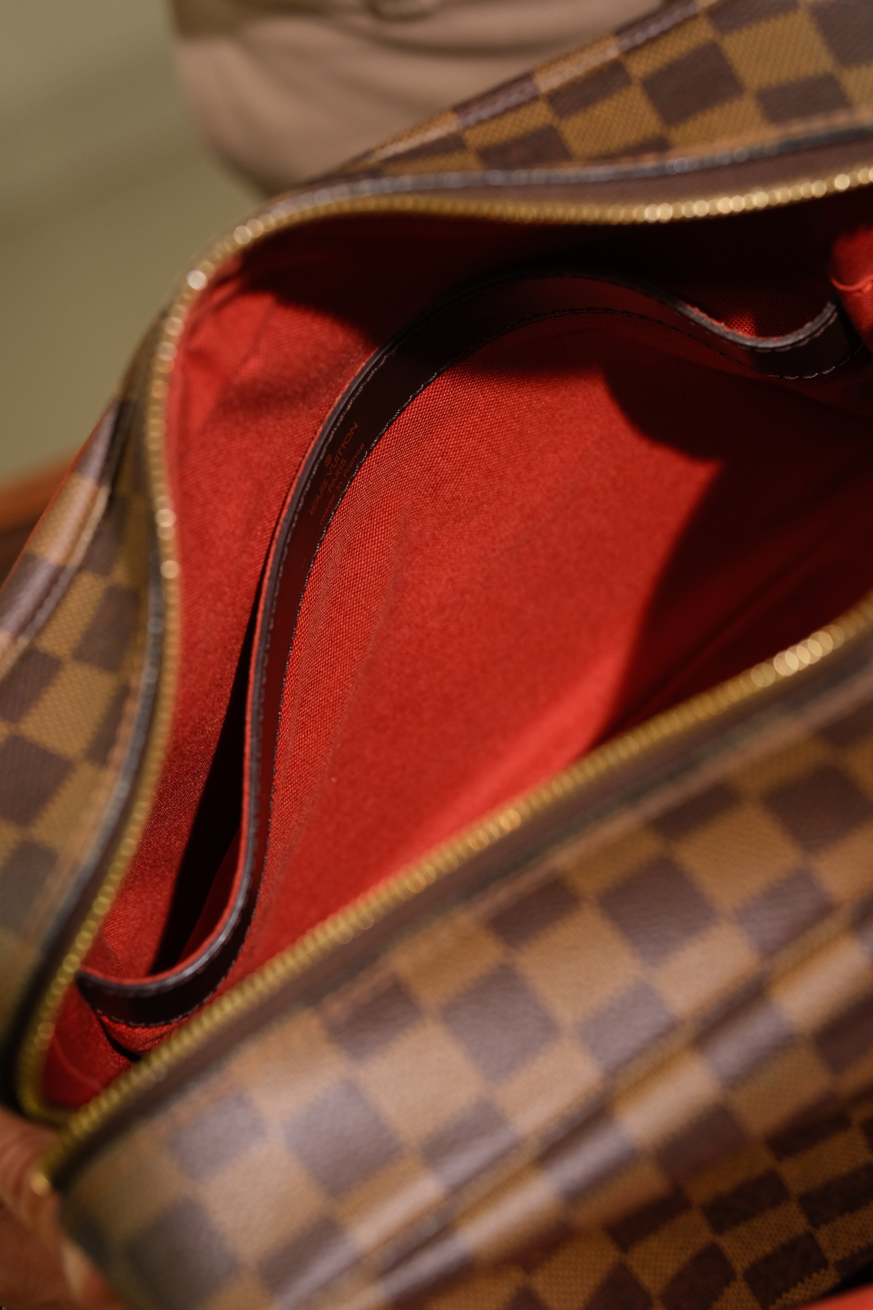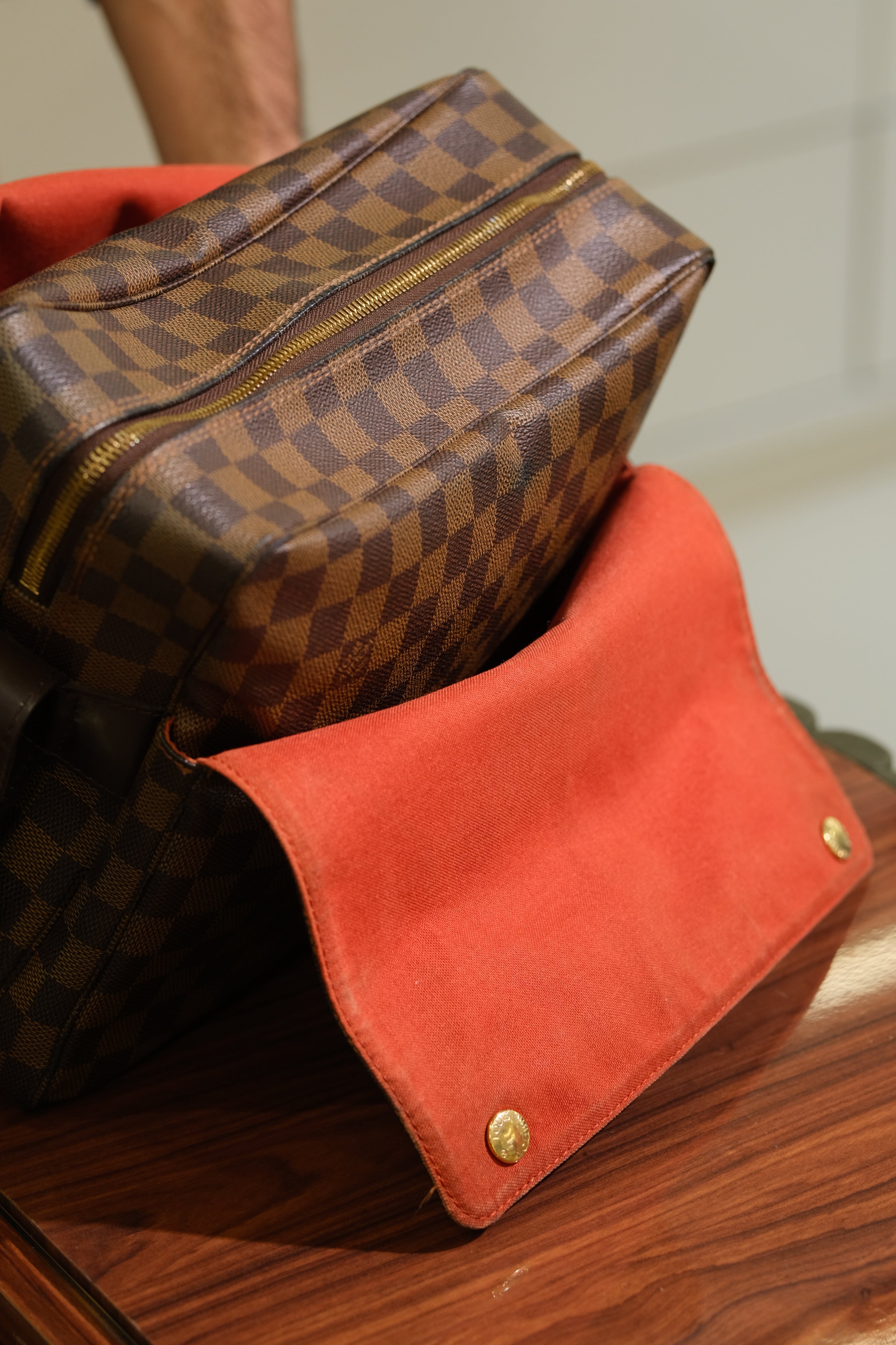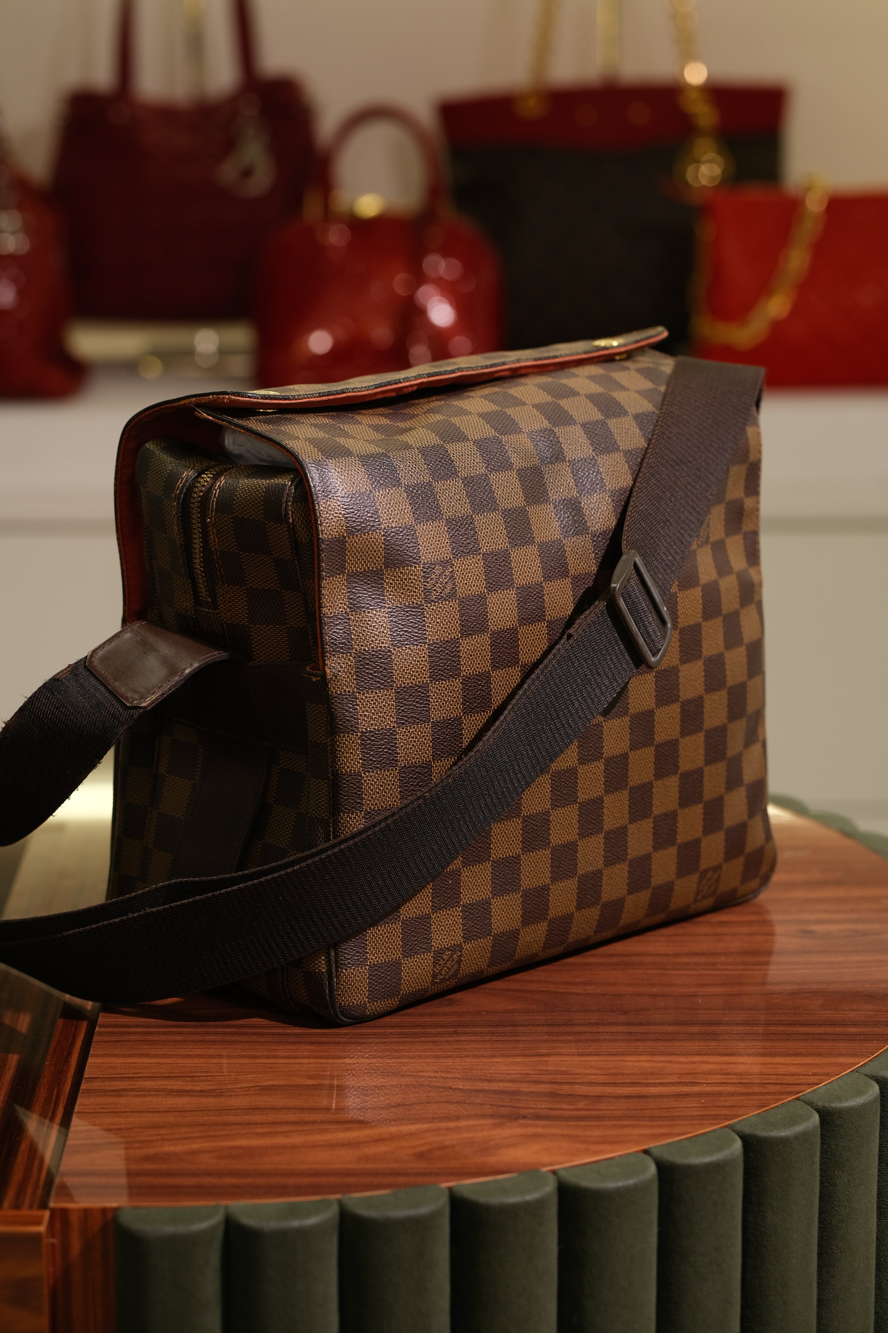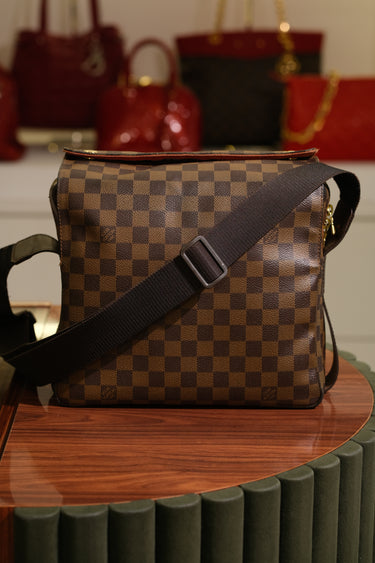 Bolsa Louis Vuitton Naviglio, em canvas, compartimento único com bolso, alça longa ajustável, zíper na parte superior com aba fechada com botão de pressão e ferragem em dourado.