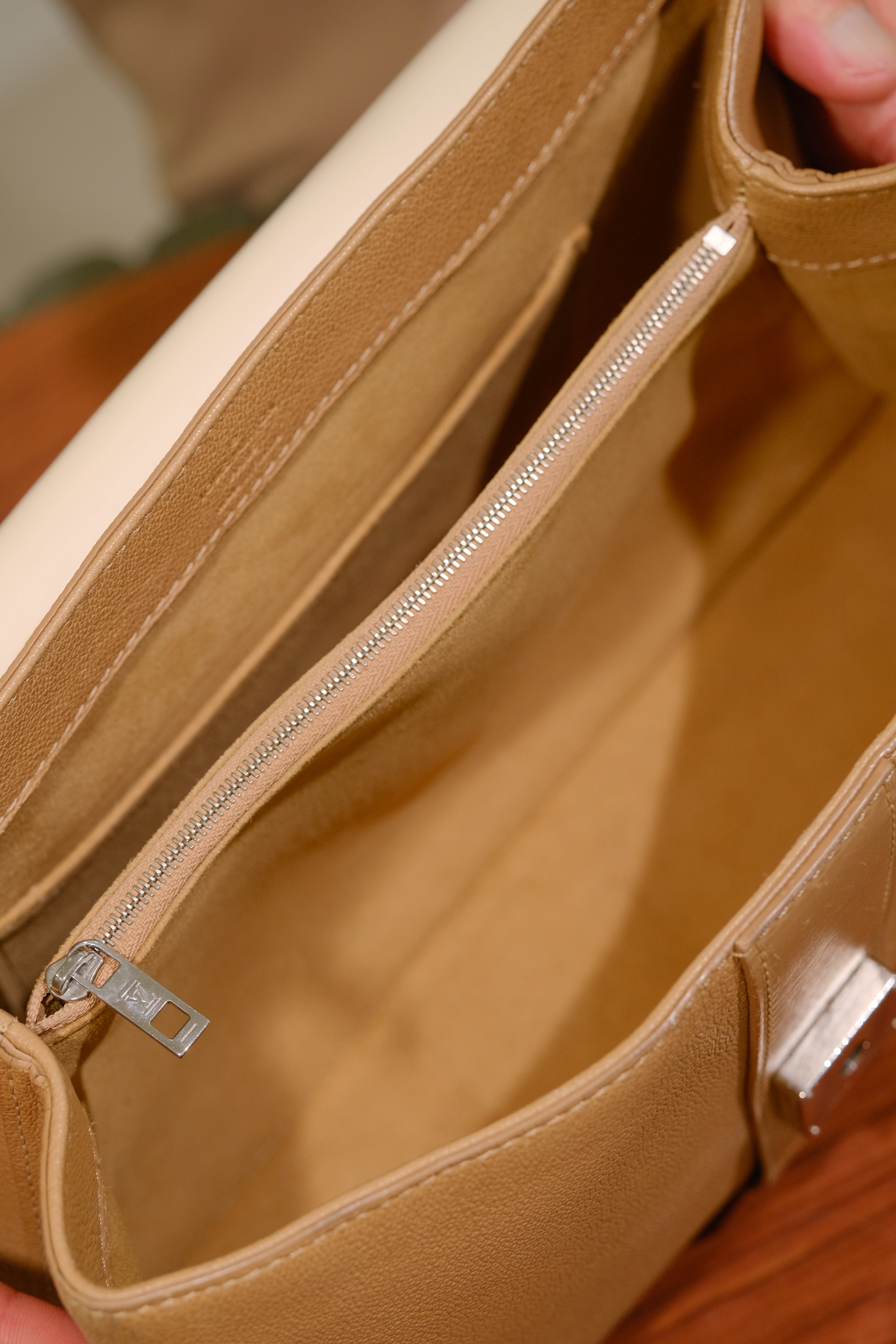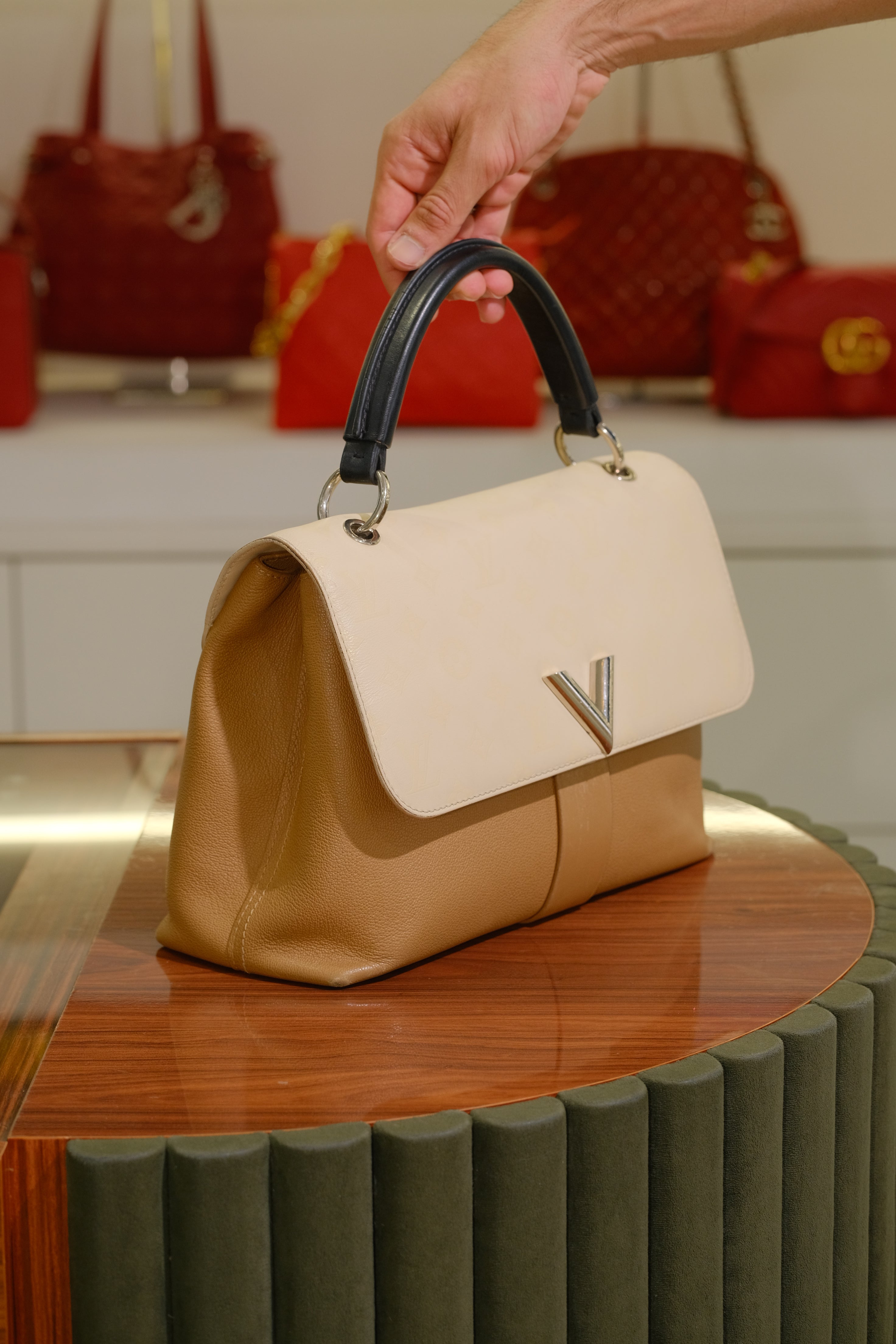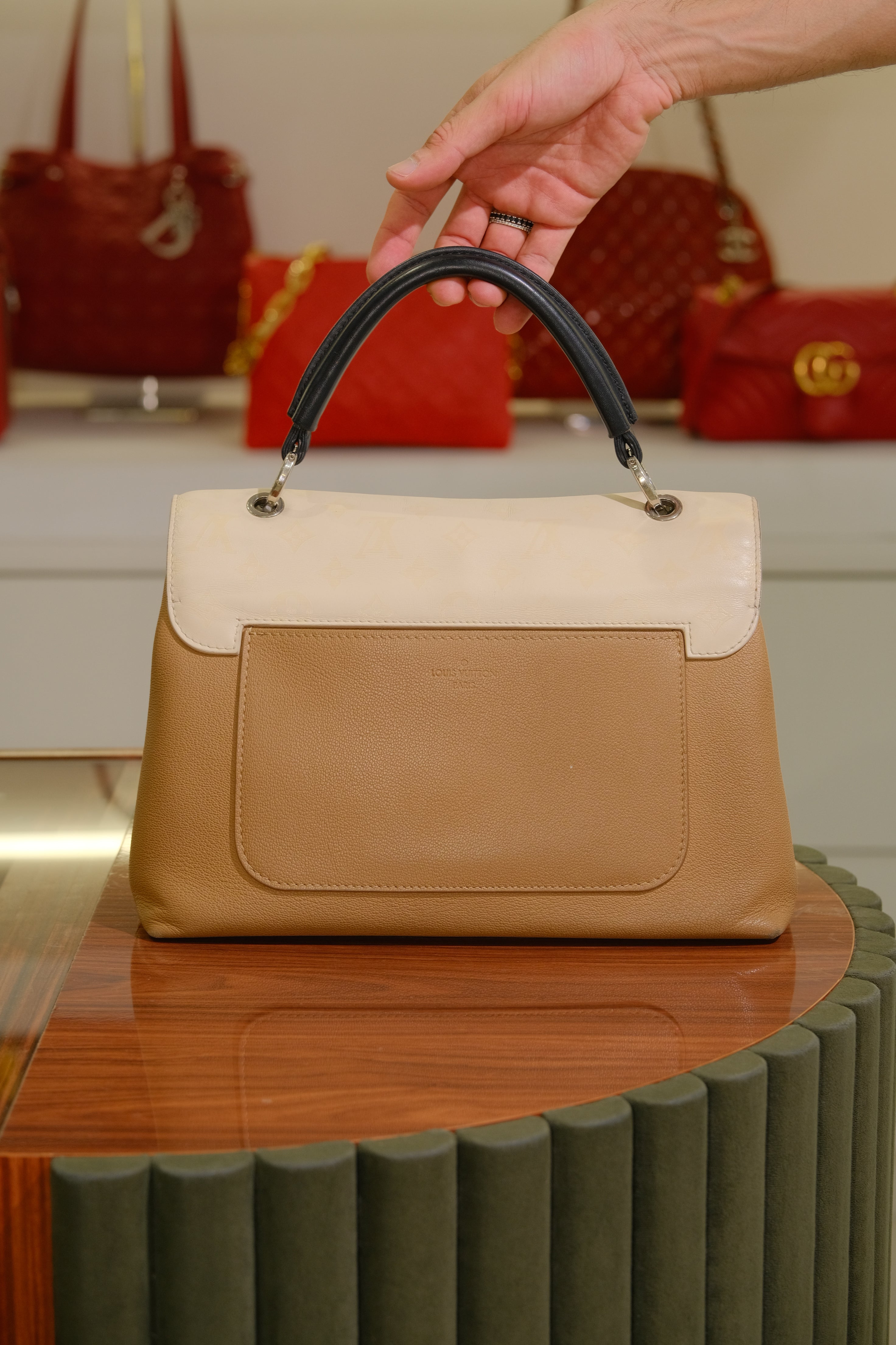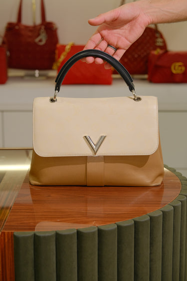 Bolsa Louis Vuitton Very One, em couro na cor marrom e bege e monograma na aba, compartimento com divisória e bolso fechado por zíper, alça longa e alça de mão em couro, ferragem em prata e aba frontal com fecho de encaixe.