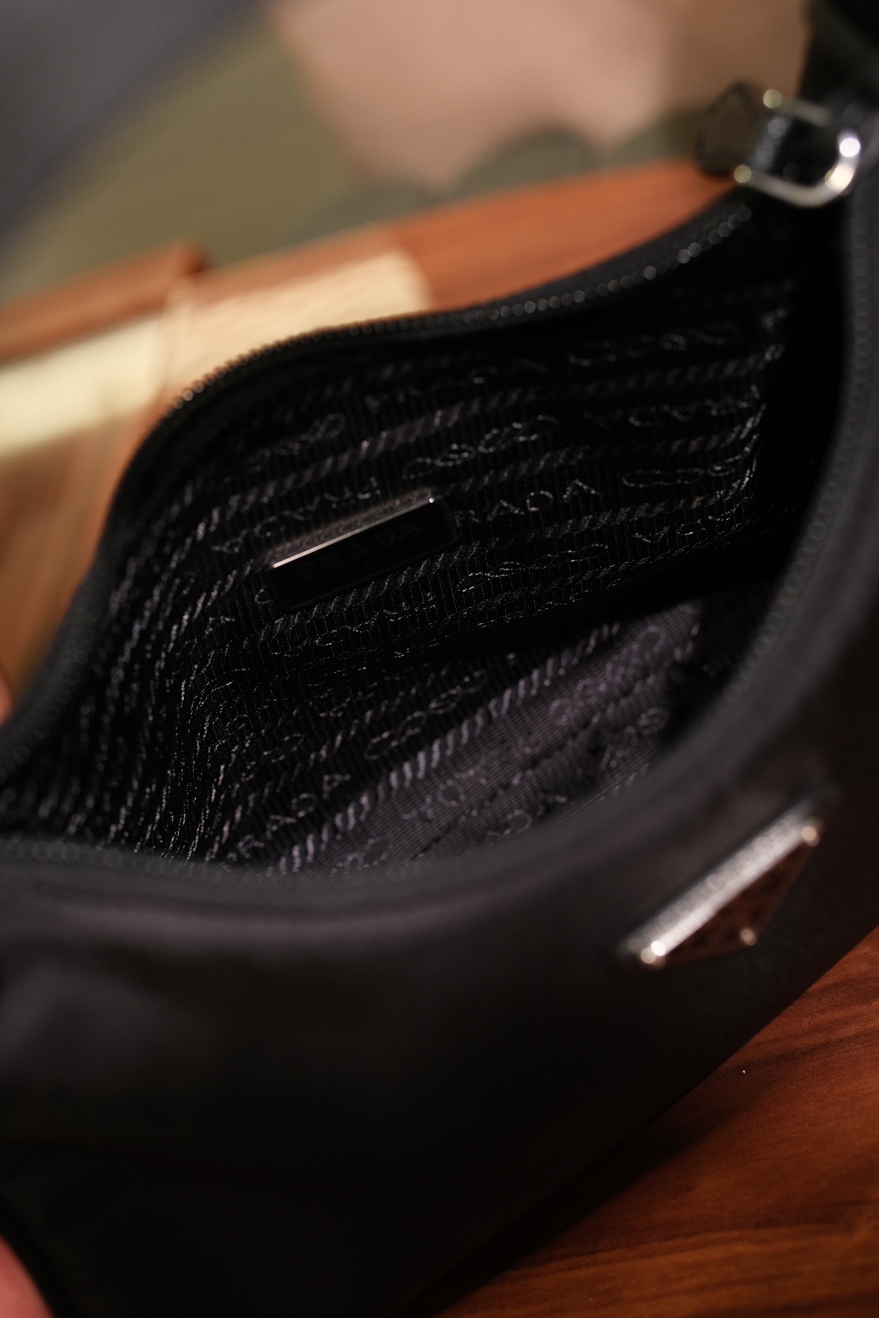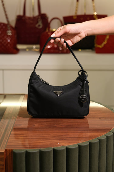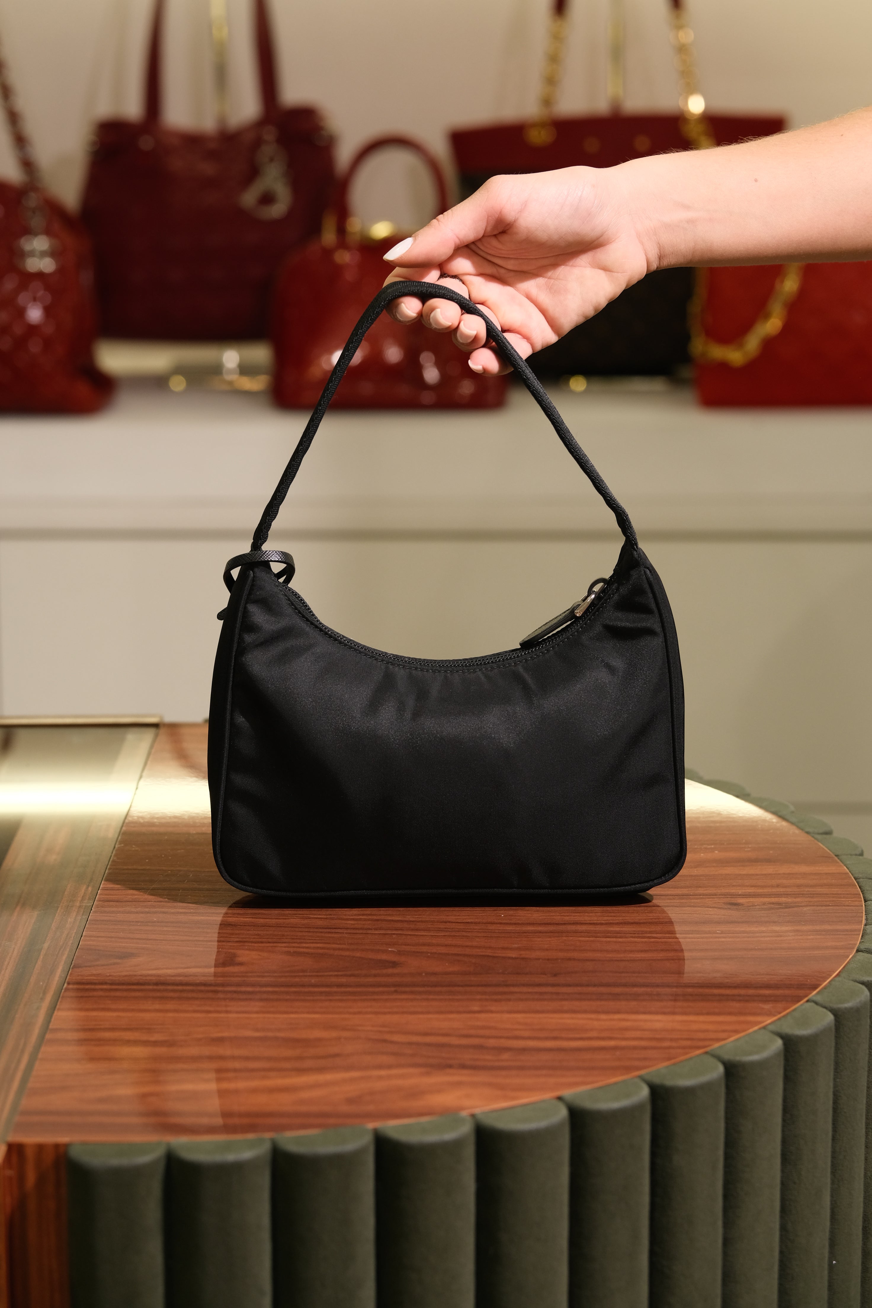 Bolsa Prada Re-Edition, em nylon, compartimento único, alça de mão e zíper na parte superior.