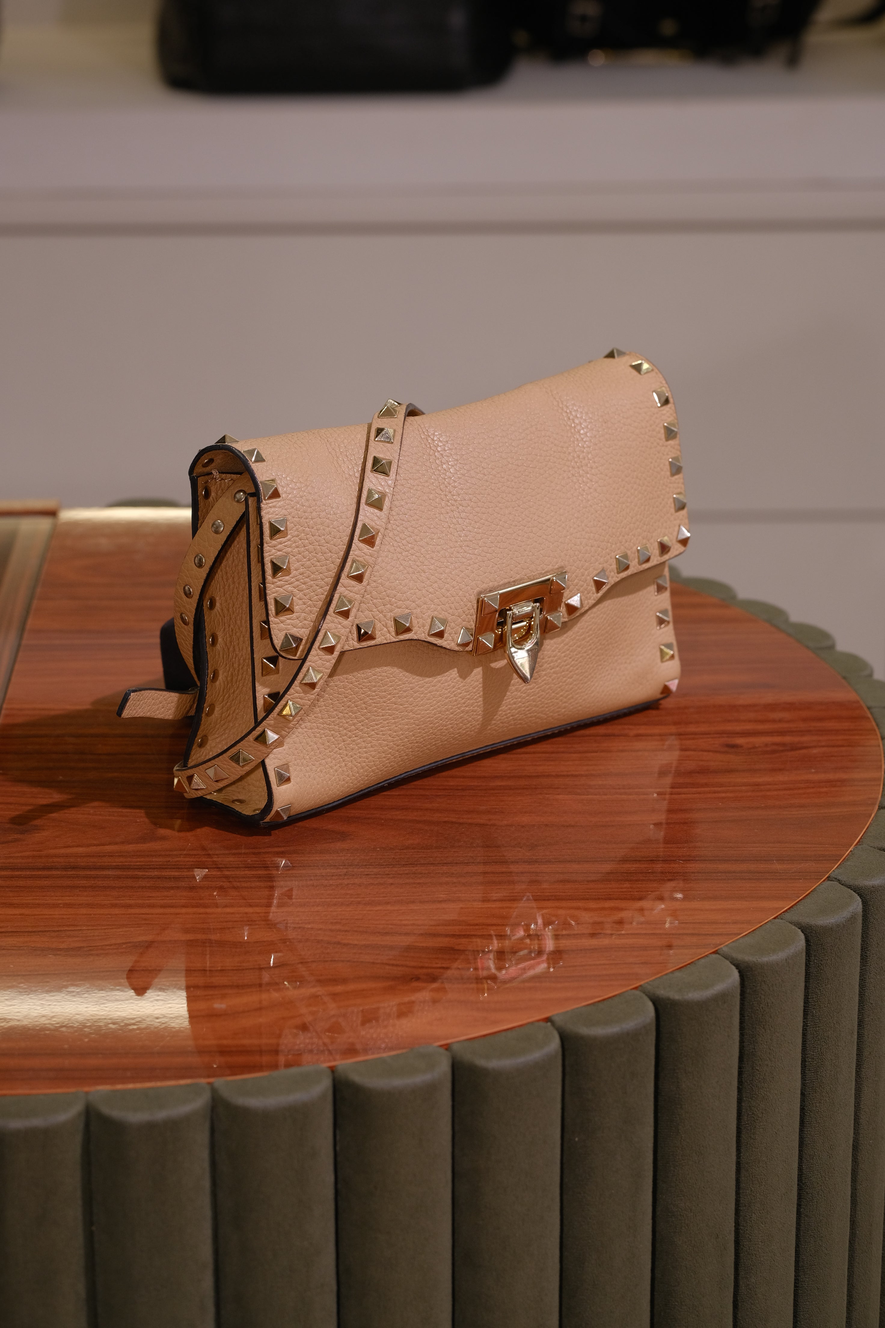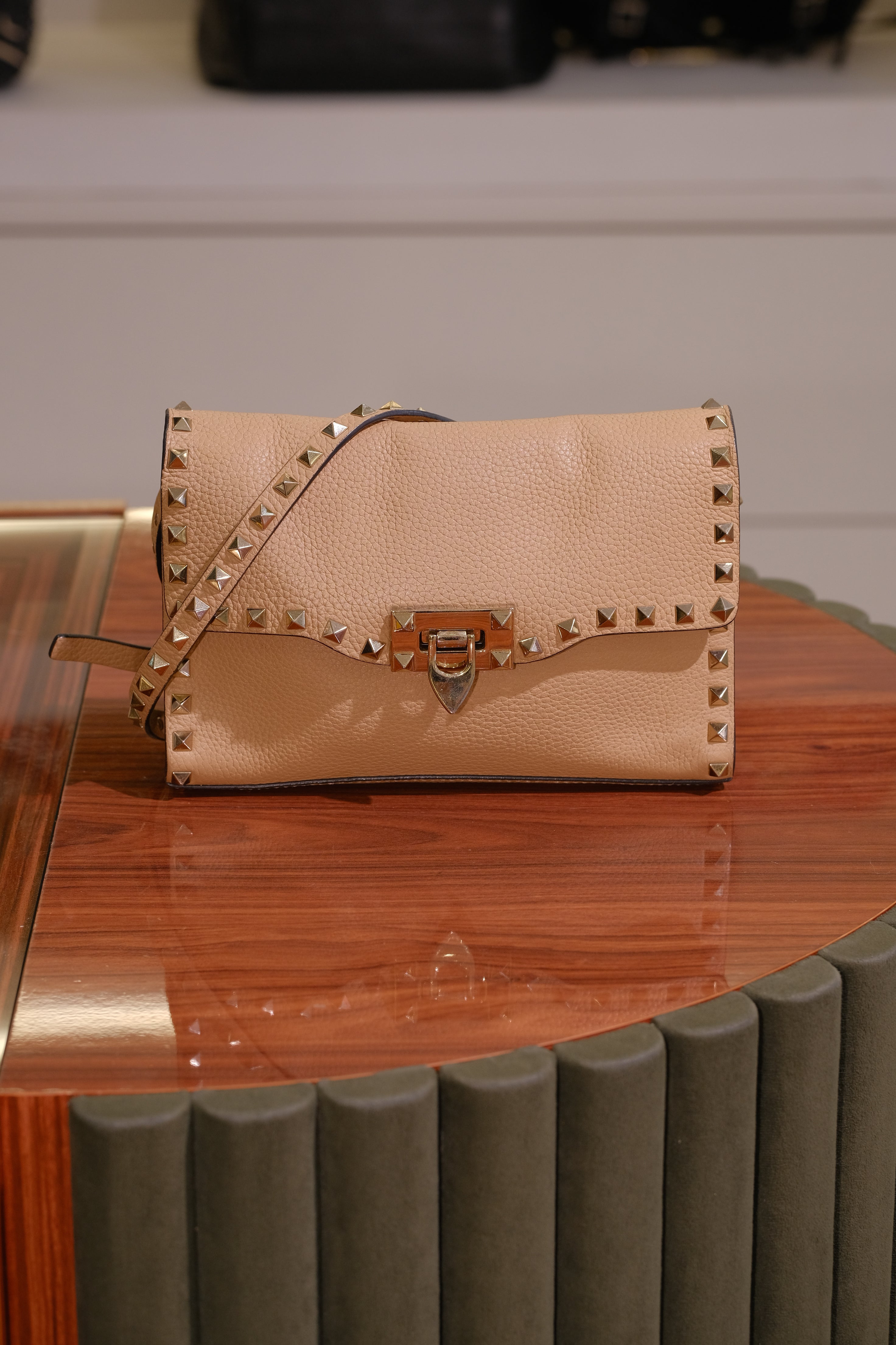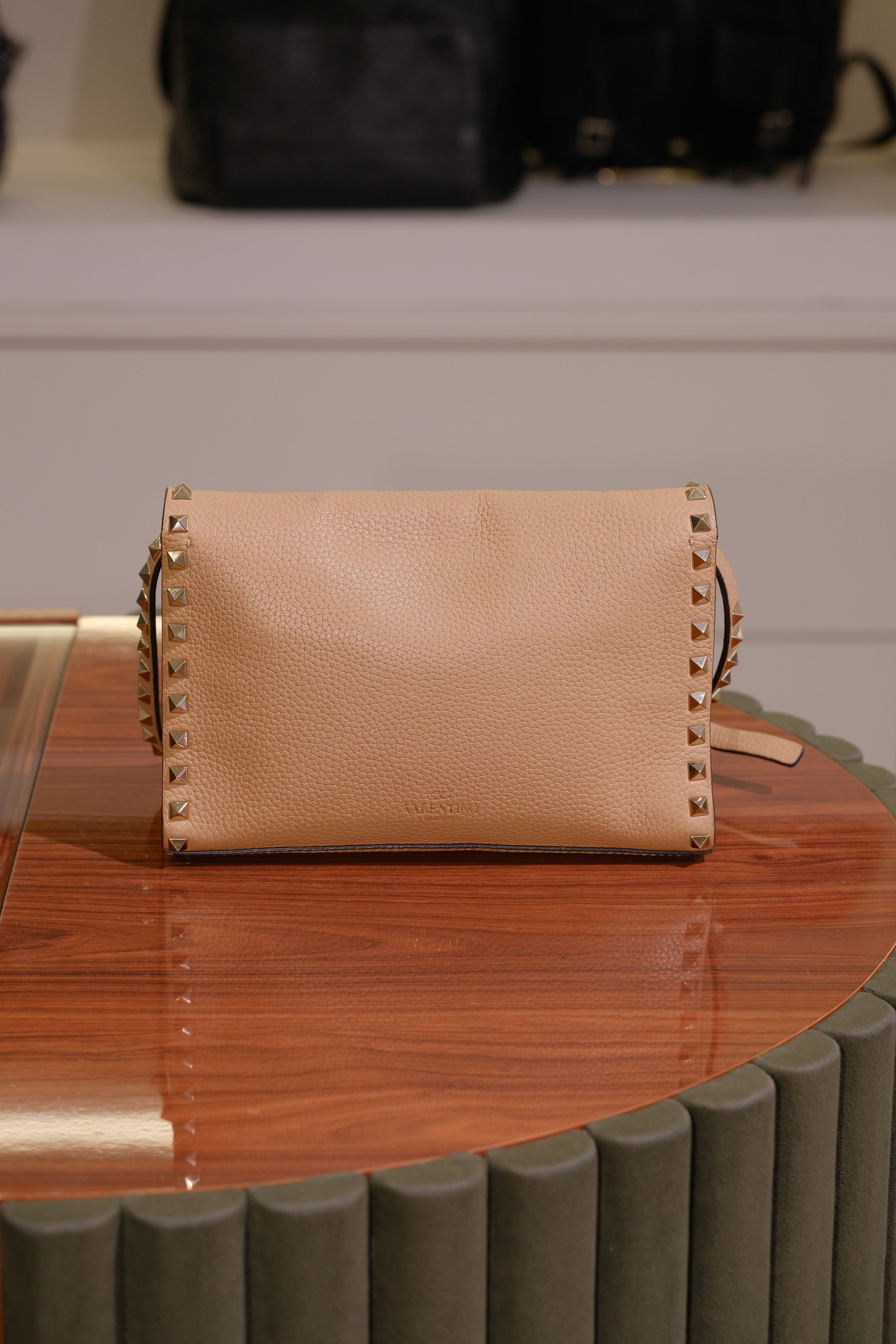 Bolsa Valentino Rockstud, em couro na cor nude e detalhes em studs, compartimento único com bolso interno, alça longa, ferragem em dourado e aba frontal com fecho de encaixe.