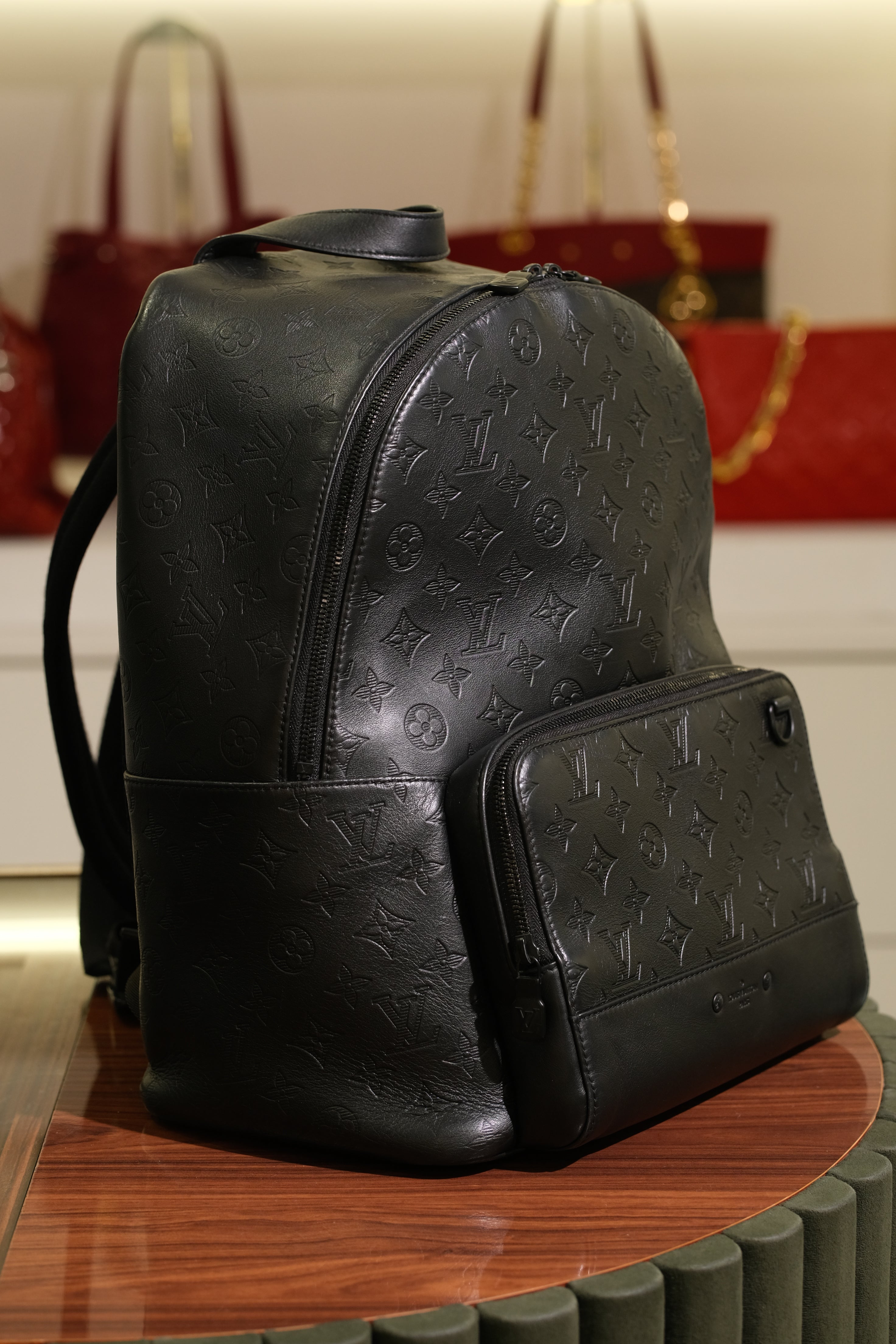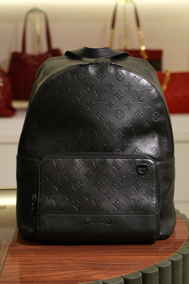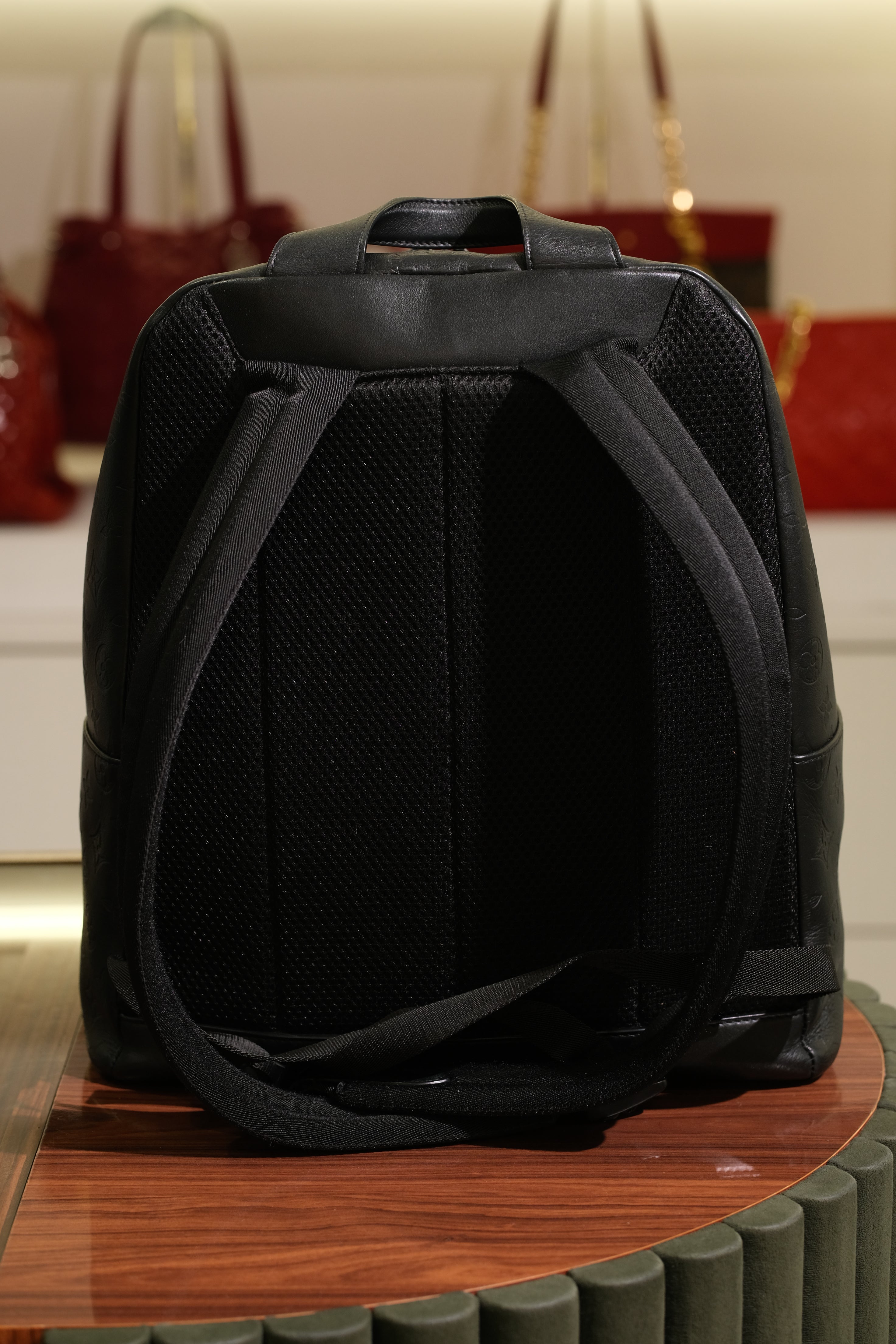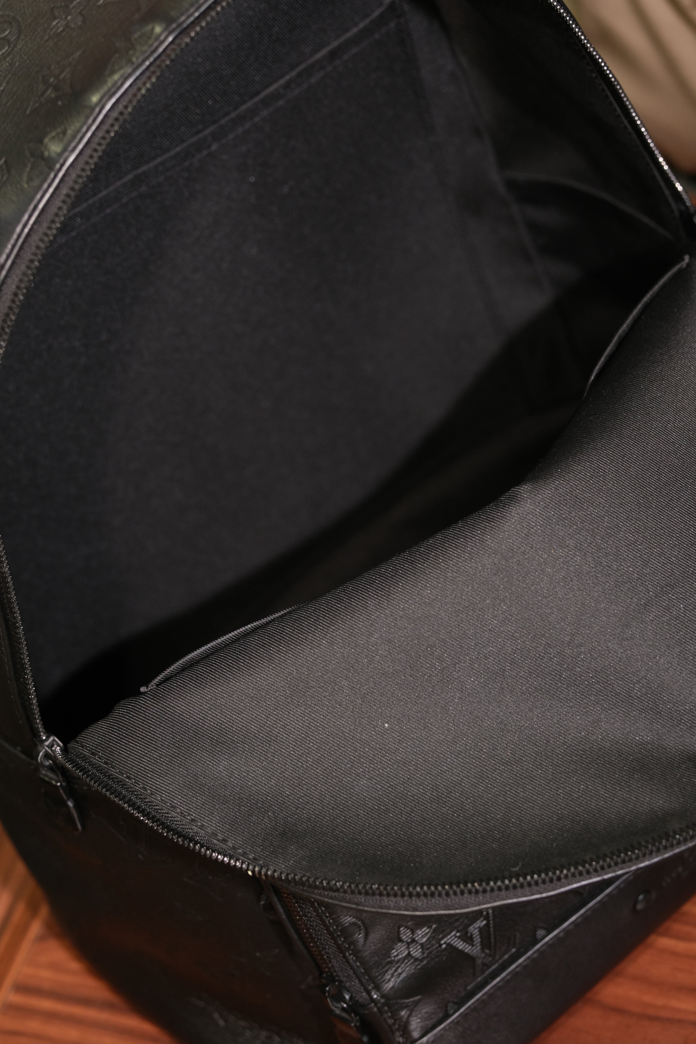 Mochila Louis Vuitton Racer, em couro na cor preta com monograma em alto relevo, compartimento único com bolsos internos, bolso externo fechado por zíper, alça de costas, ferragem em preto, e fecho principal em zíper.