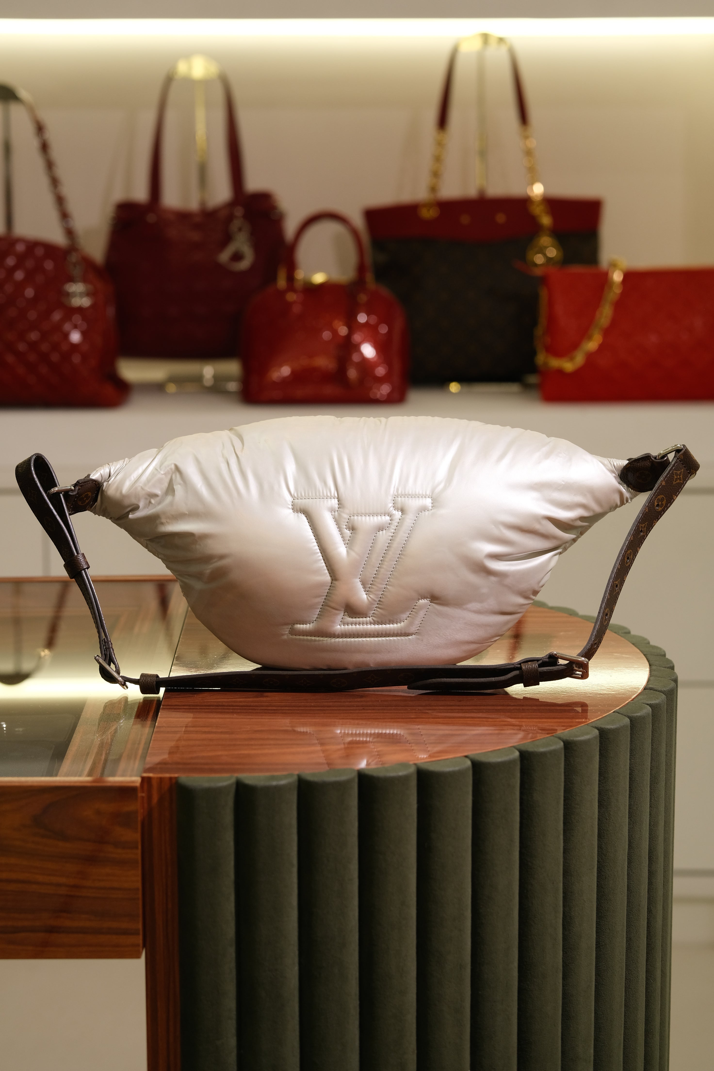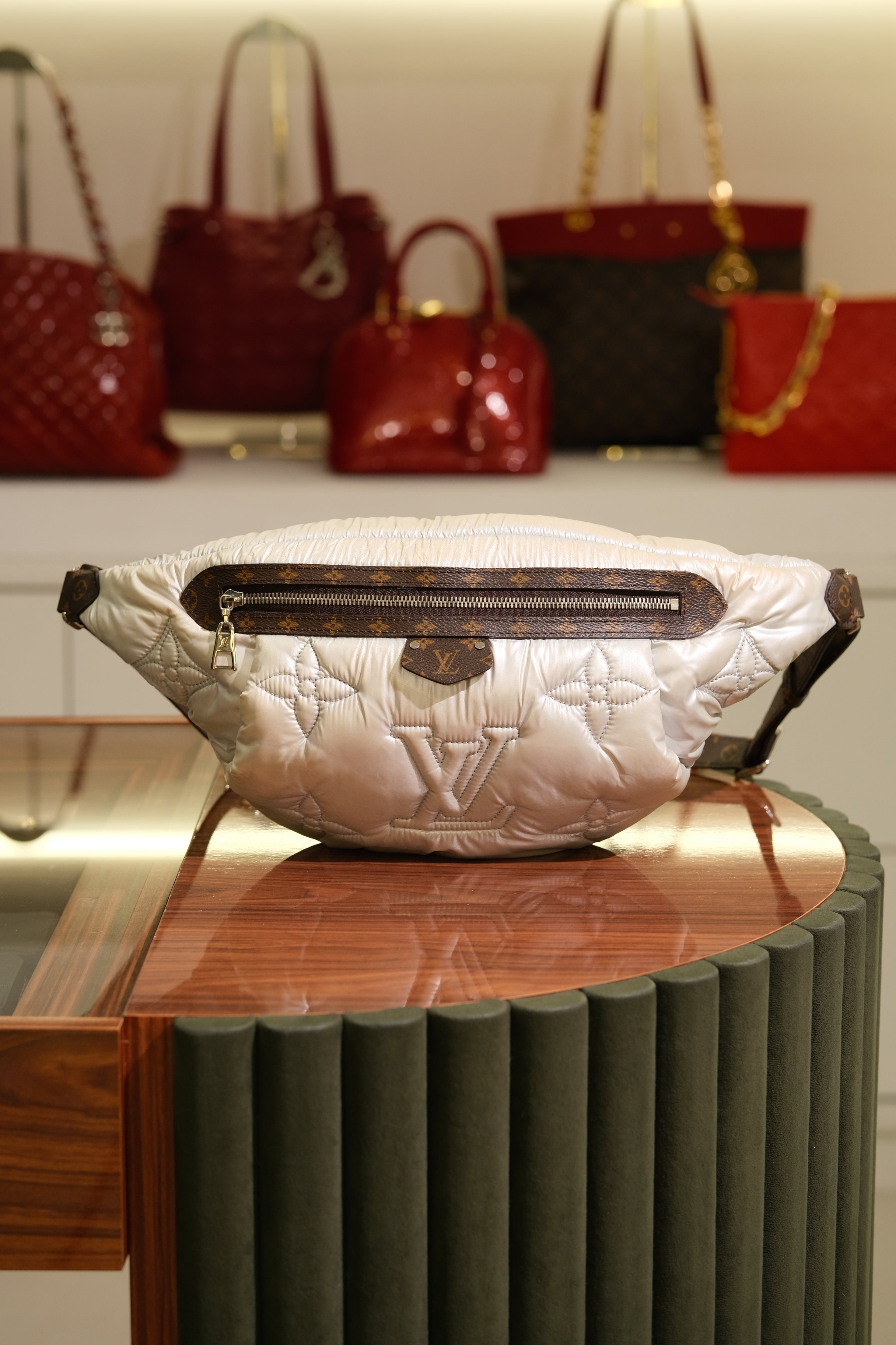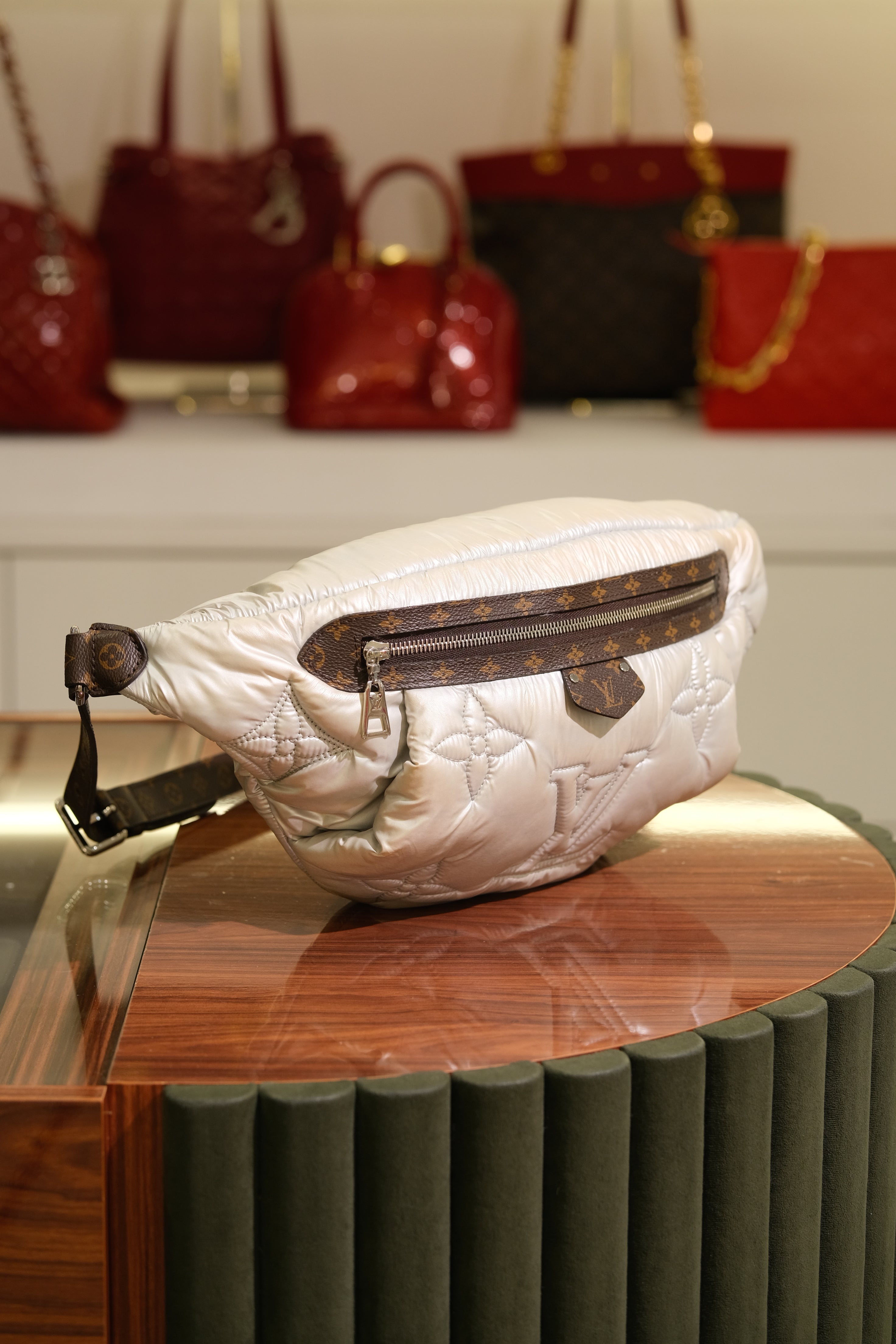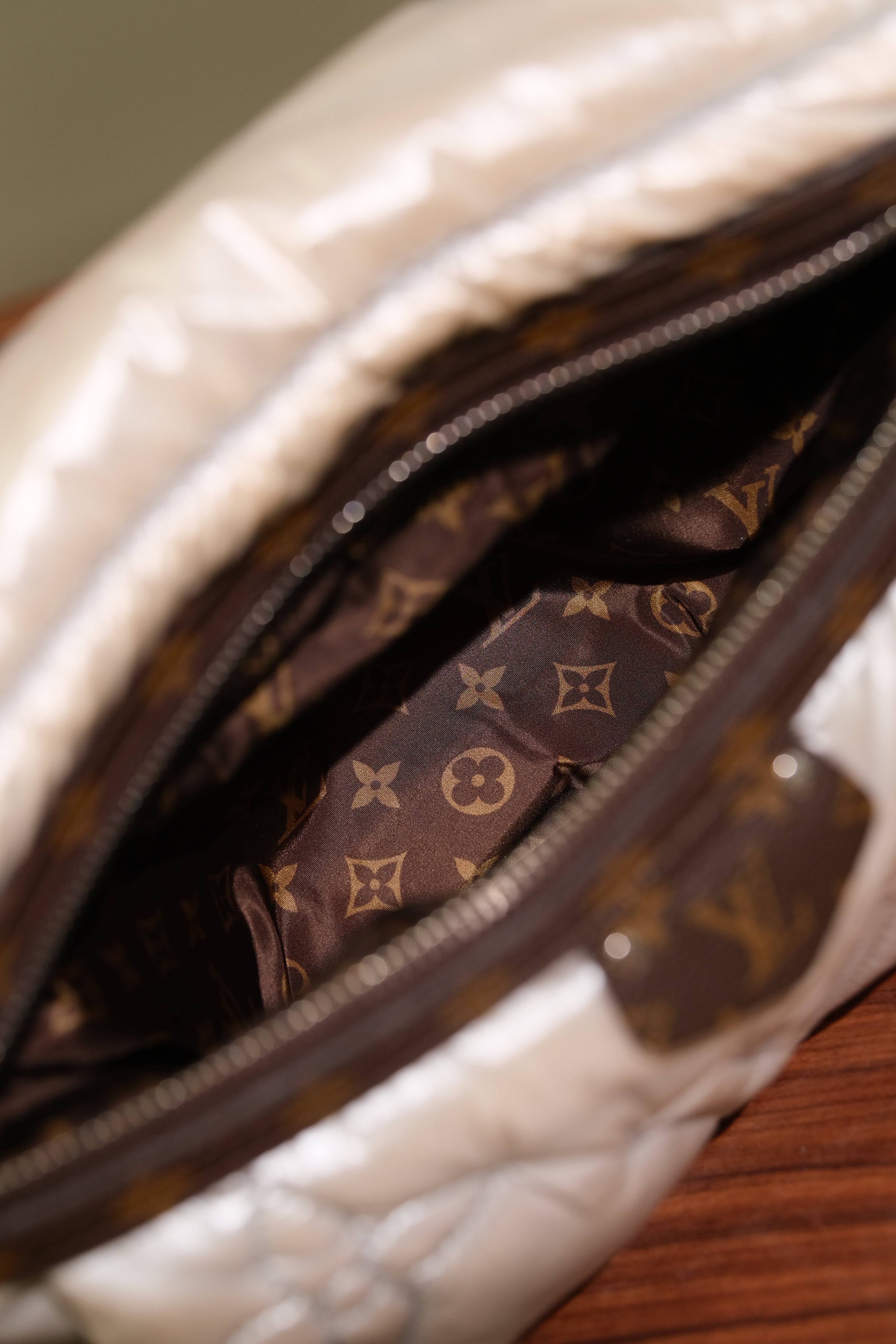 Pochette Louis Vuitton Max Bumbag, em nylon na cor prata com monograma em alto relevo, compartimento único, alça em couro com regulagem, ferragem em prata e zíper na parte frontal.