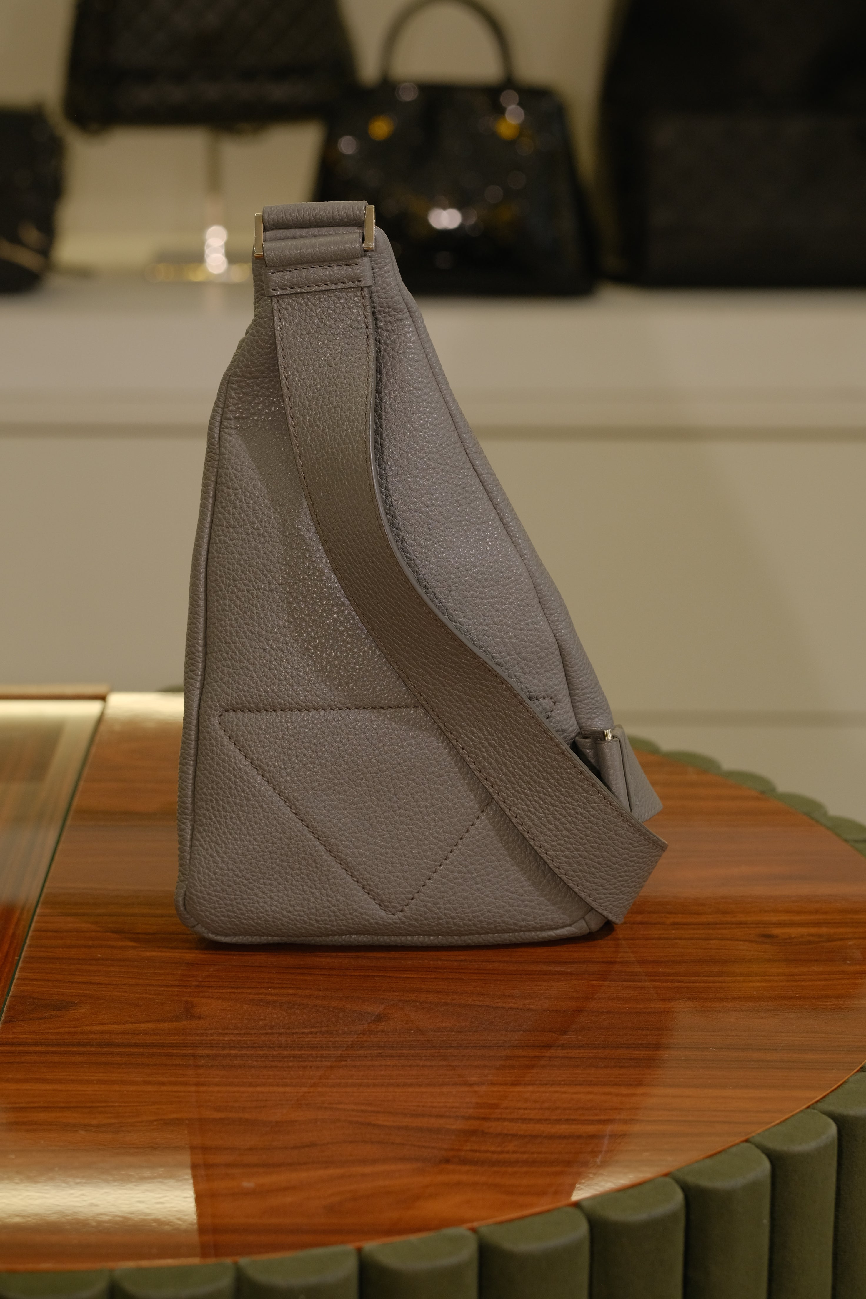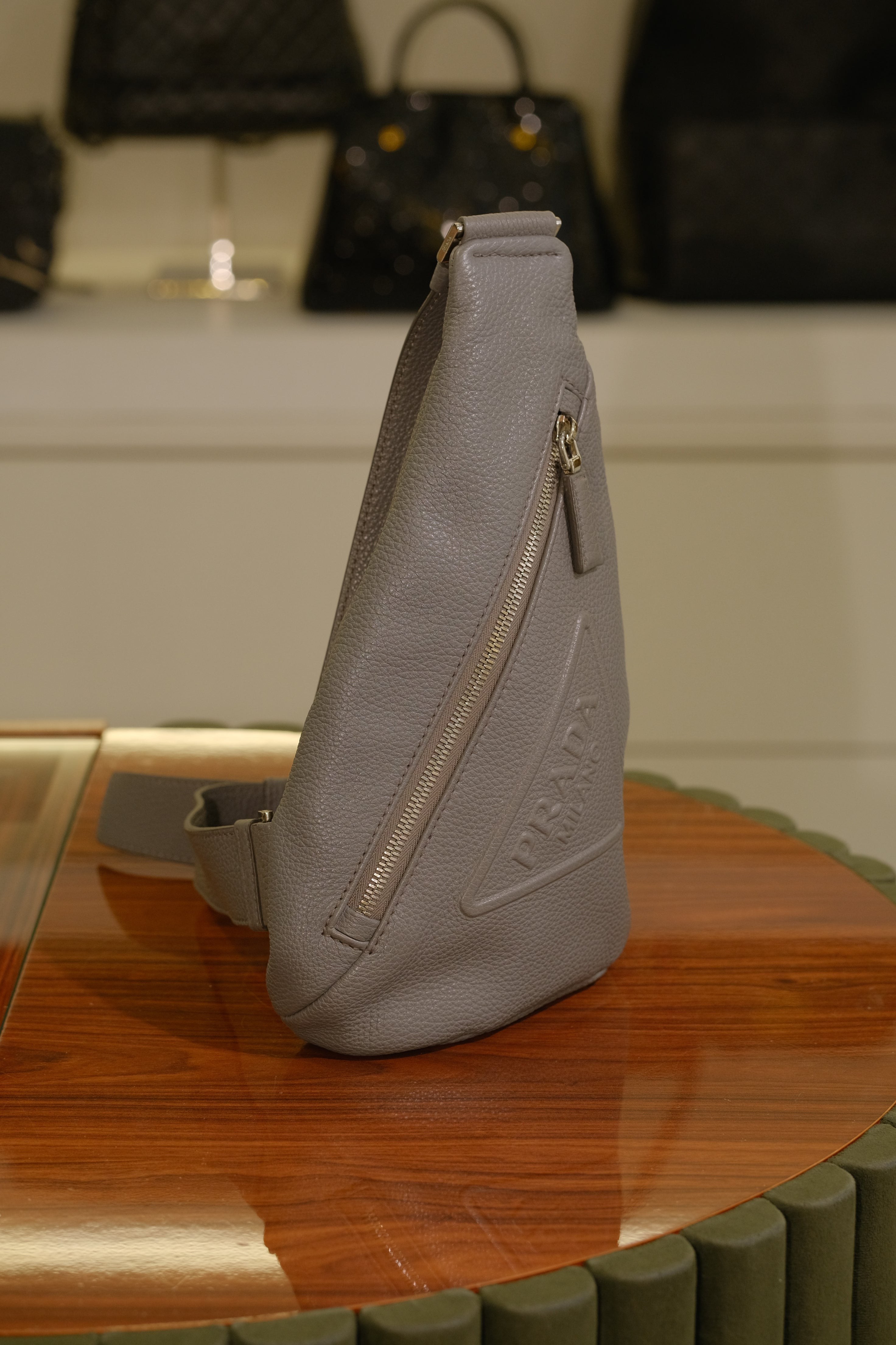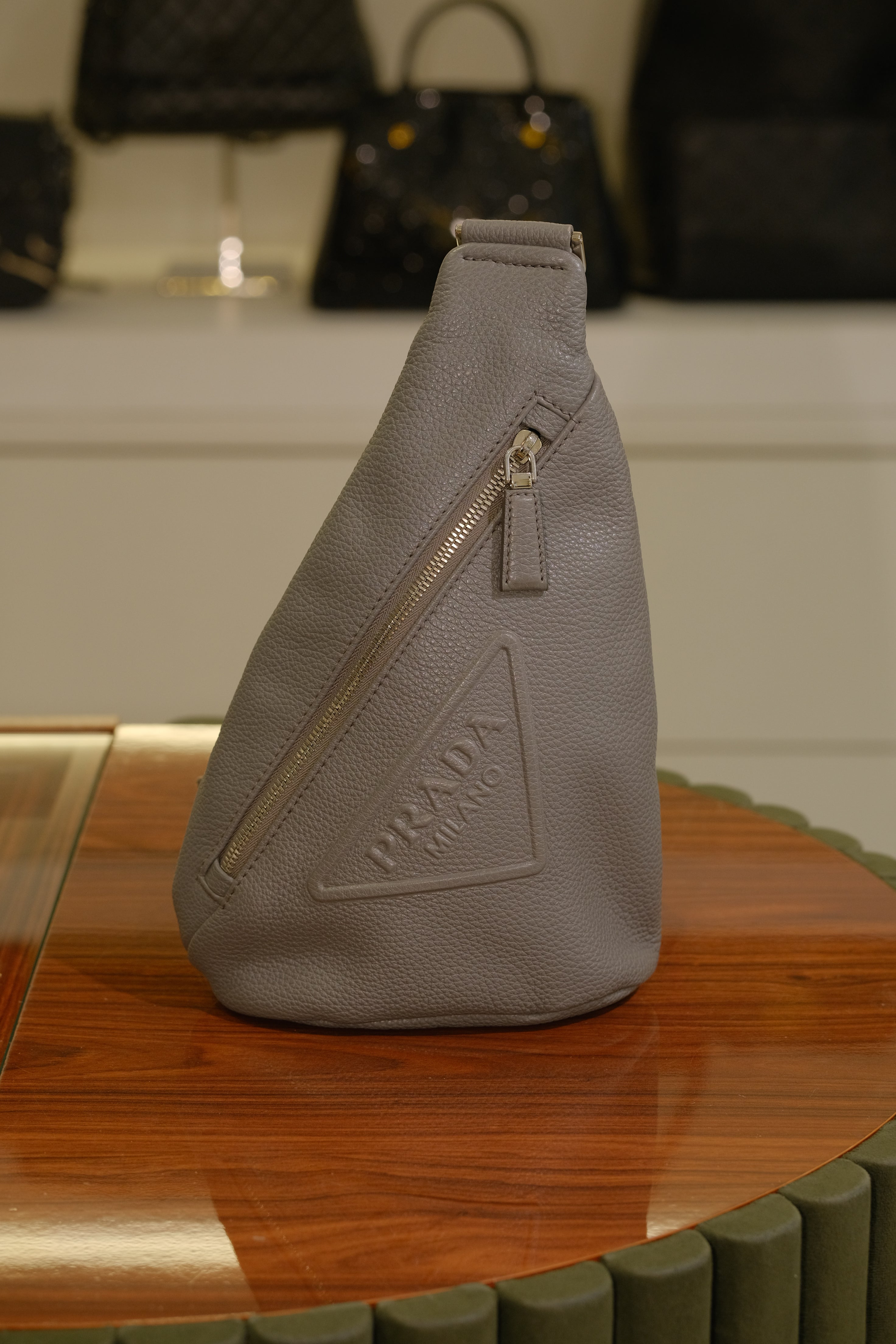 Mochila Prada, em couro na cor cinza, compartimento único com bolso interno, alça ajustável em couro, ferragem em prata e fecho de zíper na parte frontal.