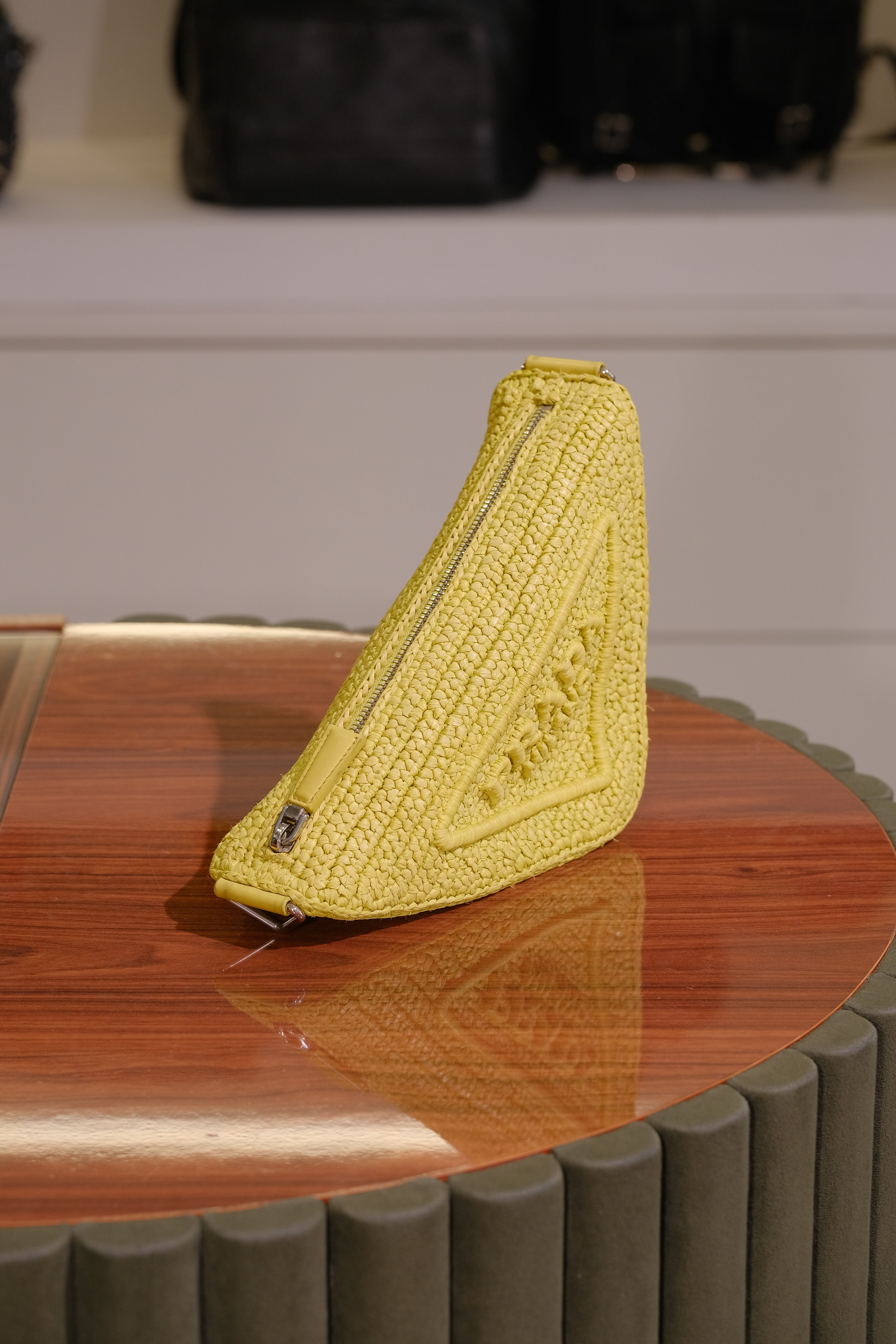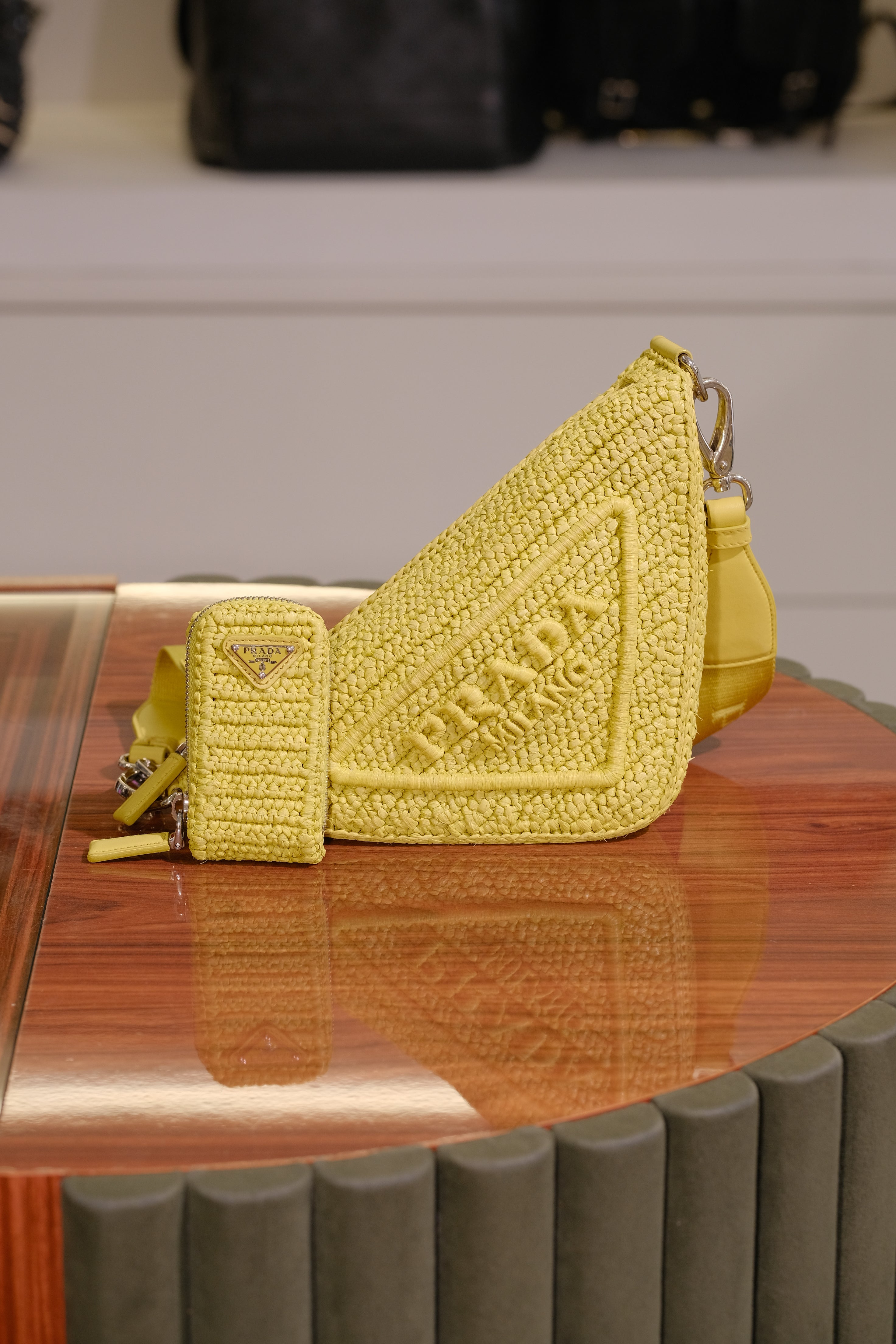 Bolsa Prada Triangle, em ráfia na cor amarelo, compartimento único, alça longa ajustável, ferragem em prata e fecho em zíper na parte superior.