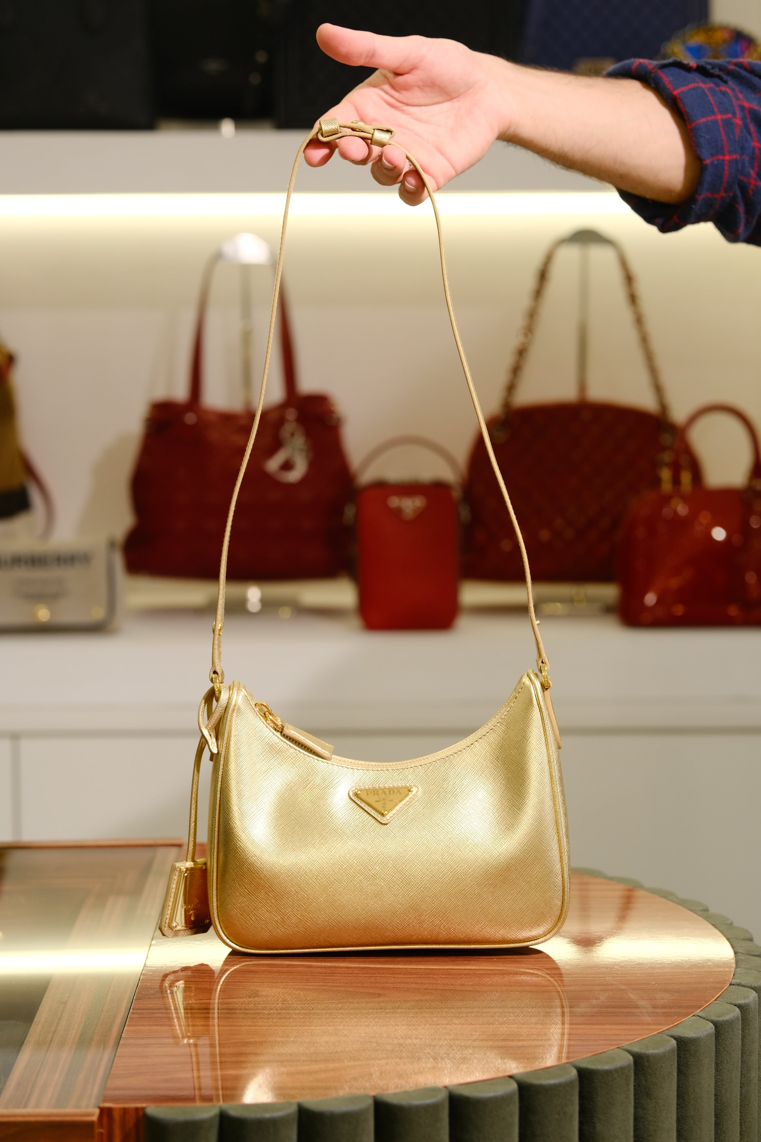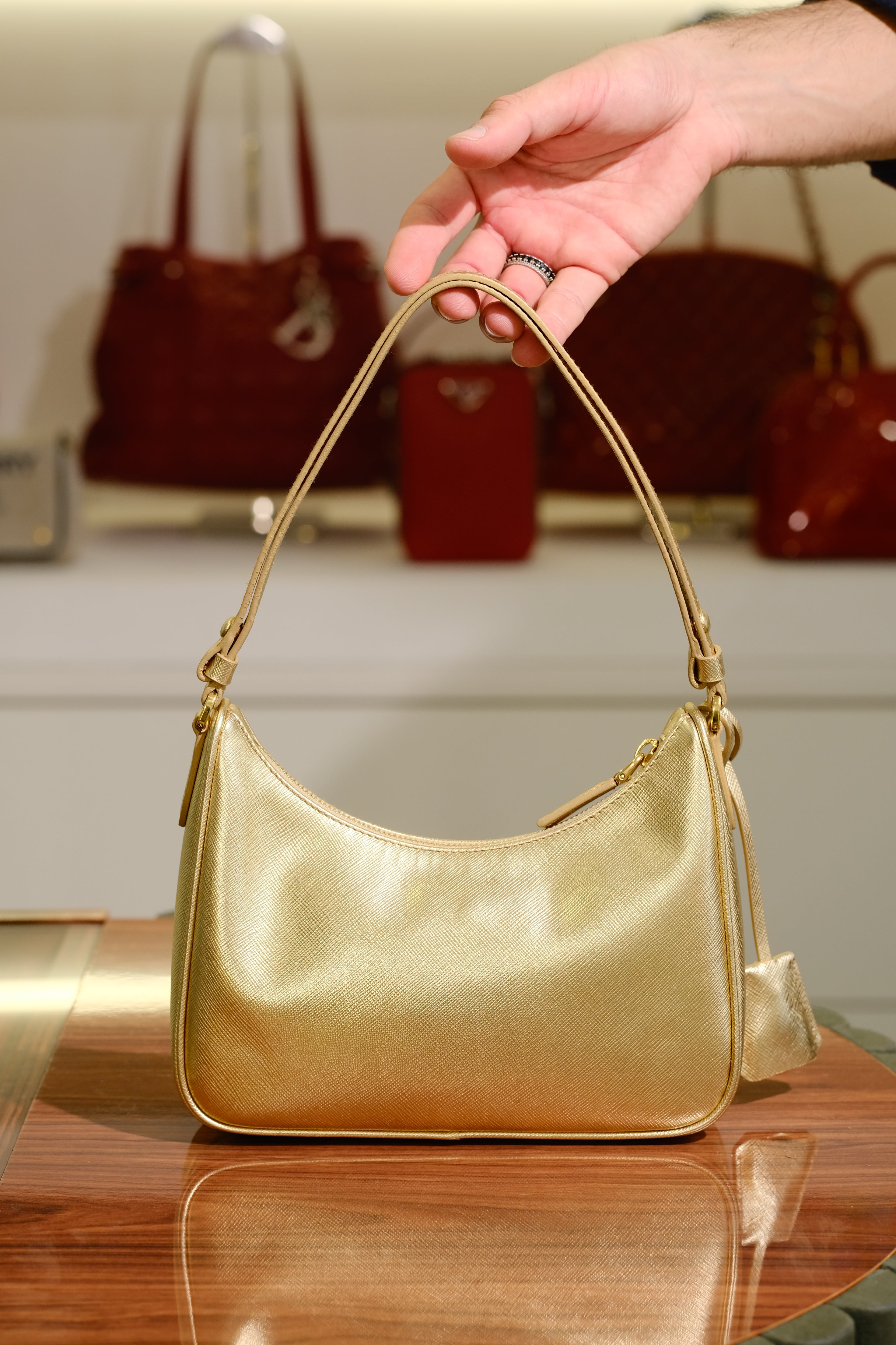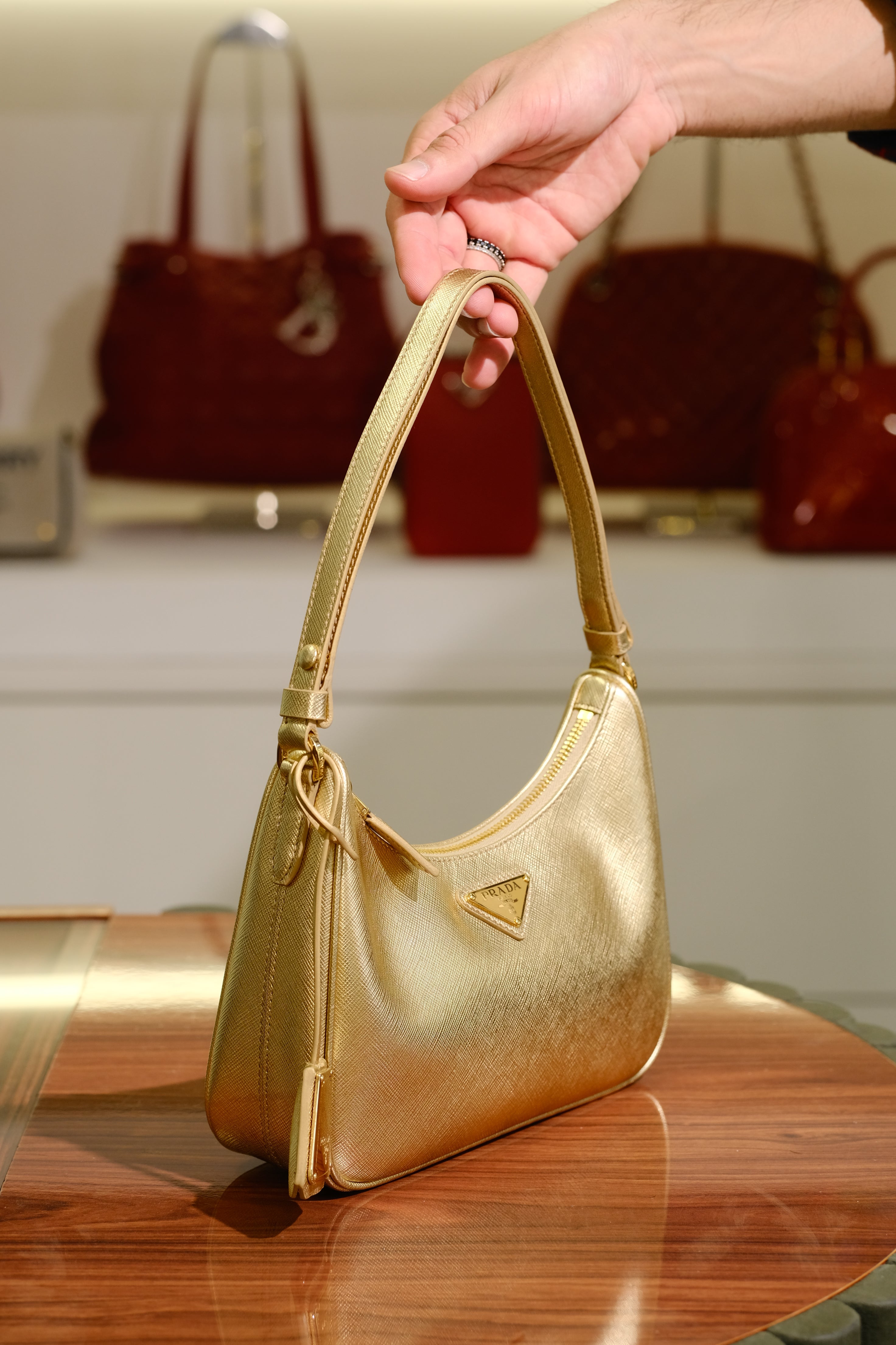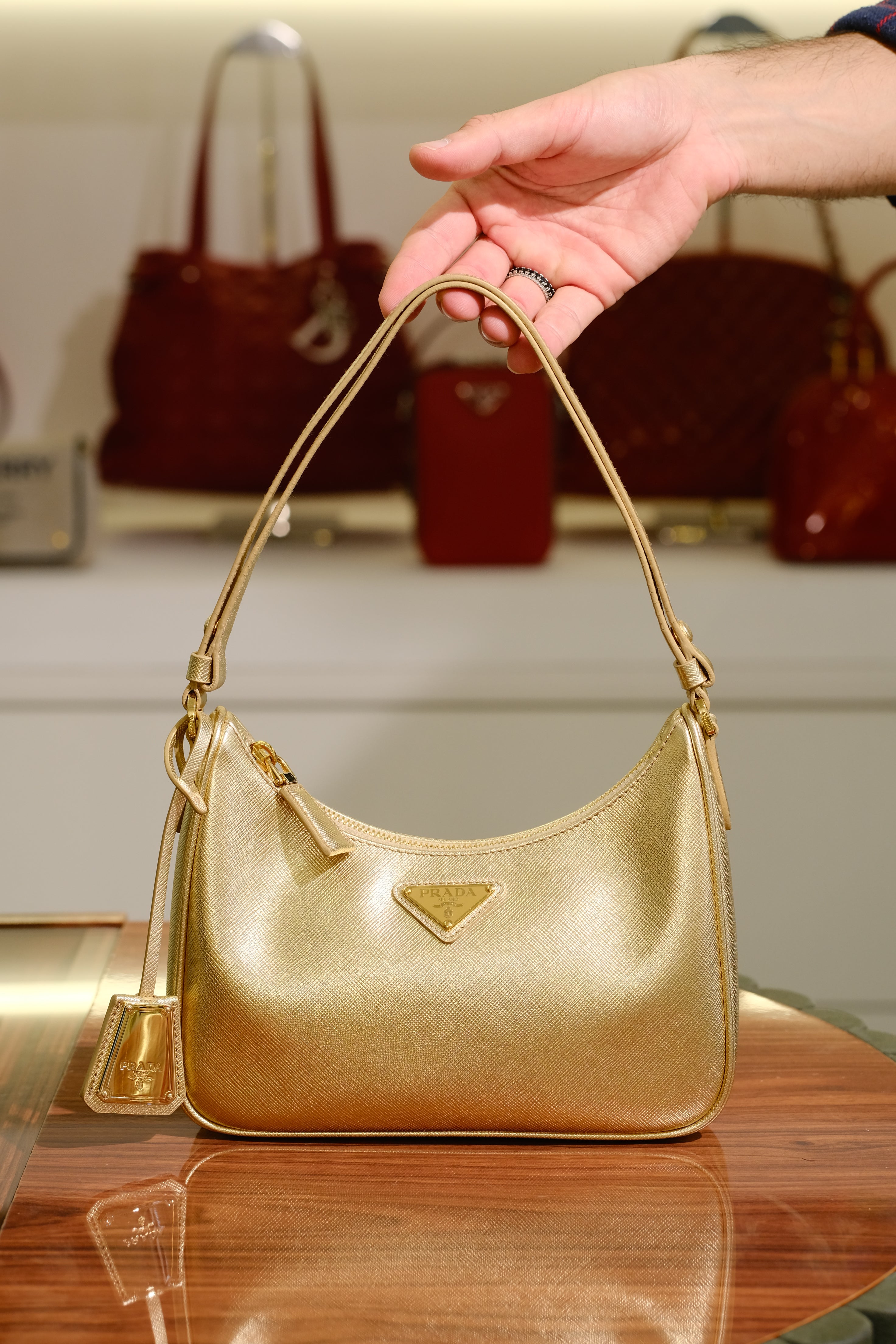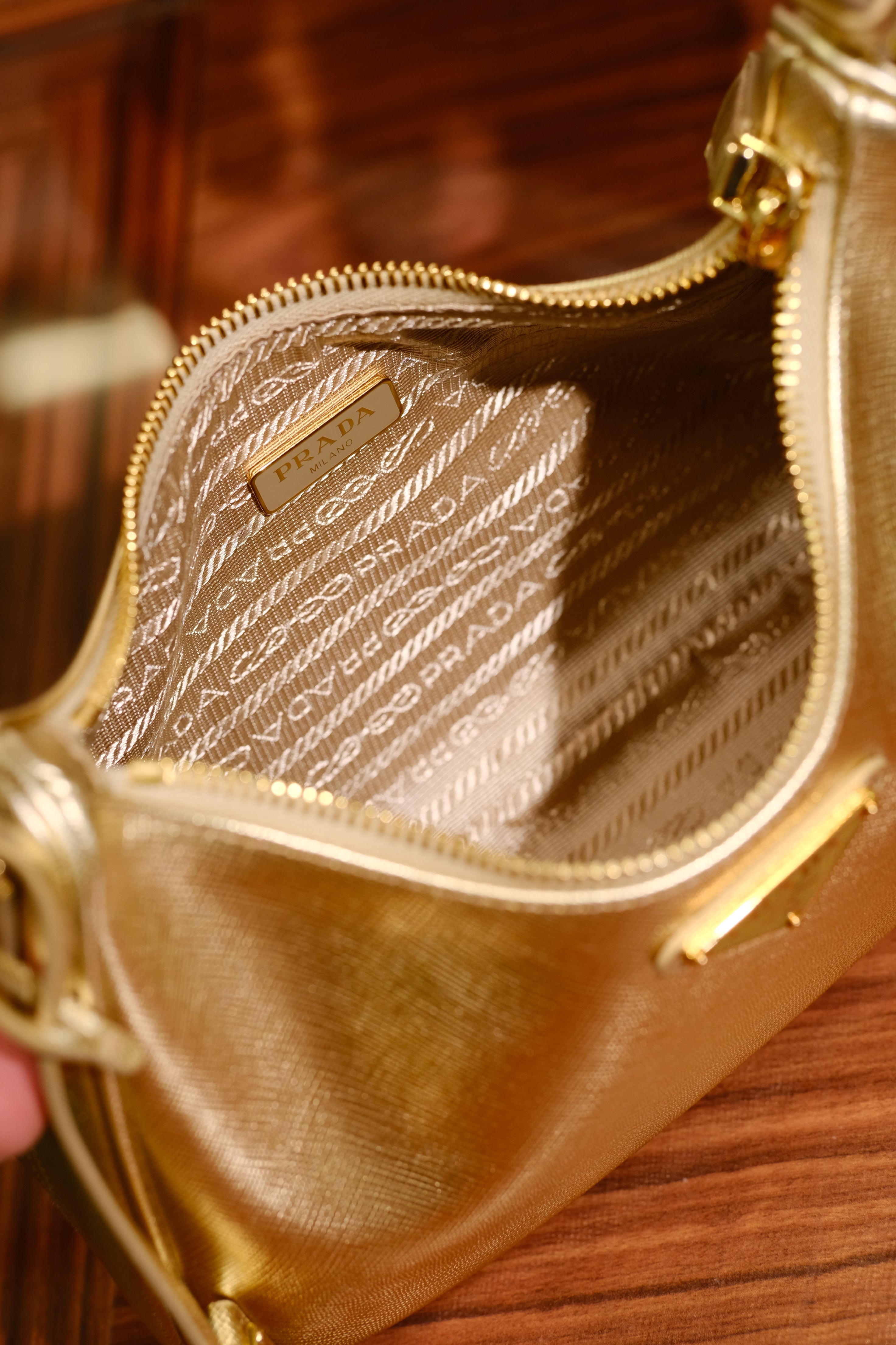 Bolsa Prada Re-Edition, em couro na cor dourada, alça de ombro ajustável, compartimento único, ferragem em prata e ziper na parte superior.