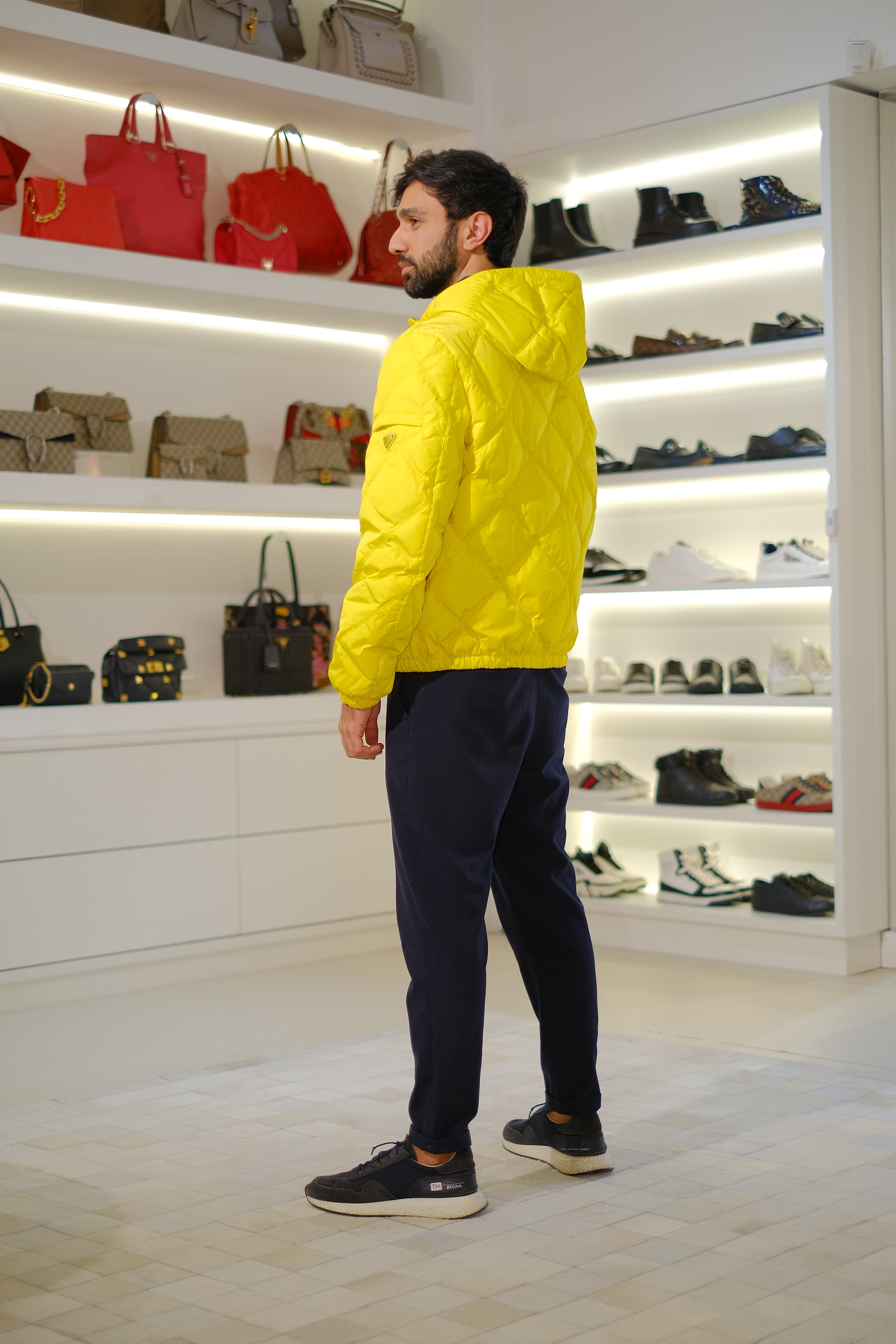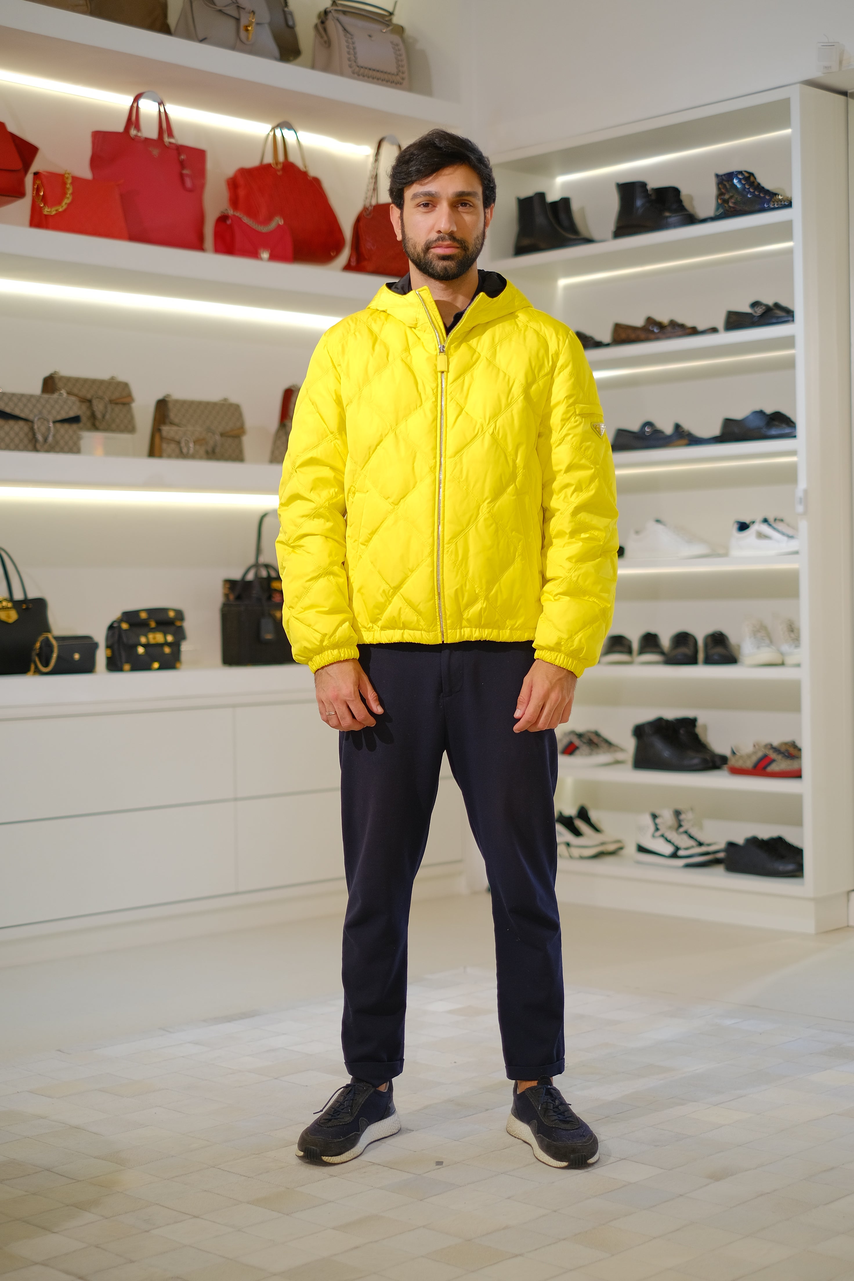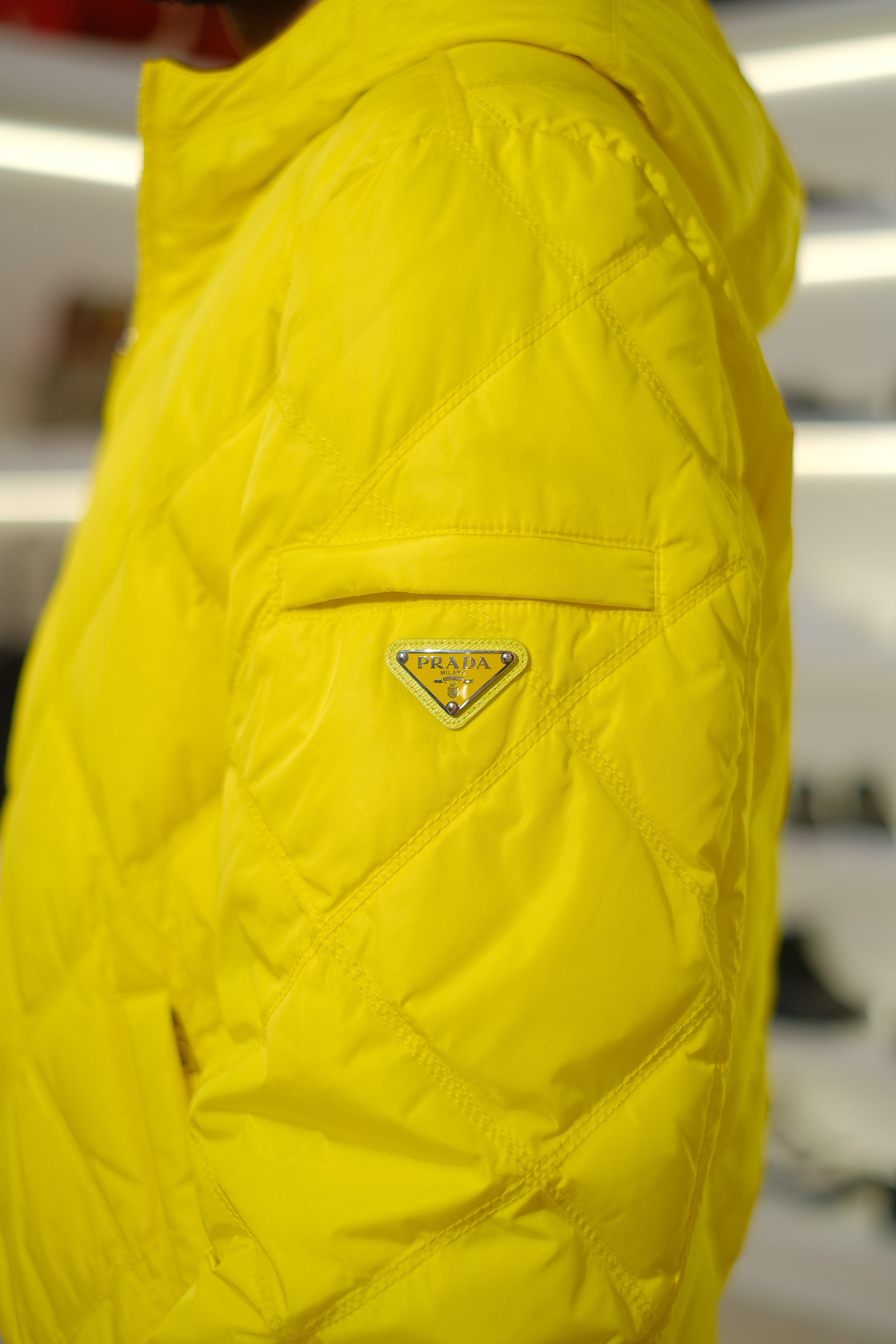 Jaqueta Prada, em nylon na cor amarela e detalhe em matelassê, detalhe de bolso no braço e capuz. Tamanho M