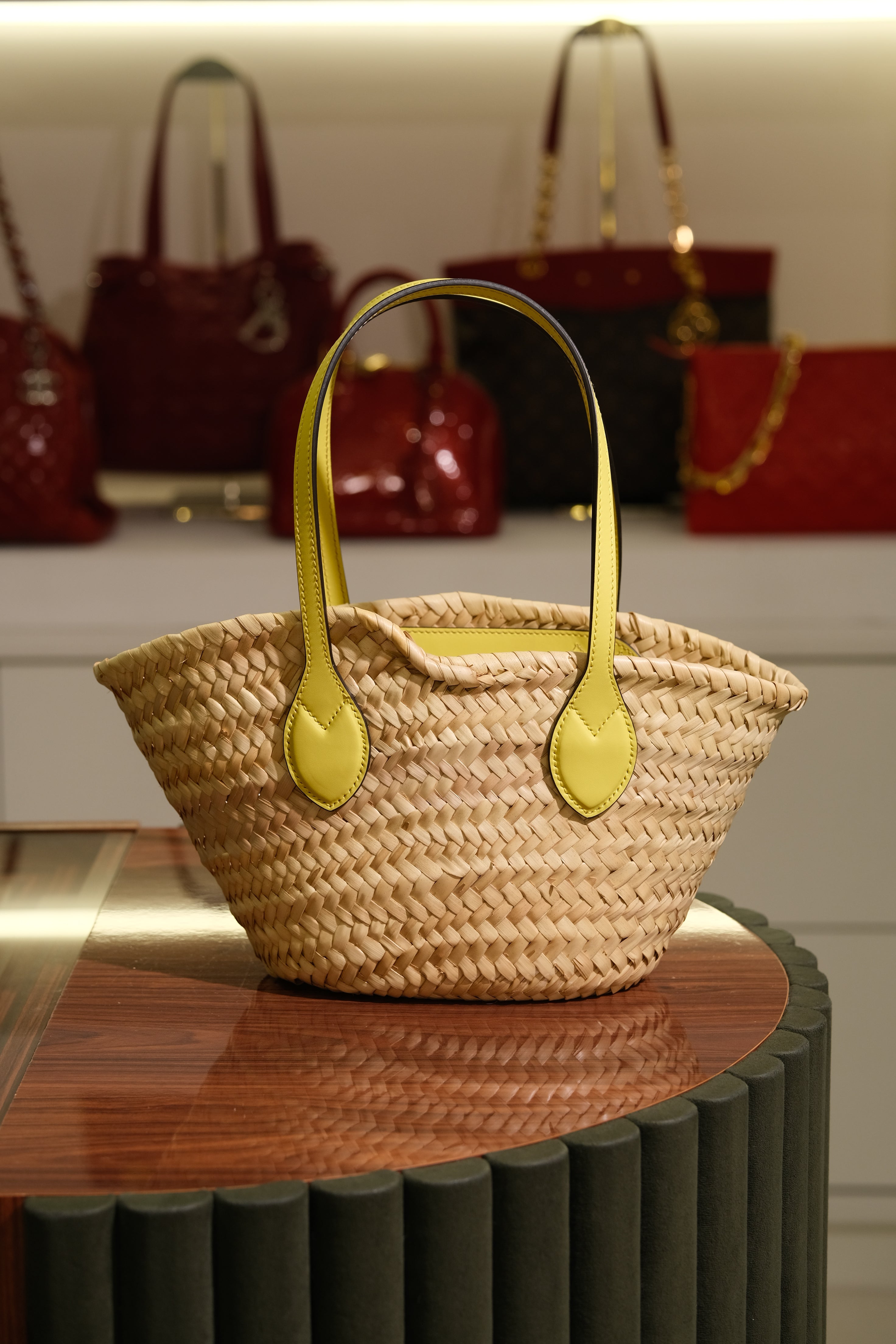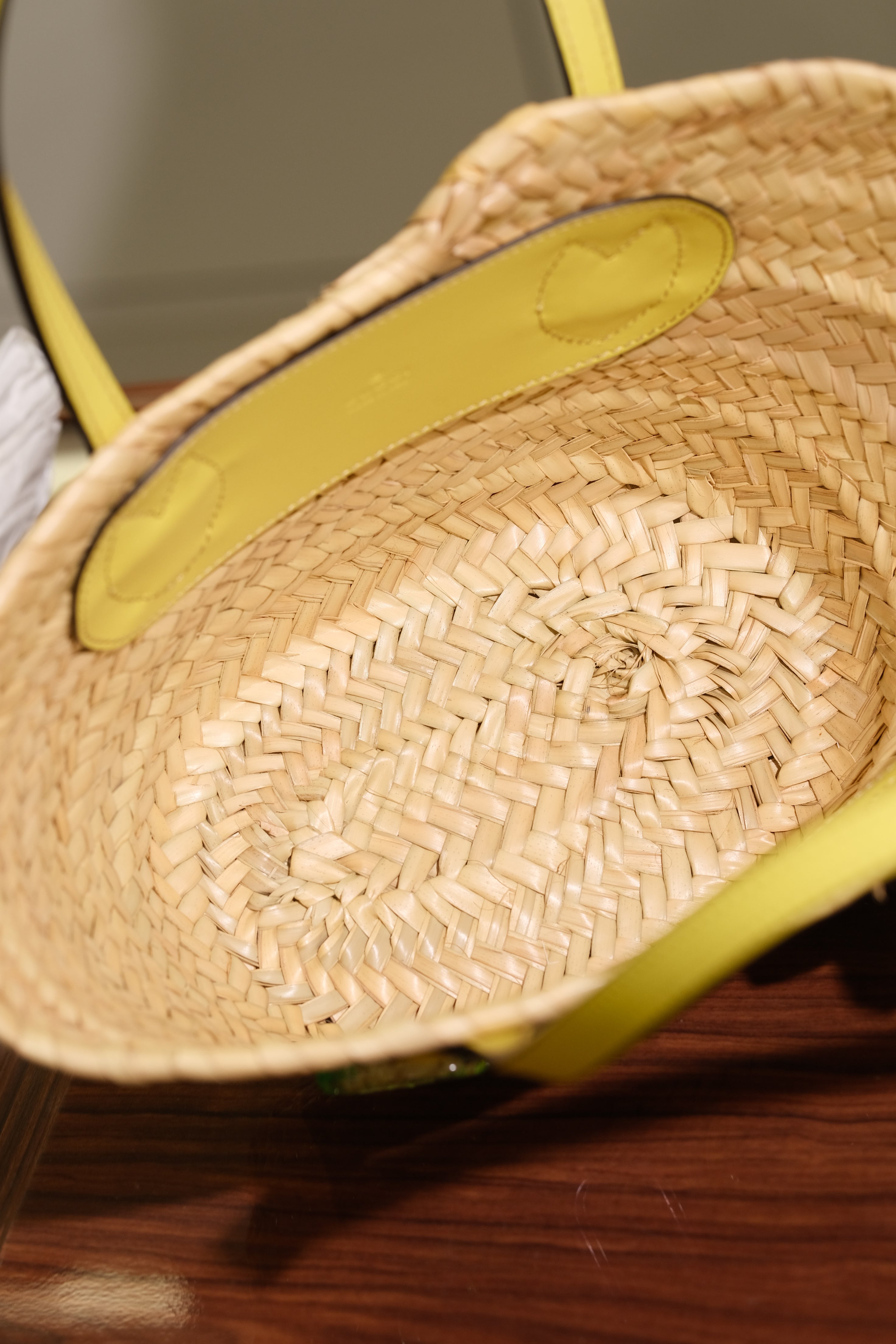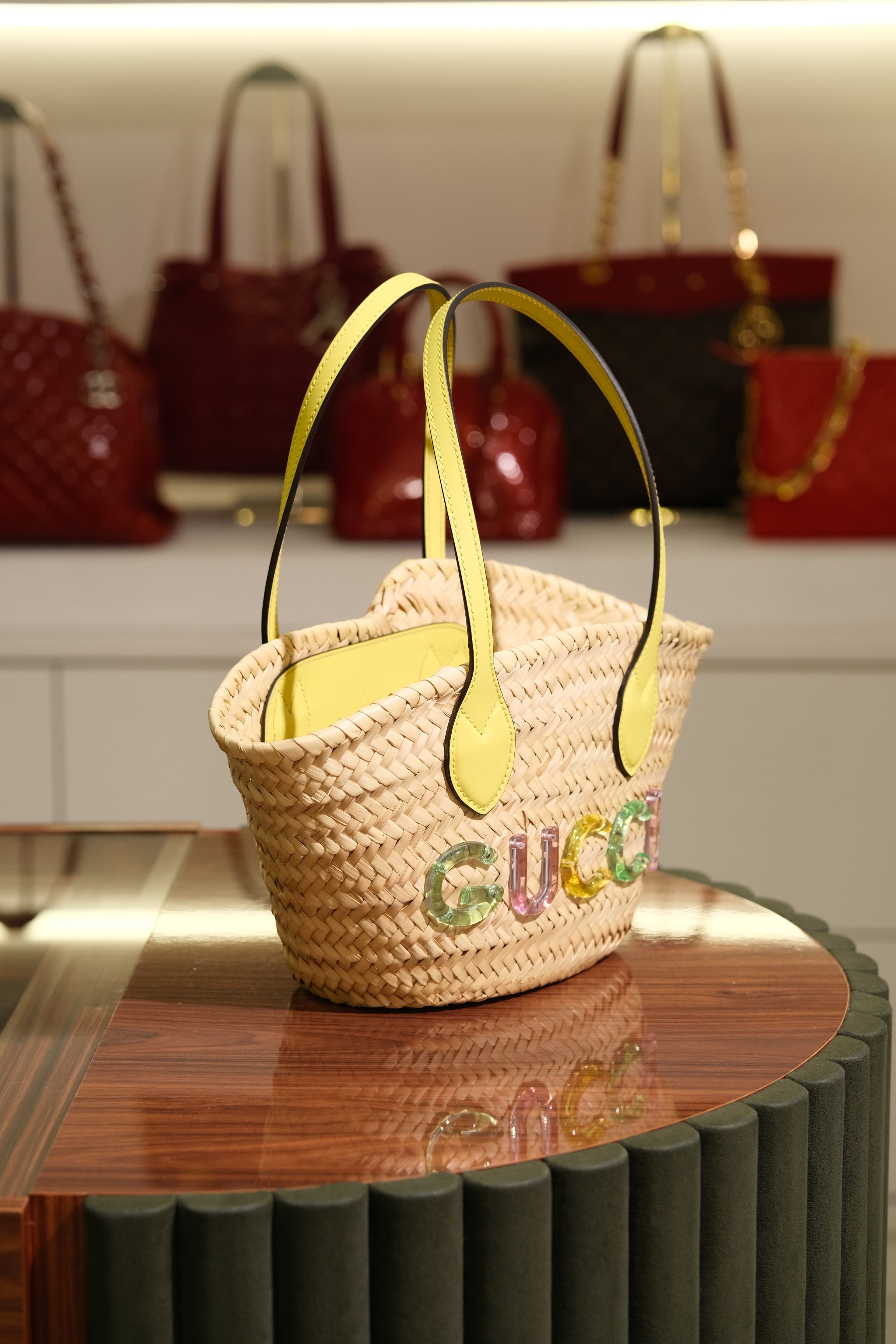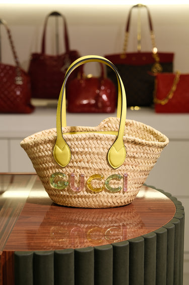 Bolsa de Ráfia Gucci, em ráfia, compartimento único, alça dupla de mão em couro na cor amarela e logo na parte frontal em colorido.