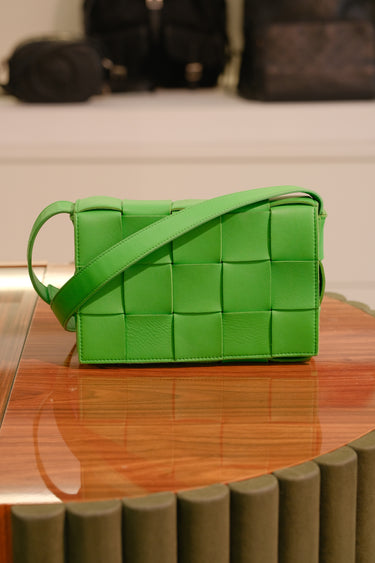 Bolsa Bottega Veneta Cassette, em couro na cor verde, compartimento único com bolso interno fechado por zíper, ferragem em prata, alça longa e aba frontal.