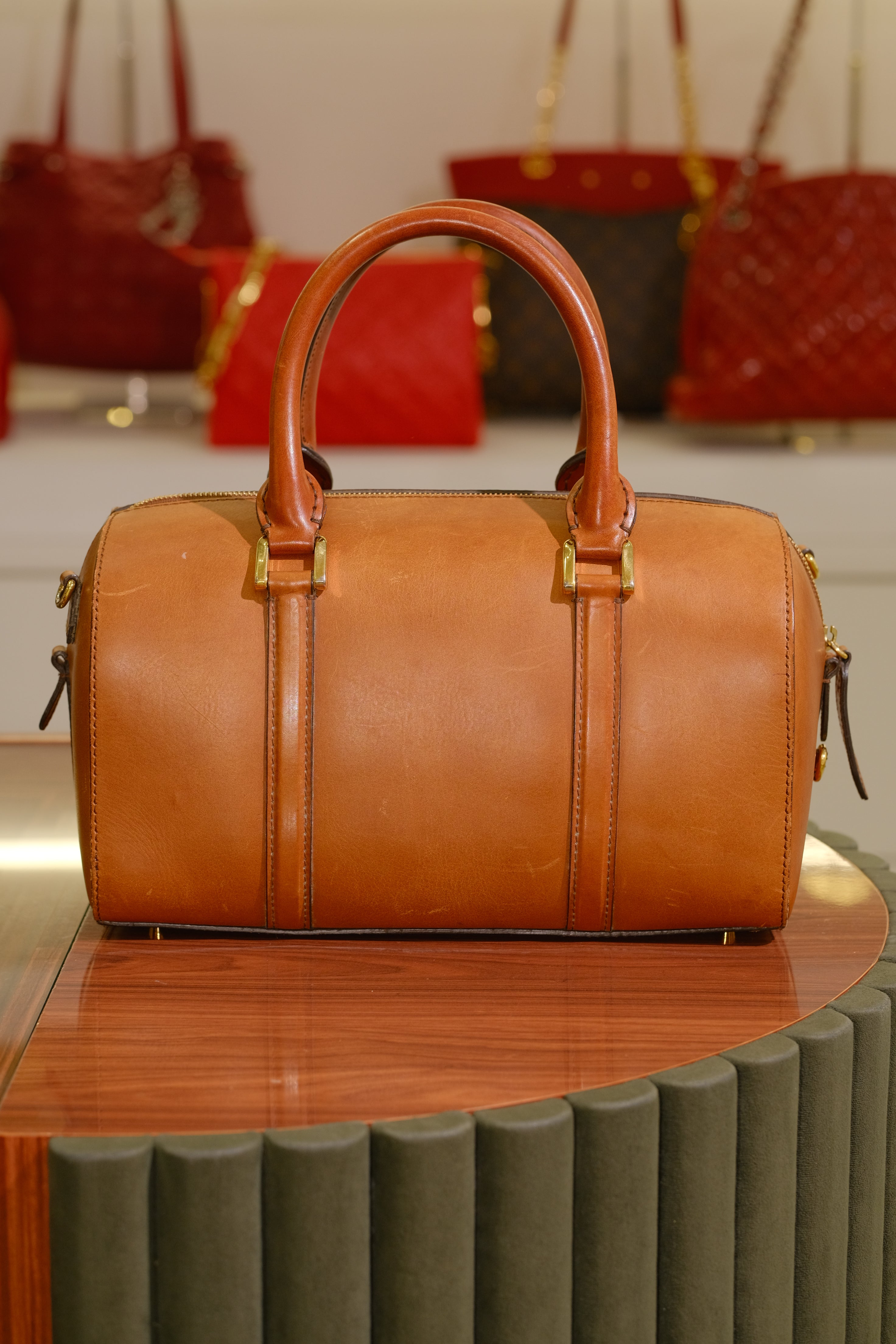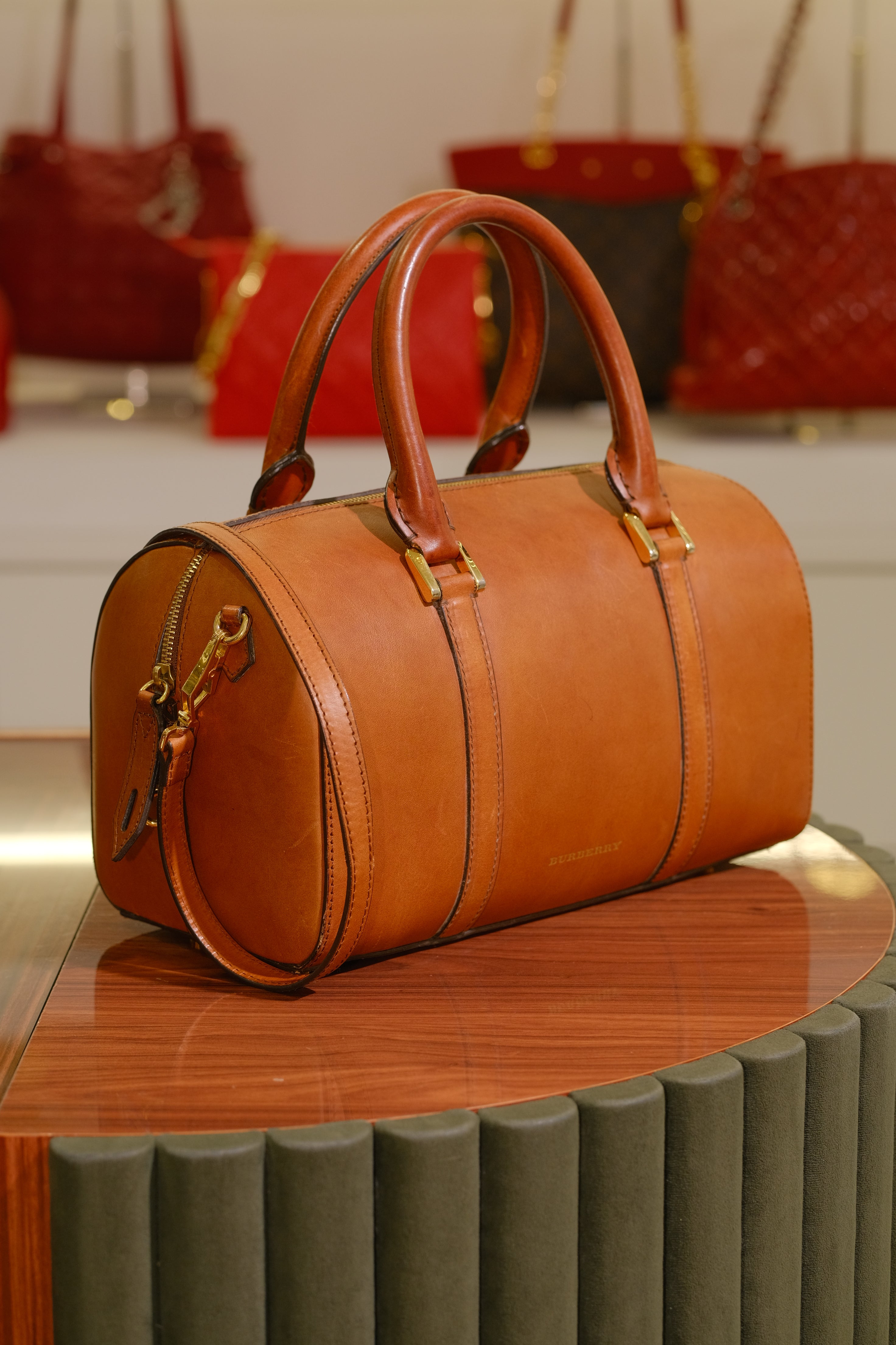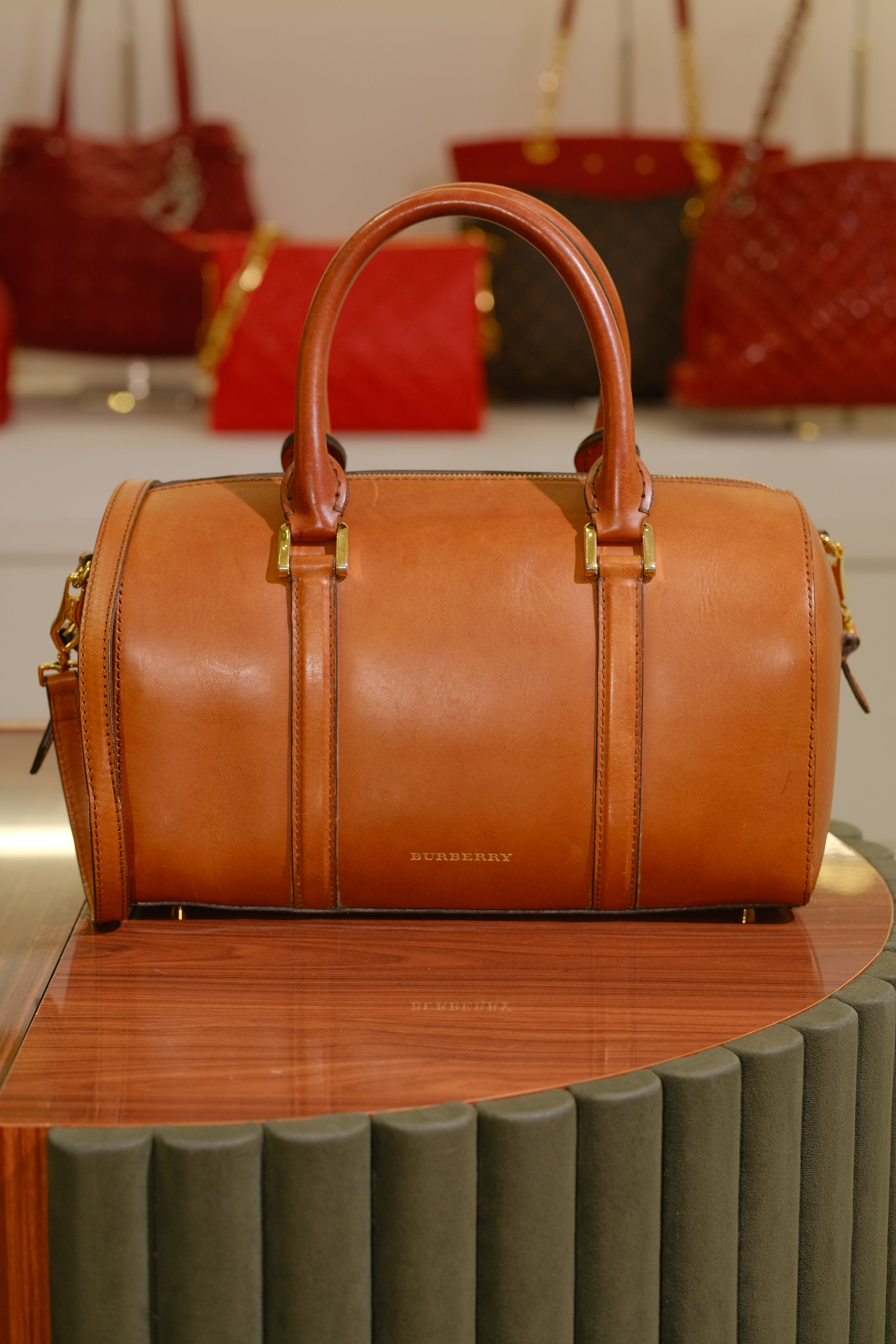 Bolsa Burberry Alchester, em couro marrom, compartimento único com bolso fechado por zíper e dois bolsos abertos, alça de mão dupla e alça longa ajustável, ferragem em dourado e fecho superior em zíper.