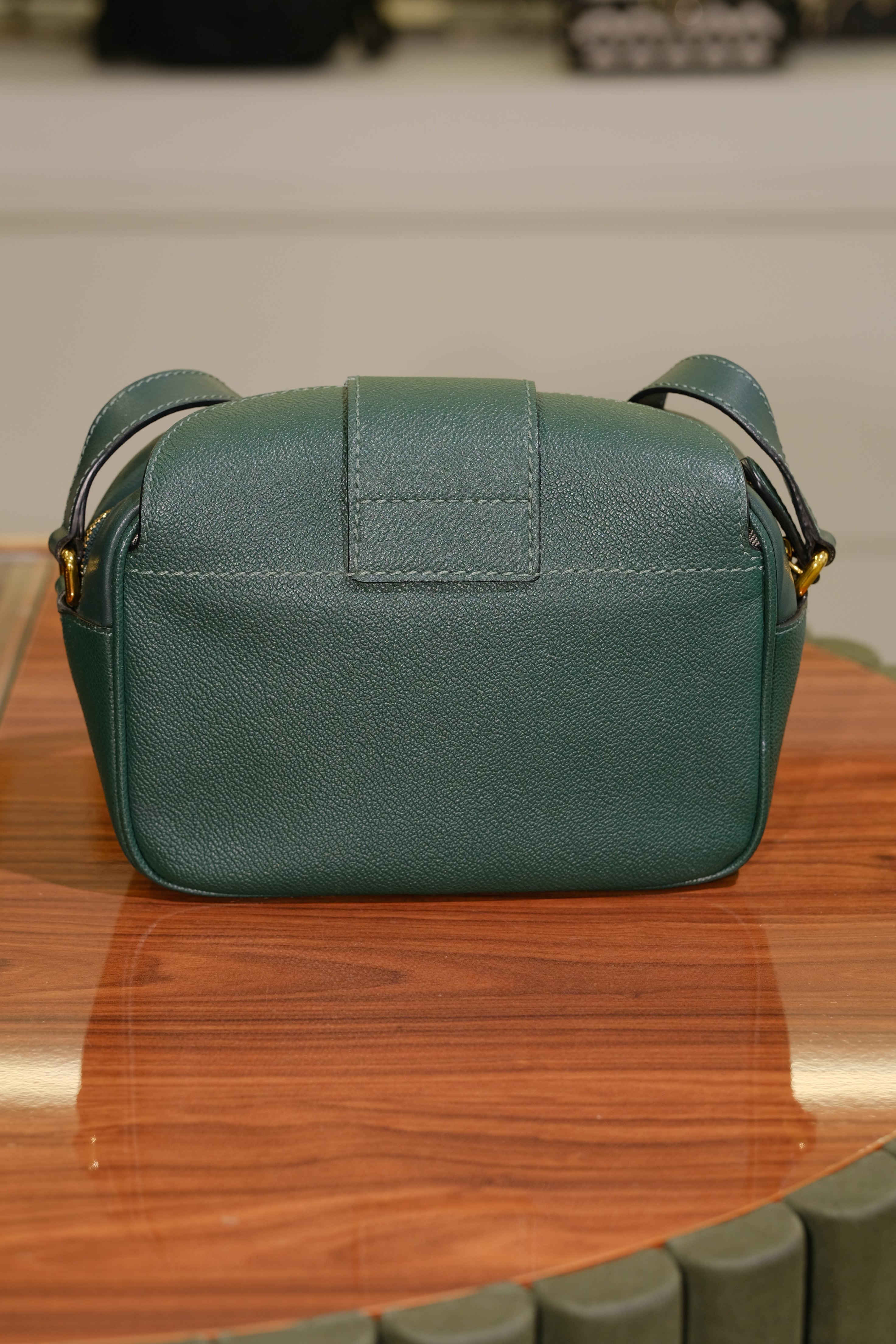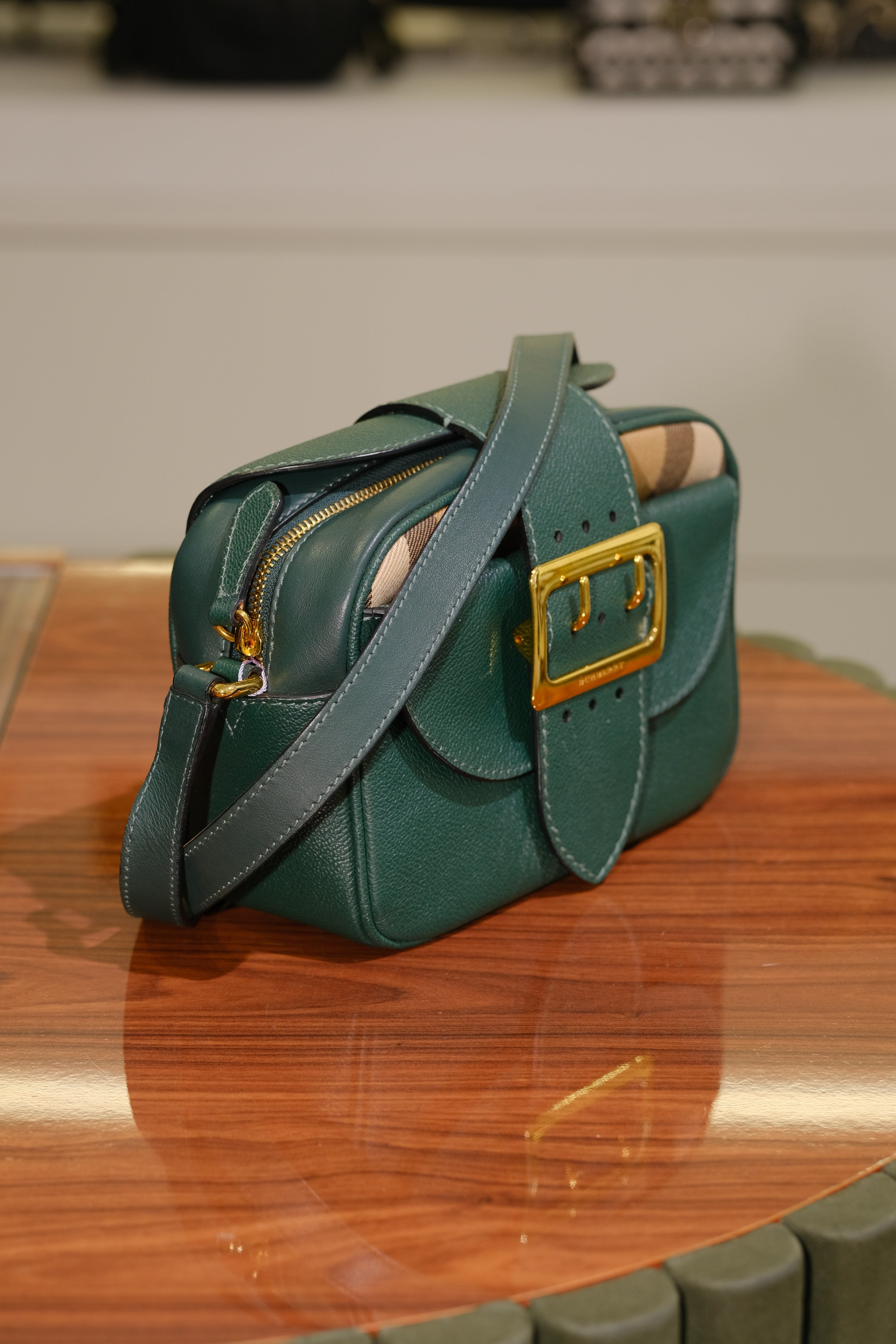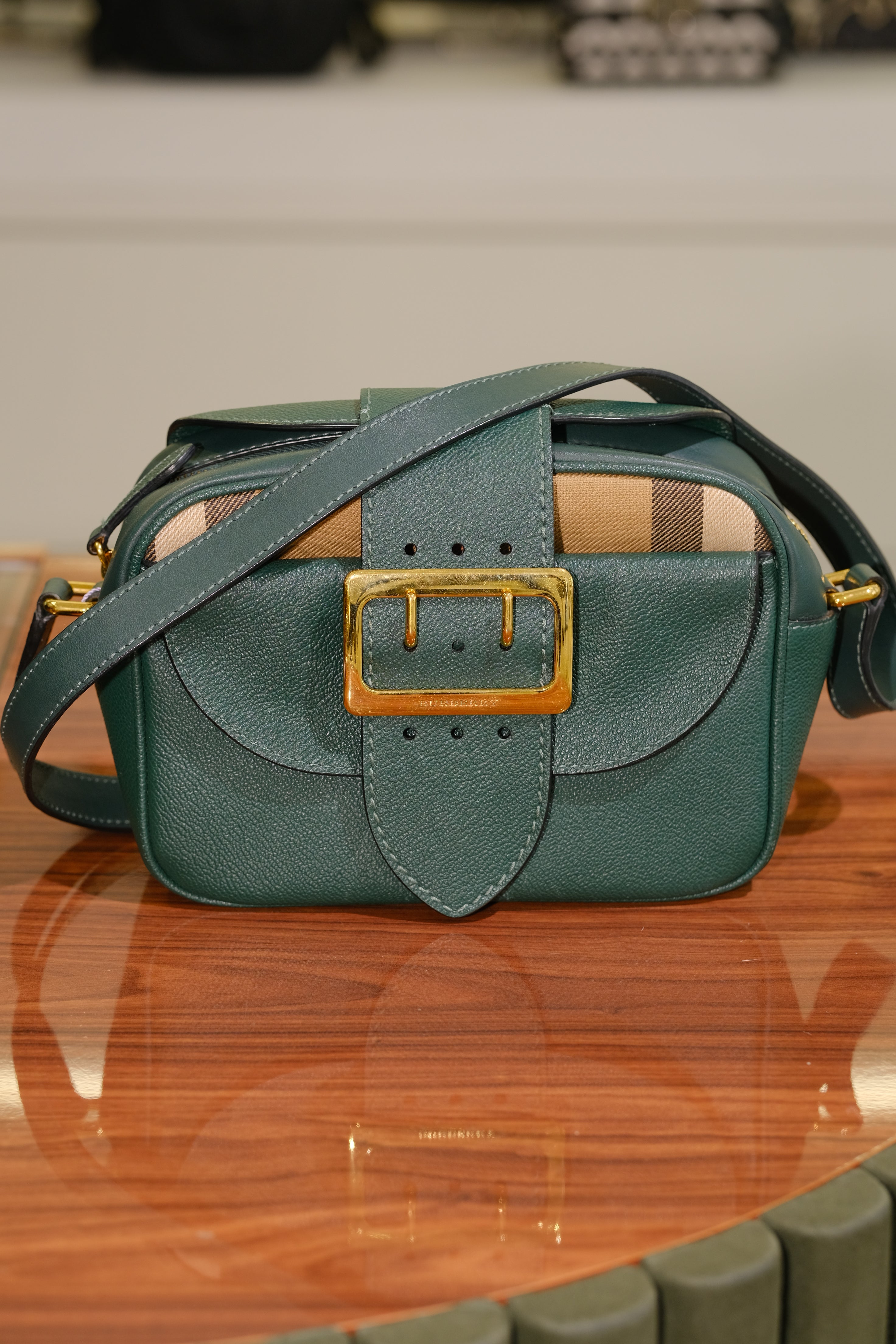 Bolsa Burberry Buckle, em couro na cor verde e detalhes no xadrez, compartimento único com bolso interno aberto, alça longa ajustável, bolso na parte frontal, ferragem em dourado e fecho de zíper na parte superior com aba de íman.