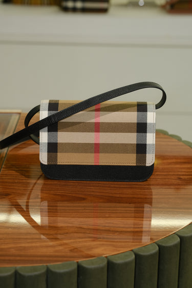 Bolsa Burberry Madison, em jacquard no xadrez e detalhes em couro na cor preta, compartimento único, alça longa e aba frontal com fecho em botão de pressão.