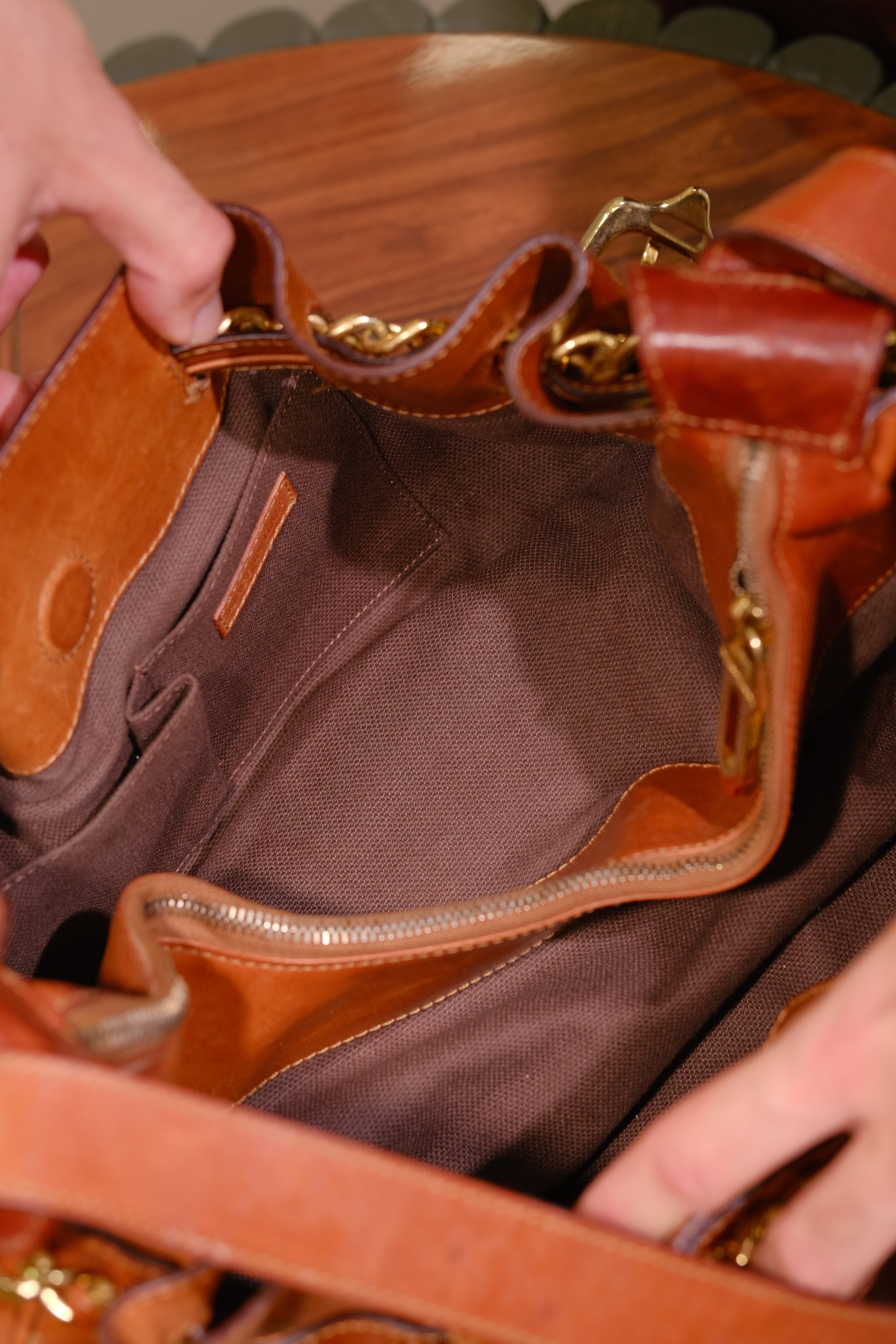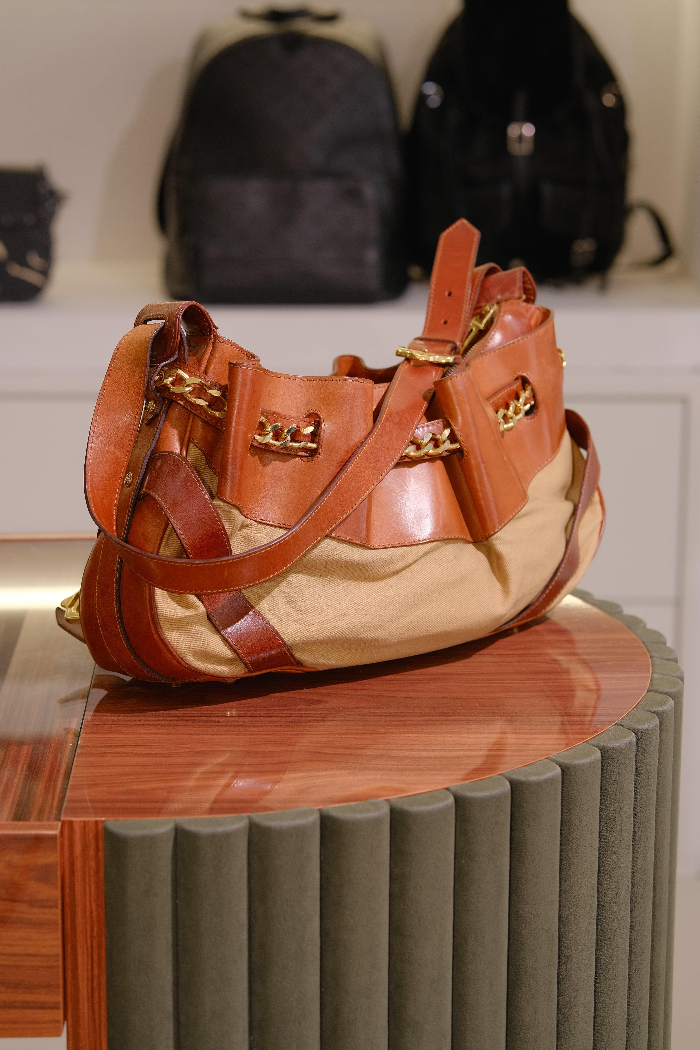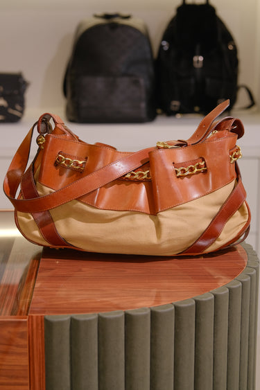 Bolsa Burberry Vintage, em couro e jacquard na cor bege e marrom, compartimento com divisória e bolso aberto e fechado por zíper e alça longa ajustável.