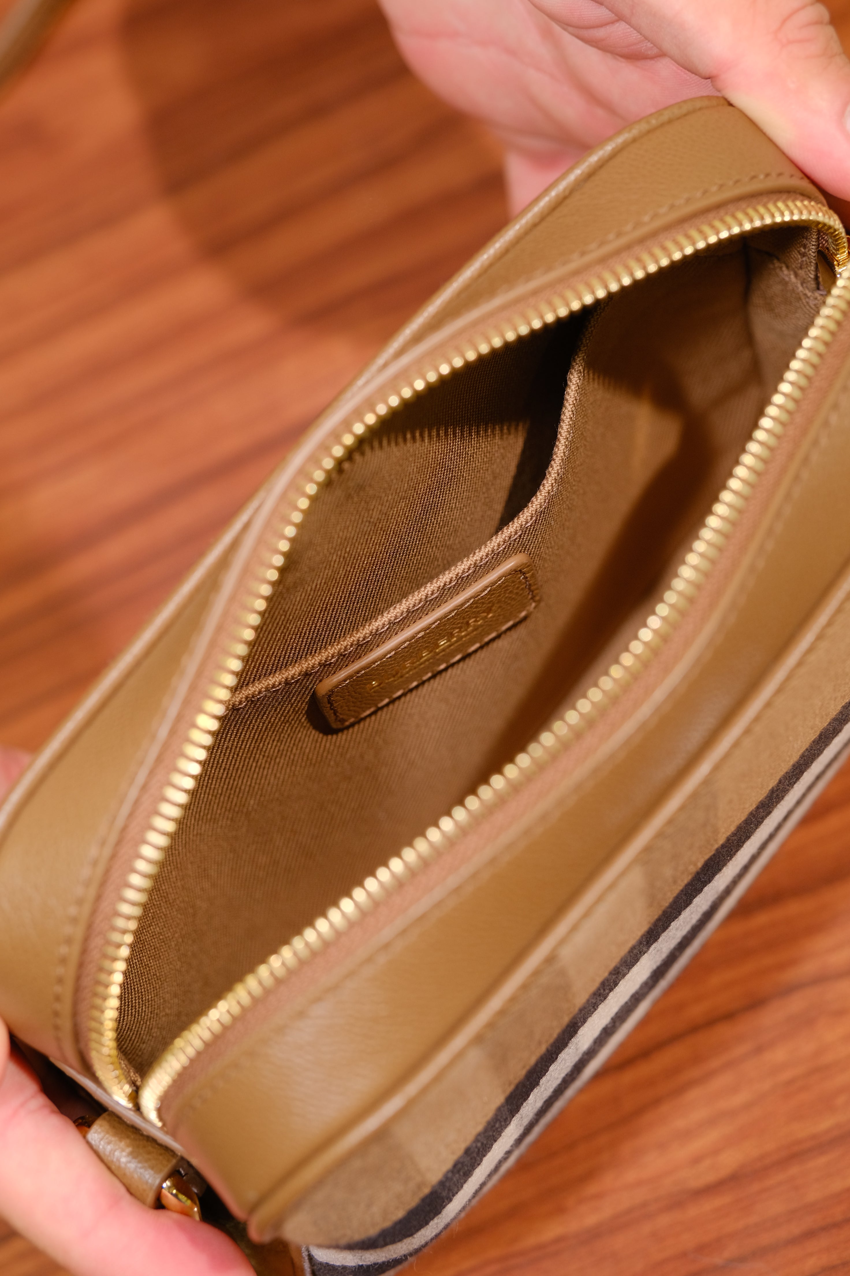 Bolsa Camera Bag Burberry, em canvas e detalhes em couro na cor marrom, compartimento único com bolso interno, ferragem em dourado, alça longa ajustável e fecho em zíper na parte superior.