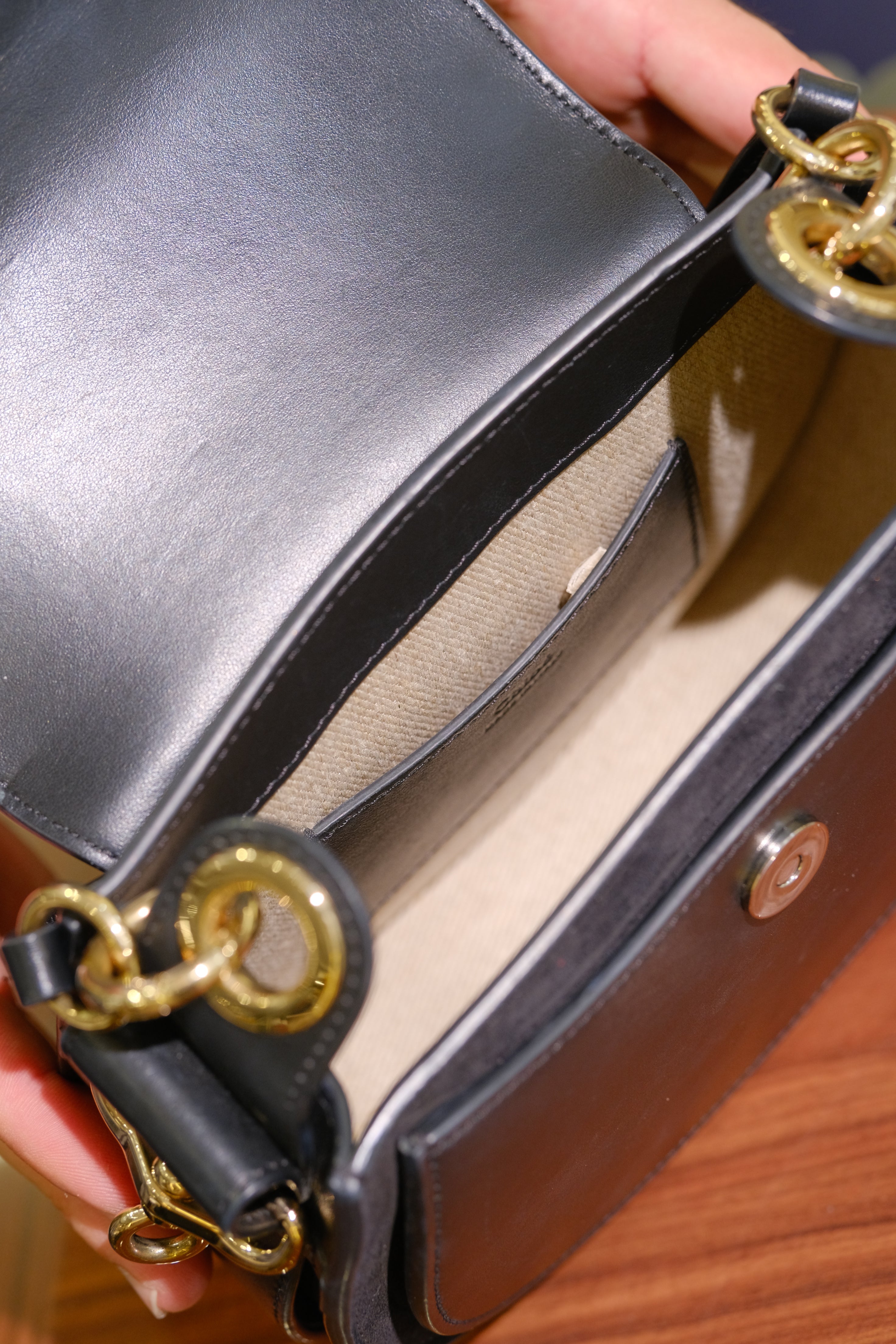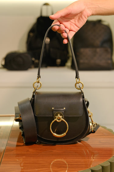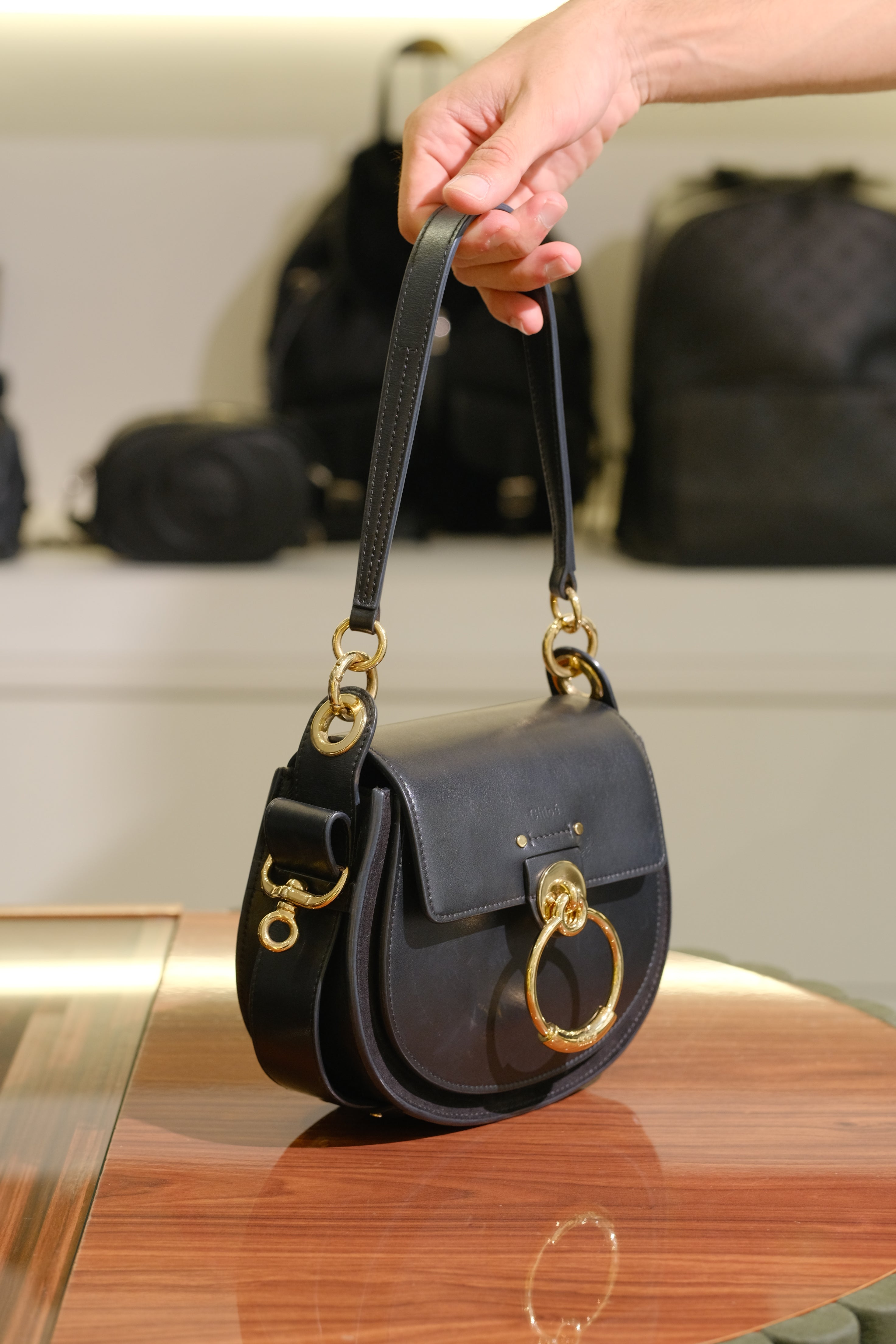 Bolsa Chloé Tess, em couro na cor preta, compartimento único com dois bolsos abertos, ferragem em dourado, alça de ombro e alça longa ajustável e aba frontal com fecho de botão de pressão.