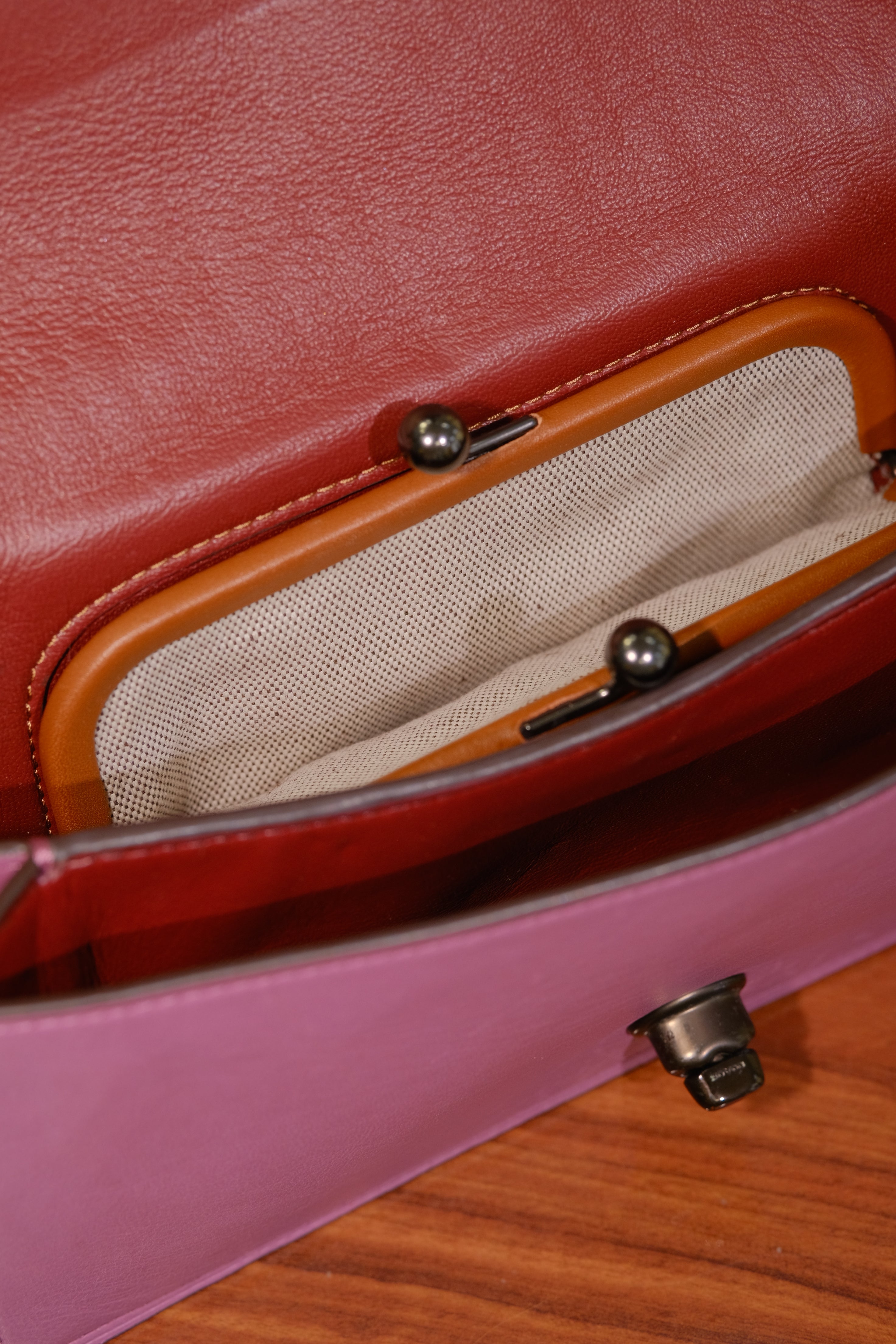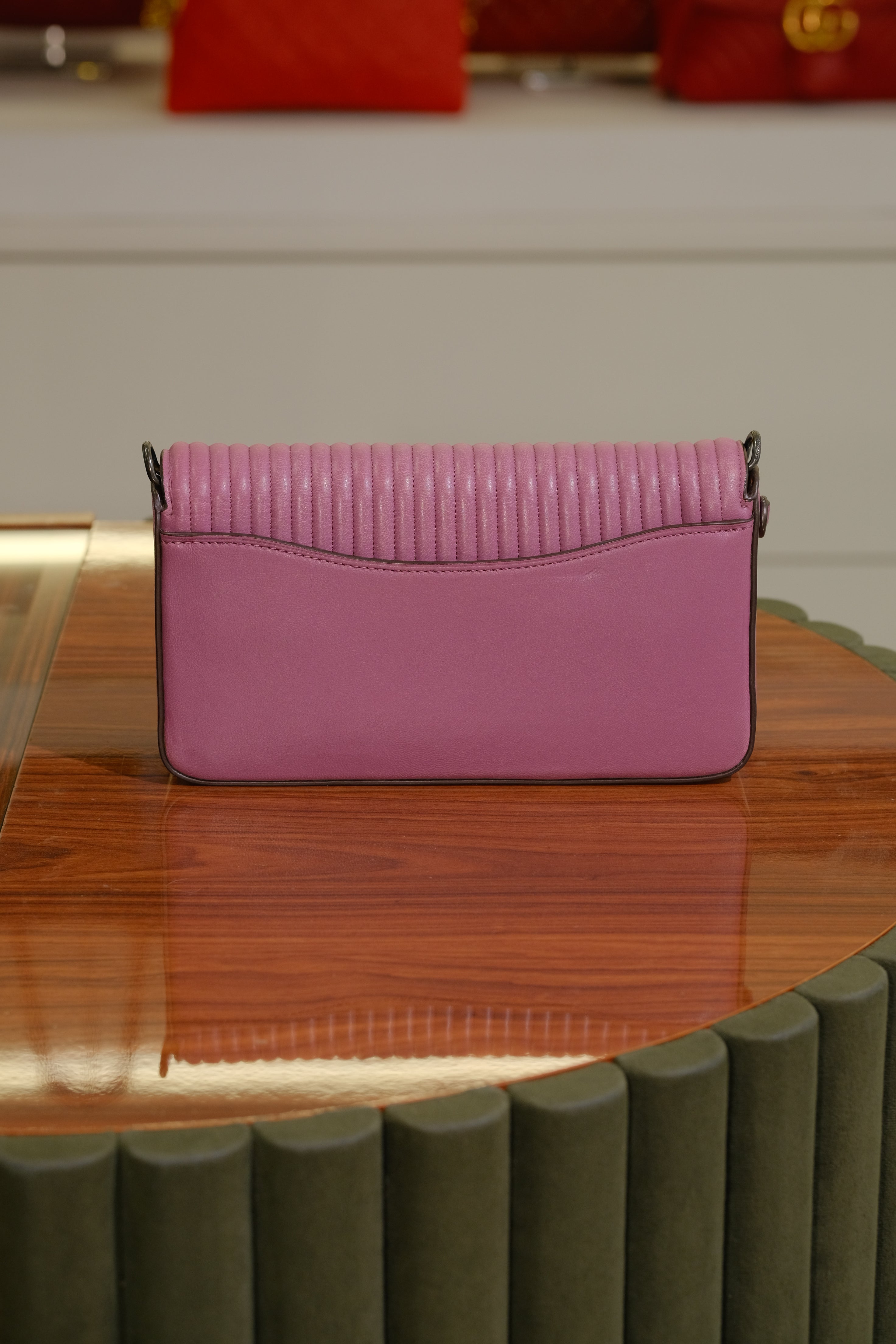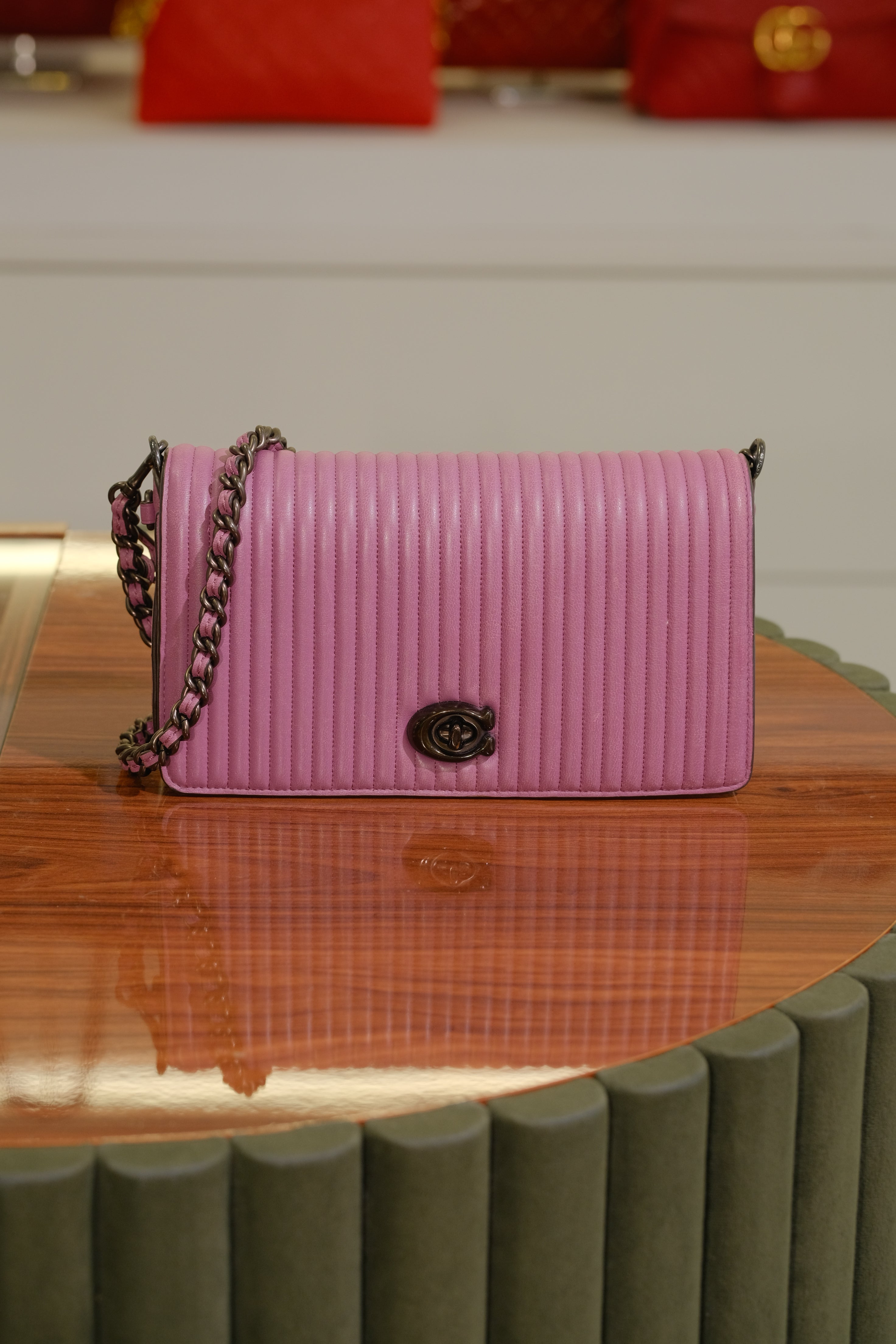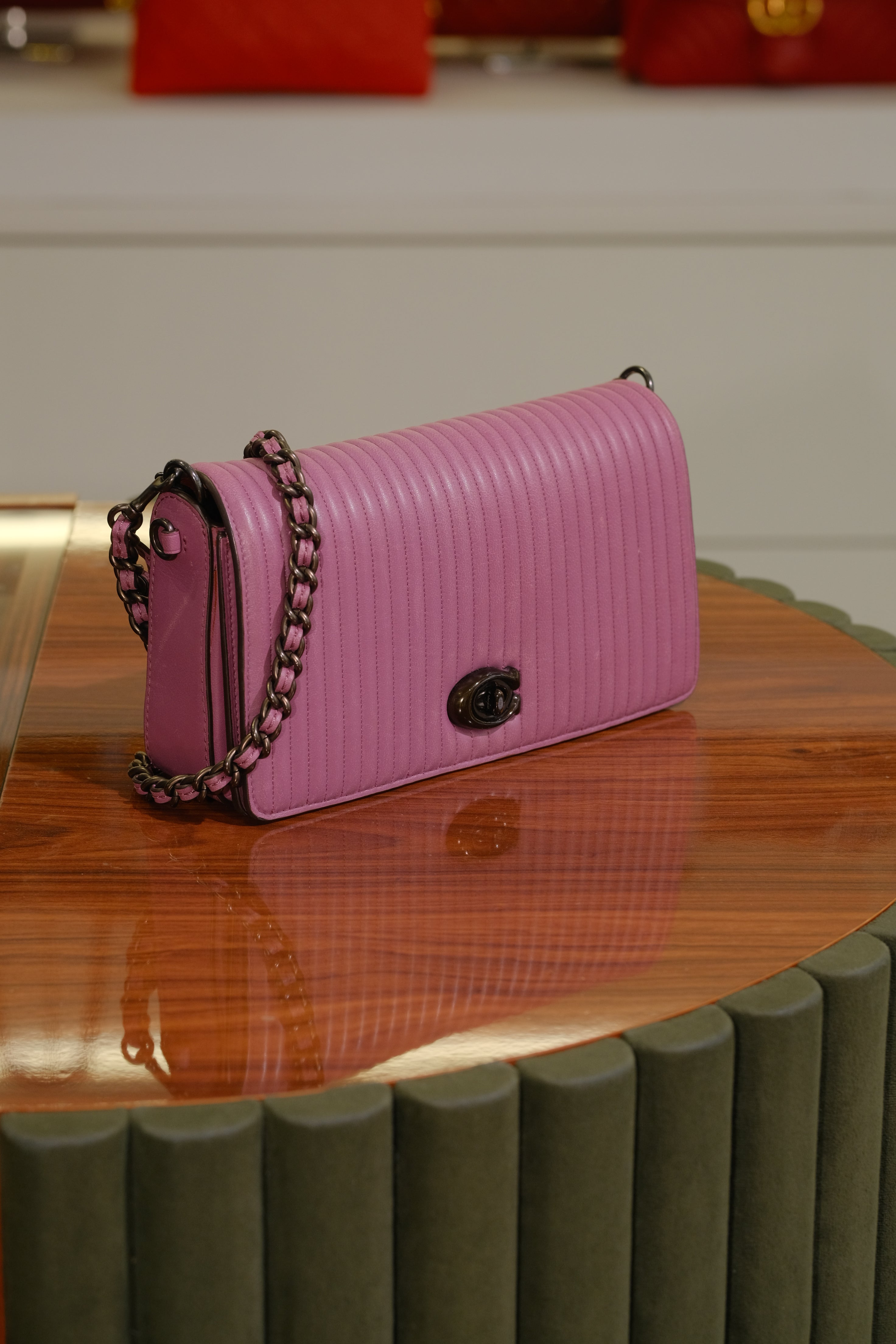 Bolsa Coach Dinky, em couro na cor rosa, compartimento duplo com bolso interno e bolso na parte de trás, ferragem em chumbo, alça longa de couro e corrente e aba frontal com fecho giratório.