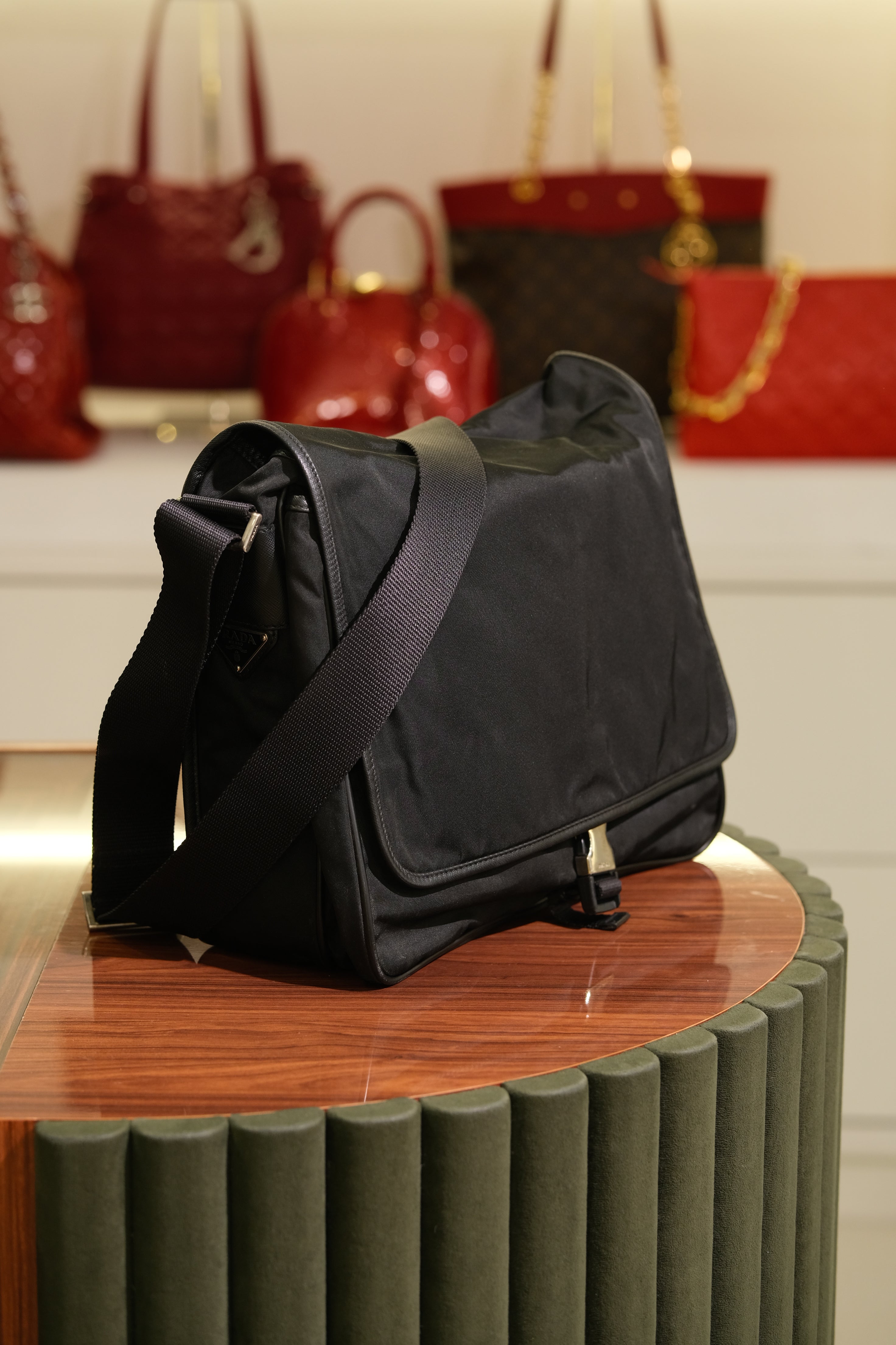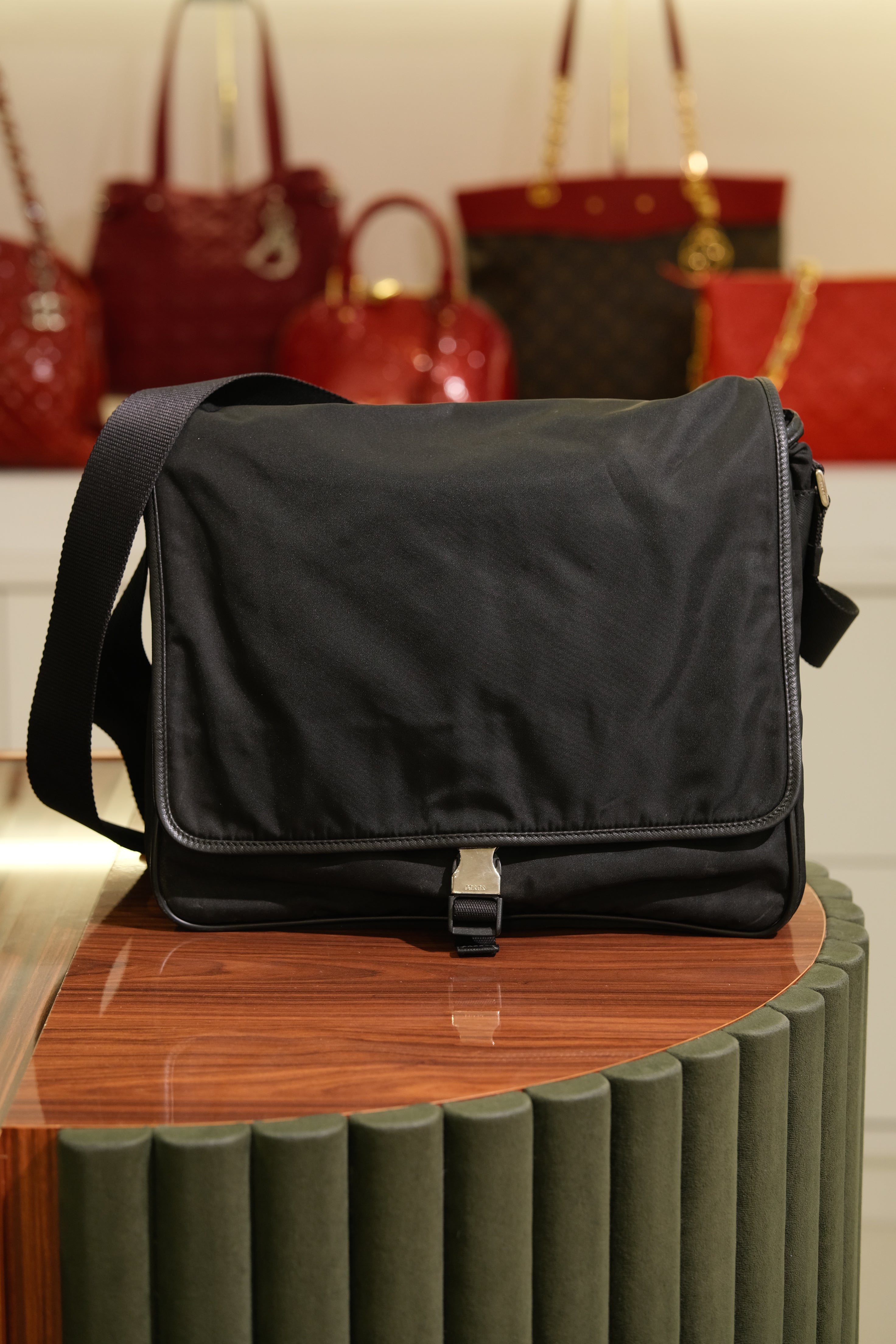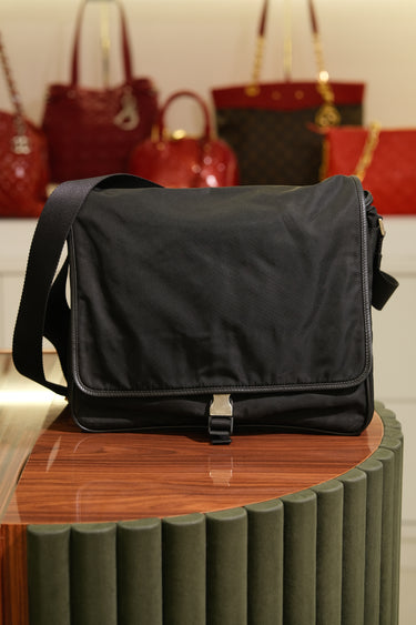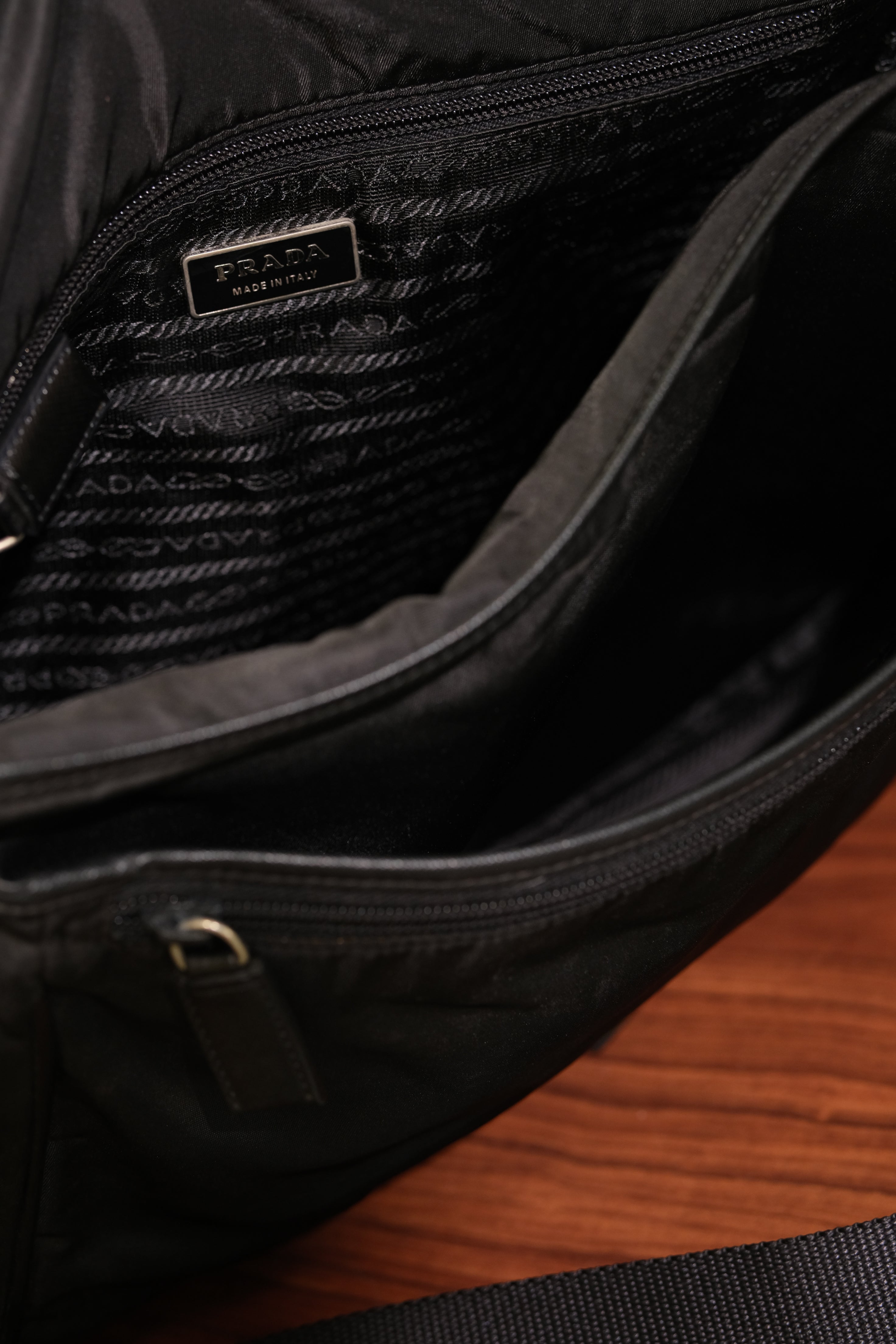 Messenger Bag Prada, em nylon na cor preta, compartimento com divisória, bolso interno fechado por zíper, alça longa e ajustável, ferragem em prata e aba frontal com fecho de encaixe.