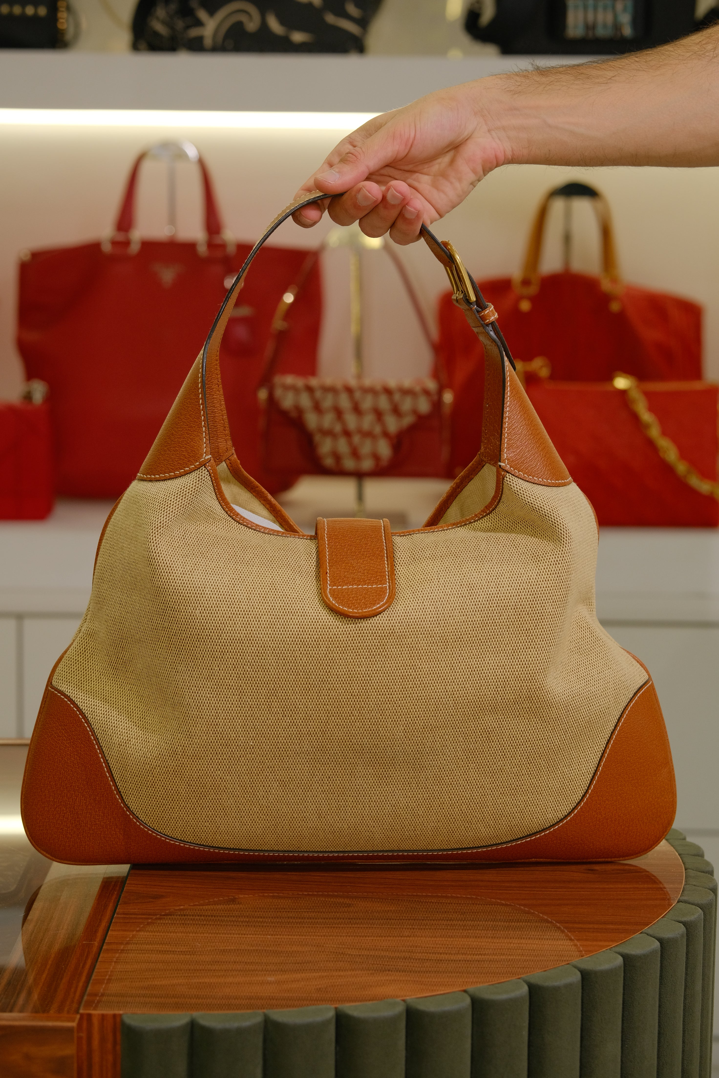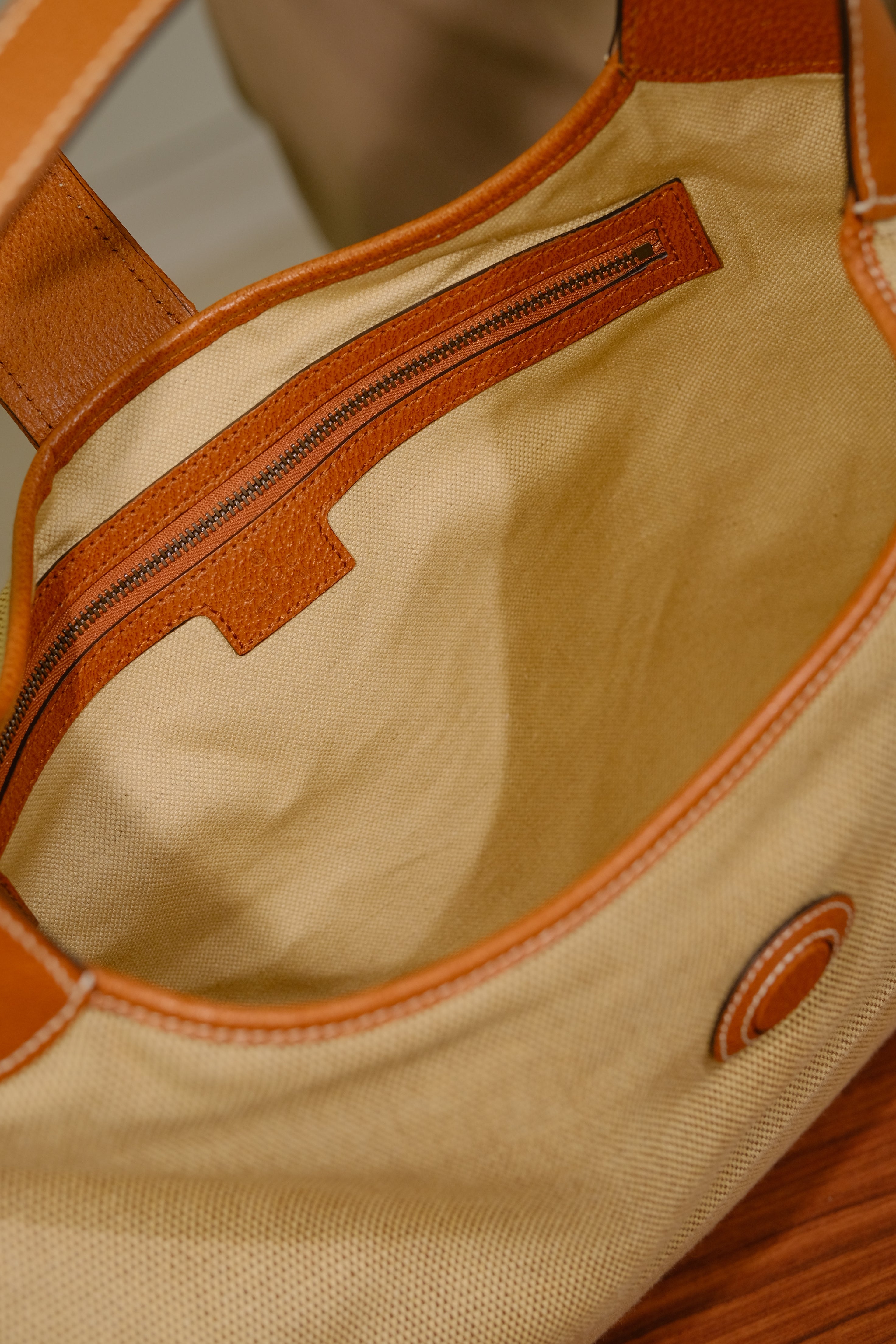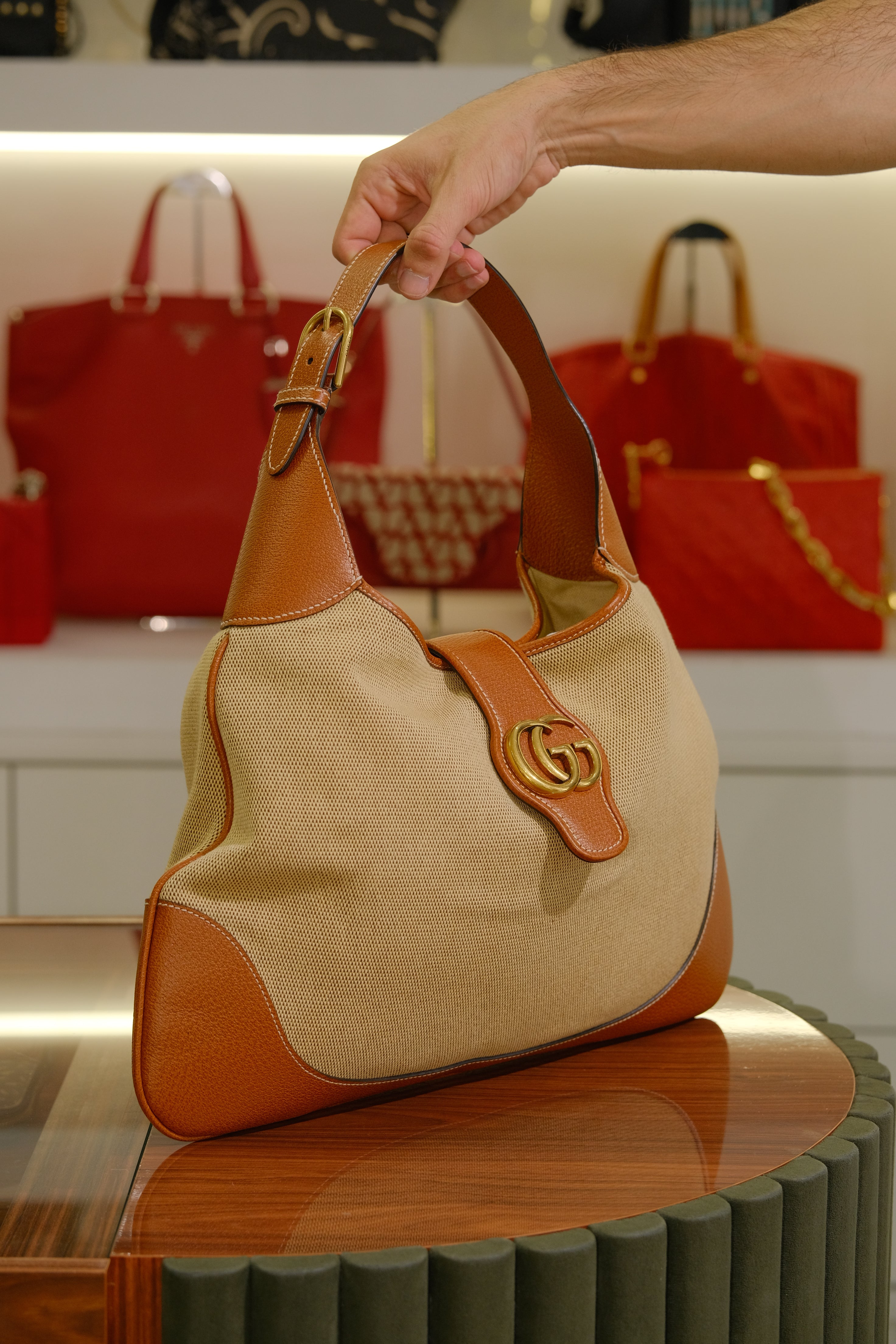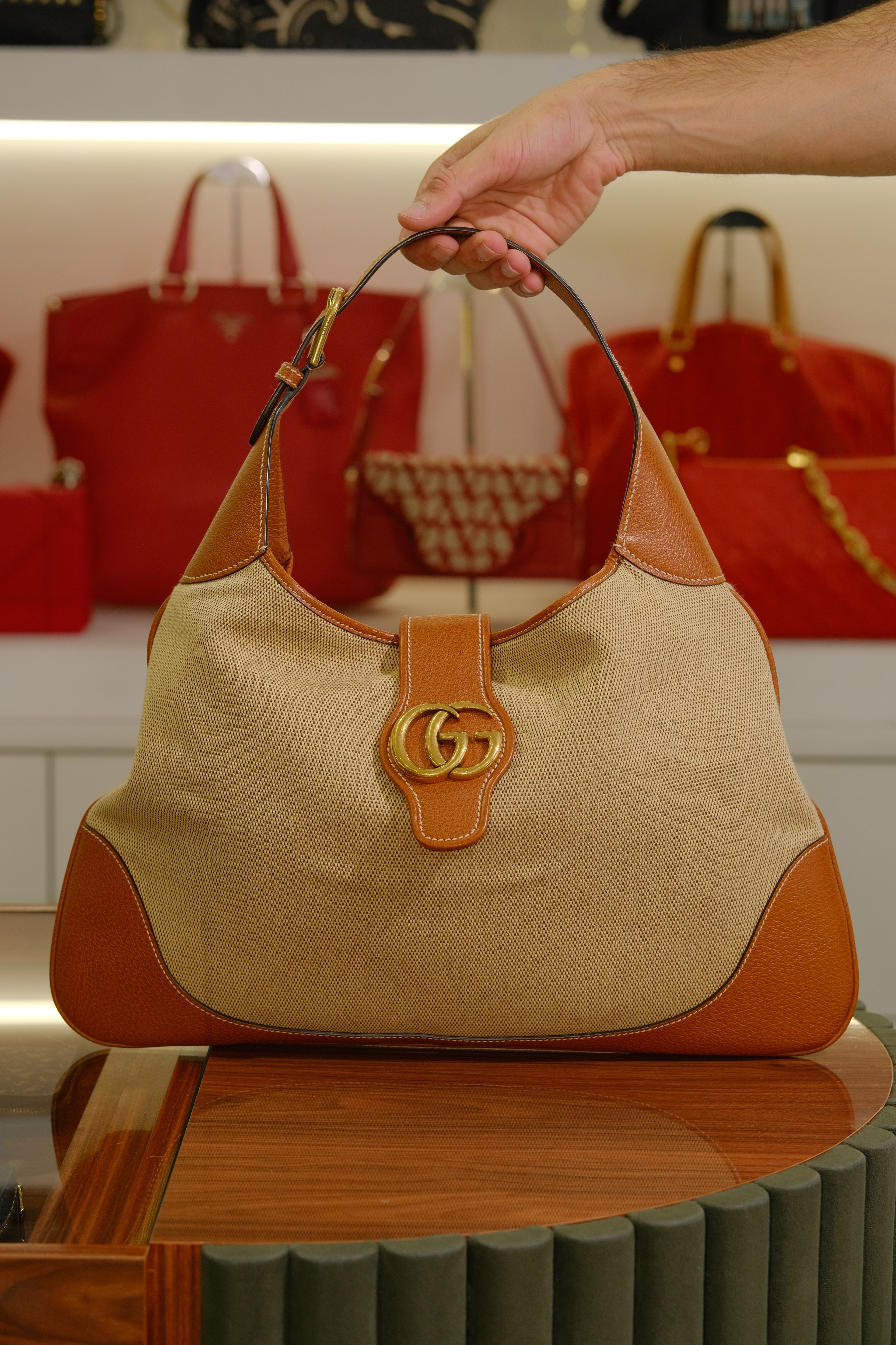 Bolsa Gucci Aphrodite, em jacquard bege e detalhes em couro marrom, compartimento único e bolso fechado por zíper, alça ajustável em couro, ferragem em dourado e fecho de íman na parte frontal.