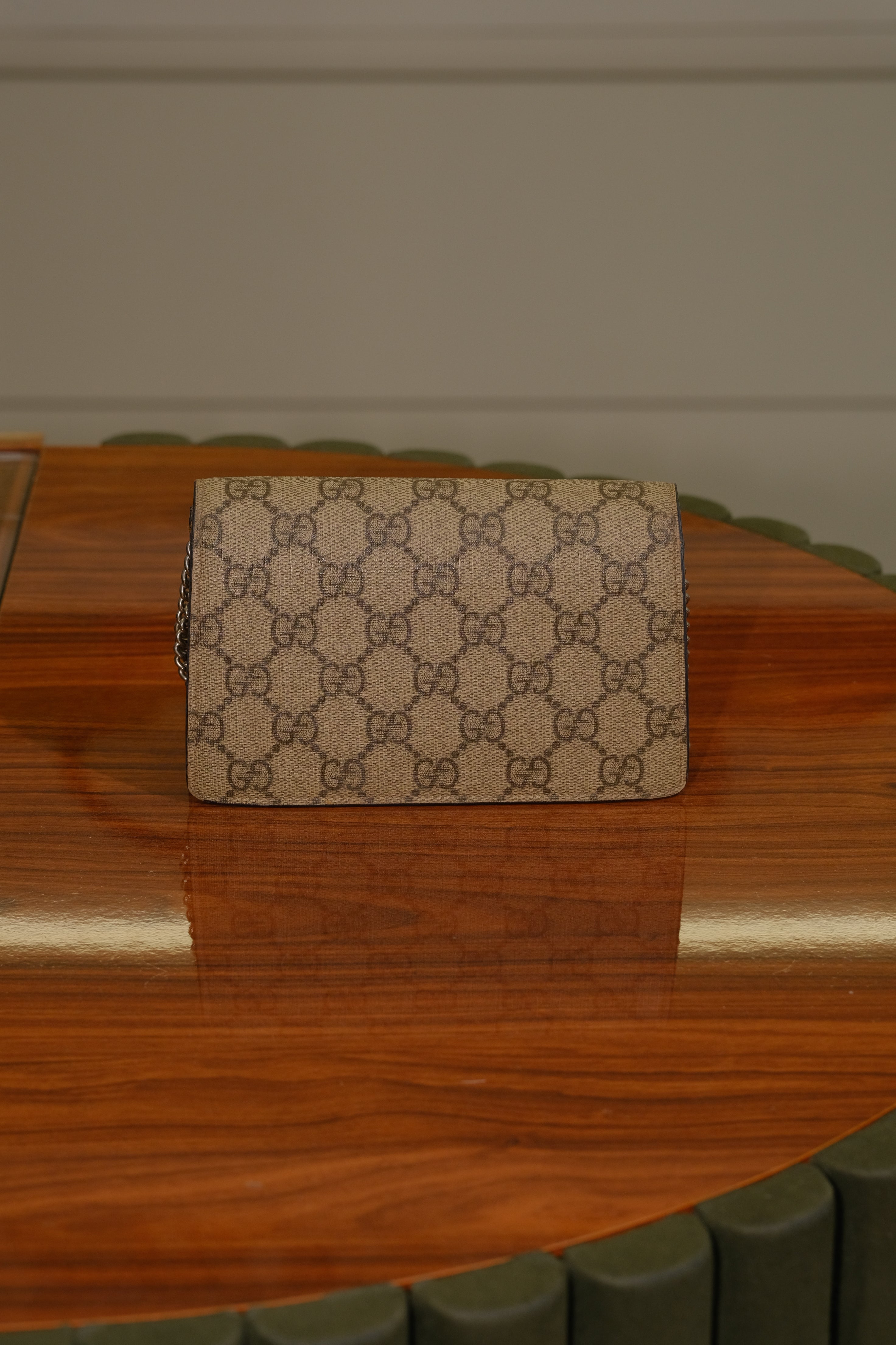 Bolsa Gucci Dionysus Super Mini, em canvas GG, compartimento único, ferragem em prata, alça longa de corrente e aba frontal com fecho em botão de pressão.