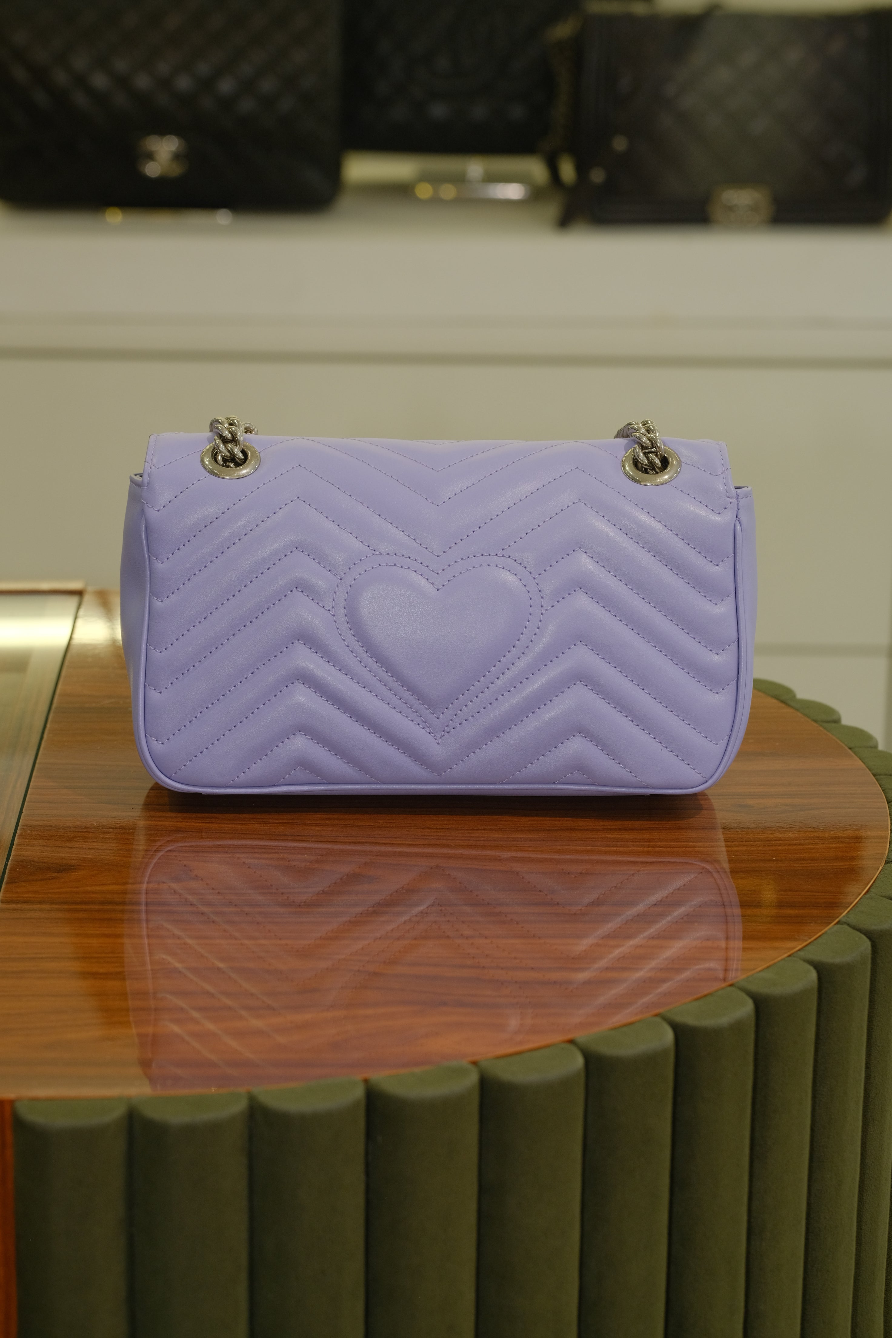Bolsa Gucci GG Marmont, em couro na cor roxo e detalhes em matelassê, compartimento único com bolso interno fechado por zíper, ferragem em prata, alça longa em corrente e couro e aba frontal com fecho de encaixe.