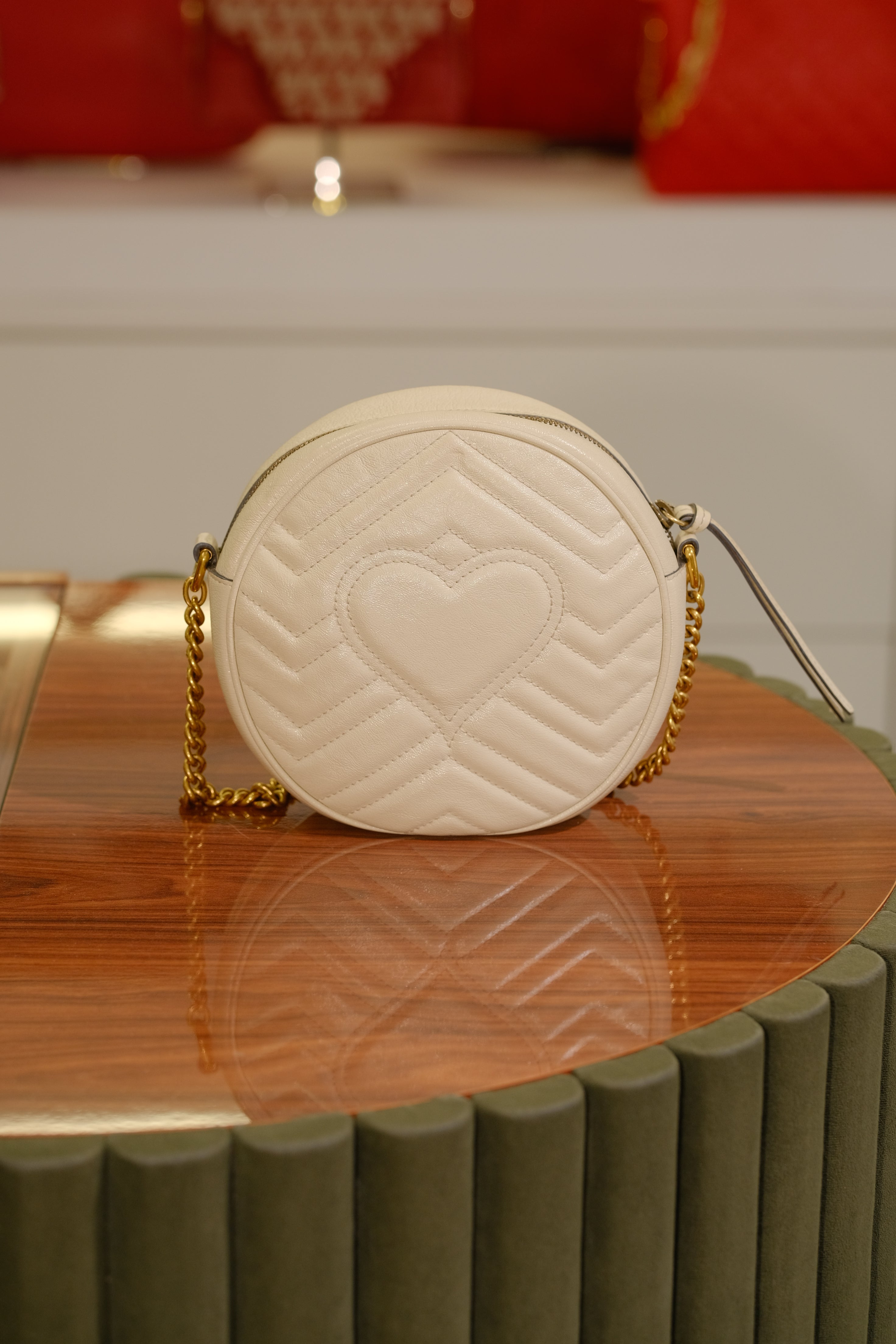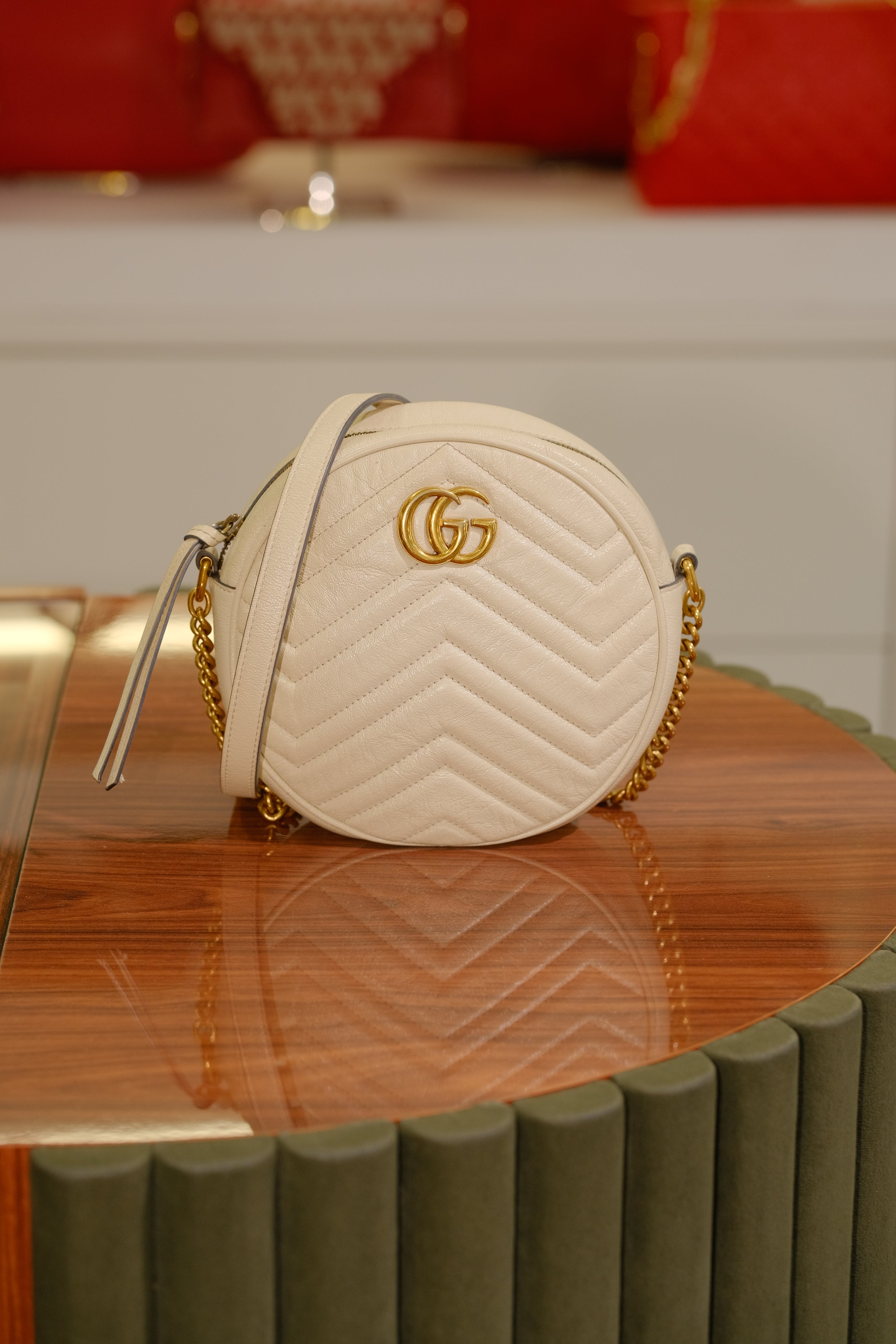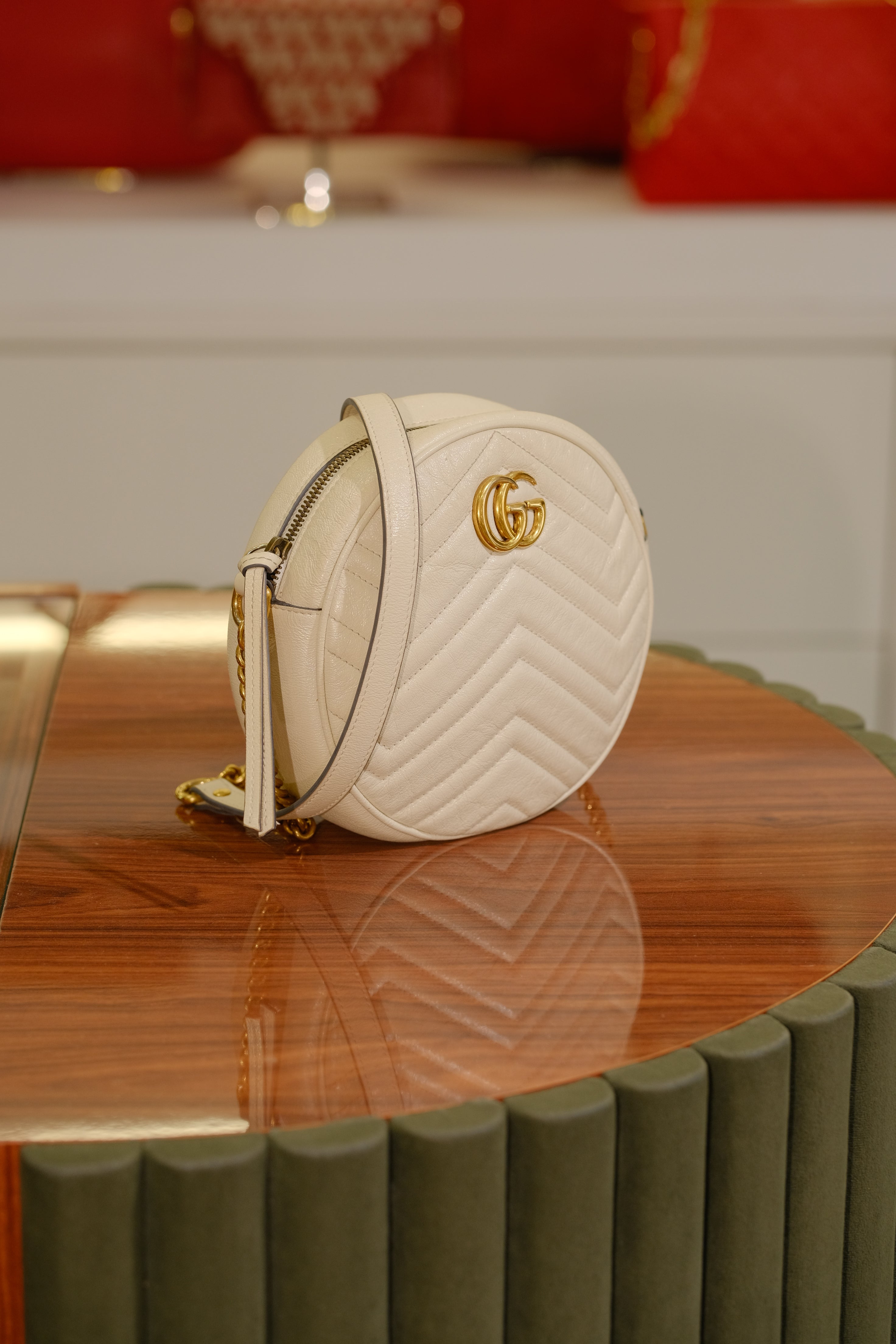 Bolsa Gucci GG Marmont Round, em couro na cor off white, compartimento único, ferragem em dourado, alça longa ajustável de couro e corrente e ziper na parte superior.