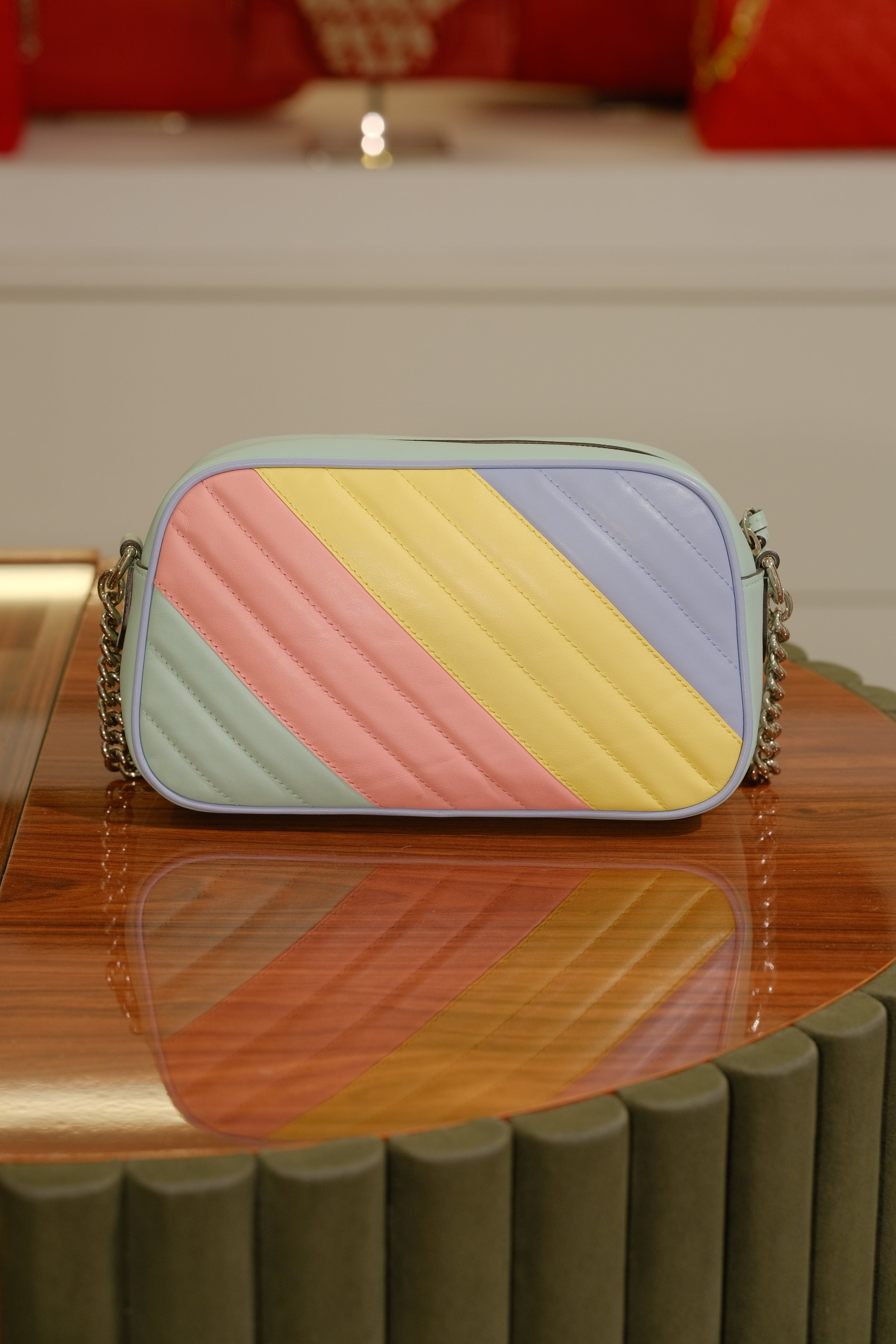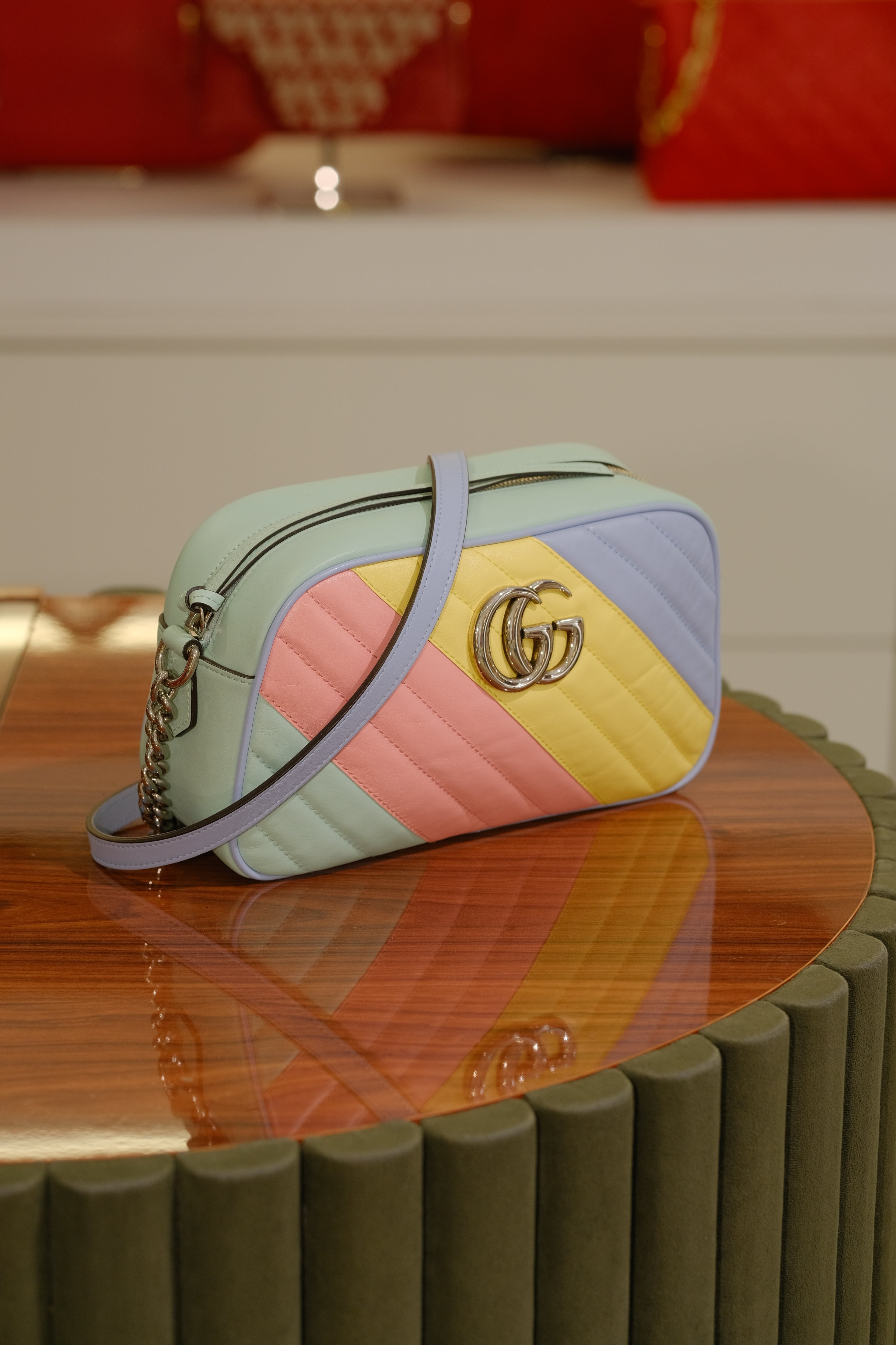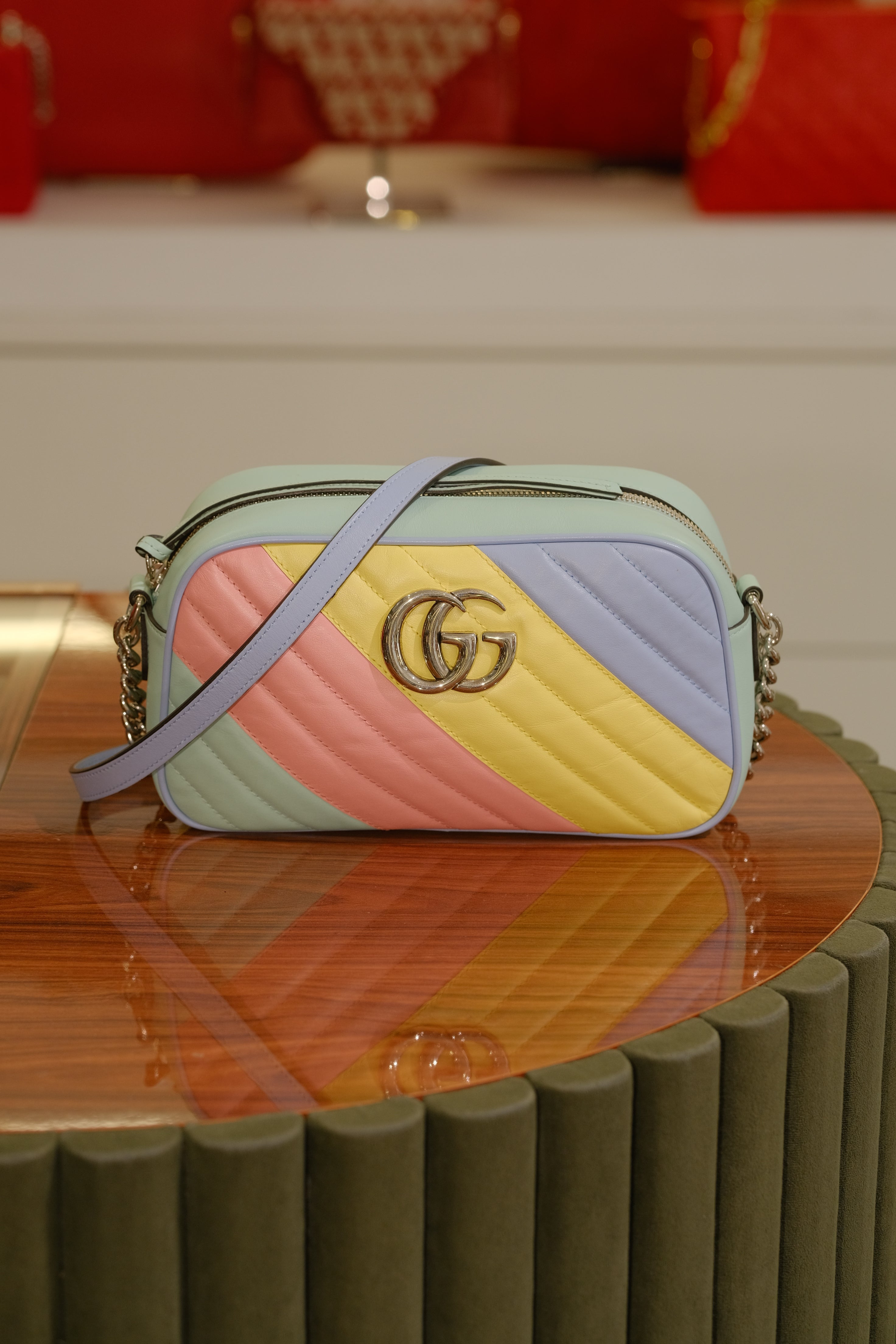 Bolsa Gucci GG Marmont, em couro calfskin colorido com acabamento matelassê, compartimento único com bolso interno, ferragem em prata, alça longa de corrente e couro e zíper na parte superior.