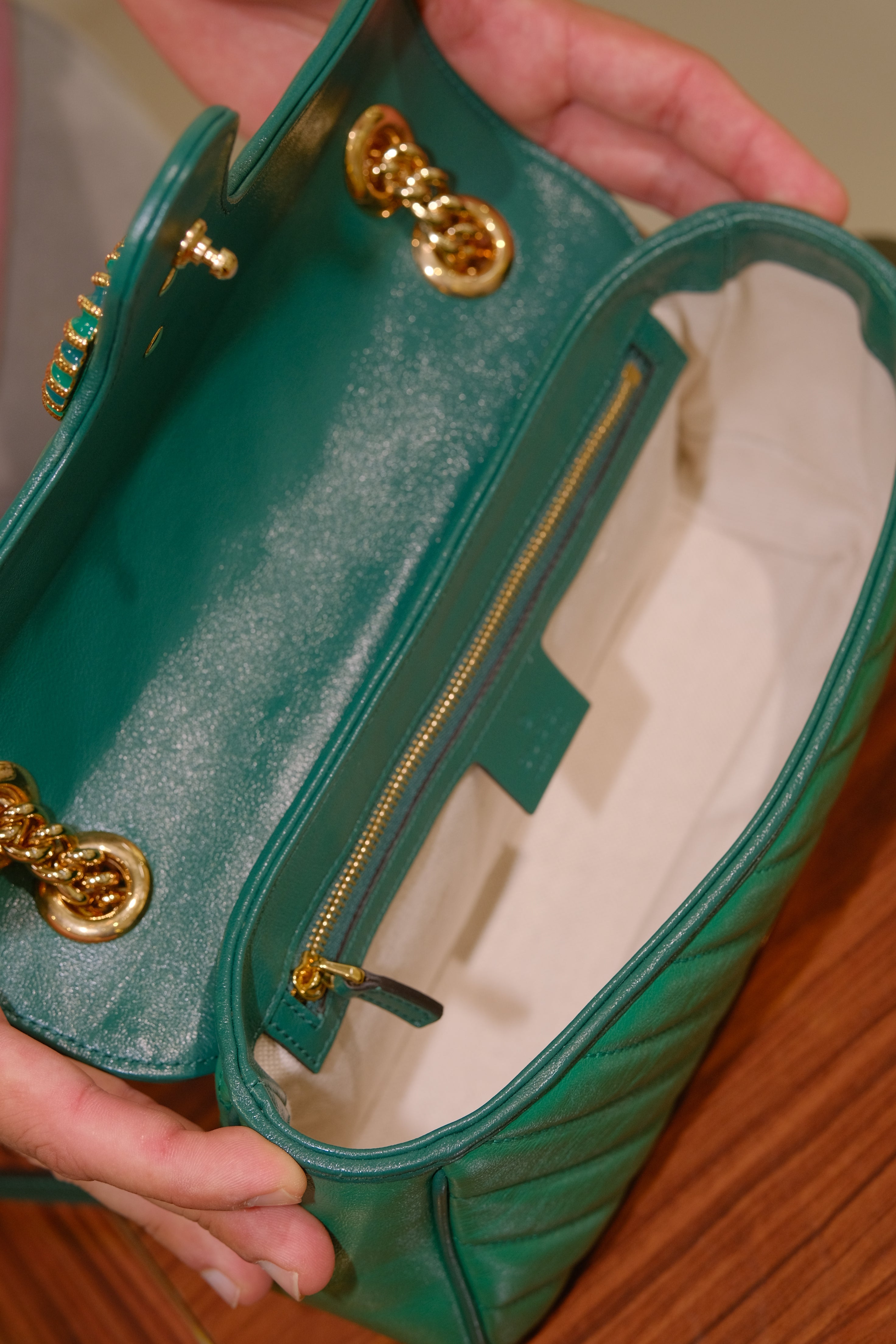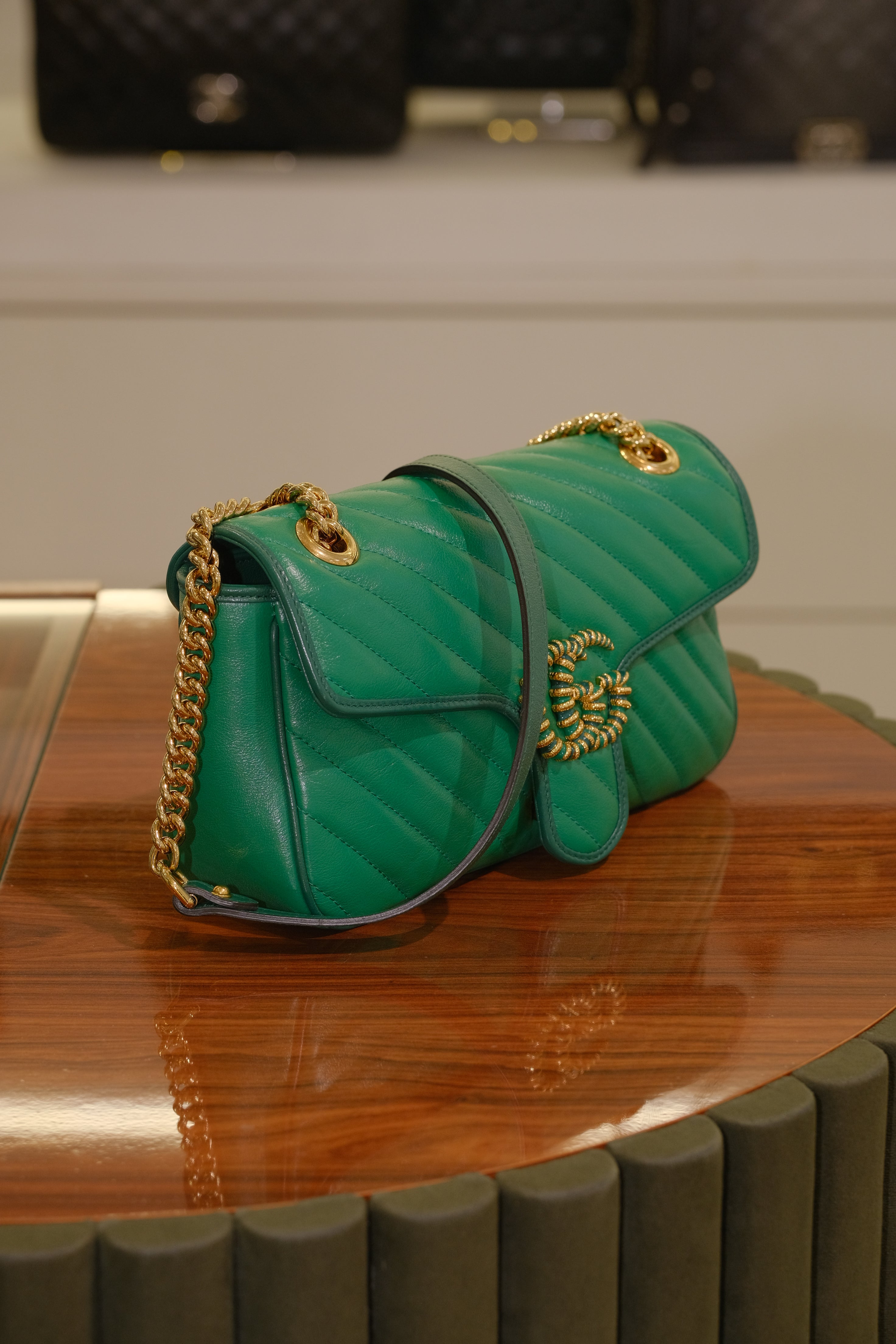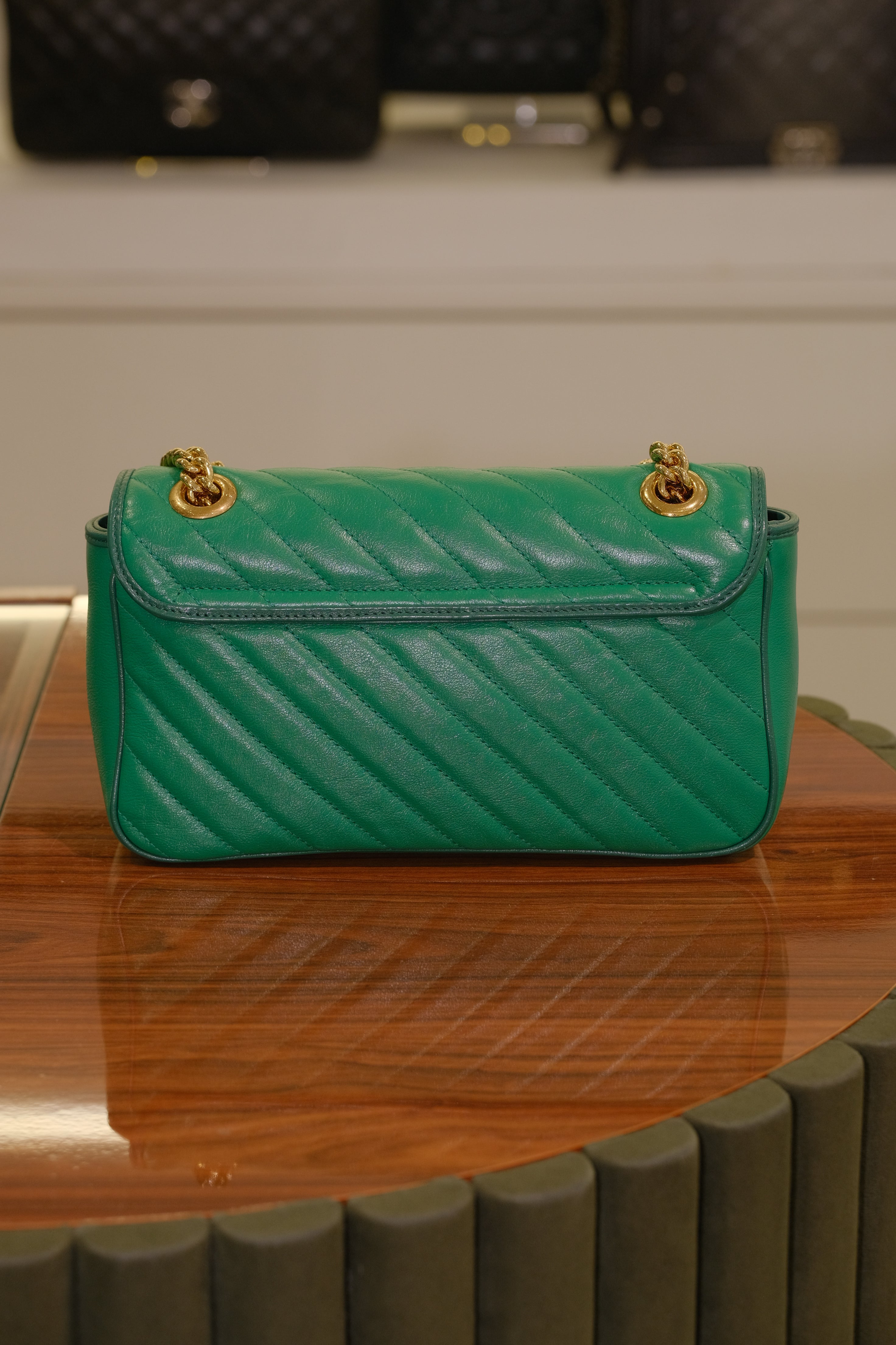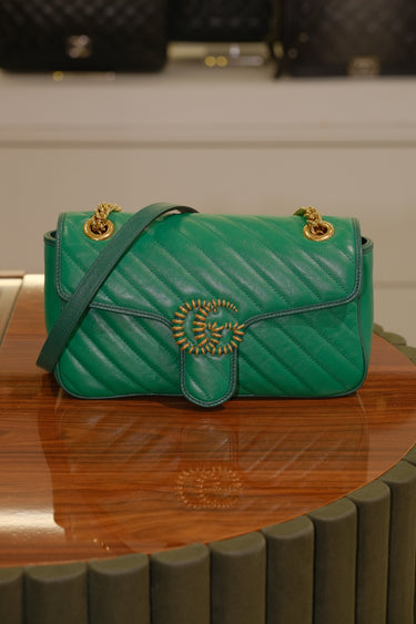 Bolsa Gucci GG Marmont, em couro na cor verde e detalhes em matelassê, compartimento único com bolso interno fechado por zíper, ferragem em dourado, alça longa em corrente e couro e aba frontal com fecho de encaixe.
