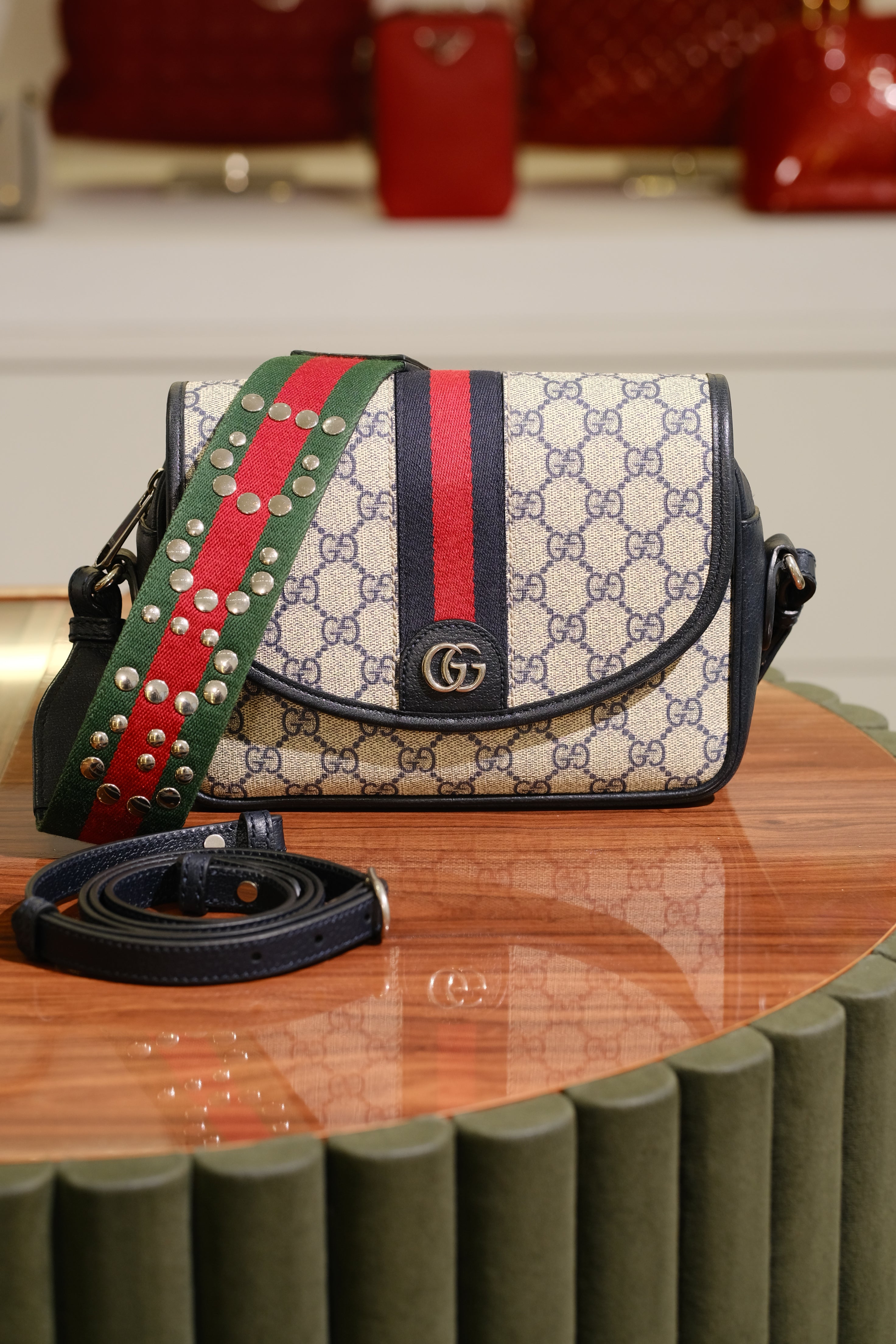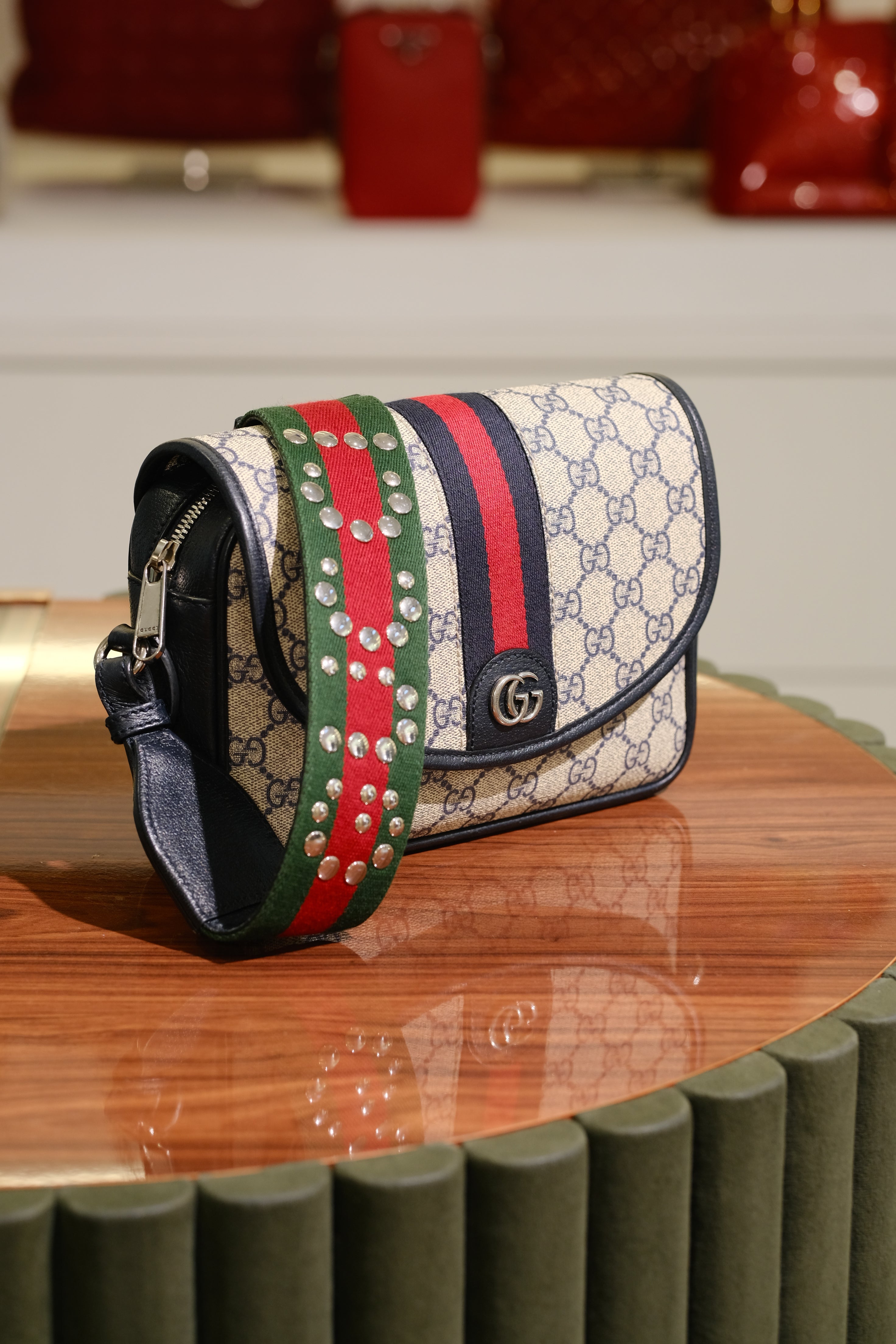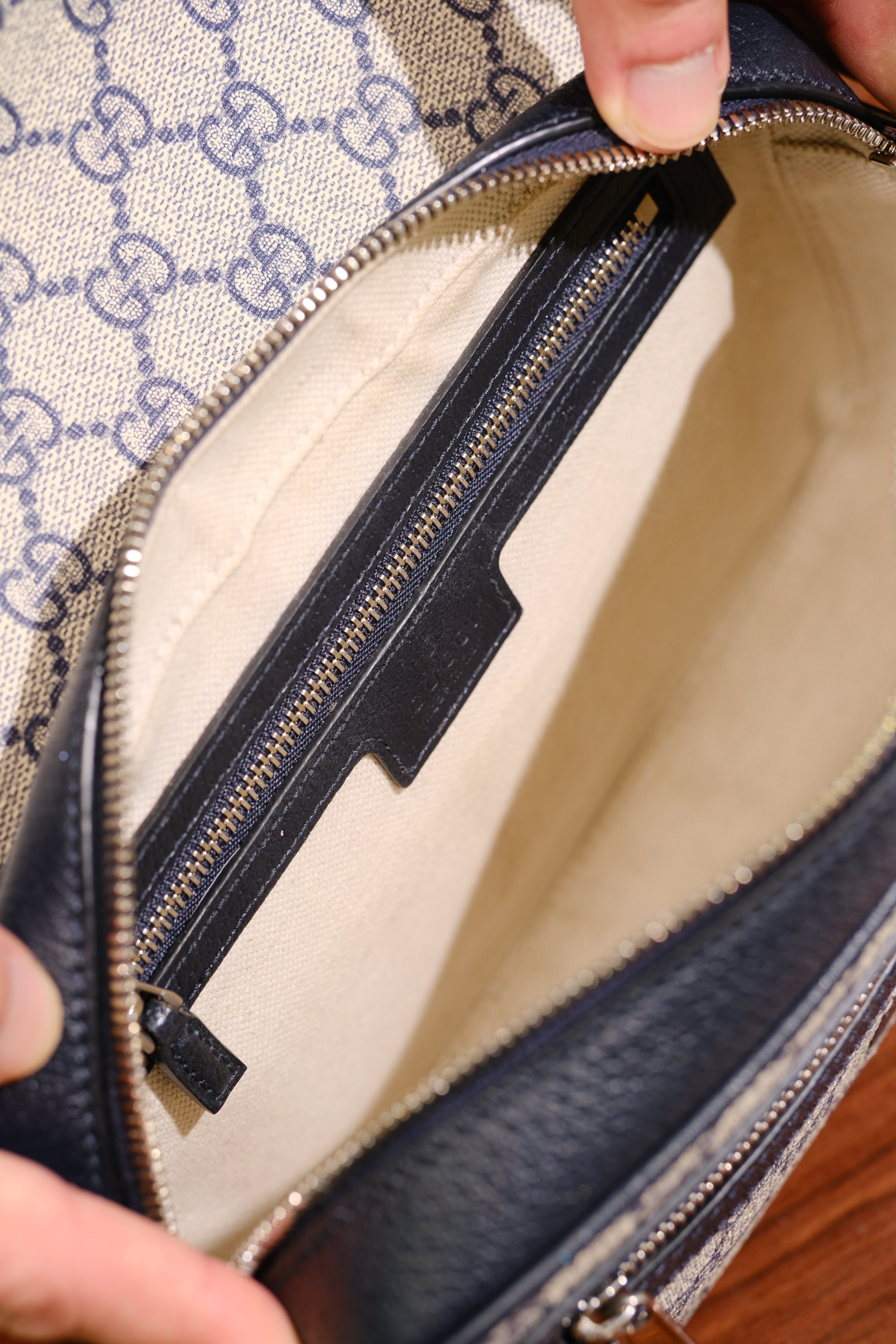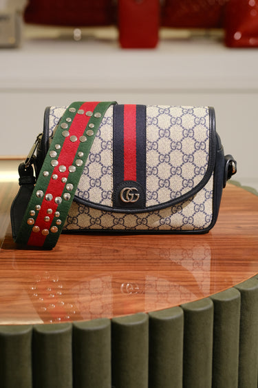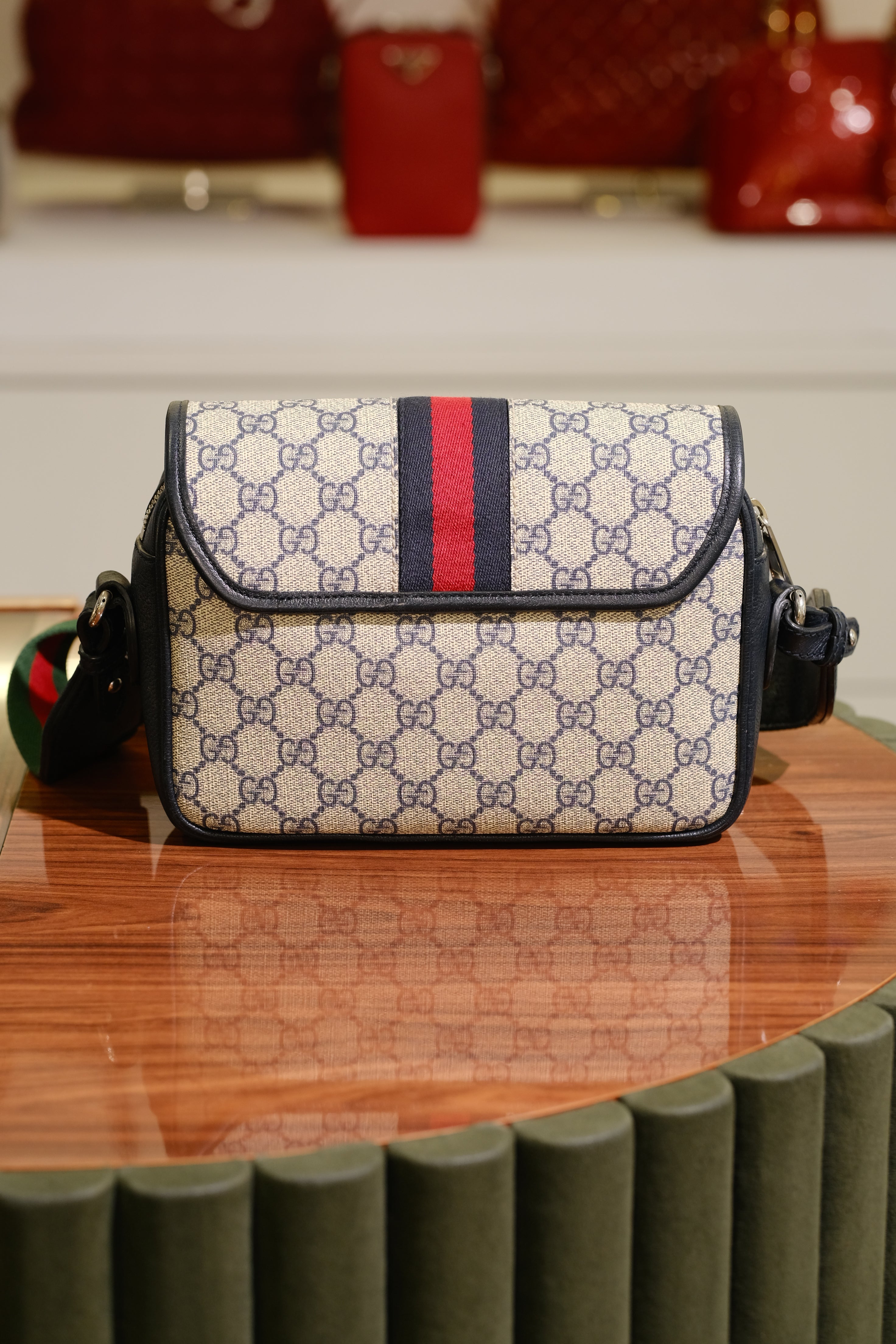 Bolsa Gucci Ophidia, em canvas GG Supreme e acabamento em couro azul, compartimento único com bolso fechado por zíper, ferragem em prata, duas alças longas e ajustáveis, zíper na parte superior e aba frontal com fecho em íman.